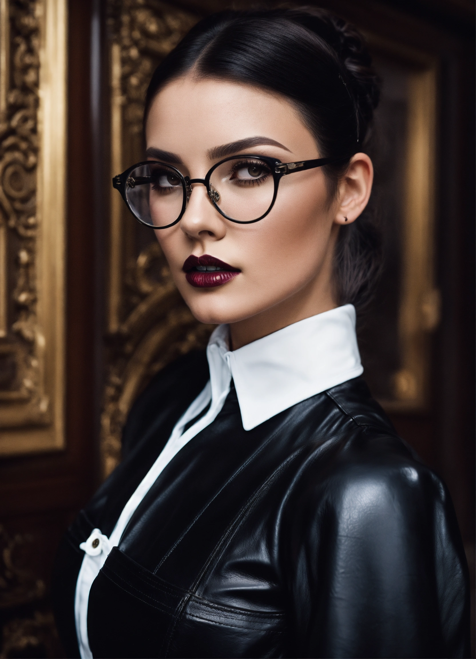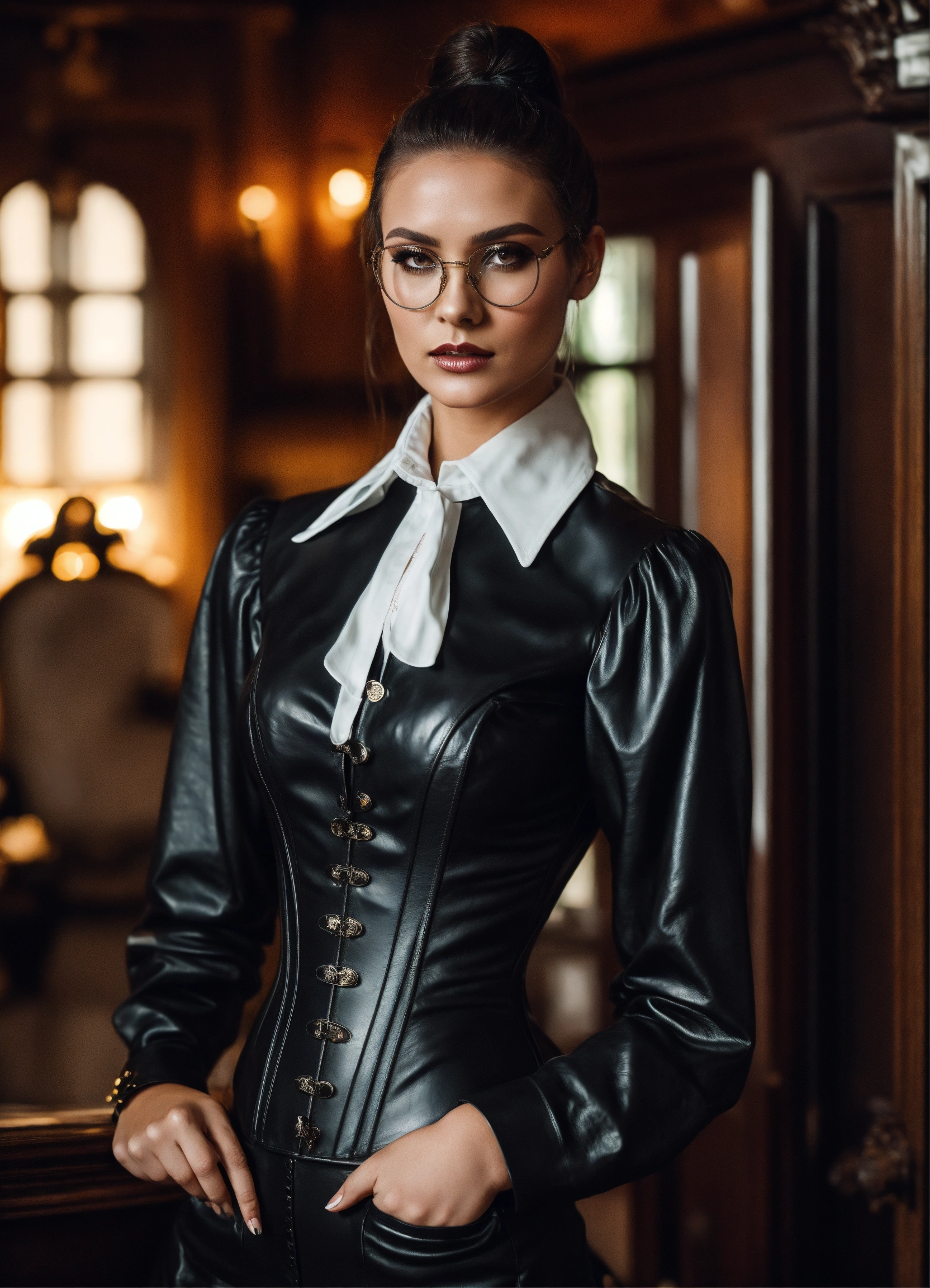 Stunning french seductress woman fashion model, brunette straight high ponytail, glasses, black leather corset, long strict victorian governess wide black long leather dress with big buttons, white governess shirt with long big puff sleeves, mansion room, white office shirt, eyeliner makeup