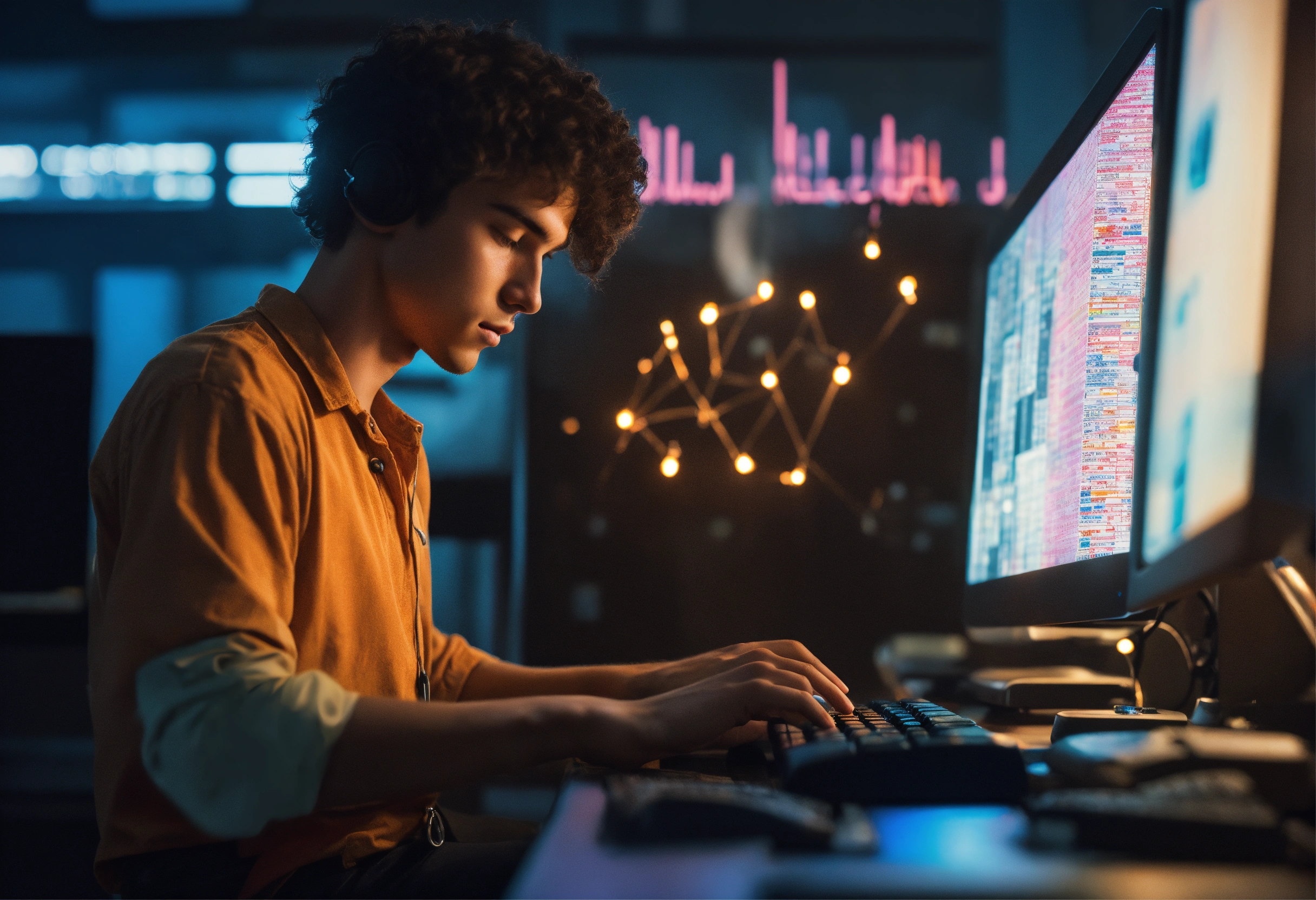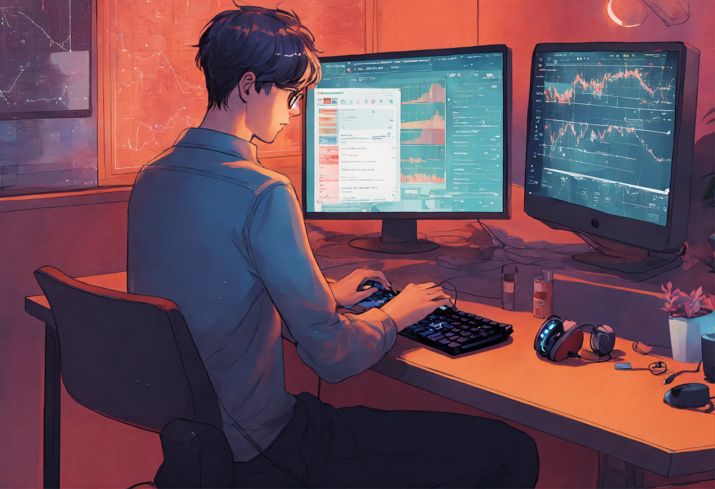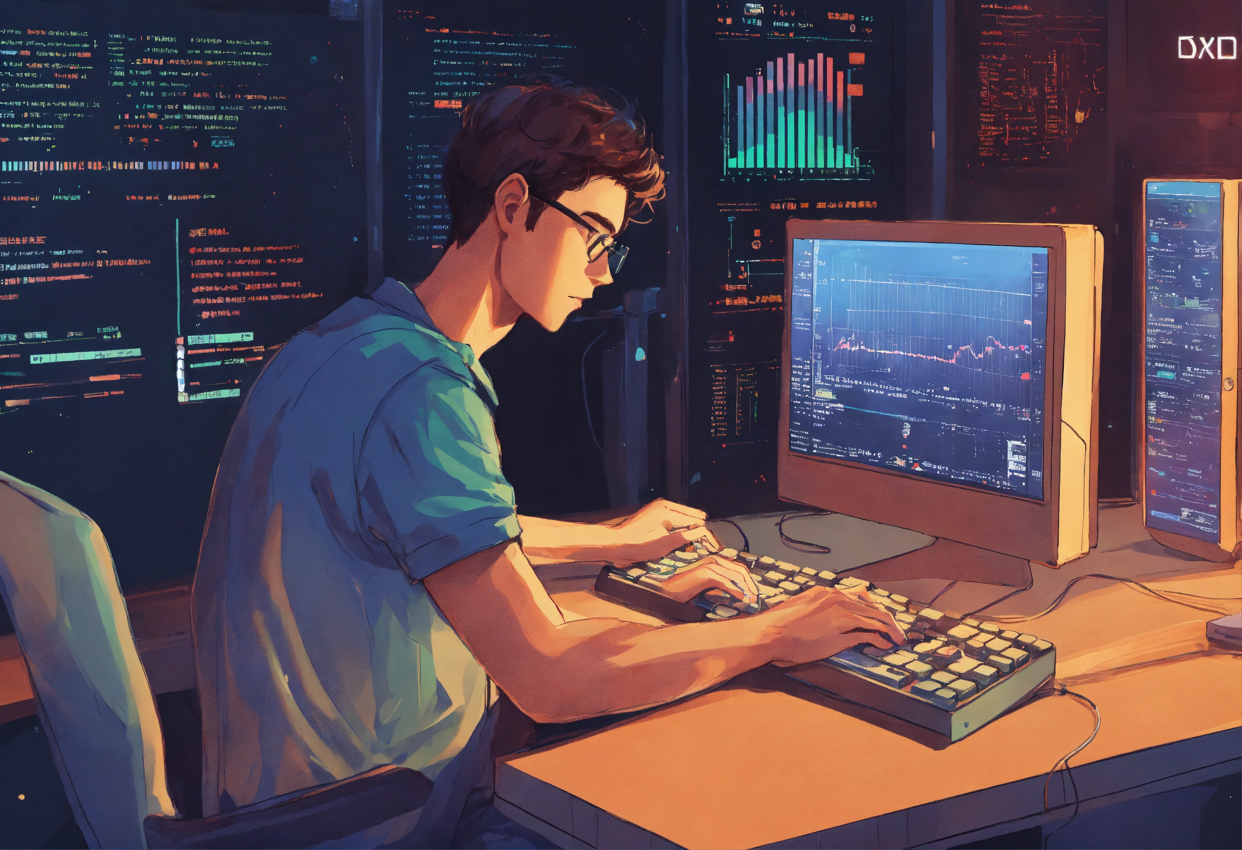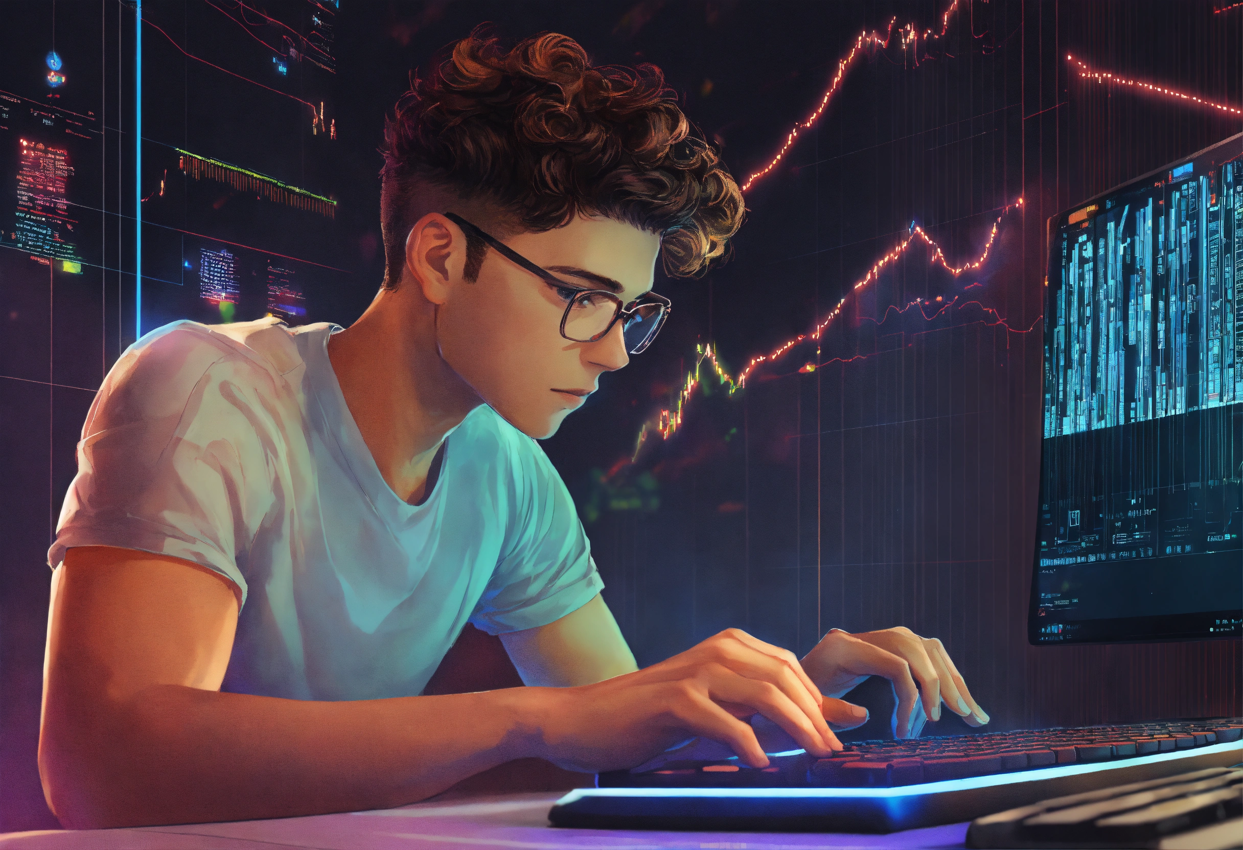 A young man is typing text on a keyboard. the background is a computer image and a growth chart, an image that uses symbols and signs to convey information, style illustrative, pseudographic, symbolic, style david lanham, anya stepanova, julia rothman
