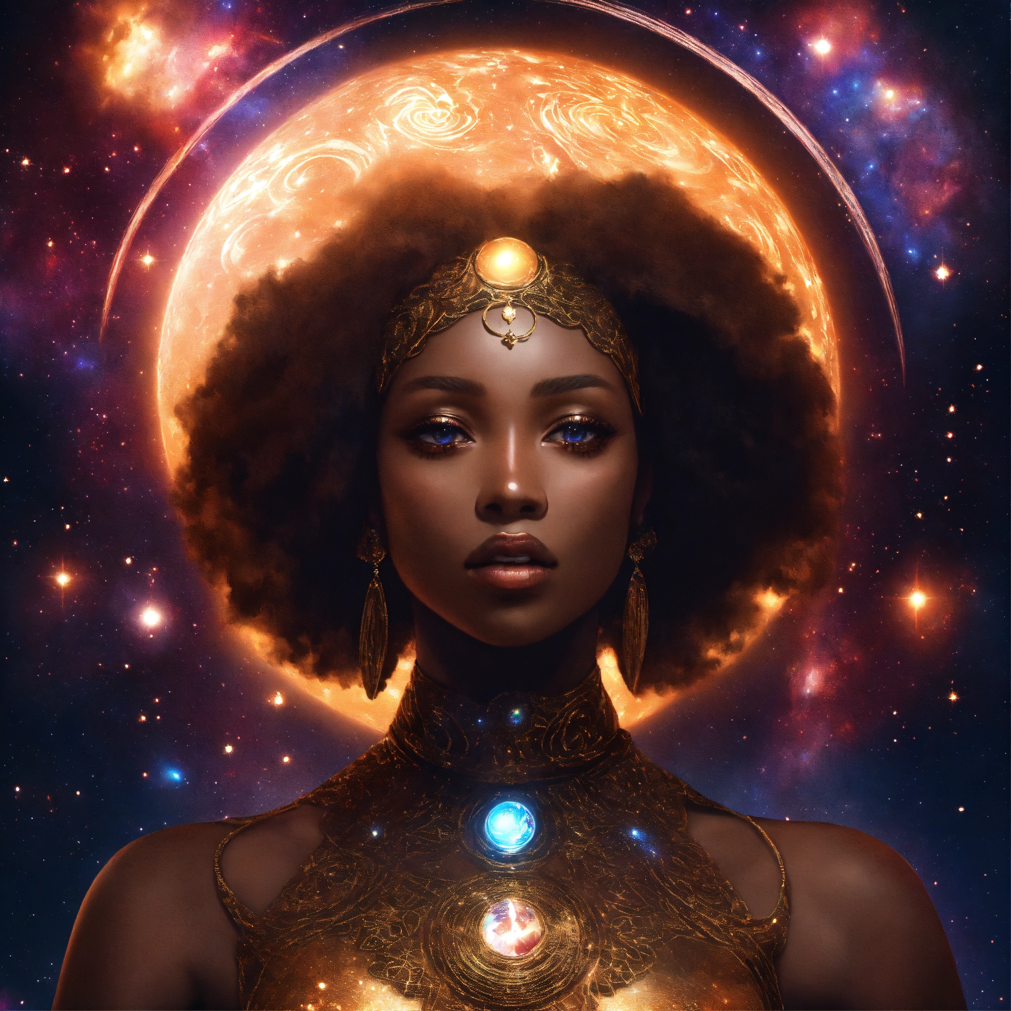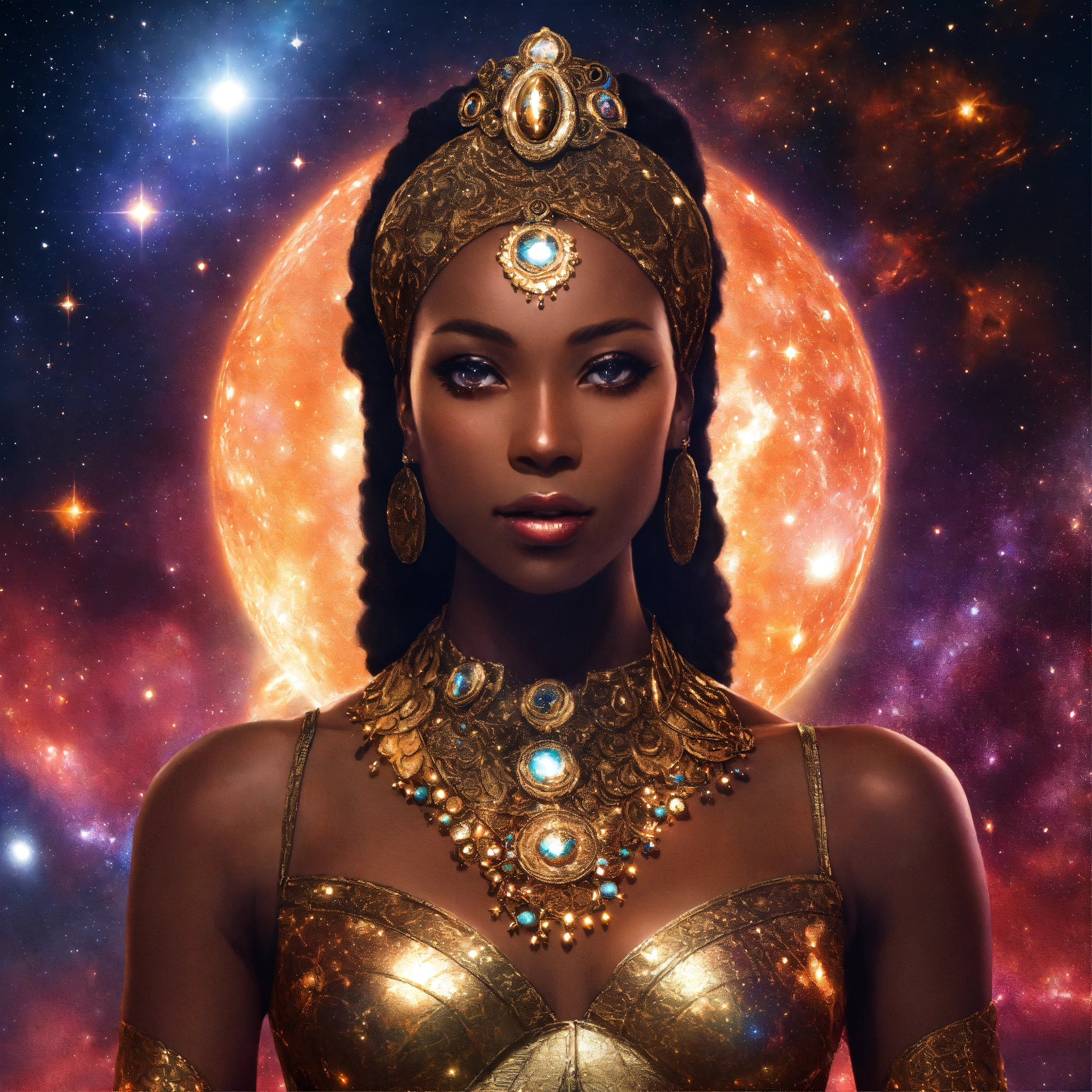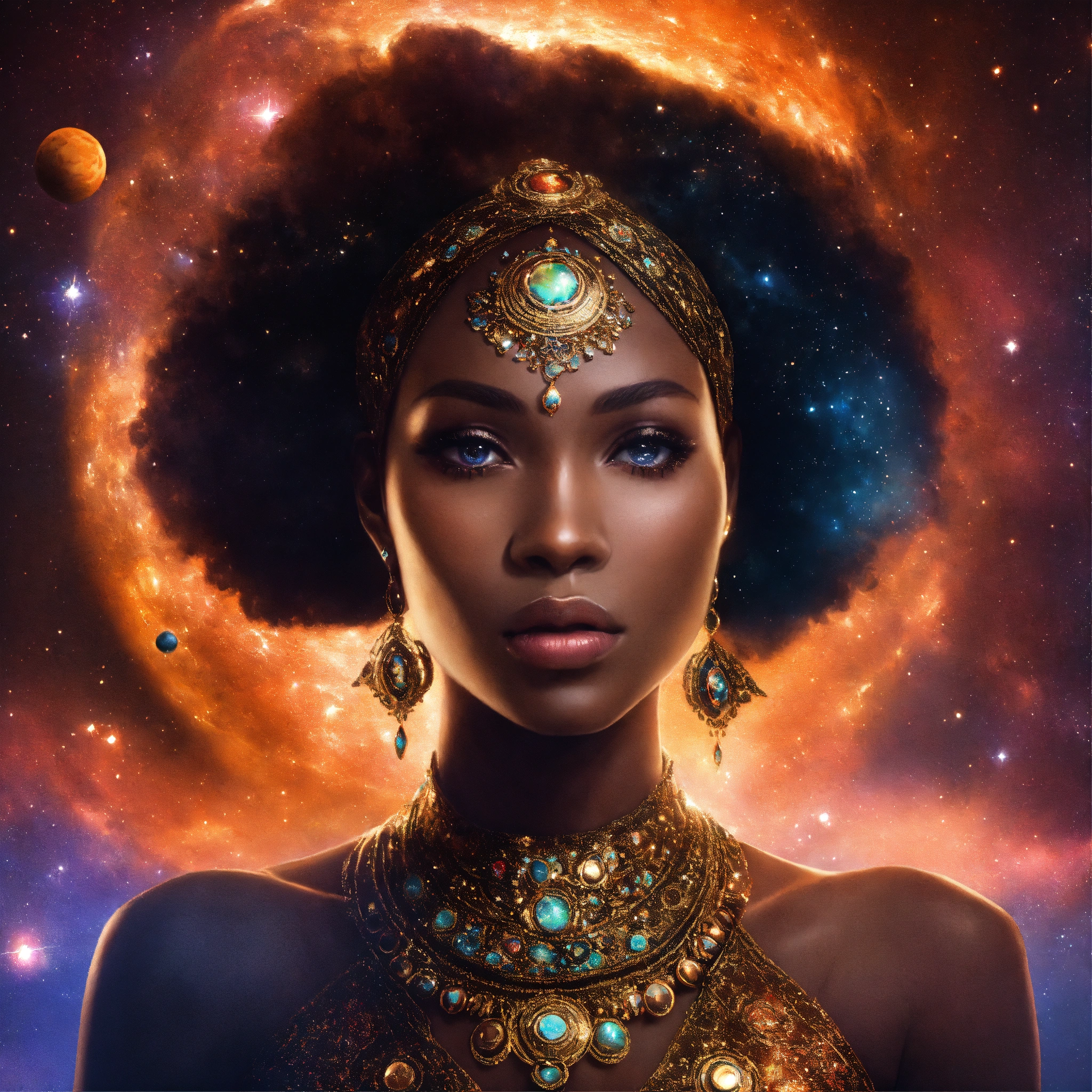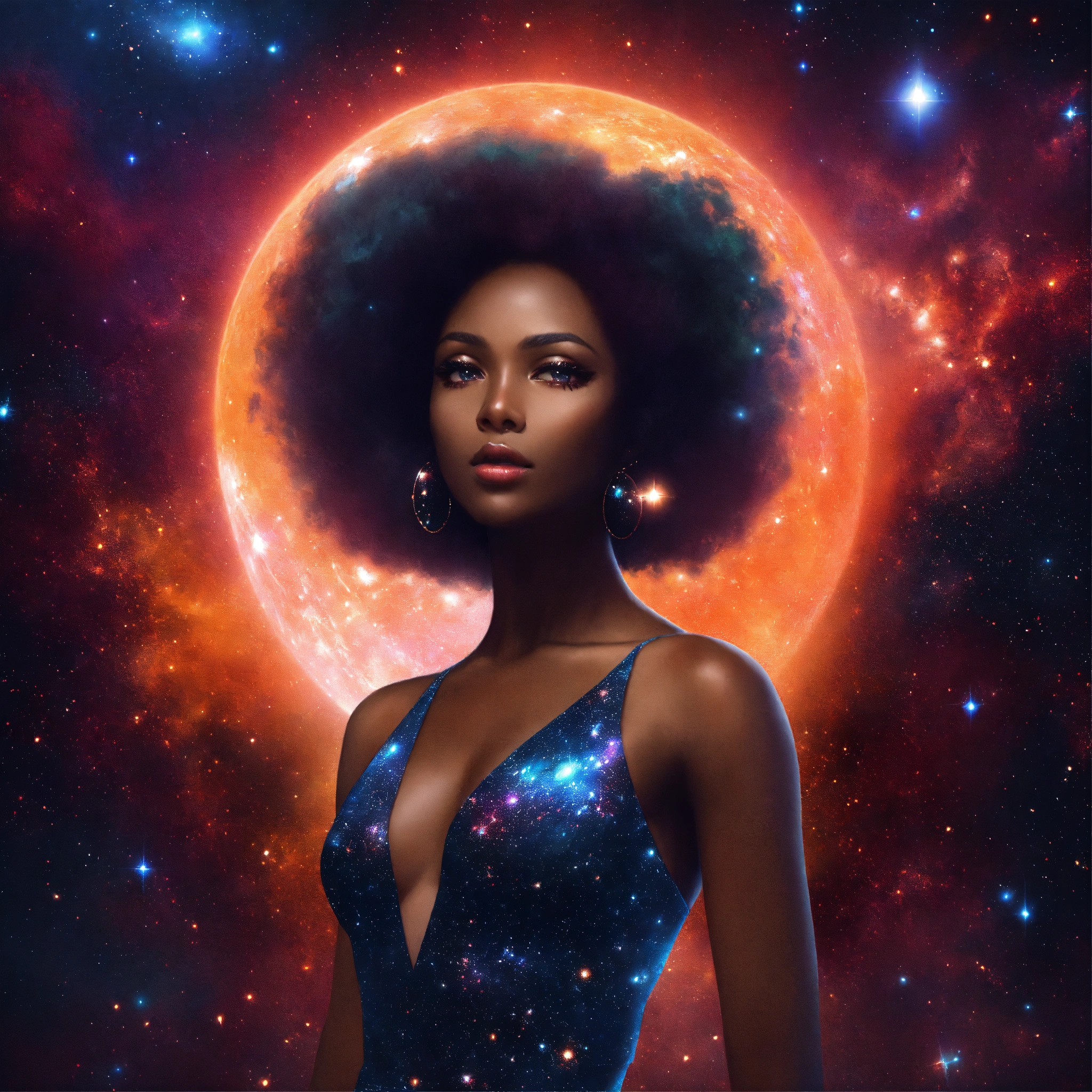 "create an image where the beautiful, dark-skinned woman appears as if she's descended from the stars. surround her with a mesmerizing cosmic background, with her features and attire reflecting the brilliance of distant galaxies."