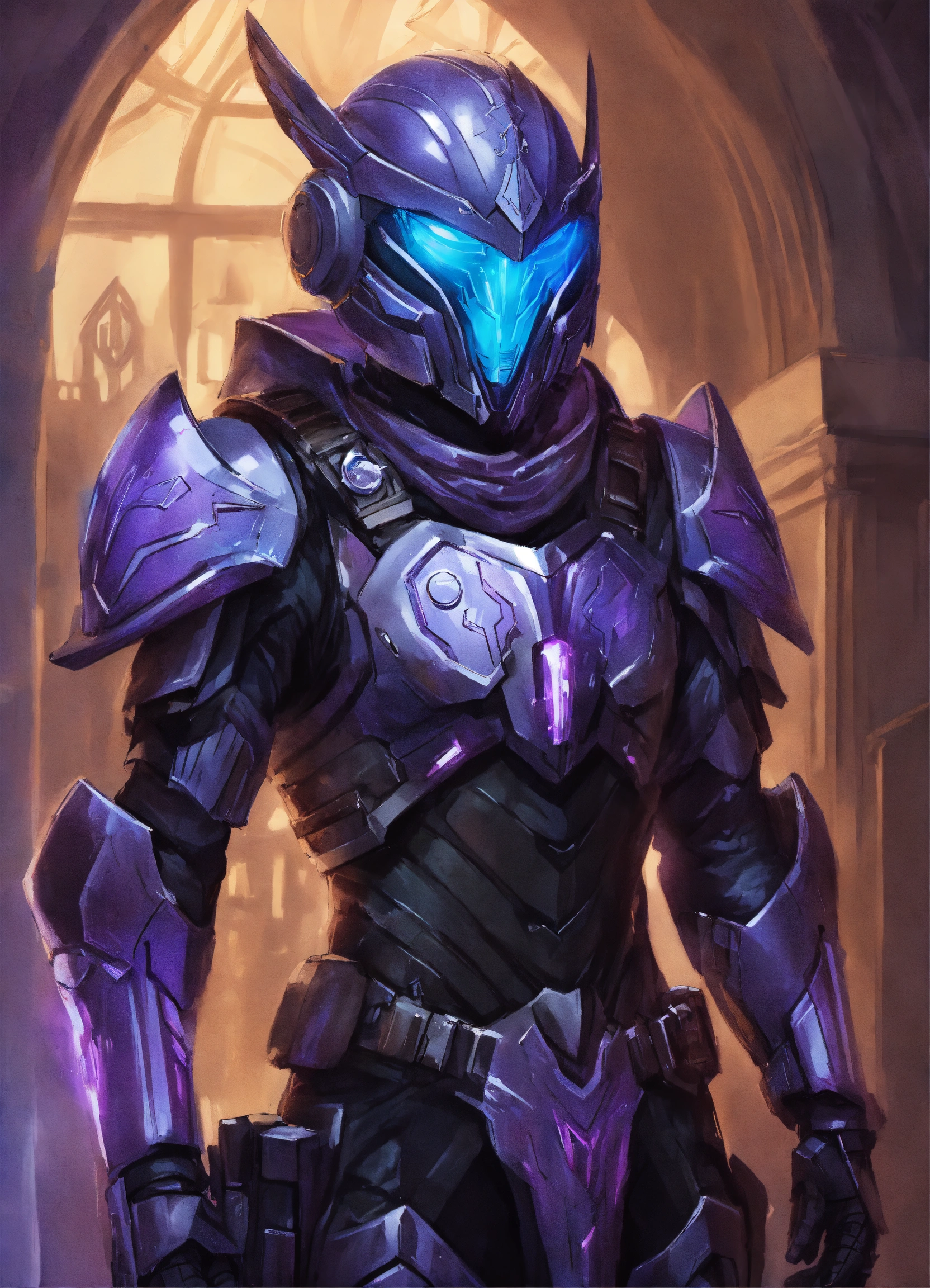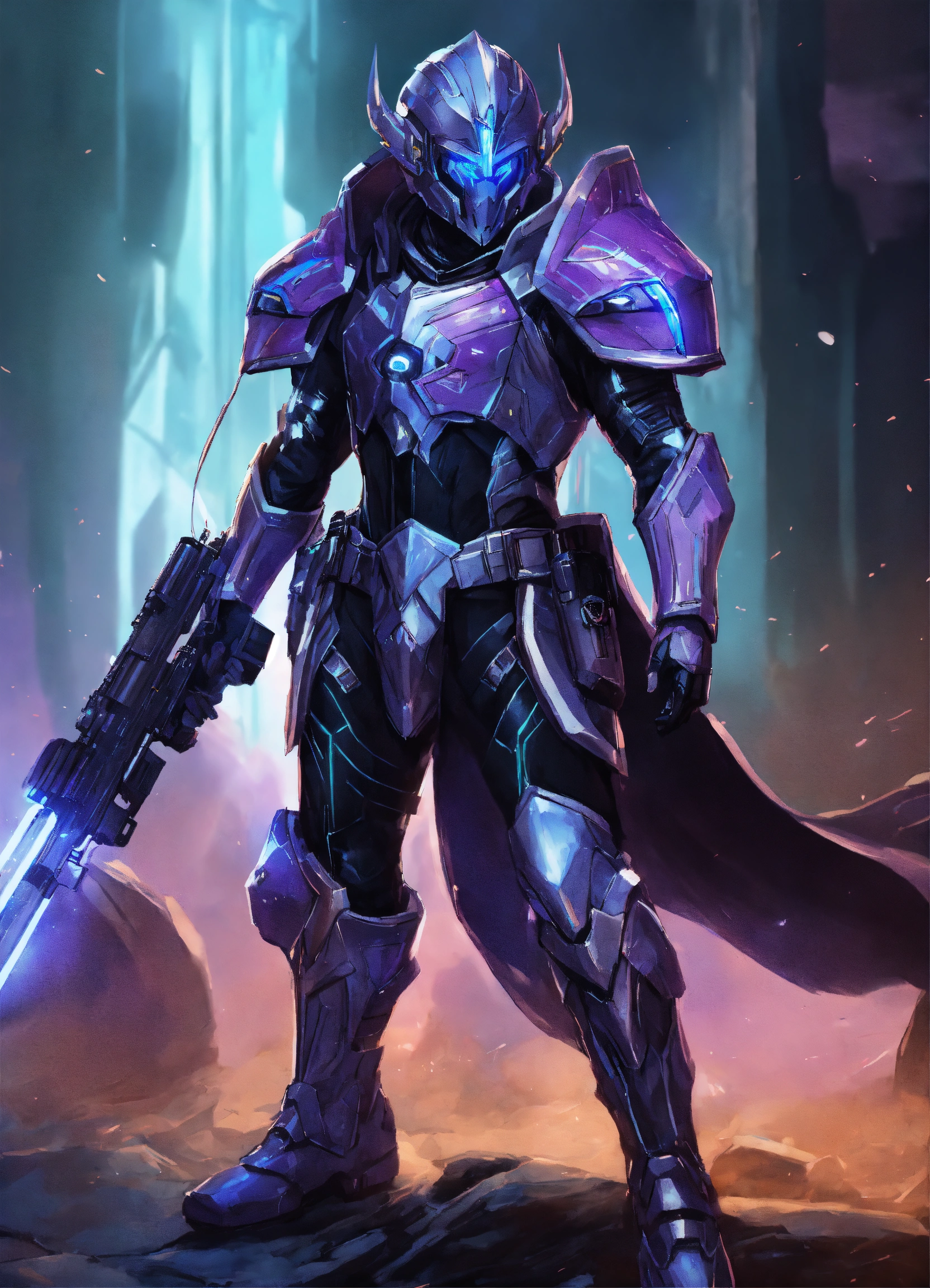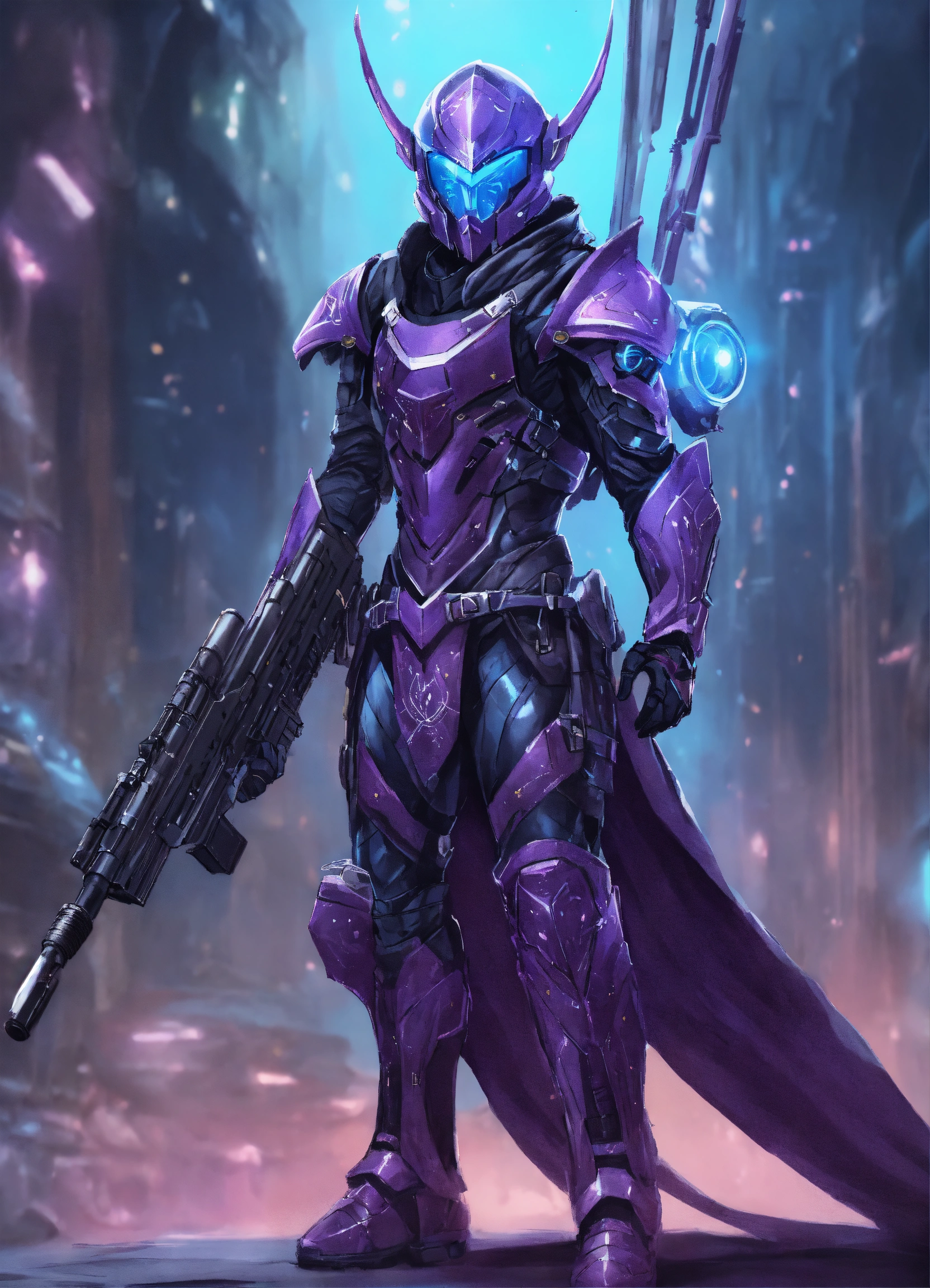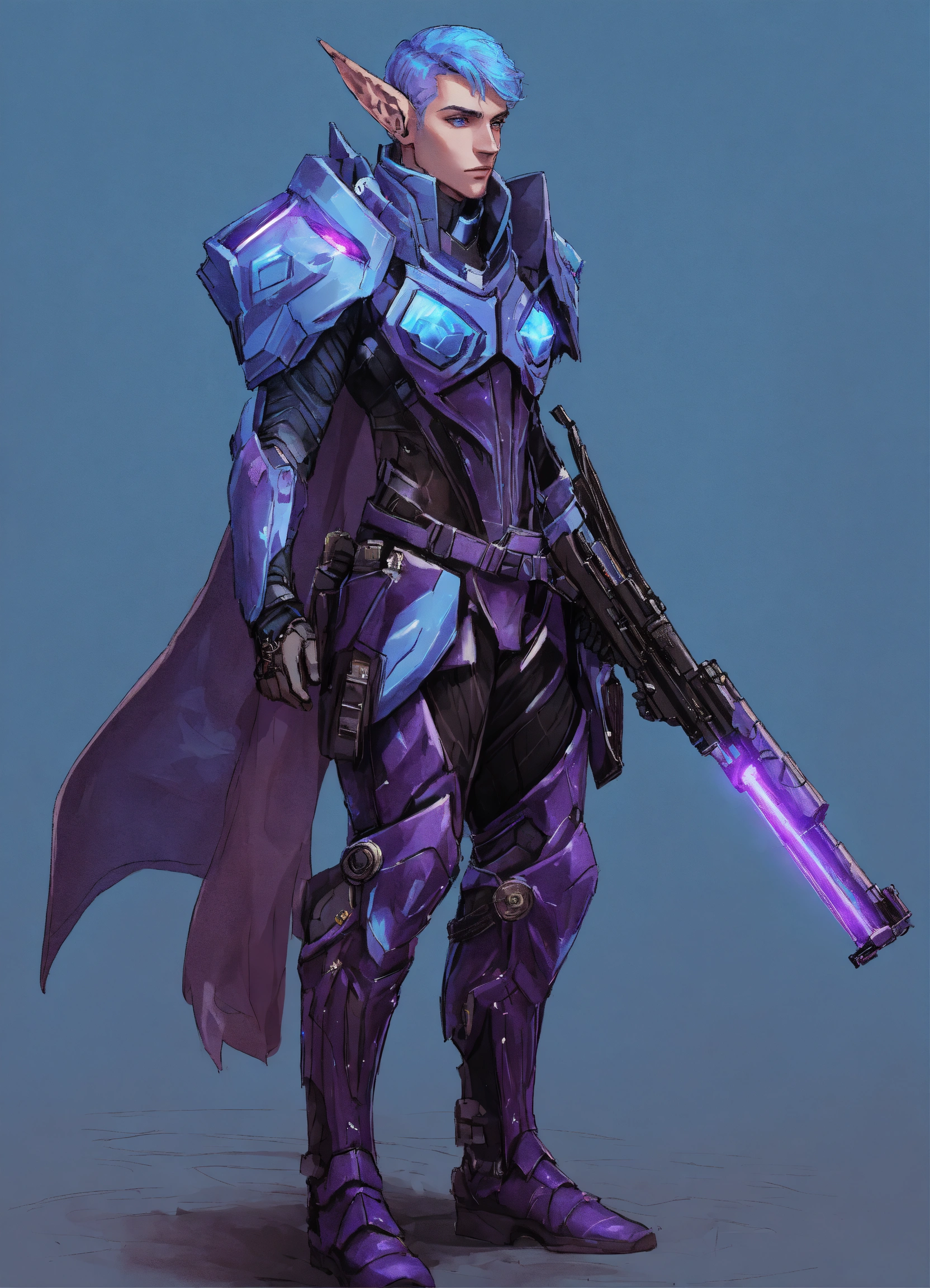 Drawing of a full body of a high elf sci fi soldier wearing heavy sci fi elven armor, cybernetic black and purple and light blue armor and helmet, boots, male, holding a light machine gun with both hands, full body, hd