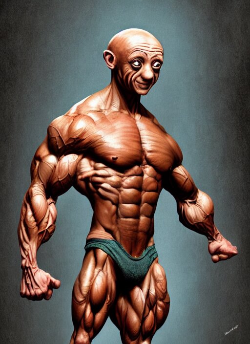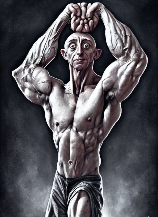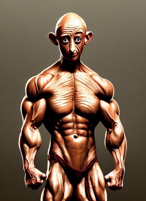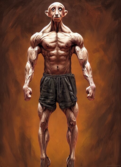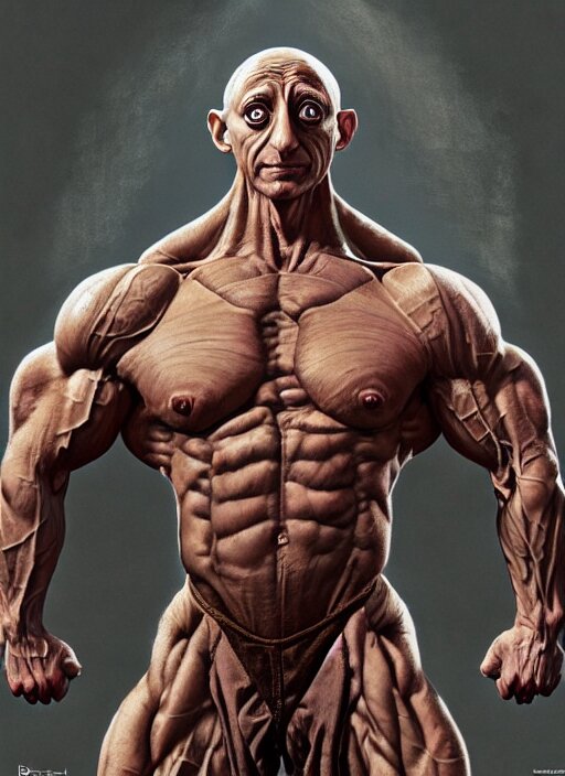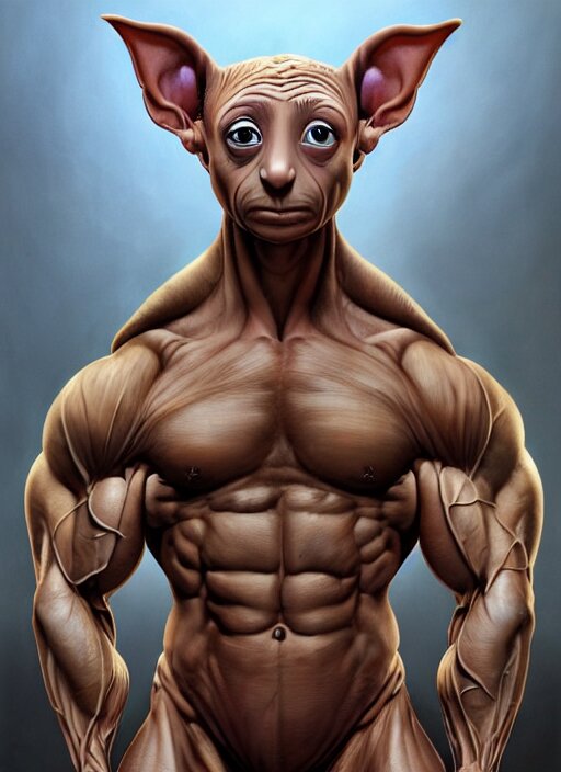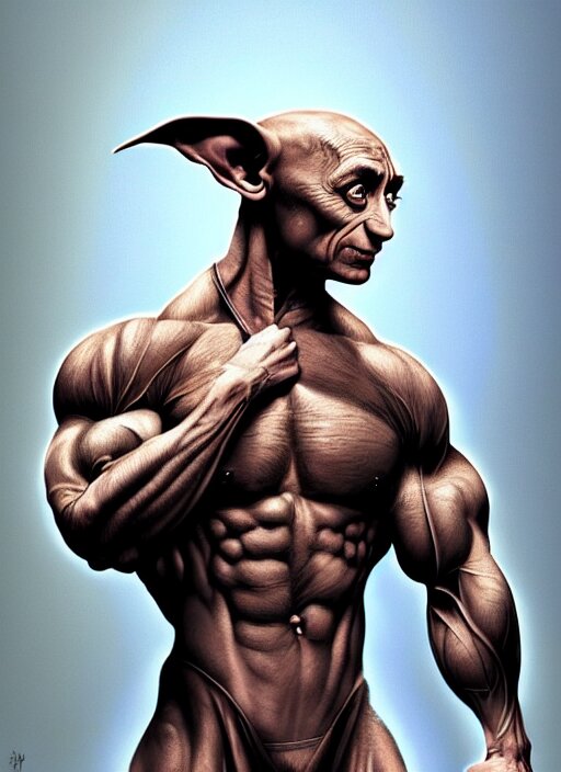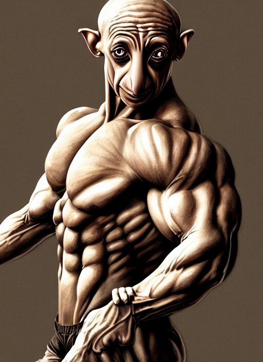 Dobby the house elf as a bodybuilder, flexing, big muscles, elegant intricate digital painting artstation concept art by mark brooks and brad kunkle and beksinski extreme detail 4 k