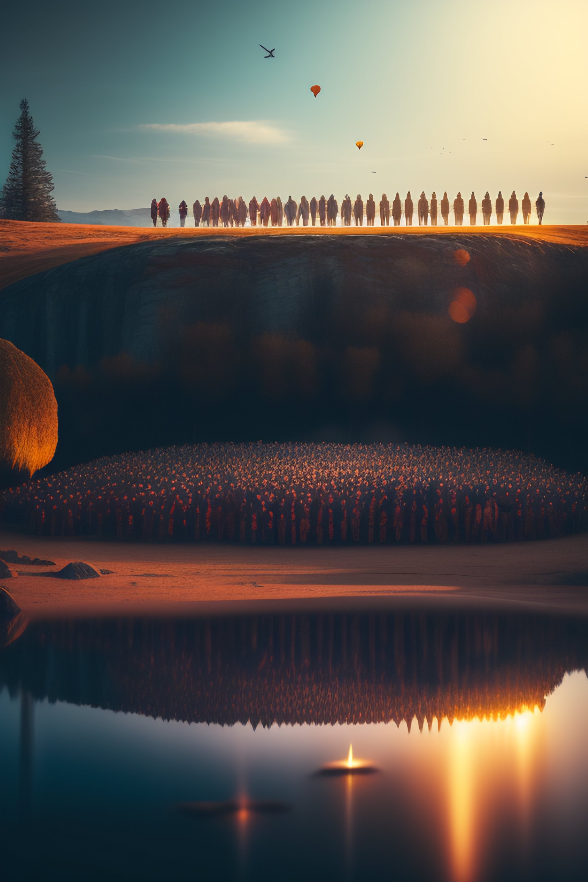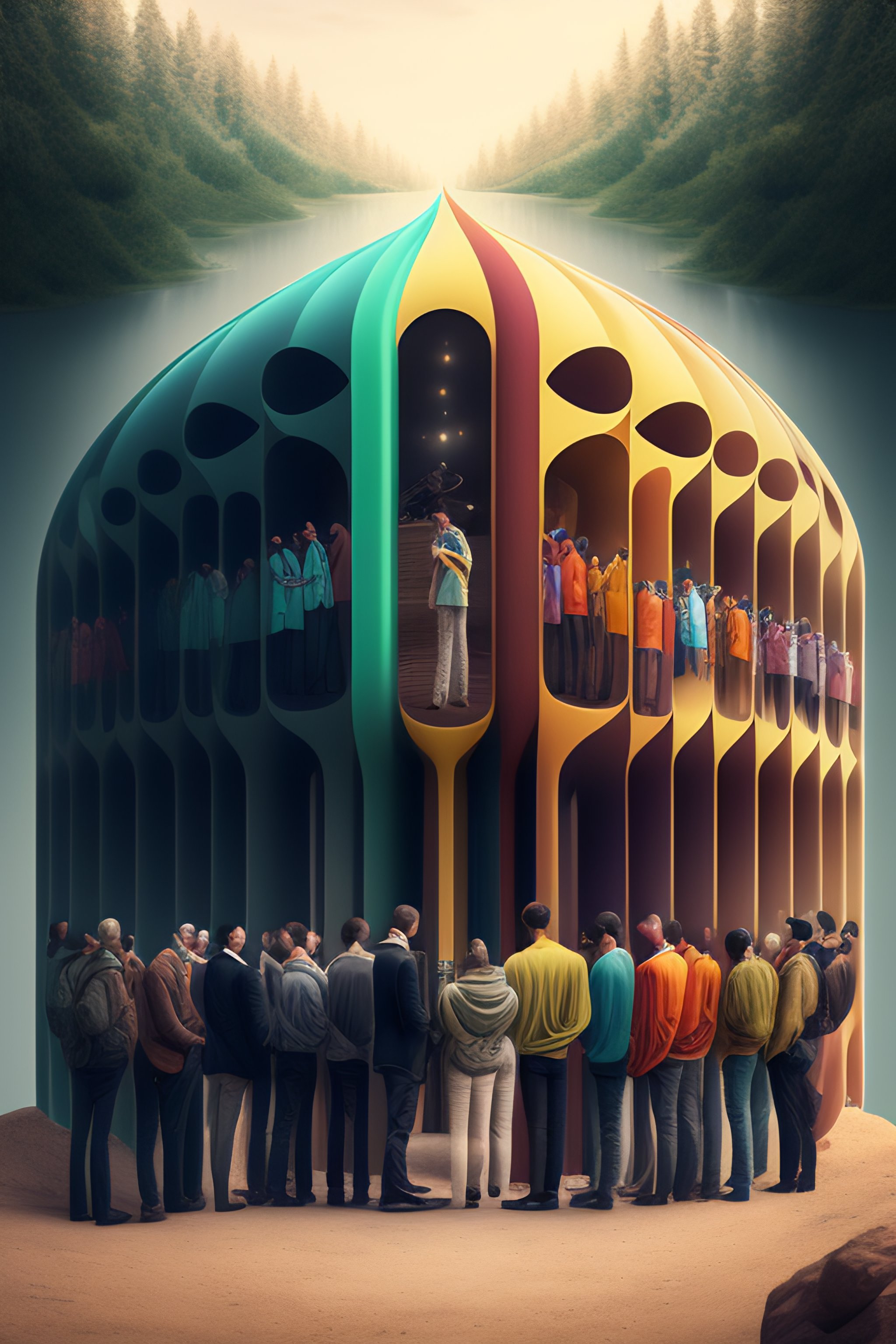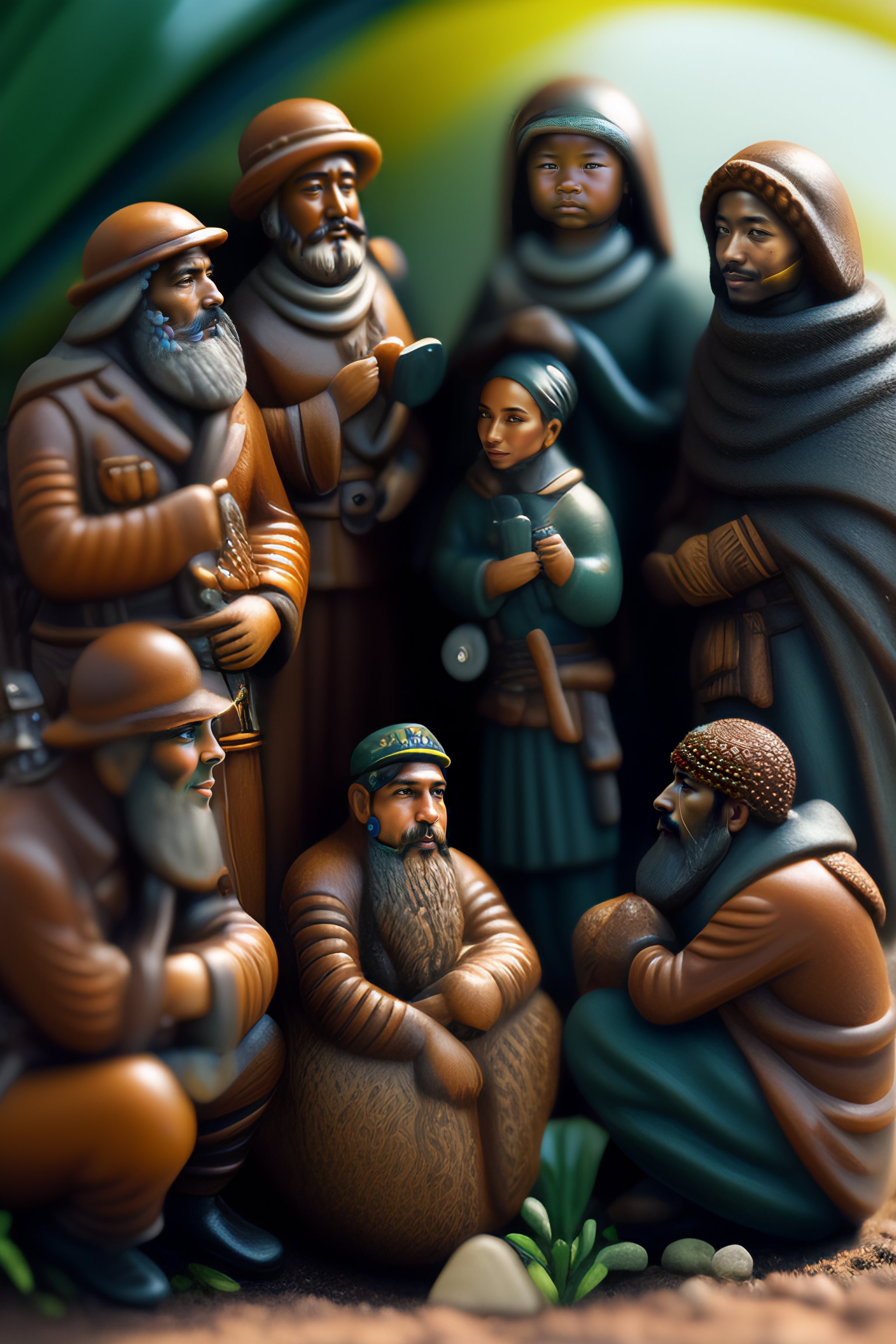 Conflict resolved, connected in consciousness, group of people, workplace, detailed humanaoids, nature, high detail, love overtone, creative, 5 people in one image
