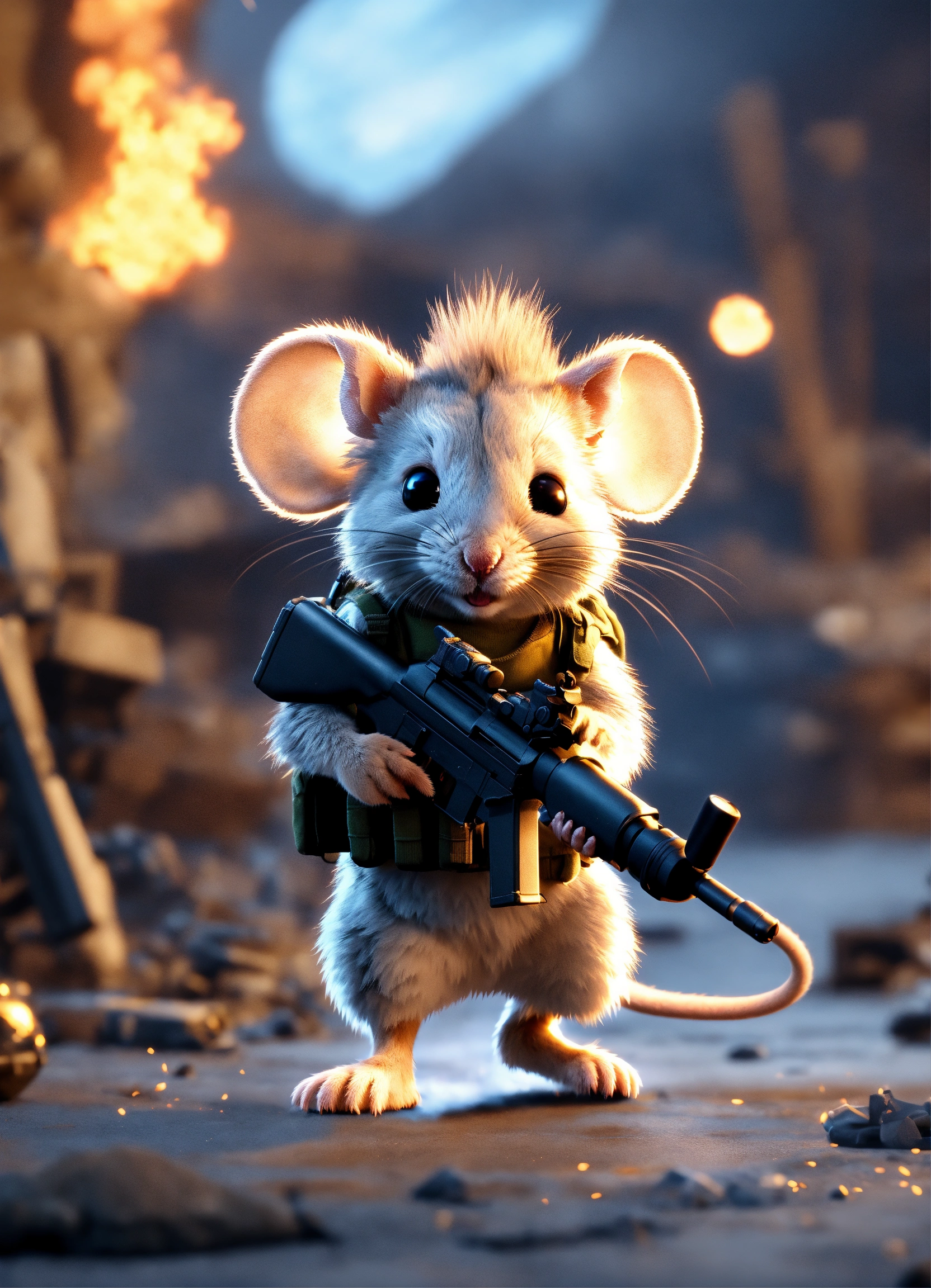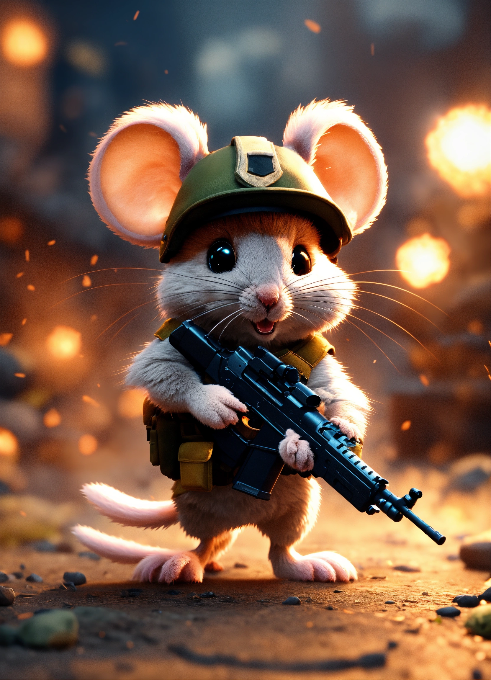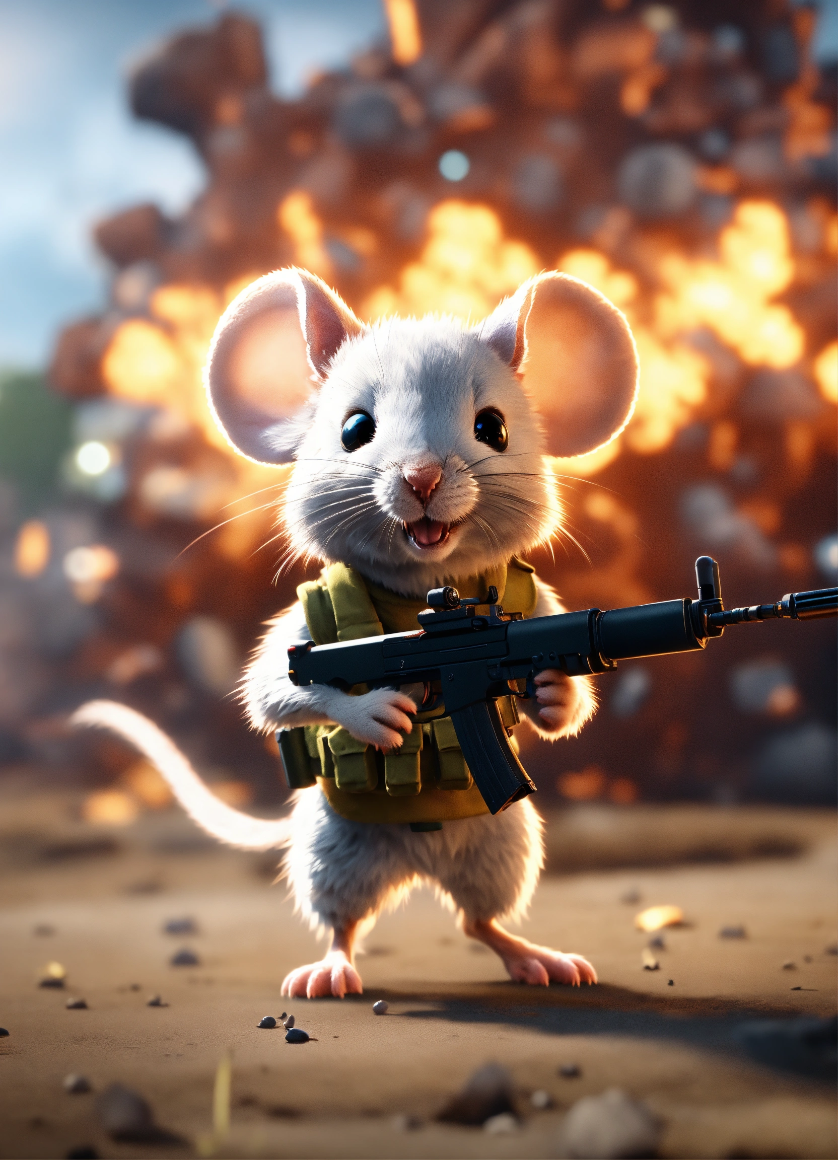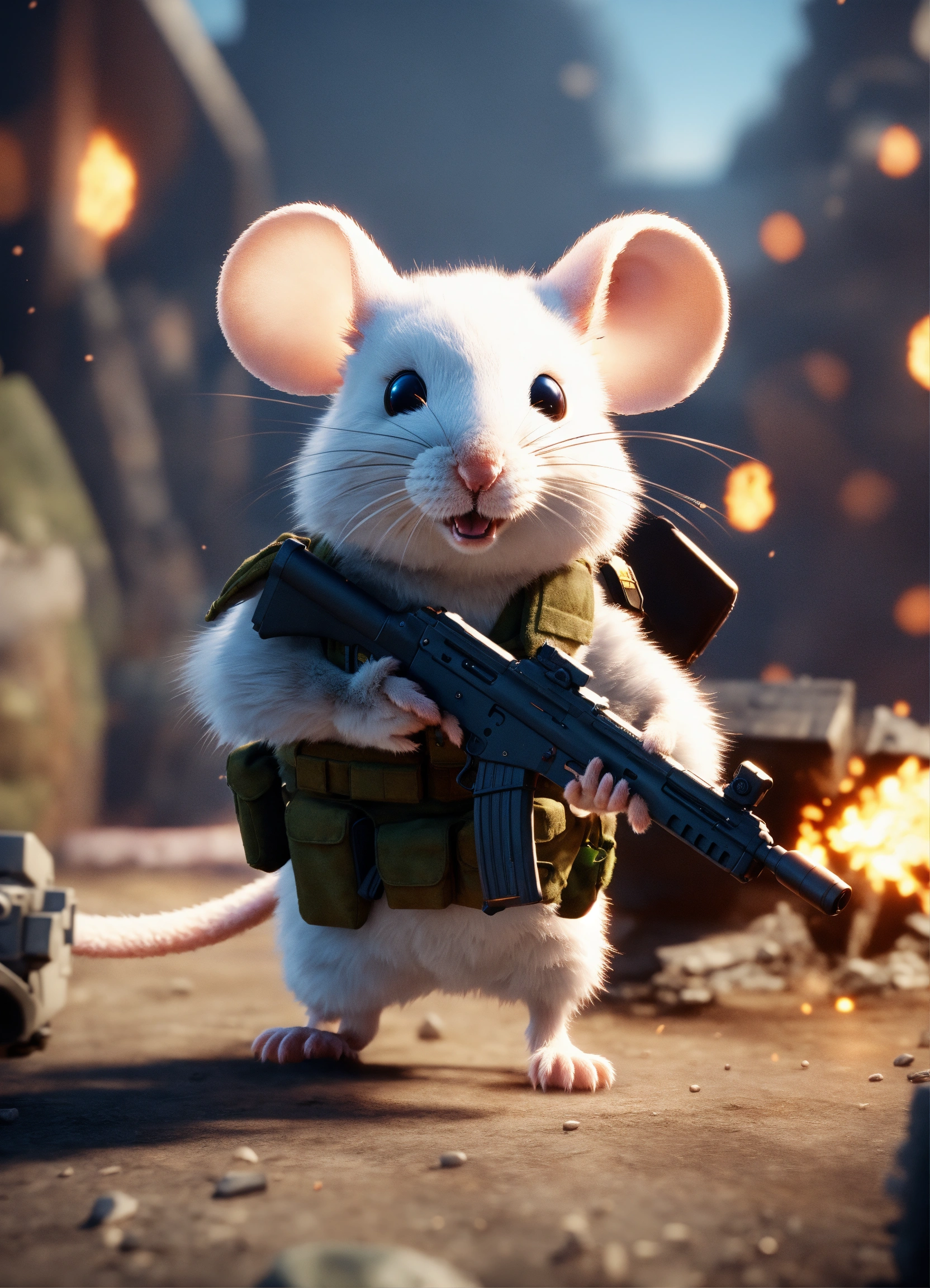 A cute fluffy army mouse with a gun walking away from a blast in the background, unreal engine render, 8k, cinematic