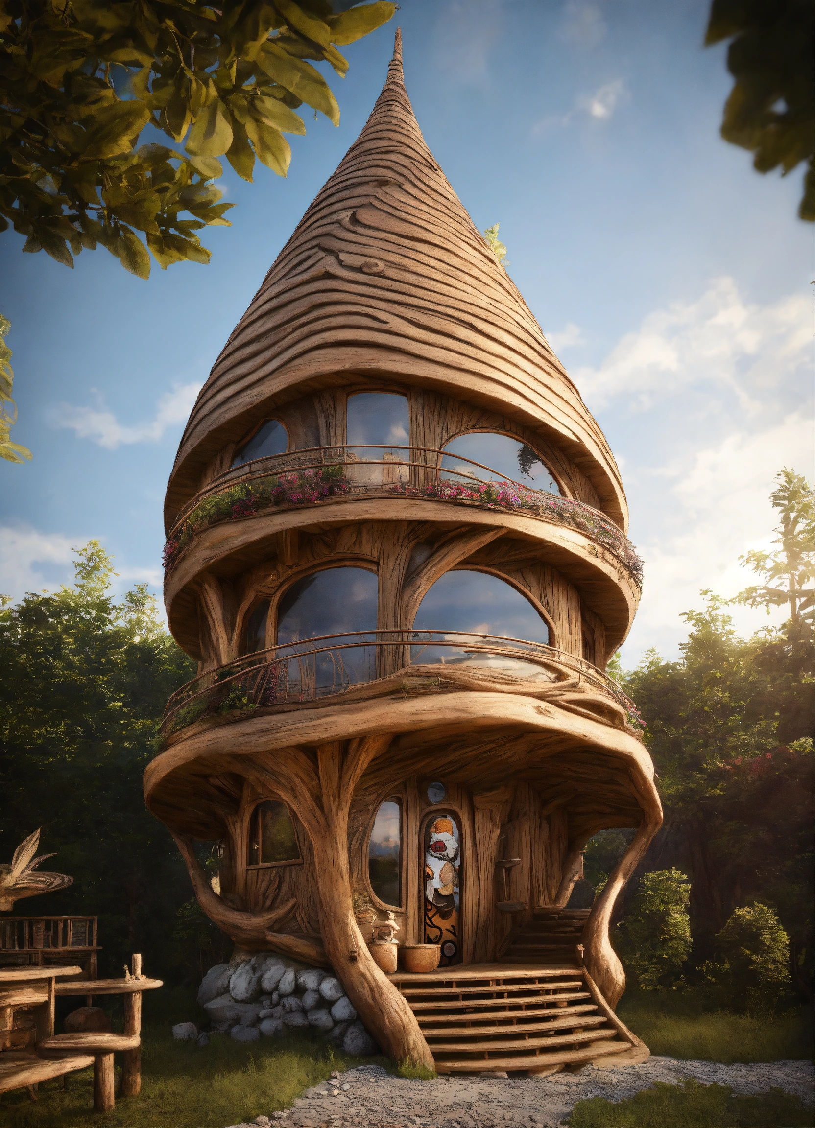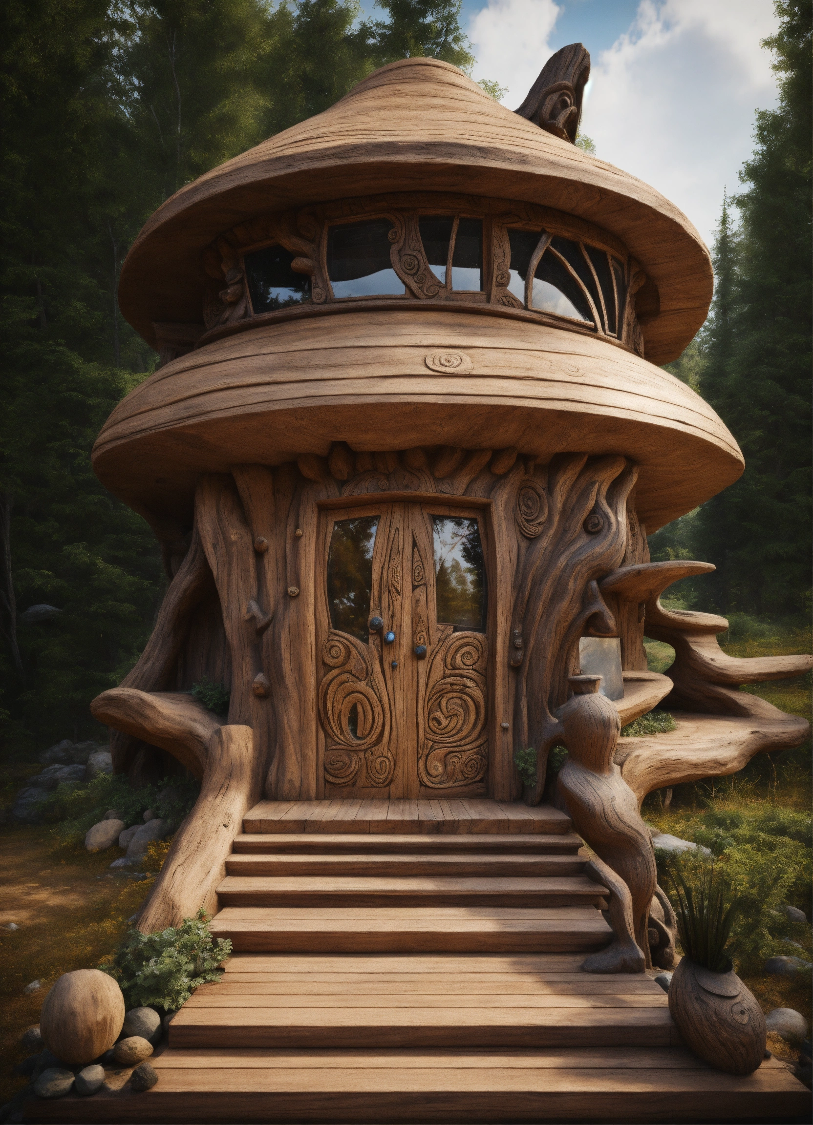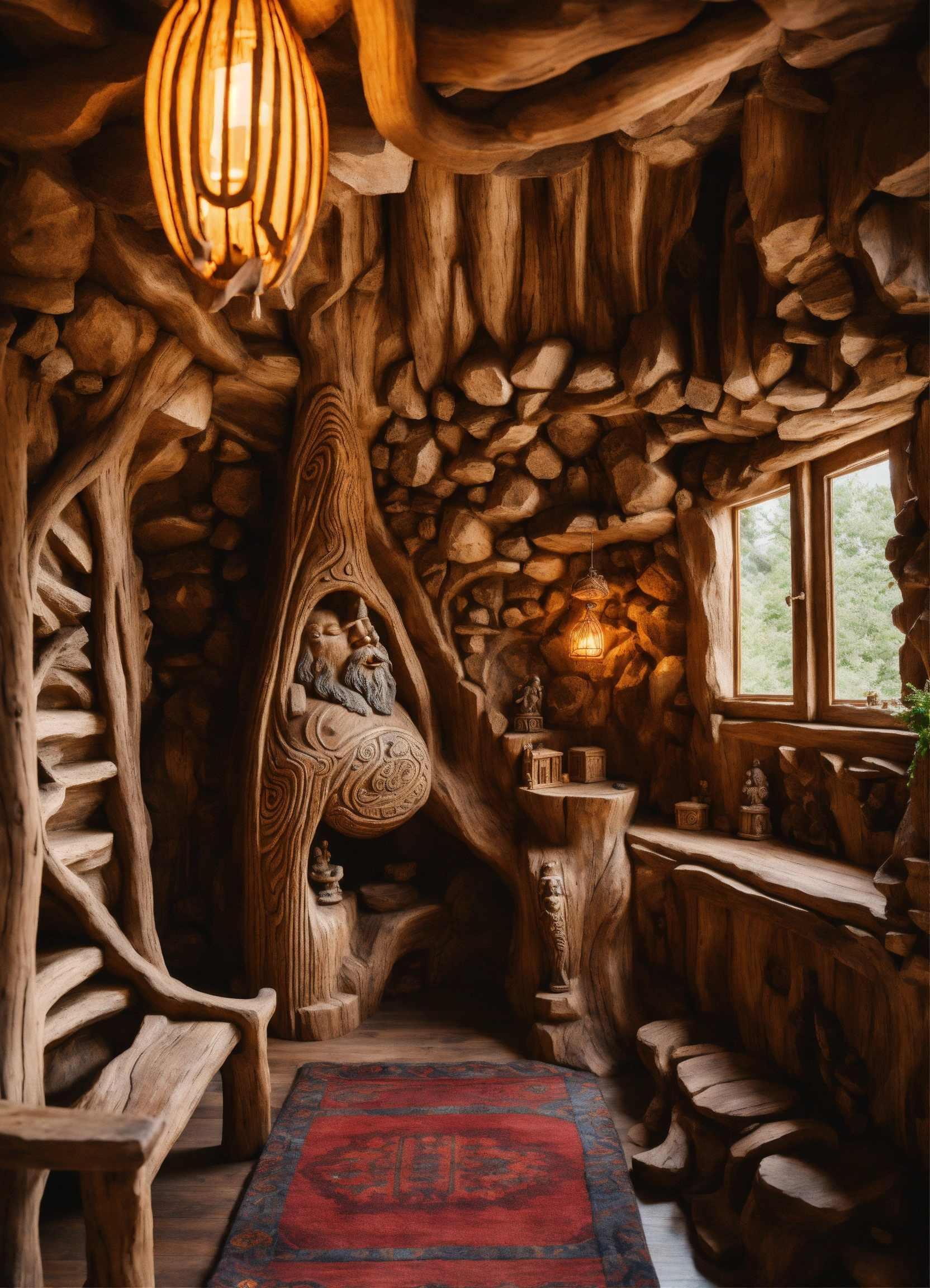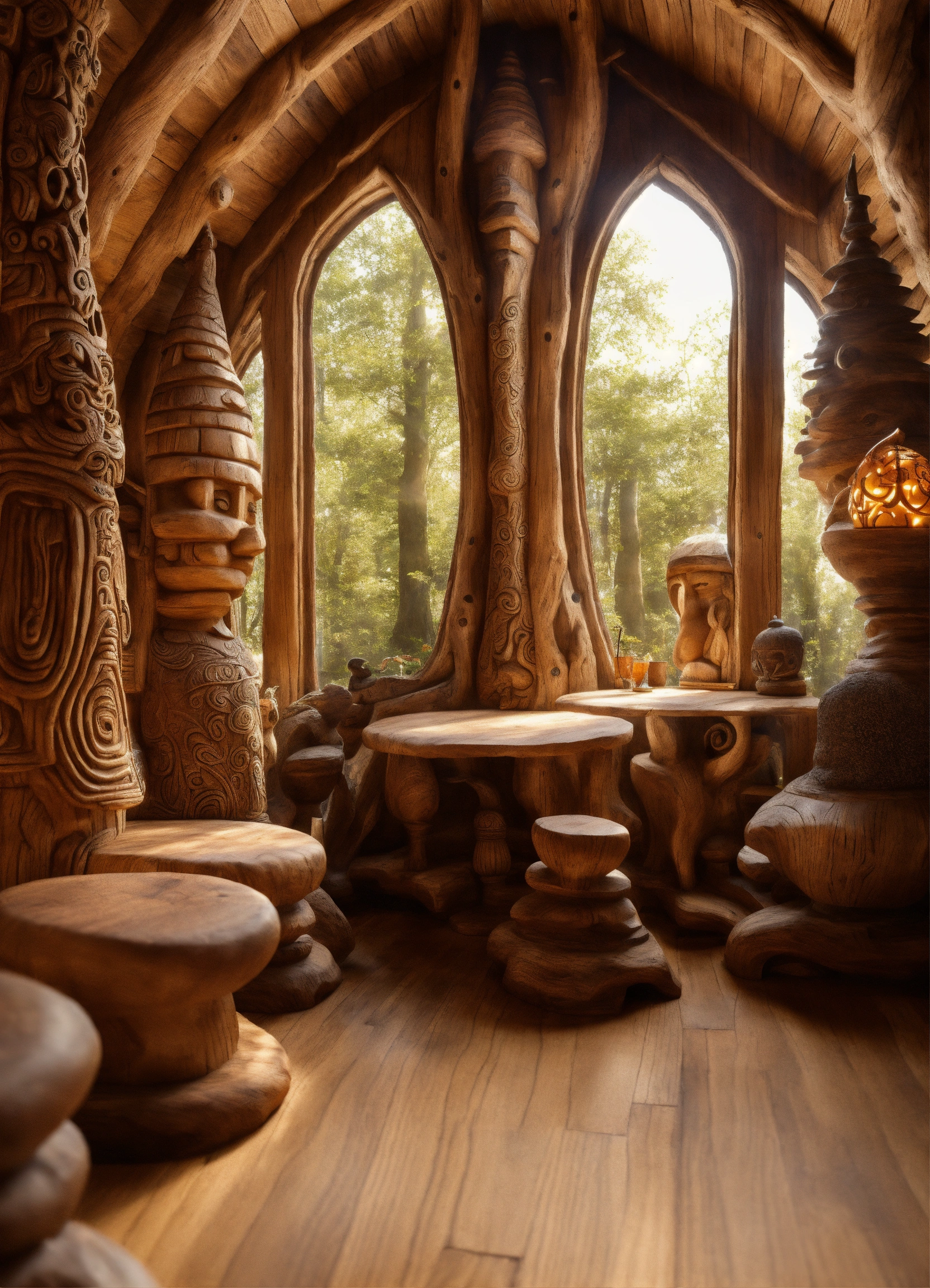 An ancient style spiritual gnome inspired house simple wooden interior looking outside.sculptured . style of alex grey, giger.unreal engine.totem sculptures.swirling patterned.wood.stone/driftwood.statues. artistic sculpture.air bnb tiny house