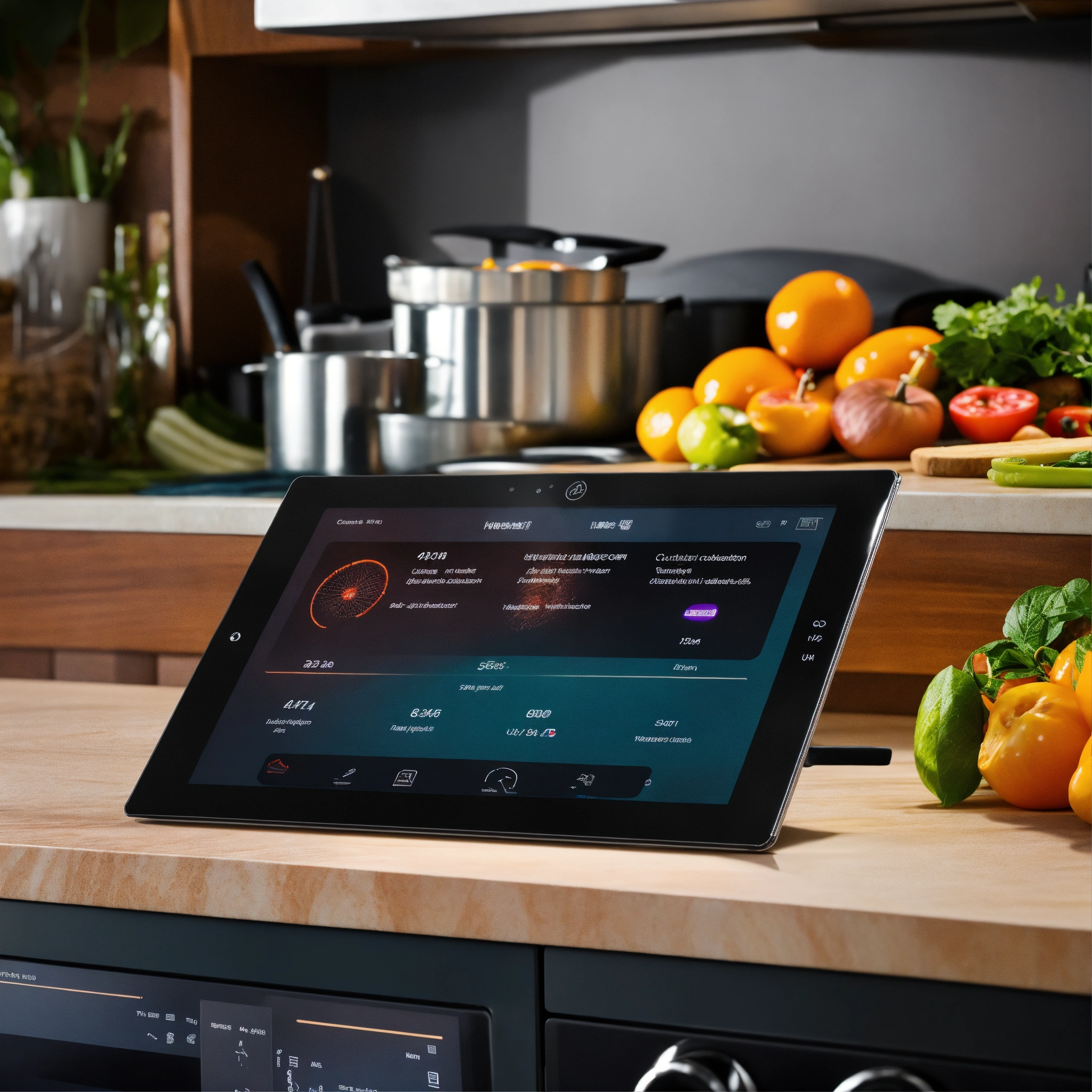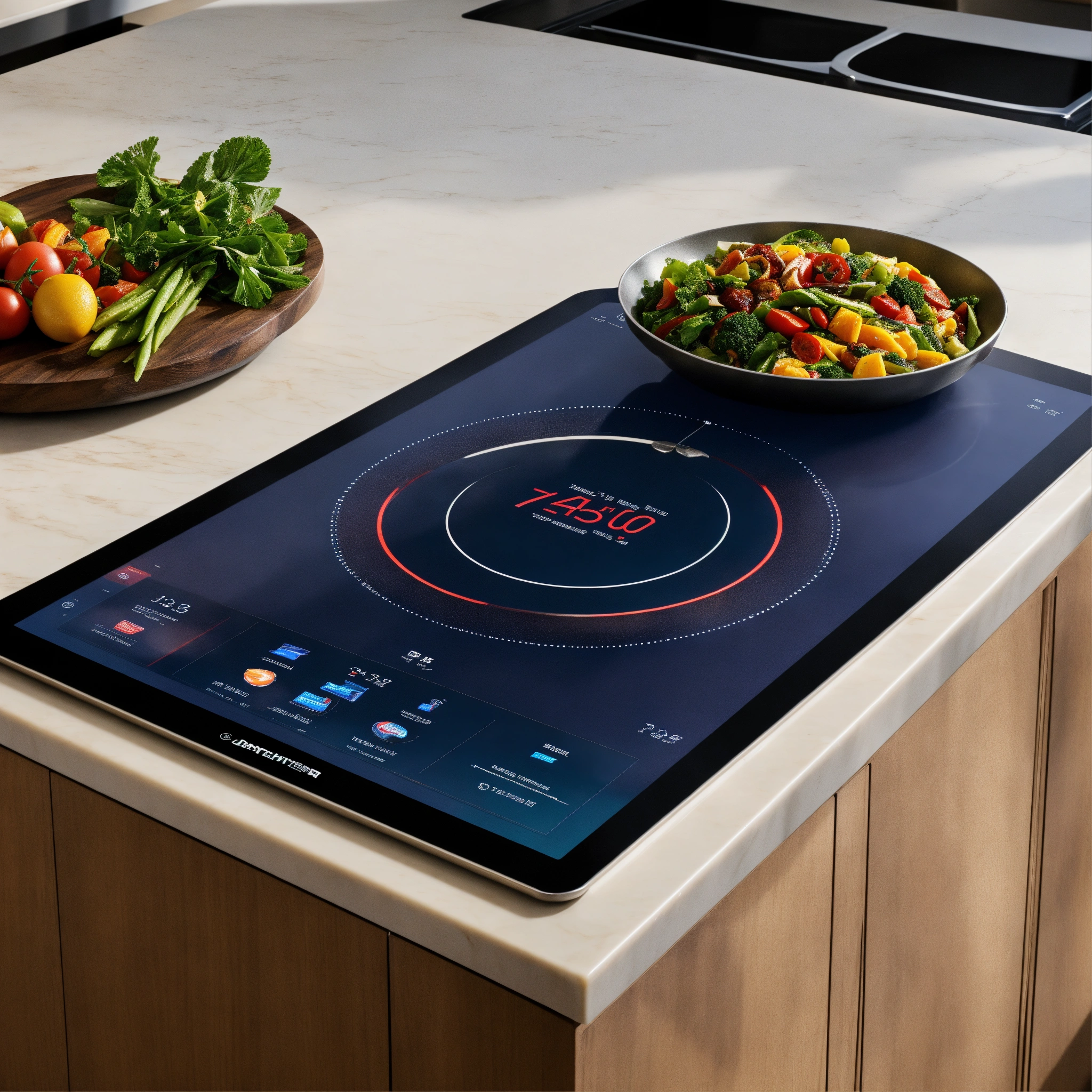 Close-up view of a 7-inch tablet embedded in a kitchen island countertop. the tablet's screen prominently displays a ui designed for an induction cooktop, highlighting controls for four distinct burners.