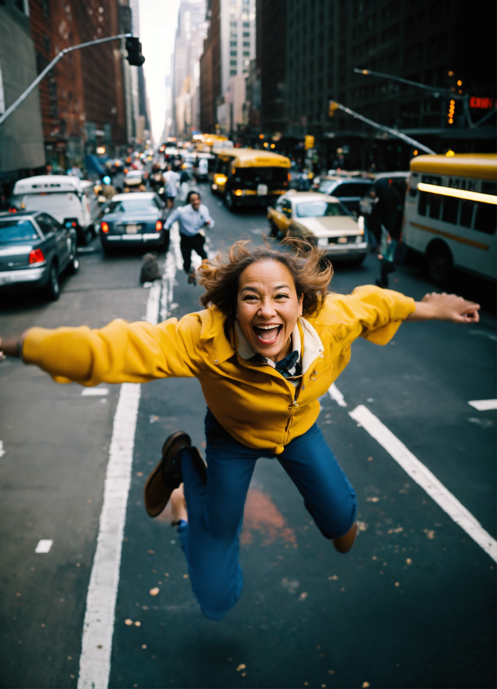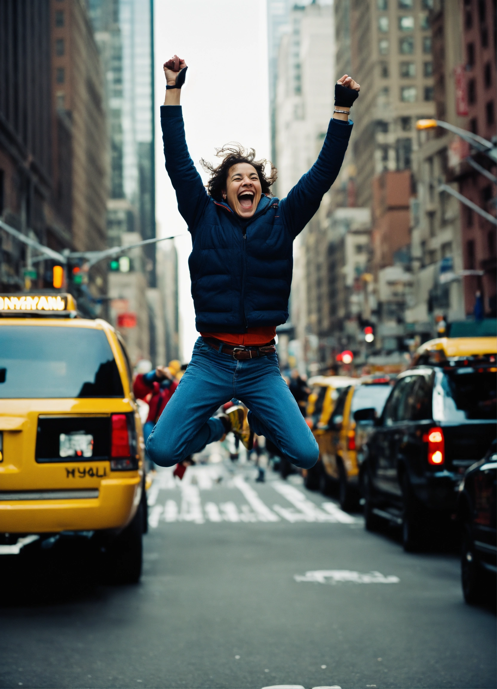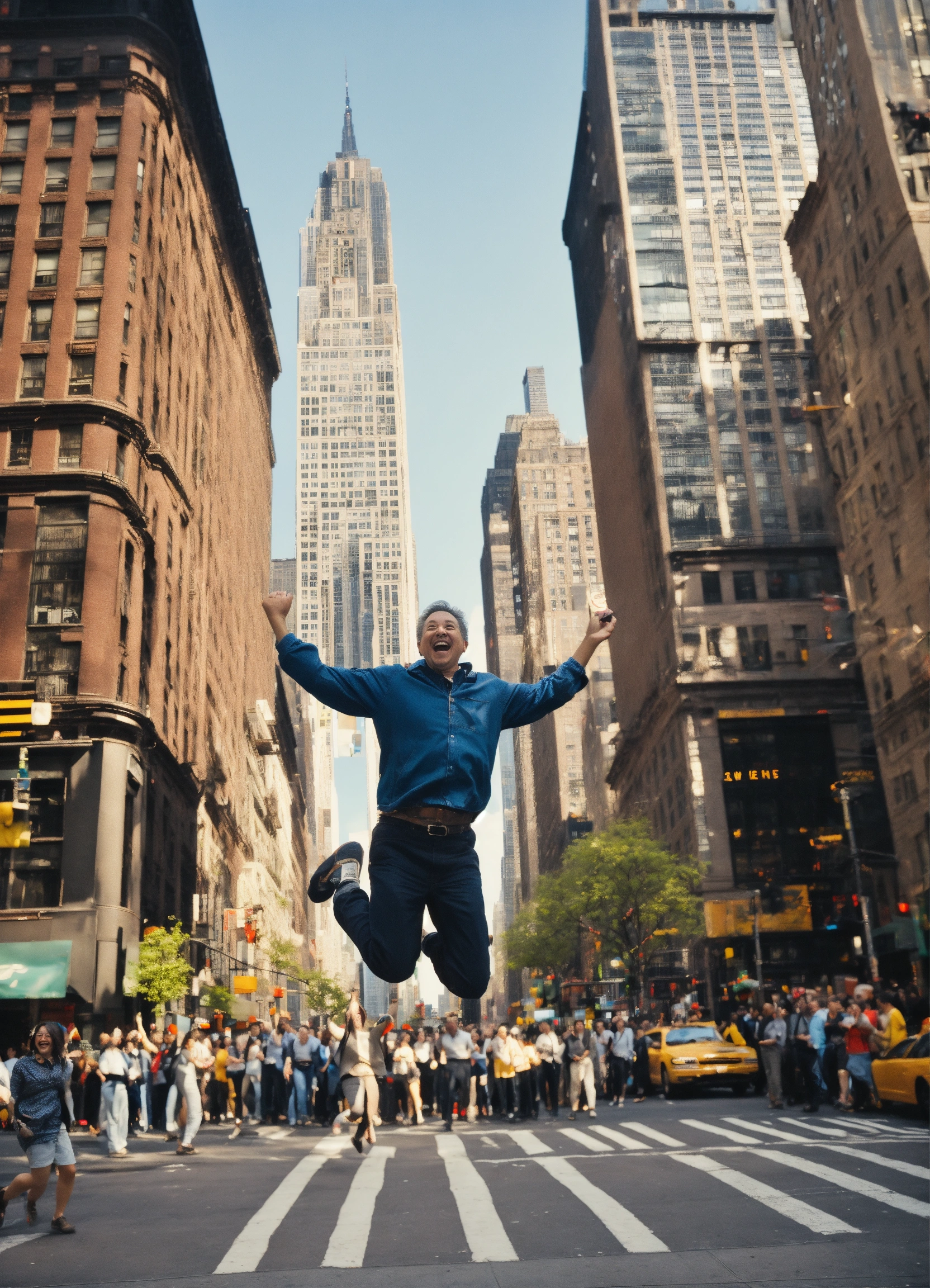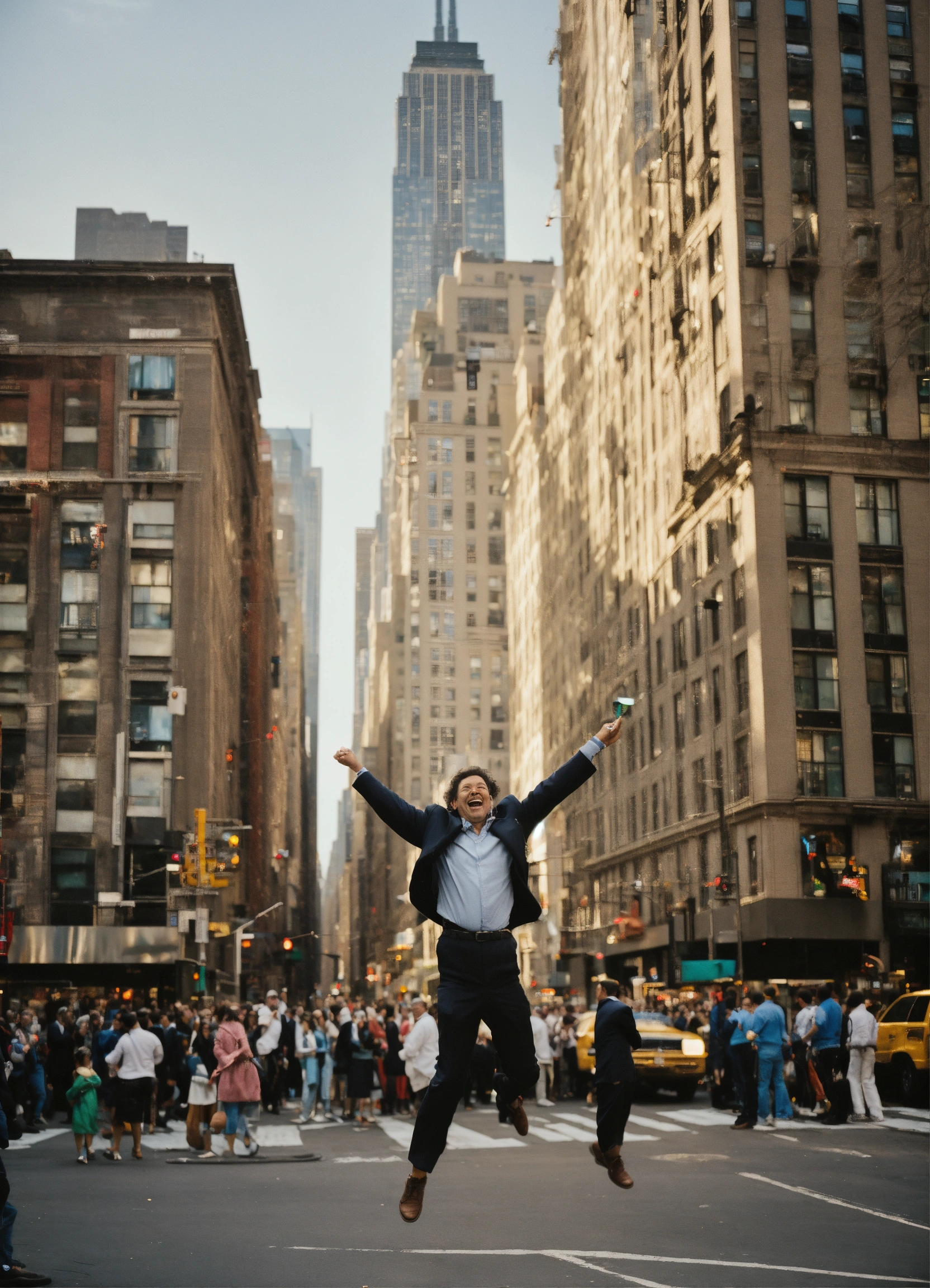 A middle-aged person jumping, crowd, new york city street, joyful expression, affairs skyscrapers, aerial shot, 35mm