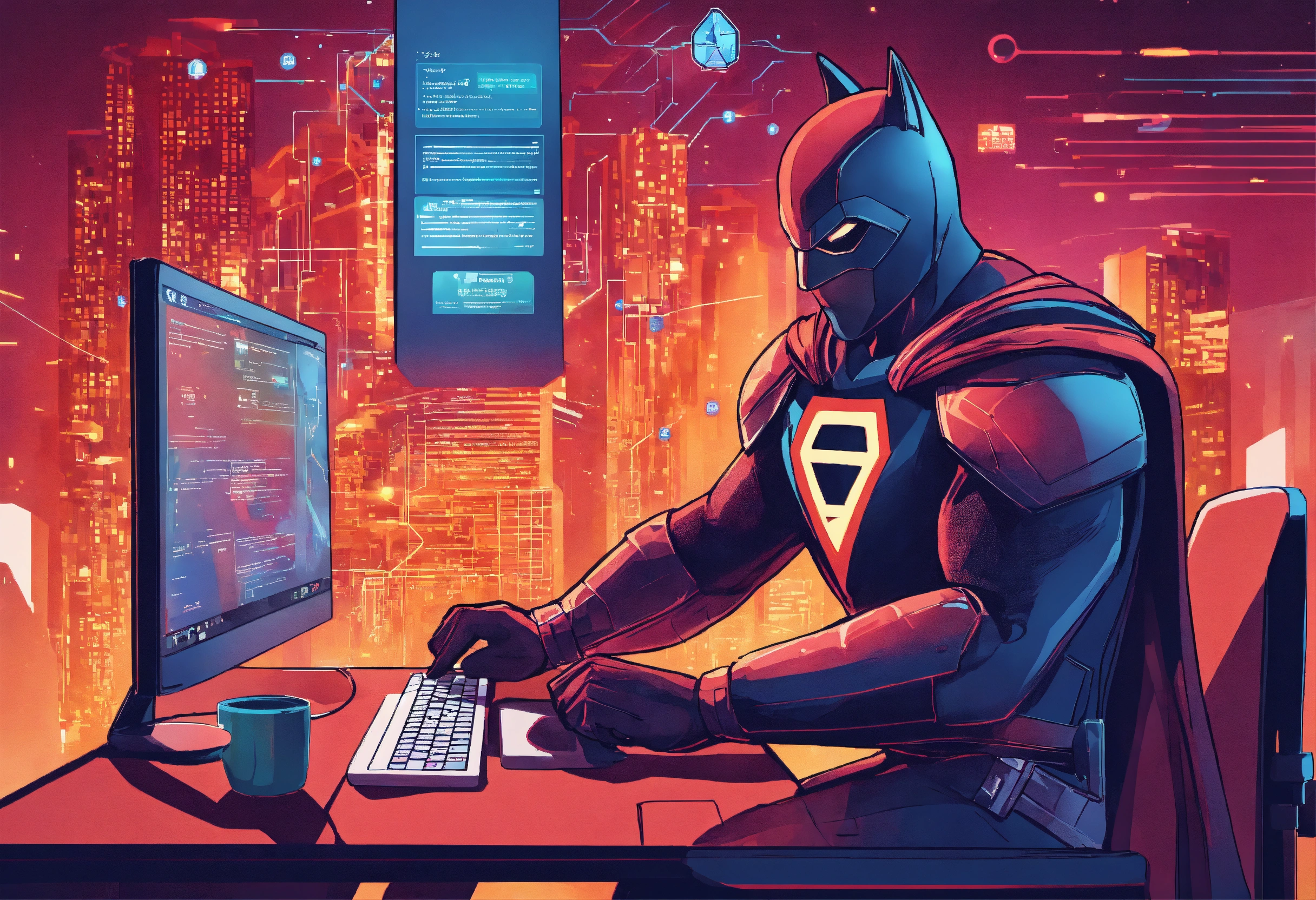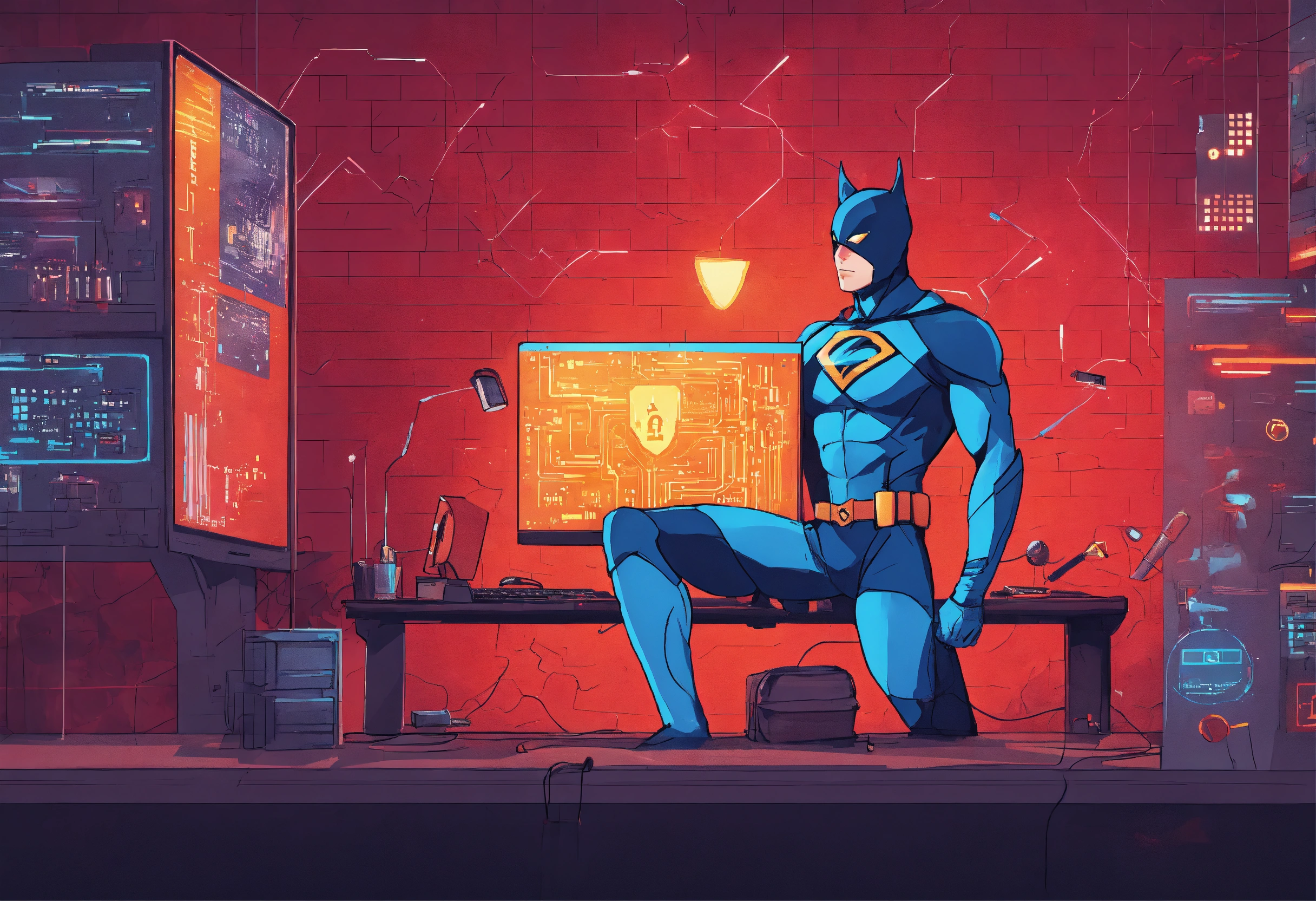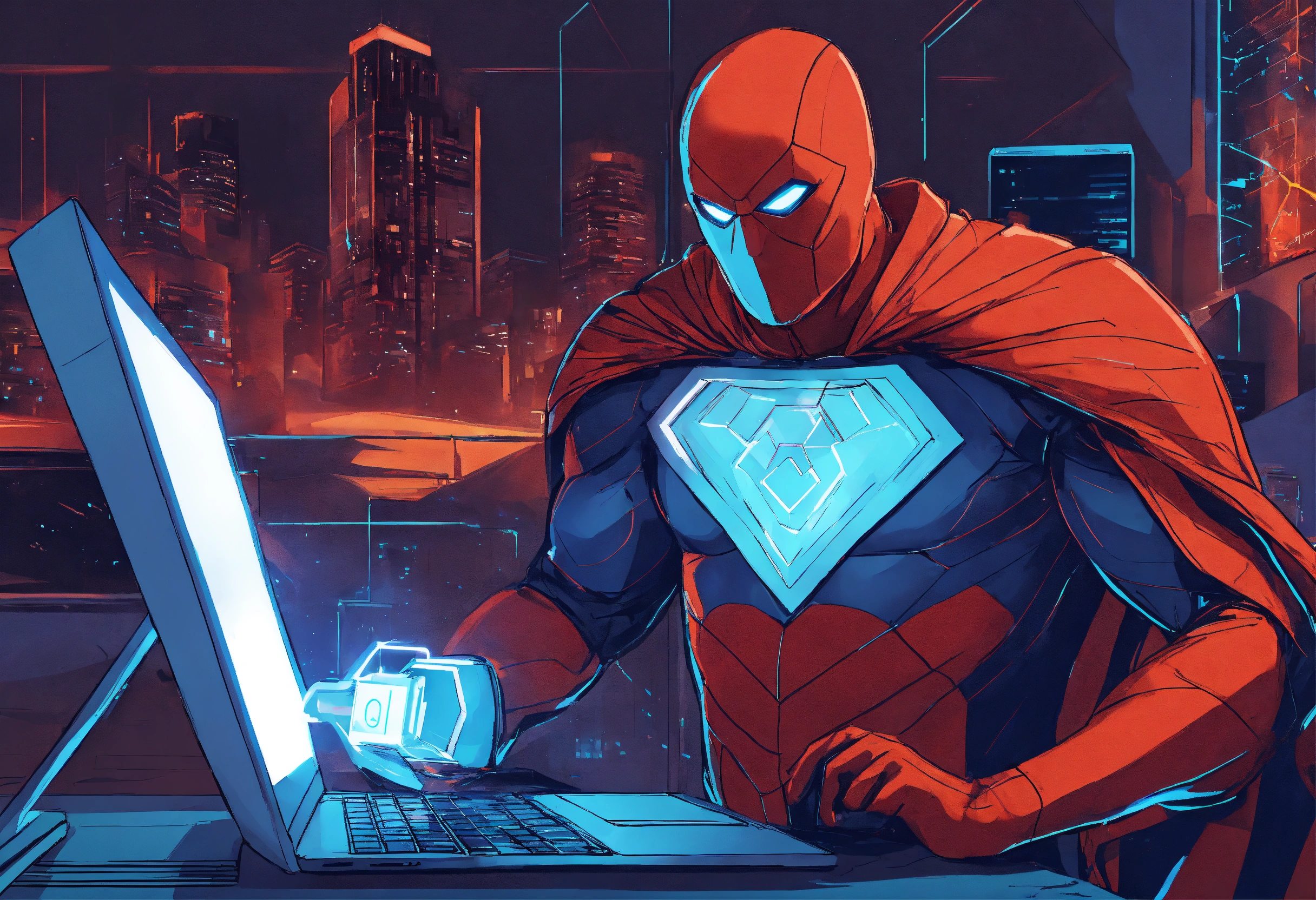 Create an illustration of a superhero figure in a cybersecurity-themed costume, fighting a security breach online