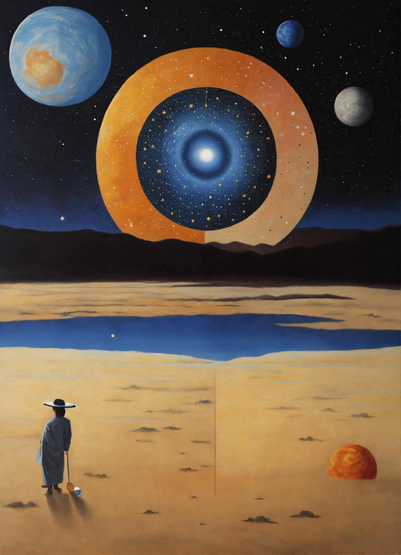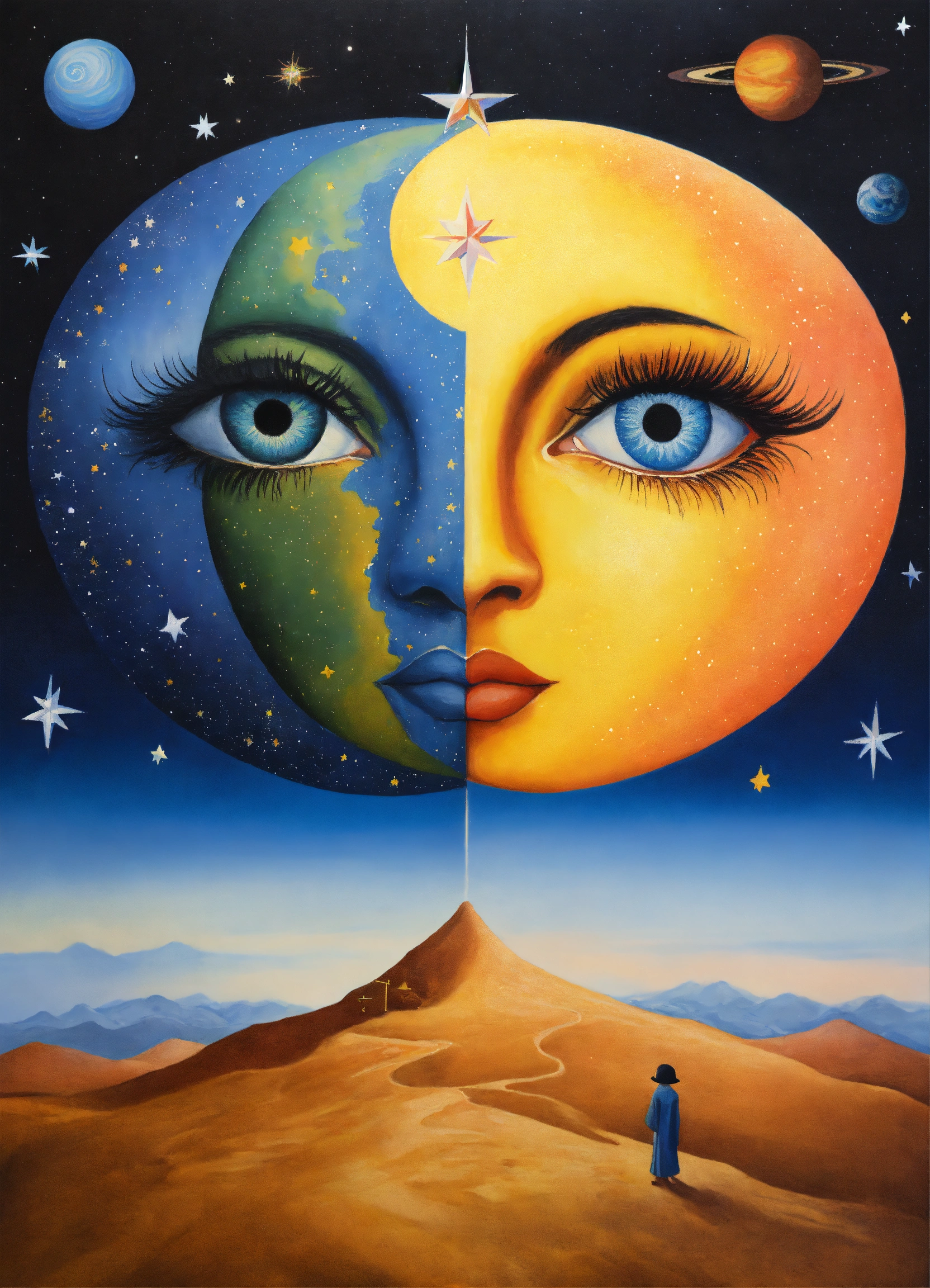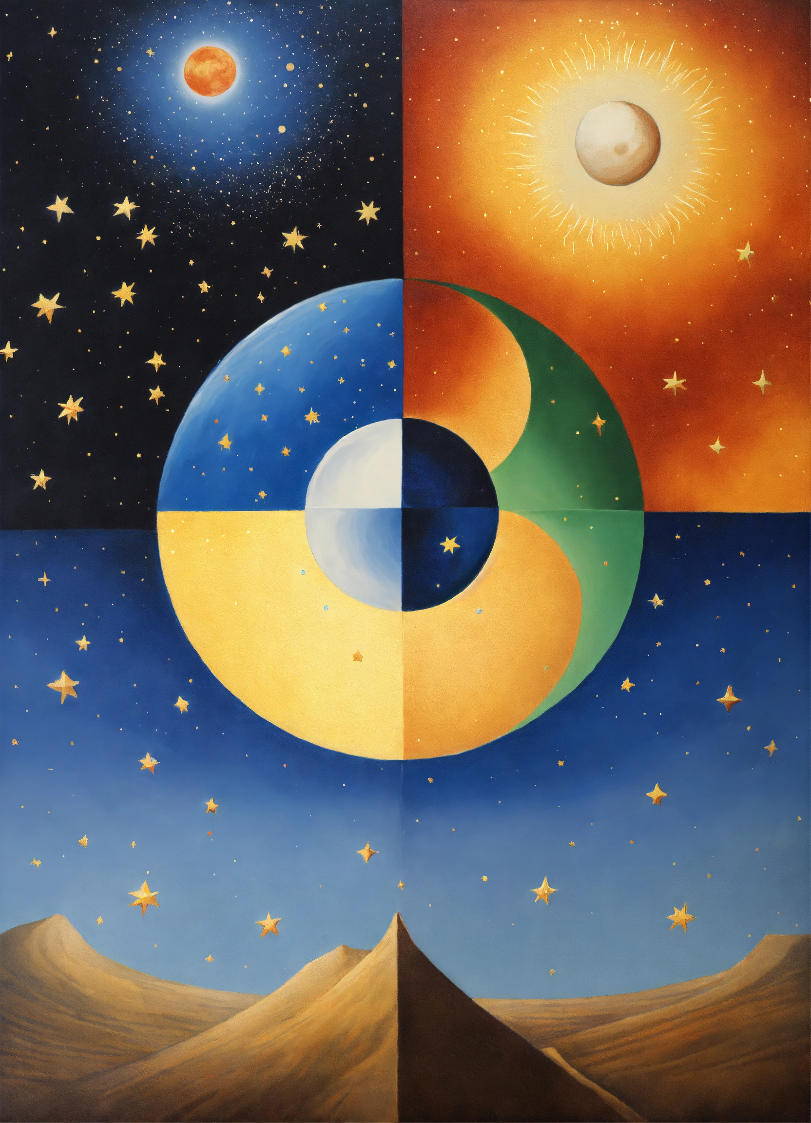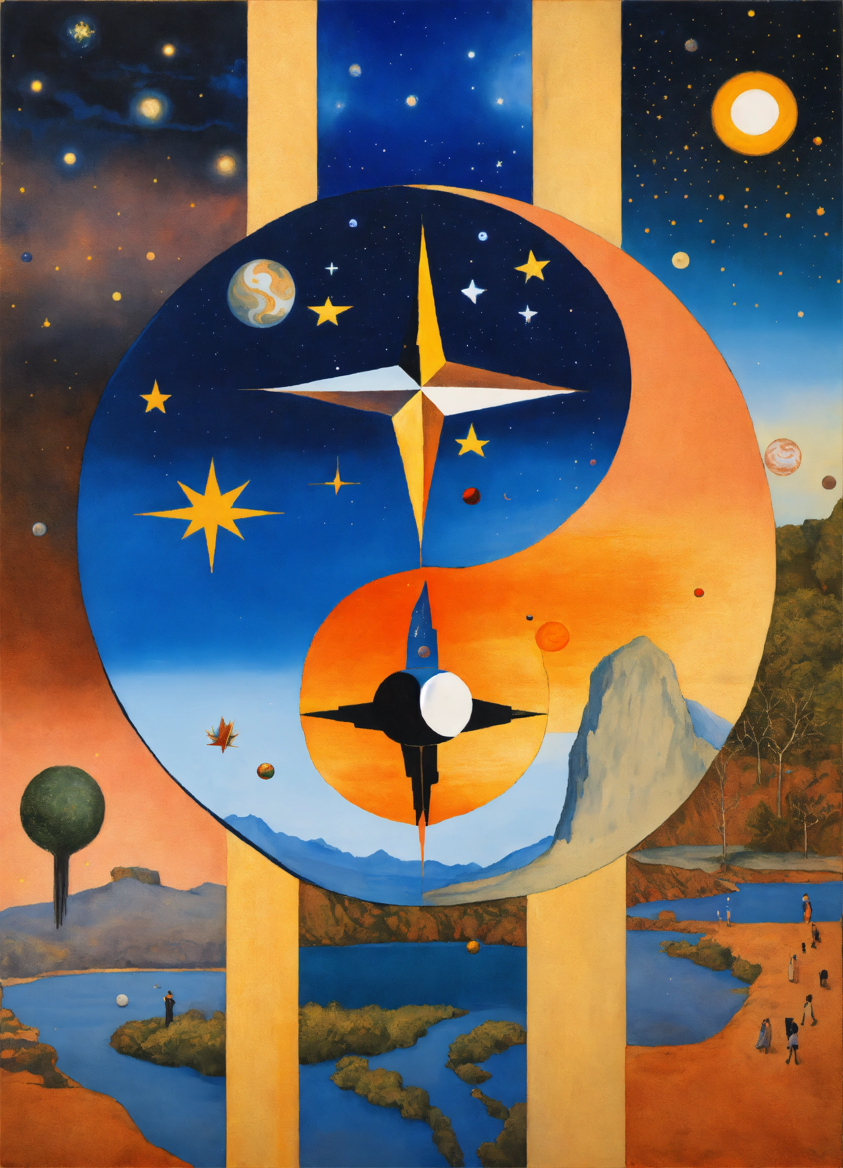 Yin and yang, night and day, 4 corners of the universe painted rene margritte, stars and planets indigenous people, symmetrical, star child