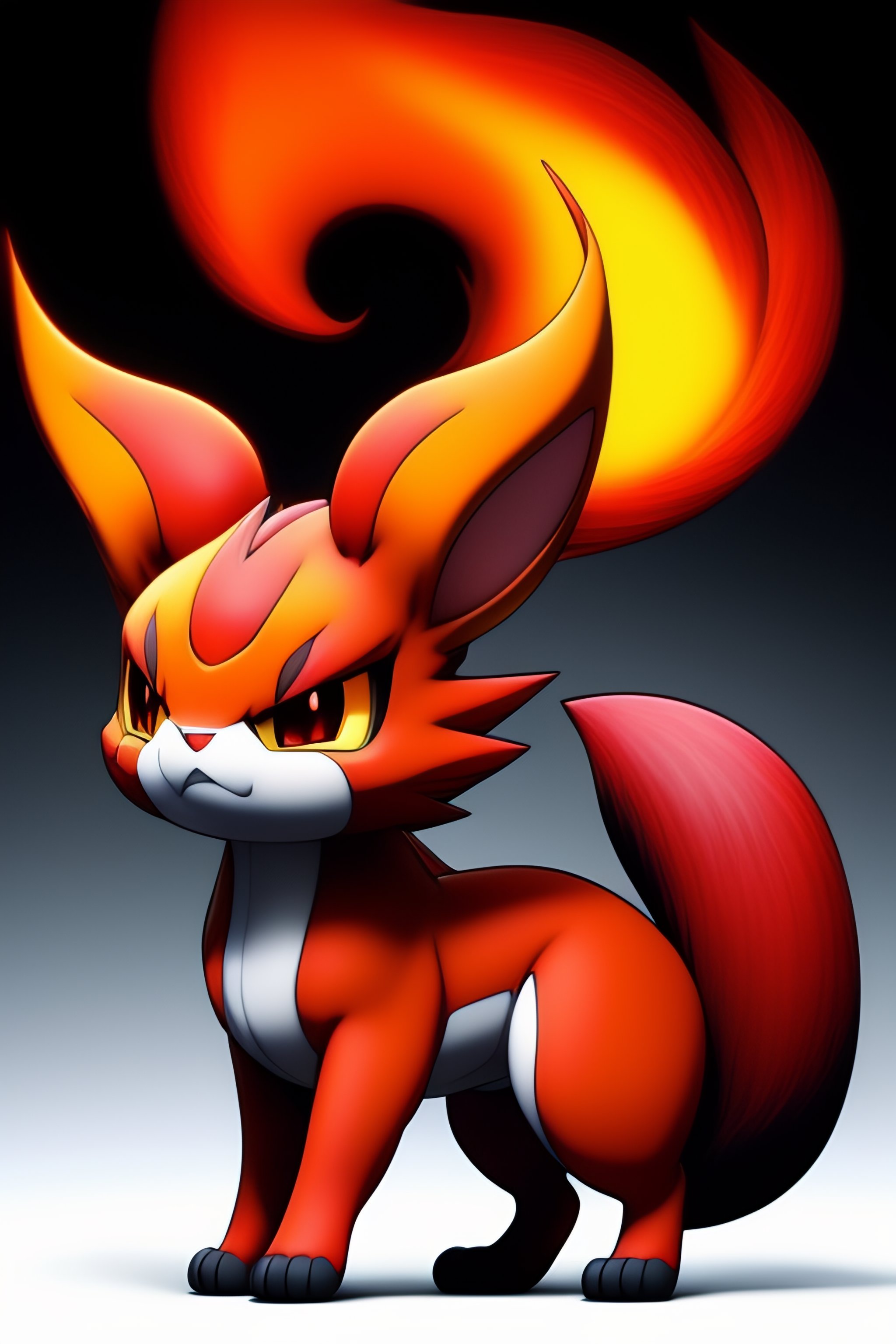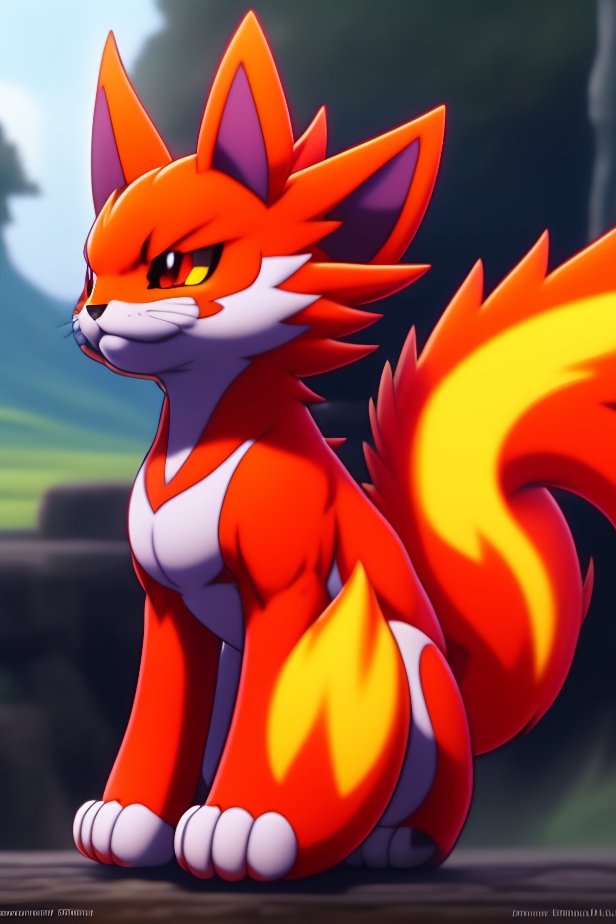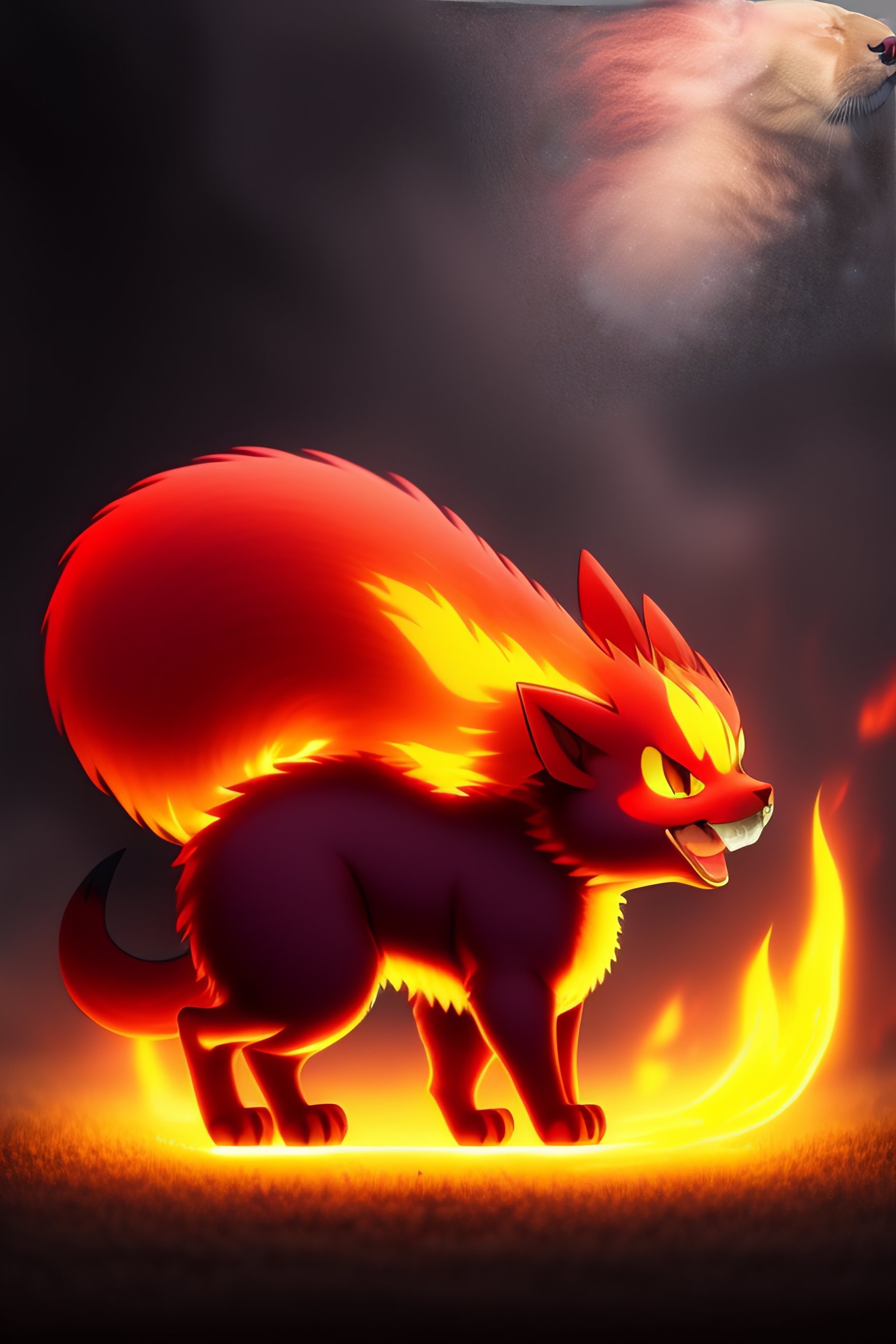 A scary fire type pokémon that resembles a four legged baest with a cloudy tail, in the style of pokémon award winning manga