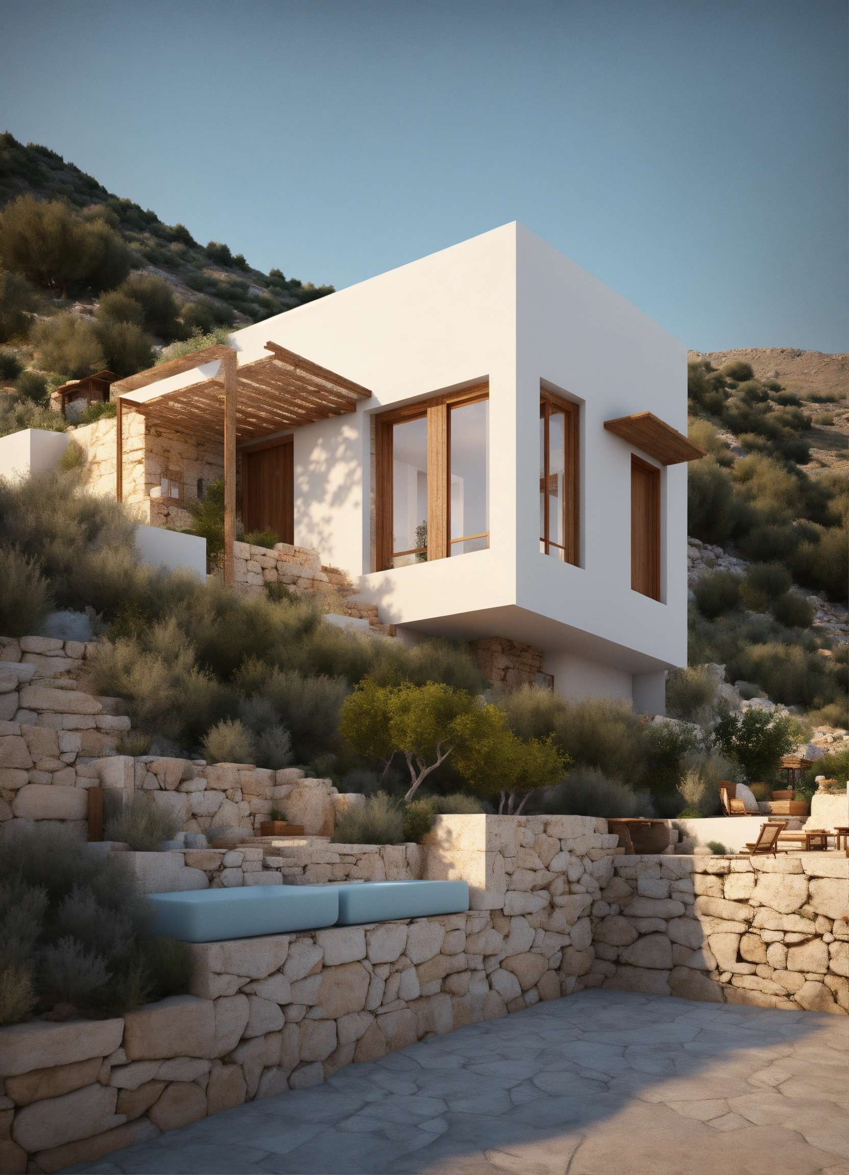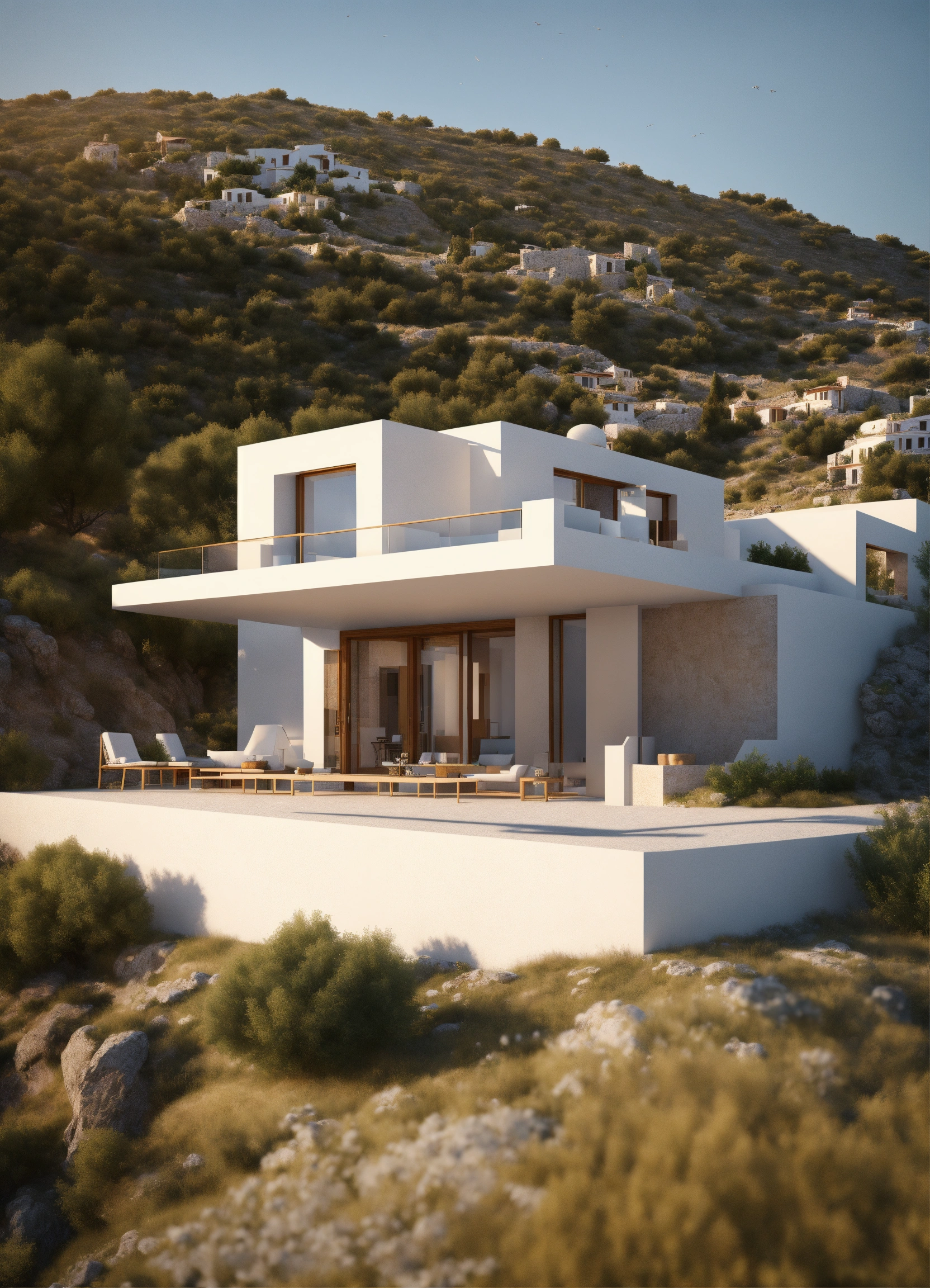 Modern style traditional greek house on a slight hill, concept design, architecture, achile castiglione, high quality, 8k