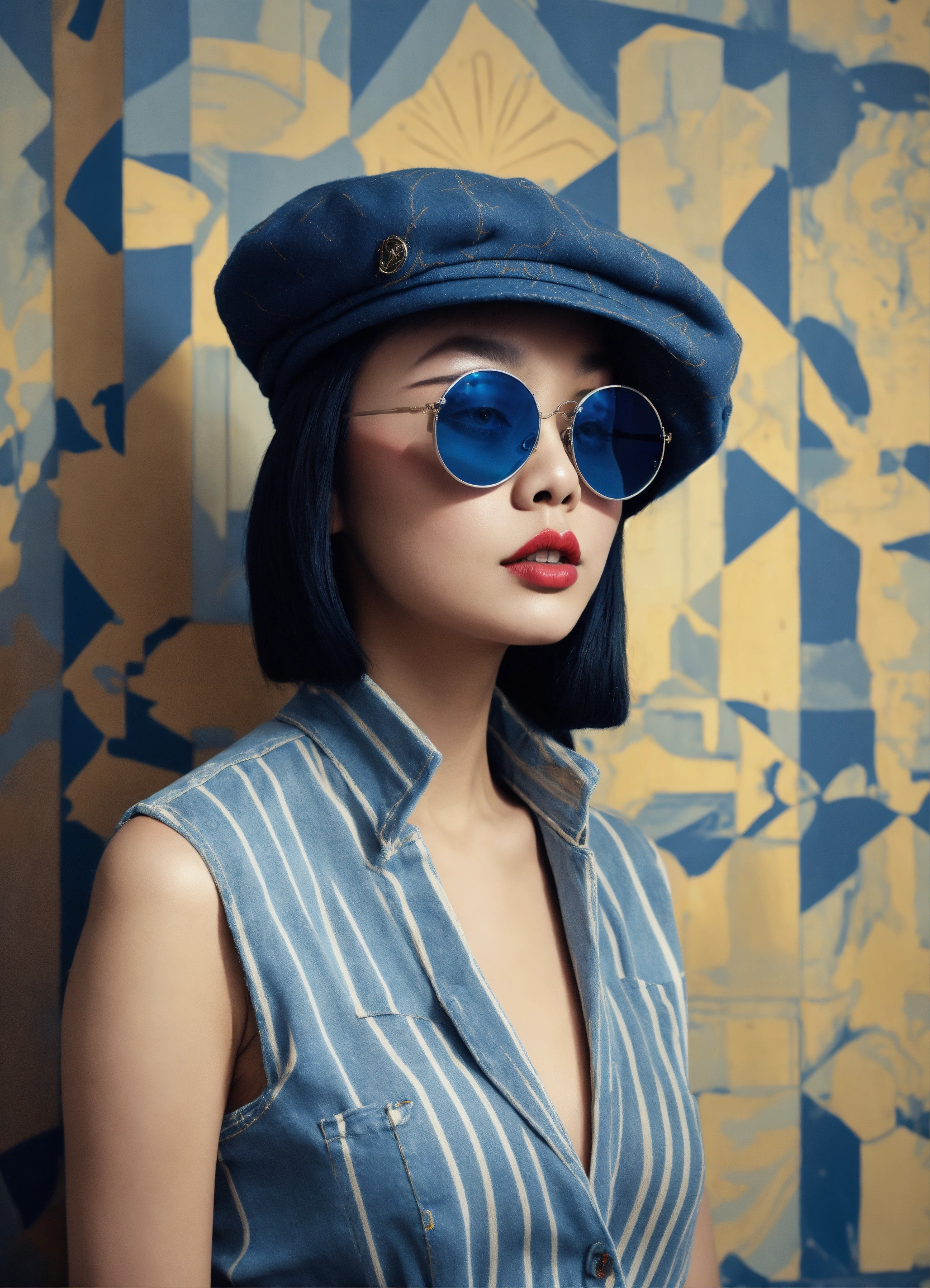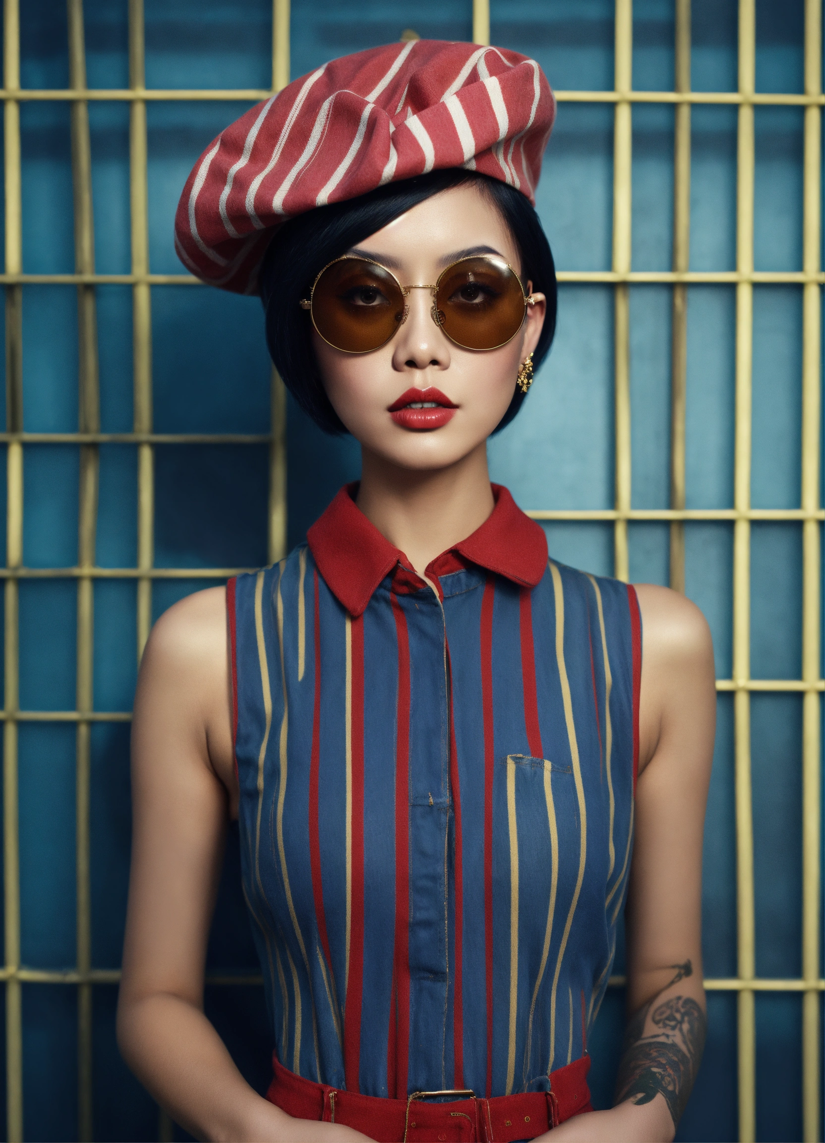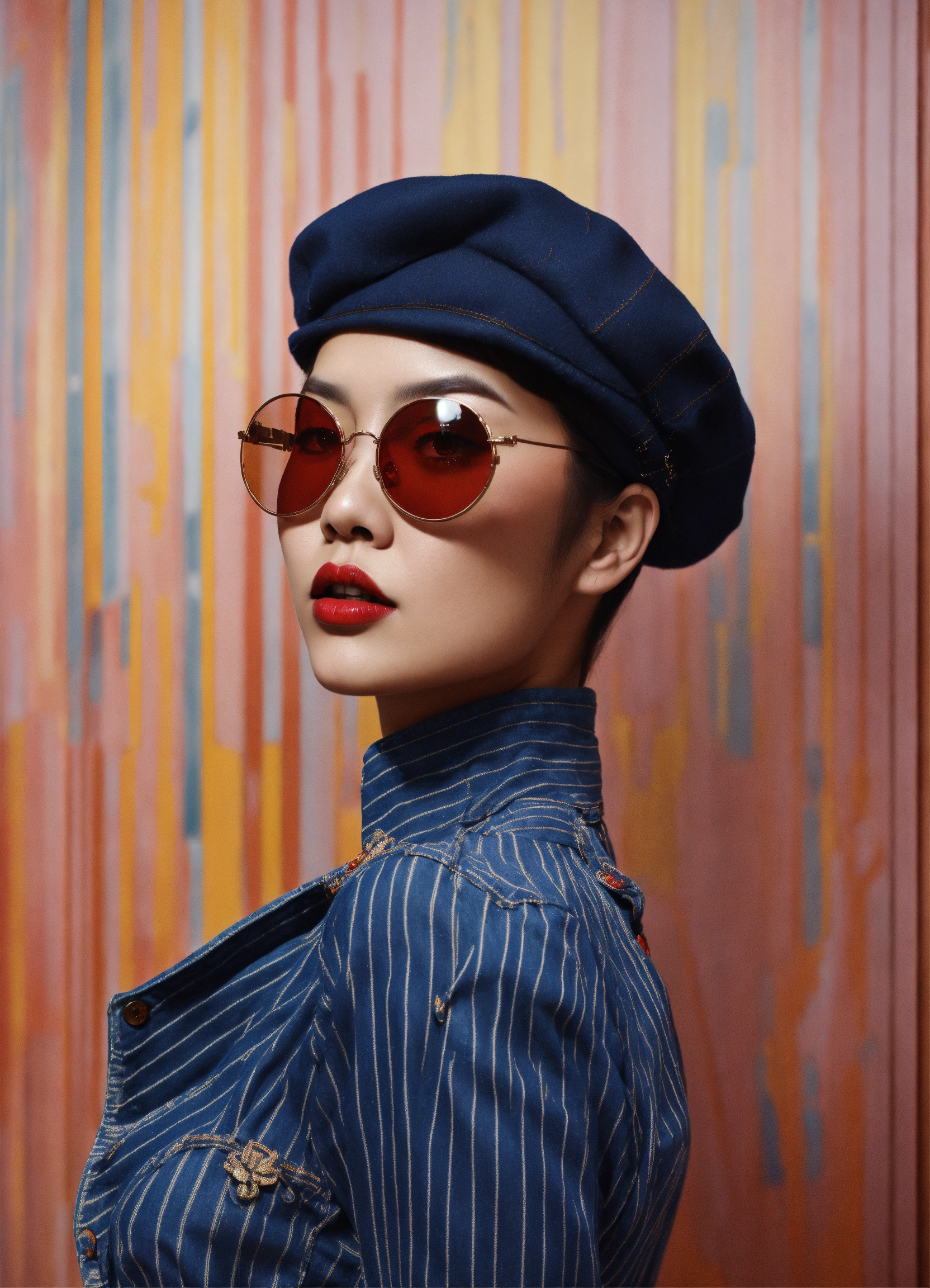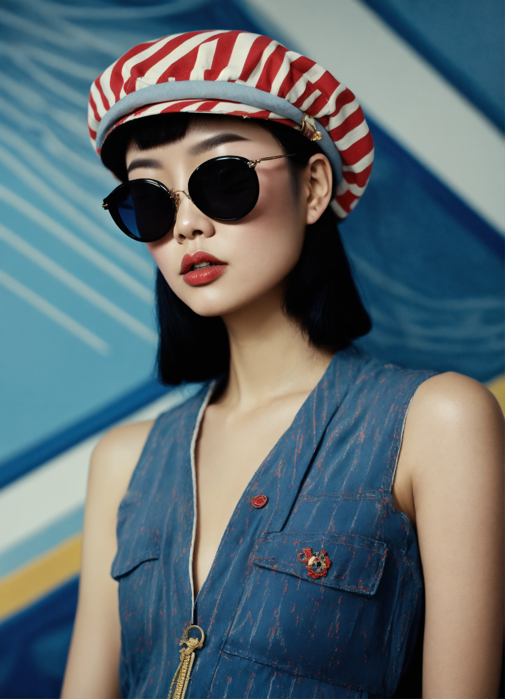 Front profile half body photography, at a party, a punk 80's asian model woman with 50's beret, in minimal round striped pattern denim jumpsuit and large sunglasses, 80 degree view, art by sergio lopez, natalie shau, james jean and salvador dali