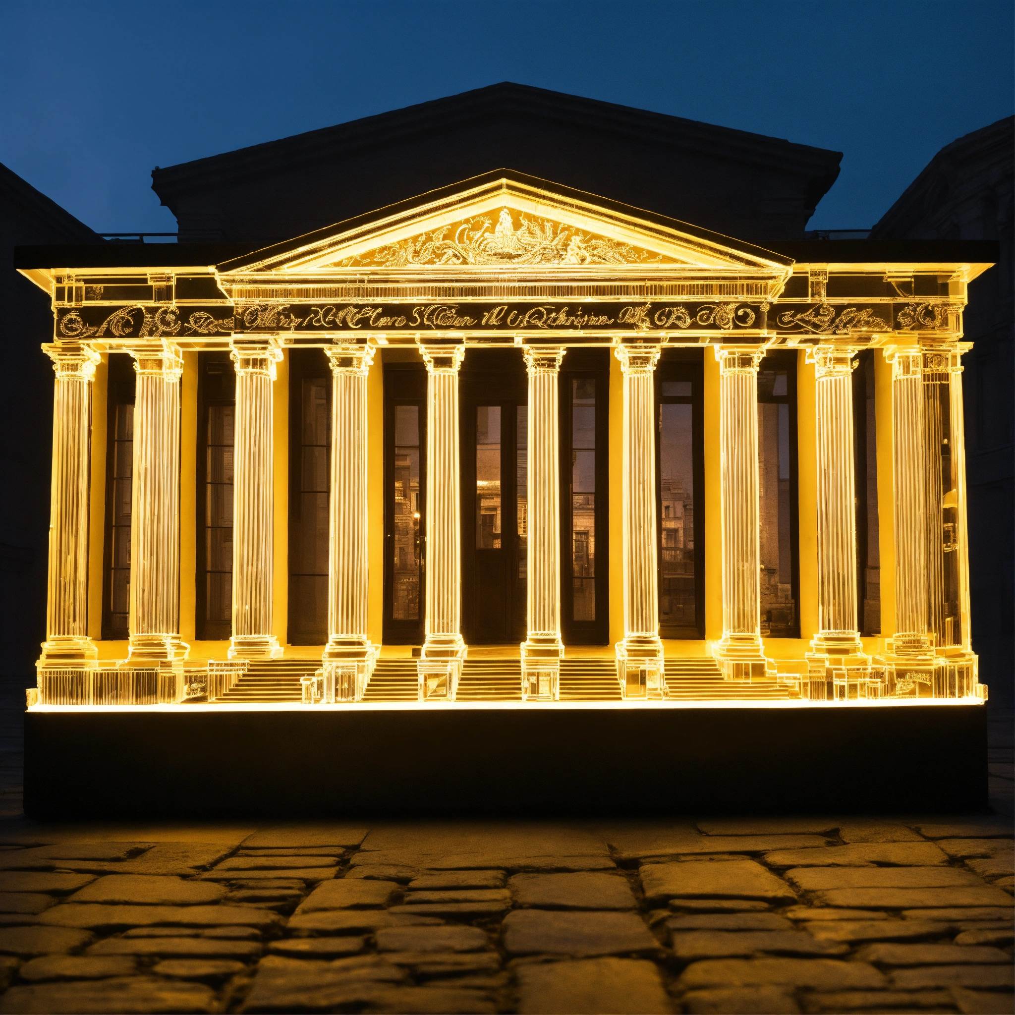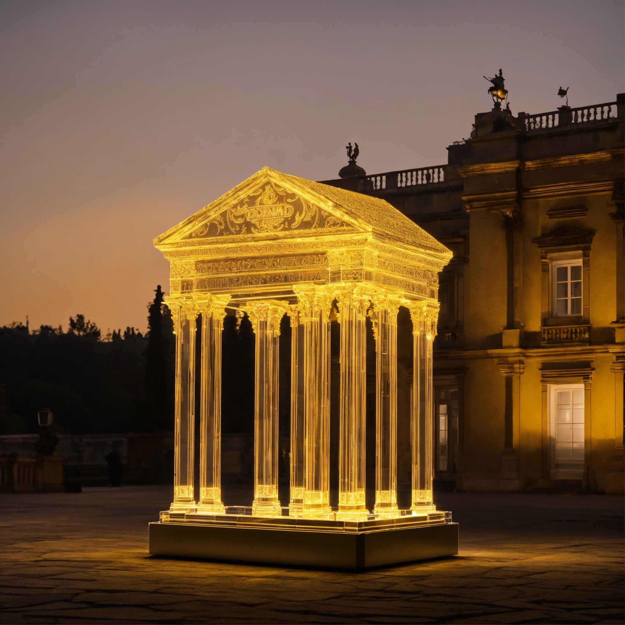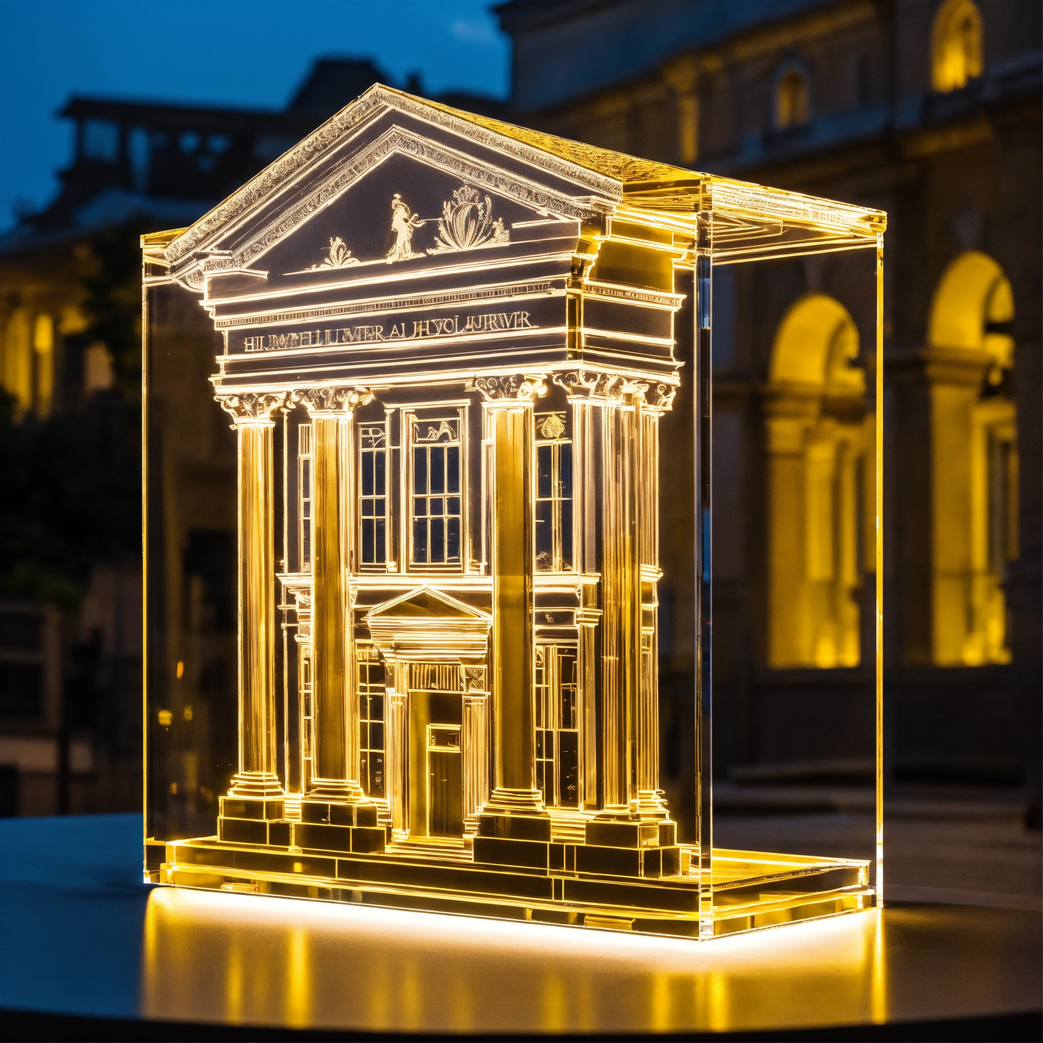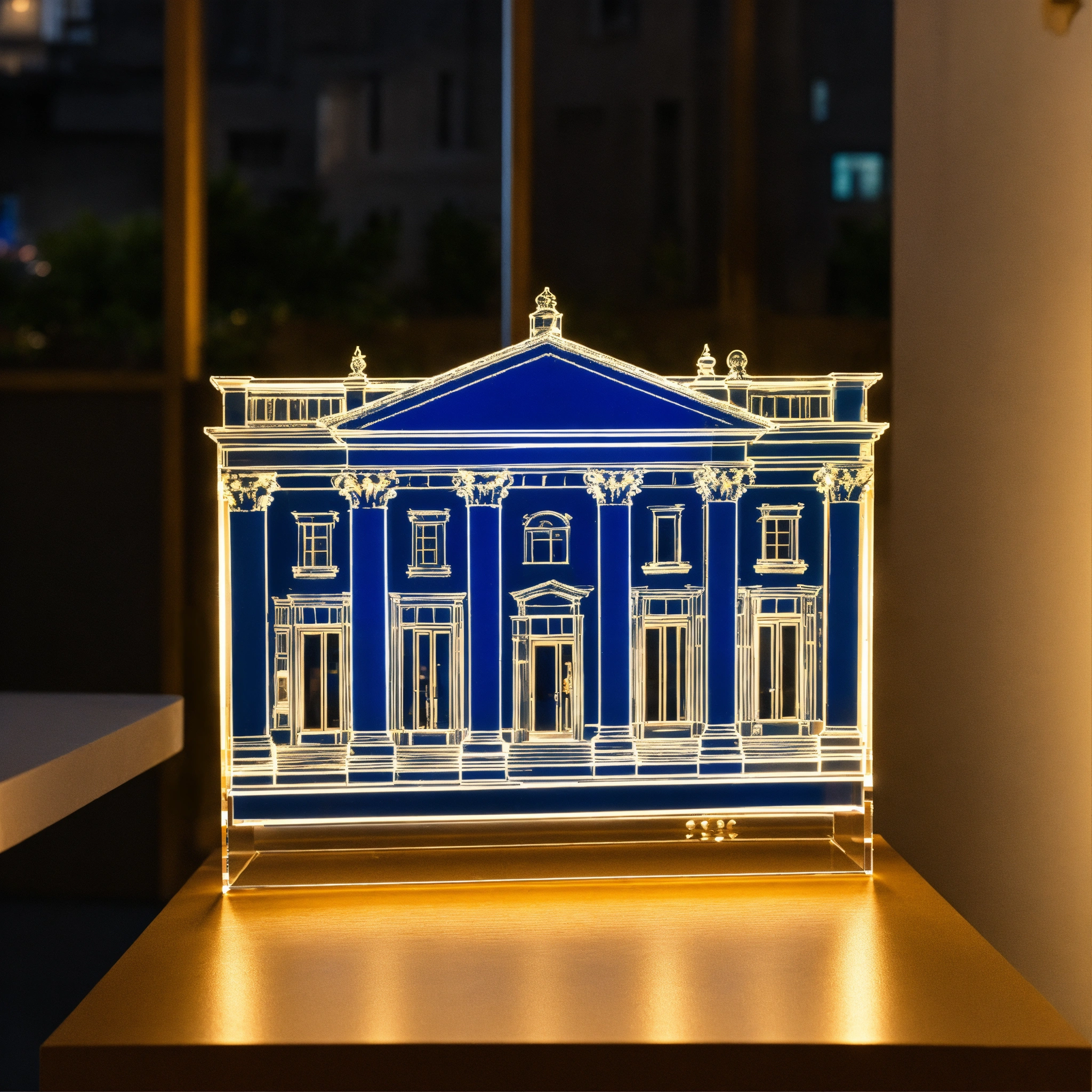 A led lamp of engraved acrylic with the facade of a classical building on it
