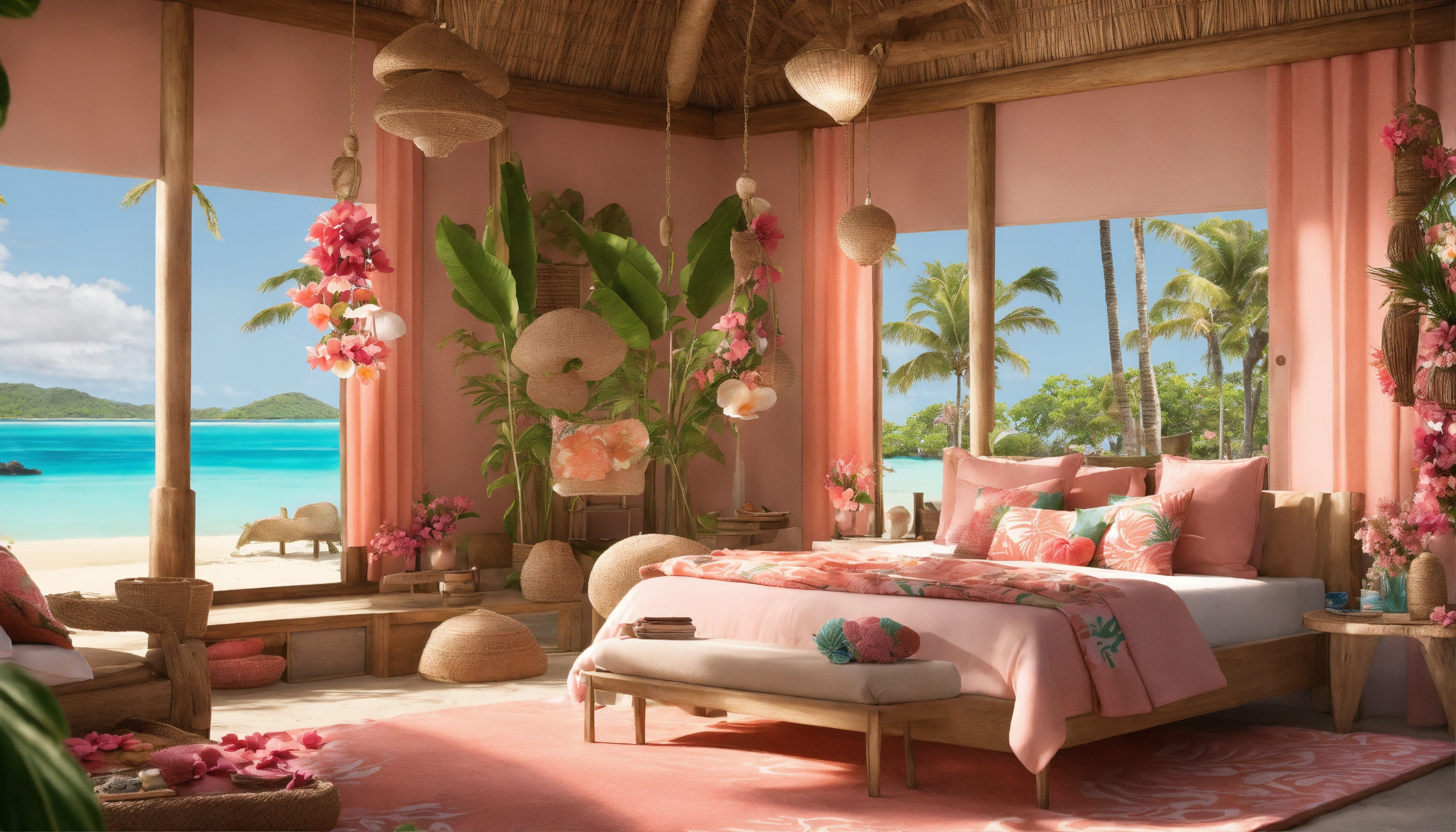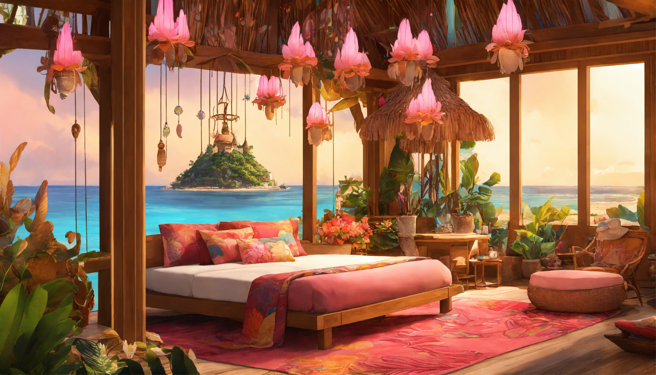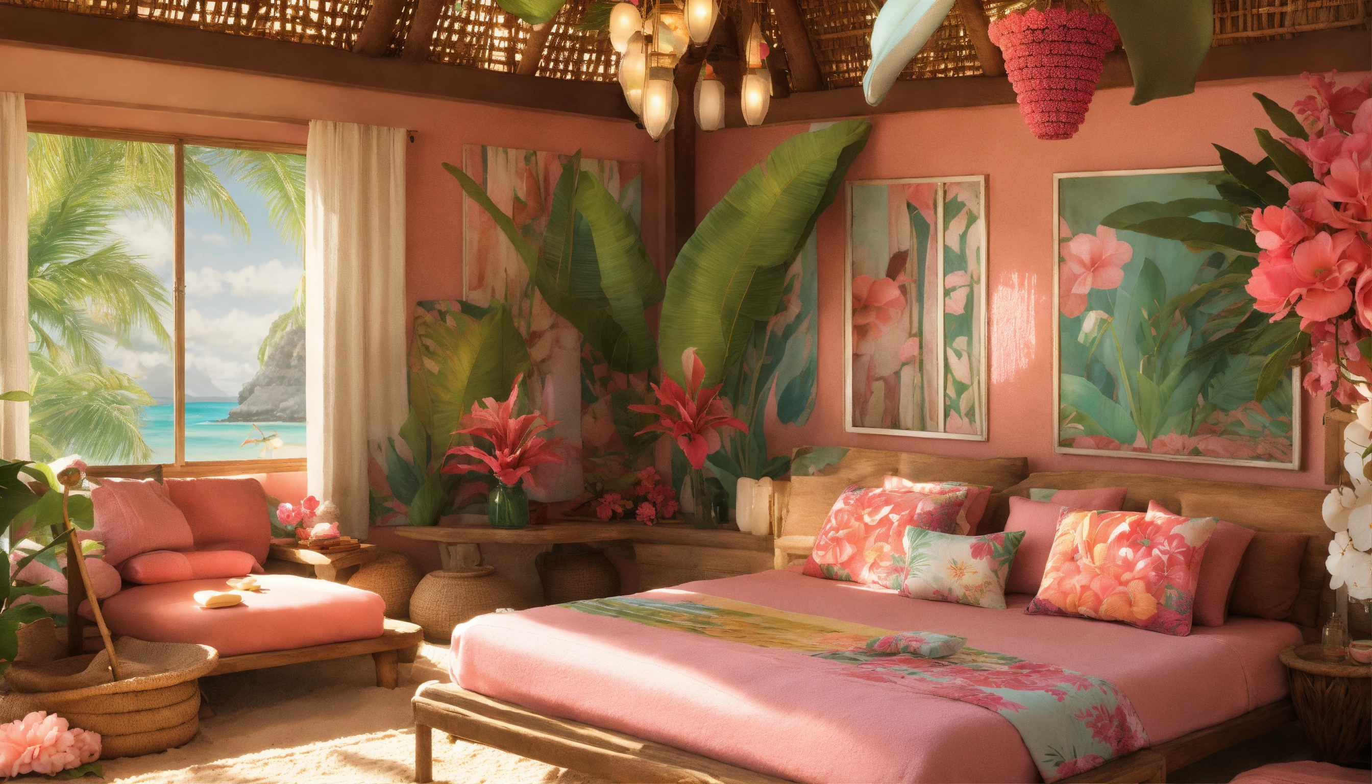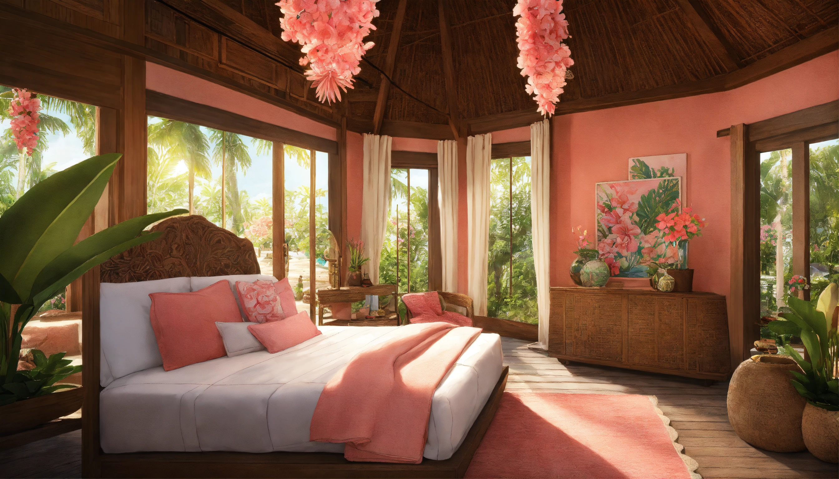 Concept art of tropical village house, polynesian, fantasy, moana house, island, beautiful, tribe, detailed, intricate, topical flowers, white sand, village house on the beach, interior, inside of the house, layout, interior design, bedroom, feminine pink coral color floral blankets, tropical flowers in a vase girly tropical, womans feminine bedroom, salmon pink and coral pink, pink chandelier made from seashells