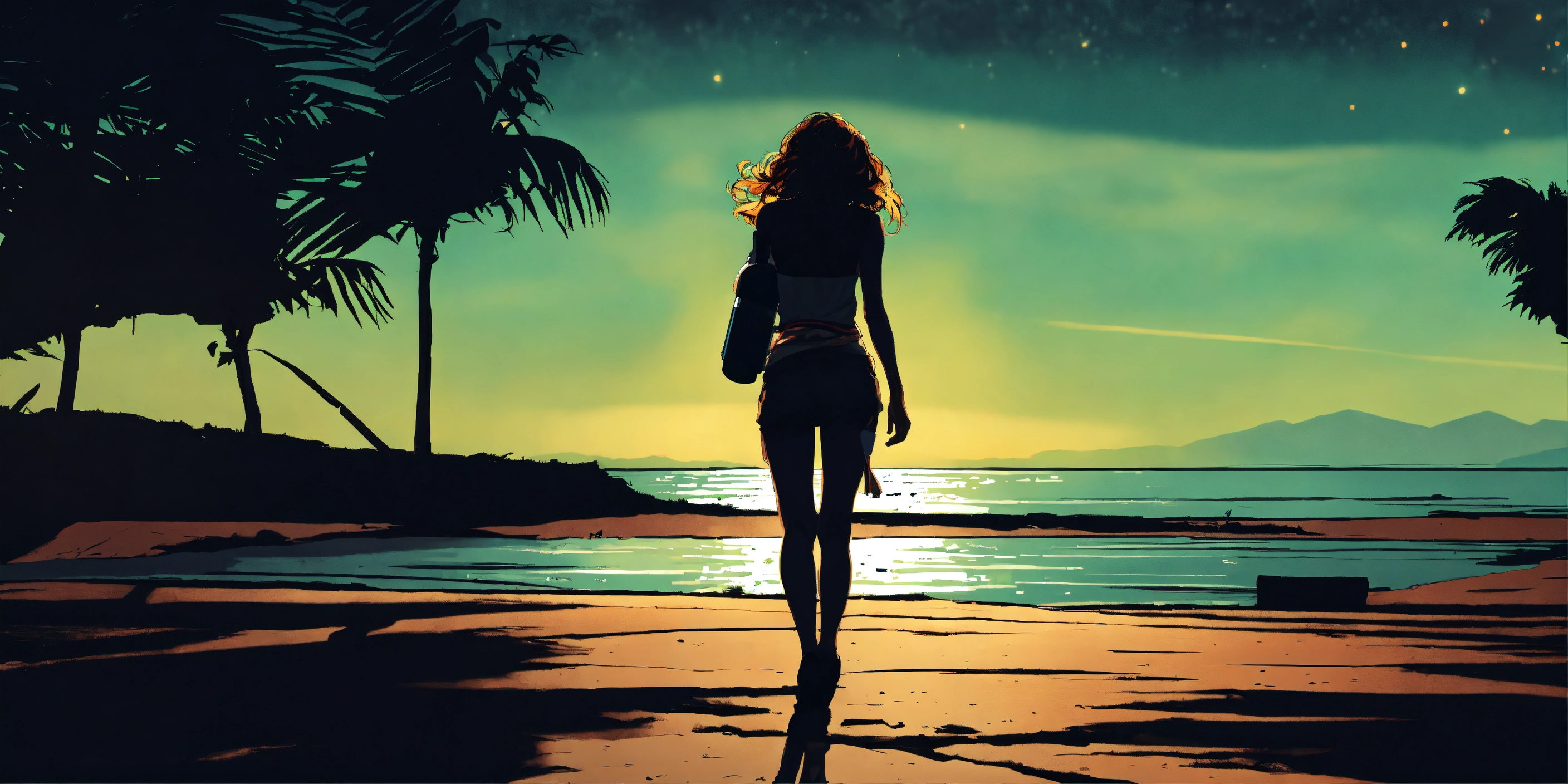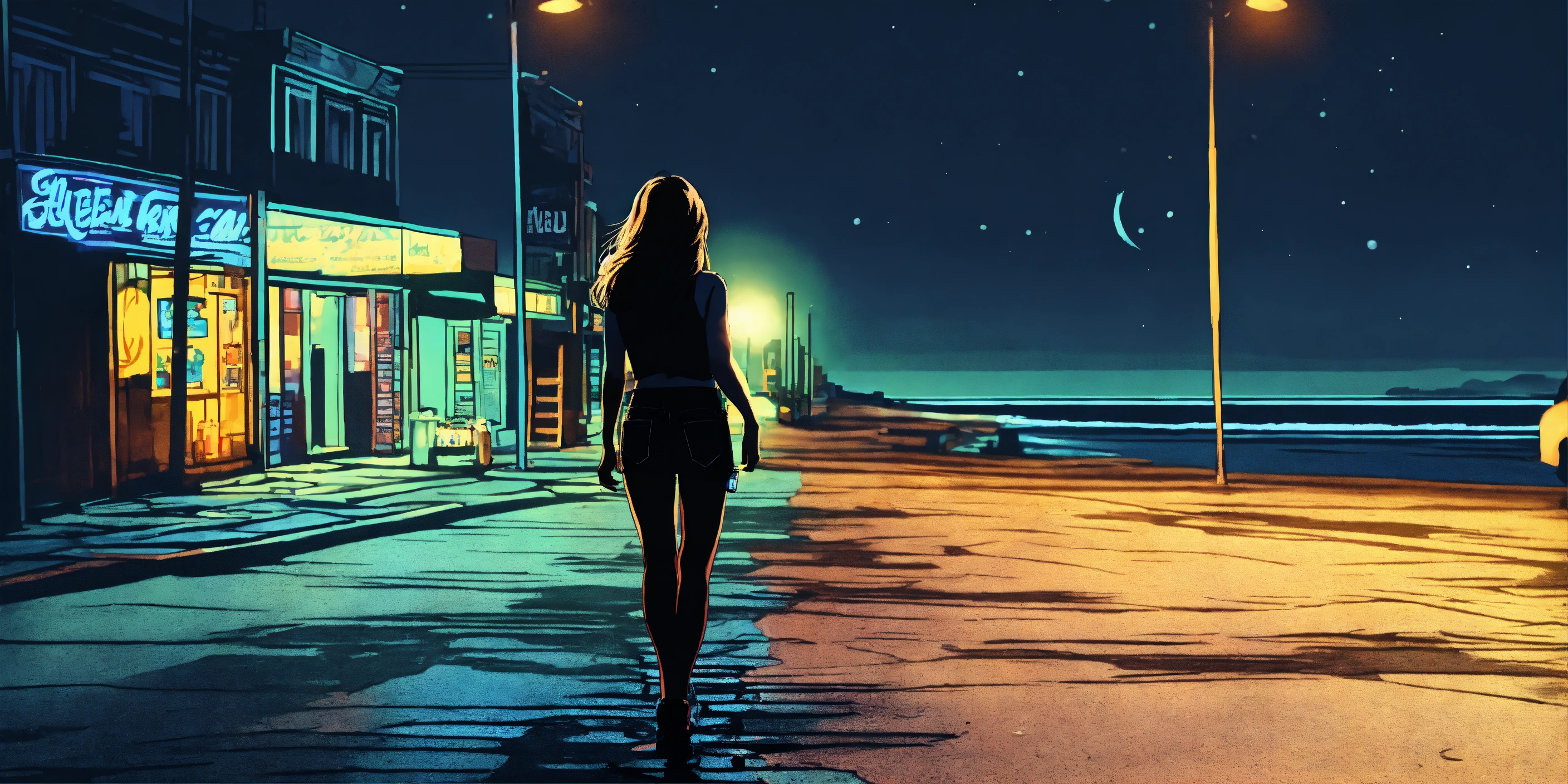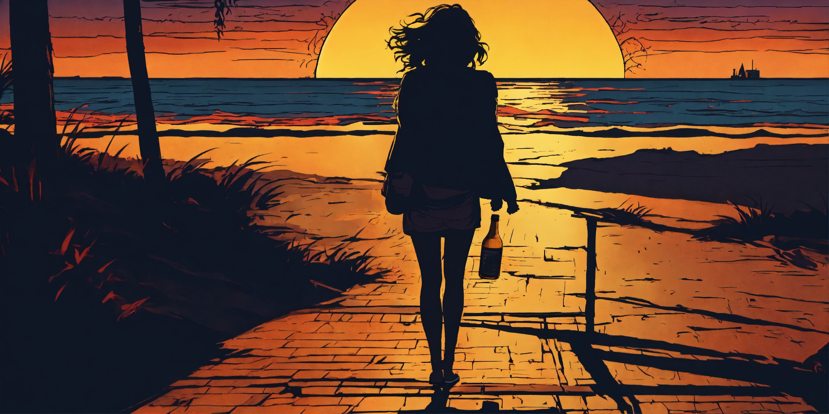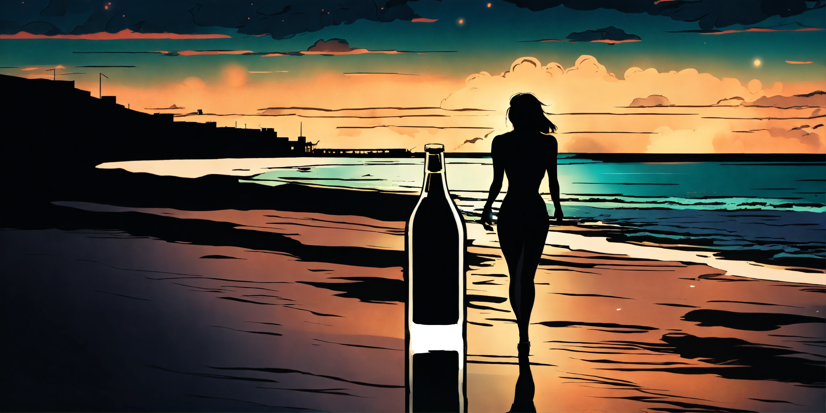 Silhouette of the body of a drunk woman walking backwards on the street with a bottle of beer in her hand, with a distorted and blurred background of a beach in the dark night in 1990s comics style in 8k