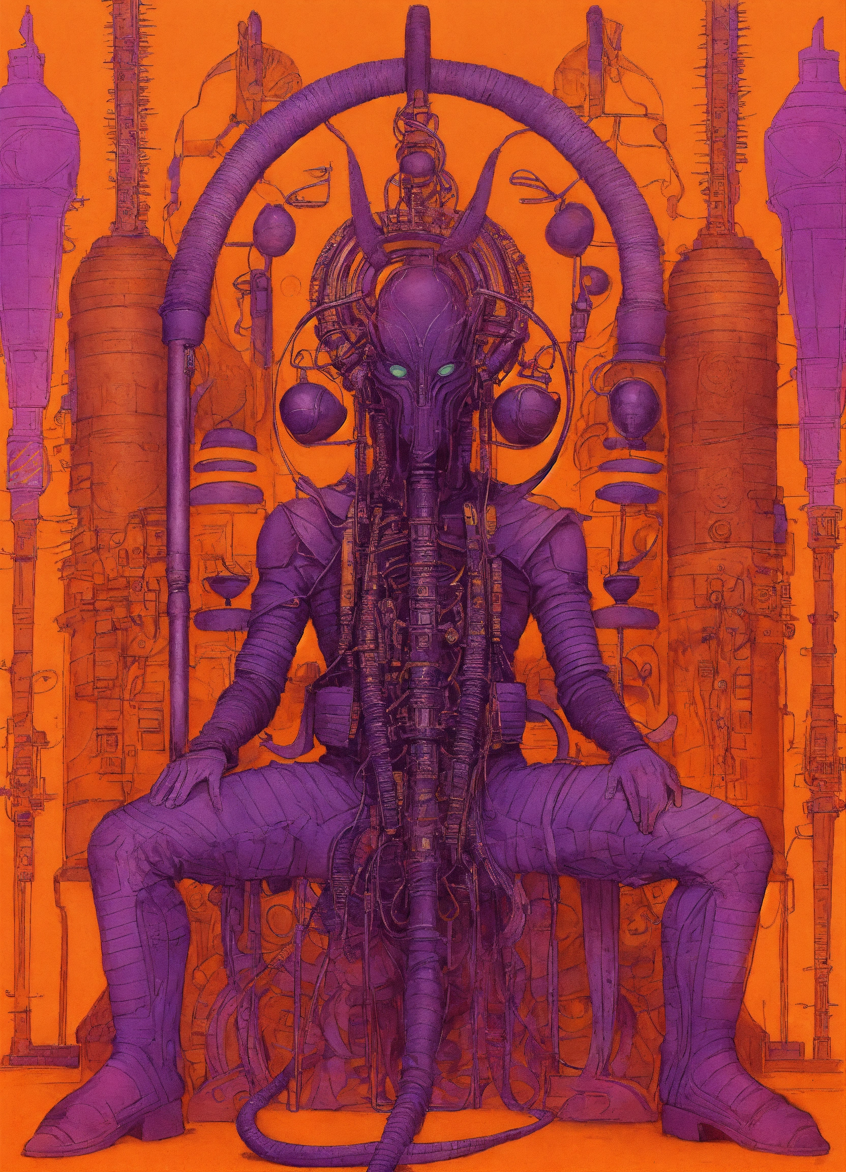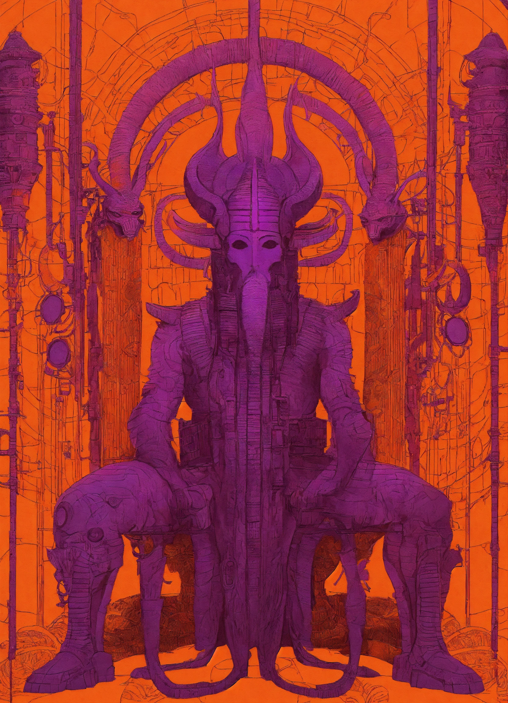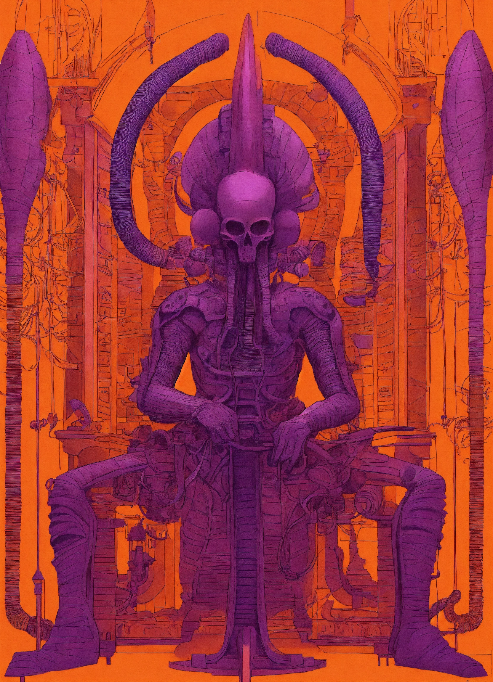 Background jeroglífico egipcio, dibuja una representación simbólica de la sombra psíquica de los hombres en una ilustración frontal y centrada, estilo giger, trazo artístico hugo pratt, con morado y naranja pastel.