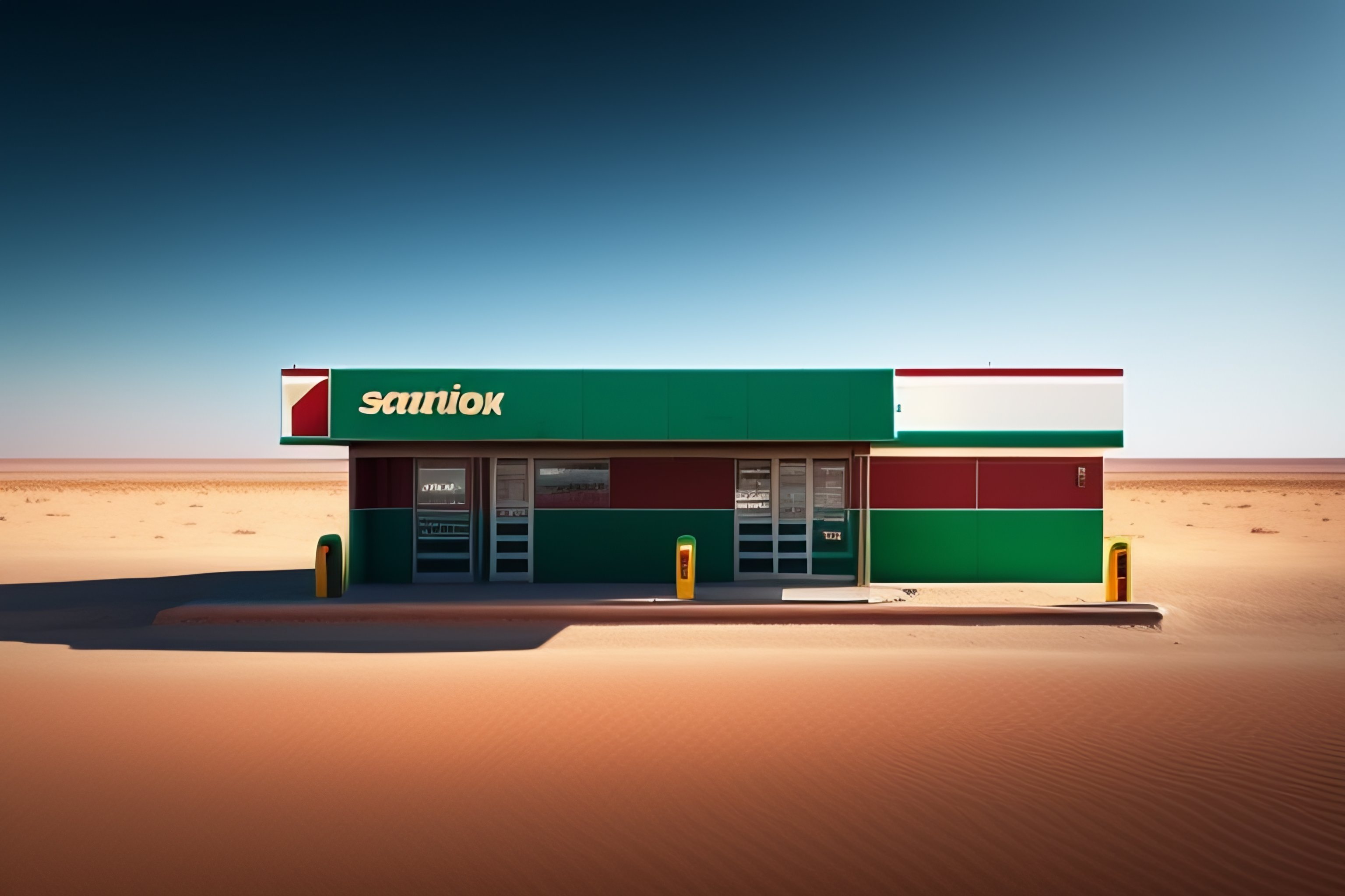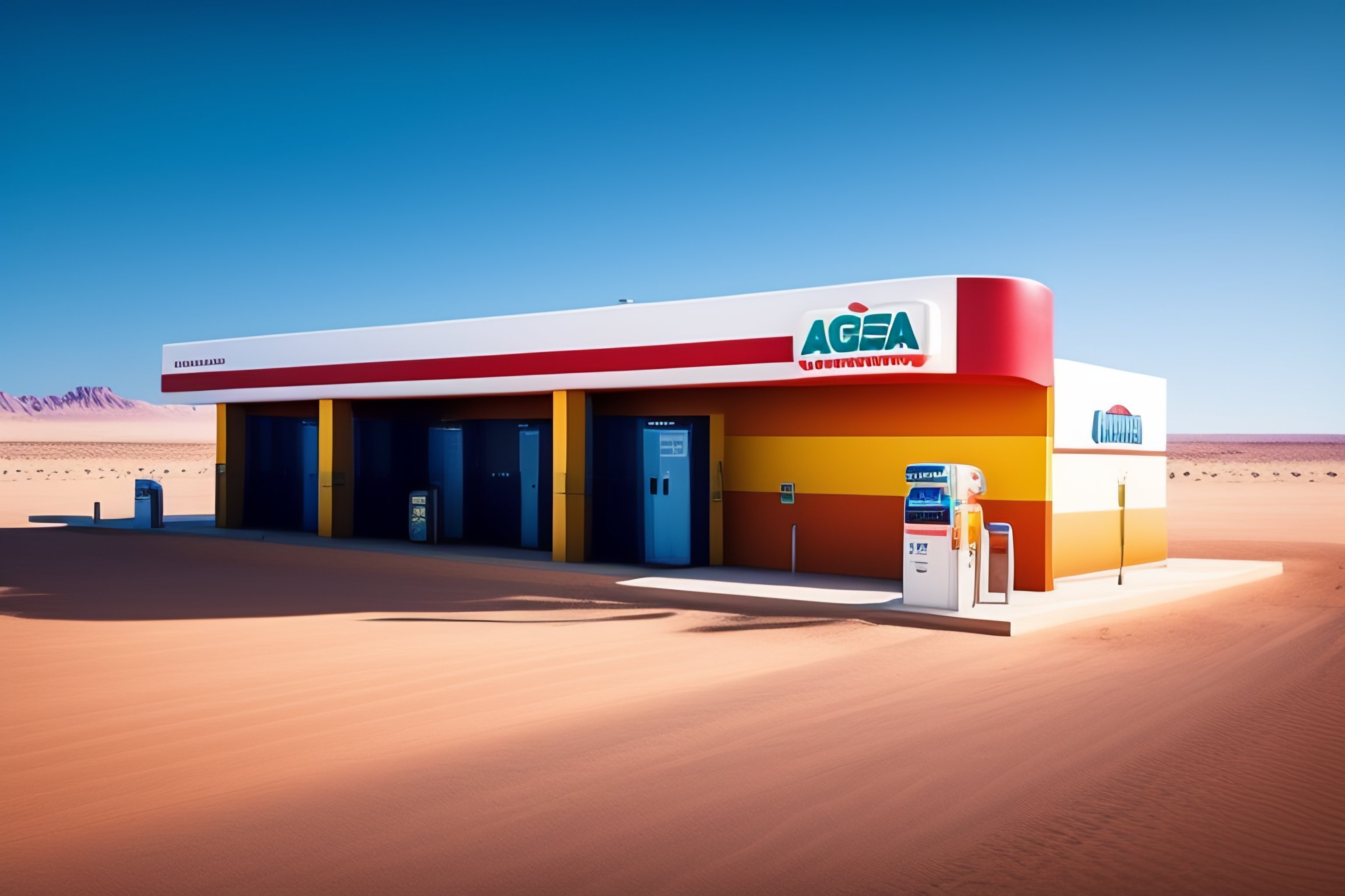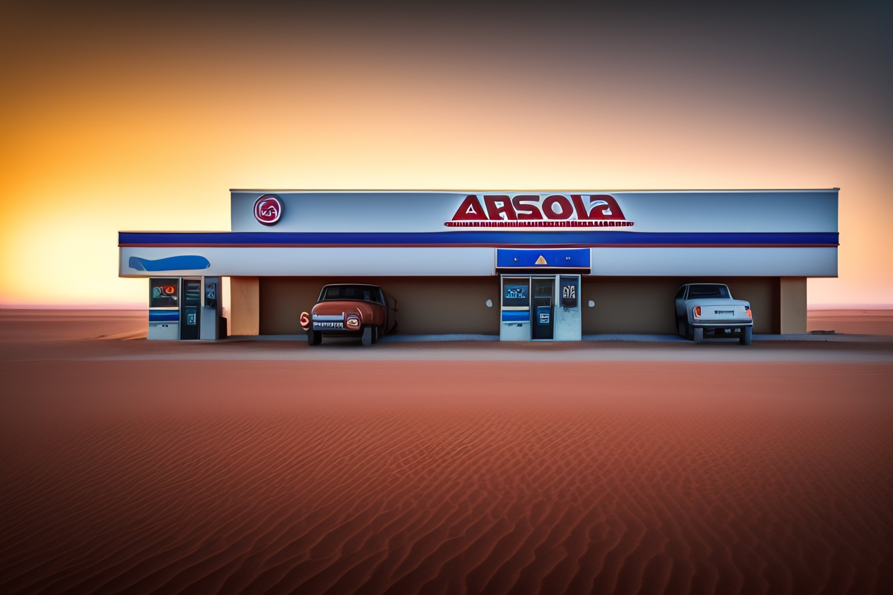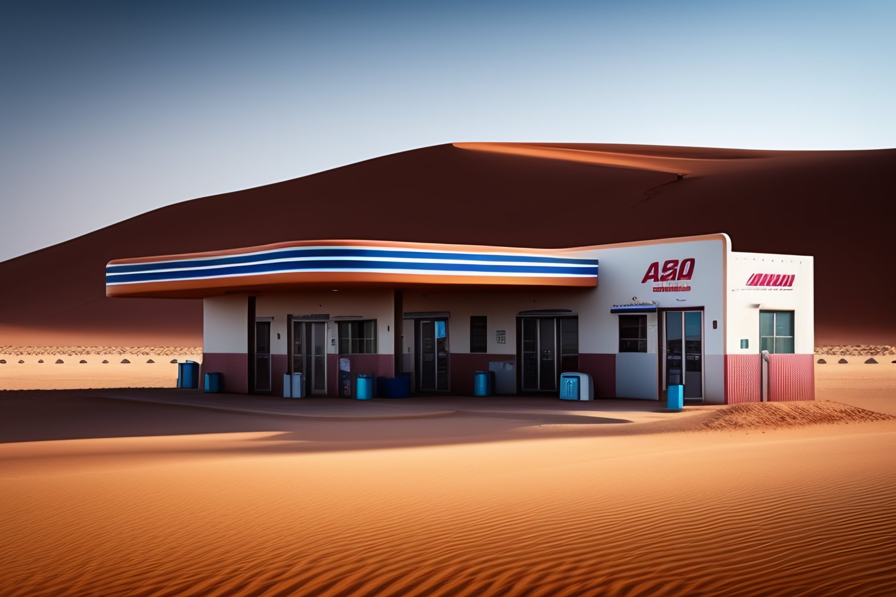 Photo of a gas station in the middle of nowhere (desert) with an ambulance parking on it's left hand side