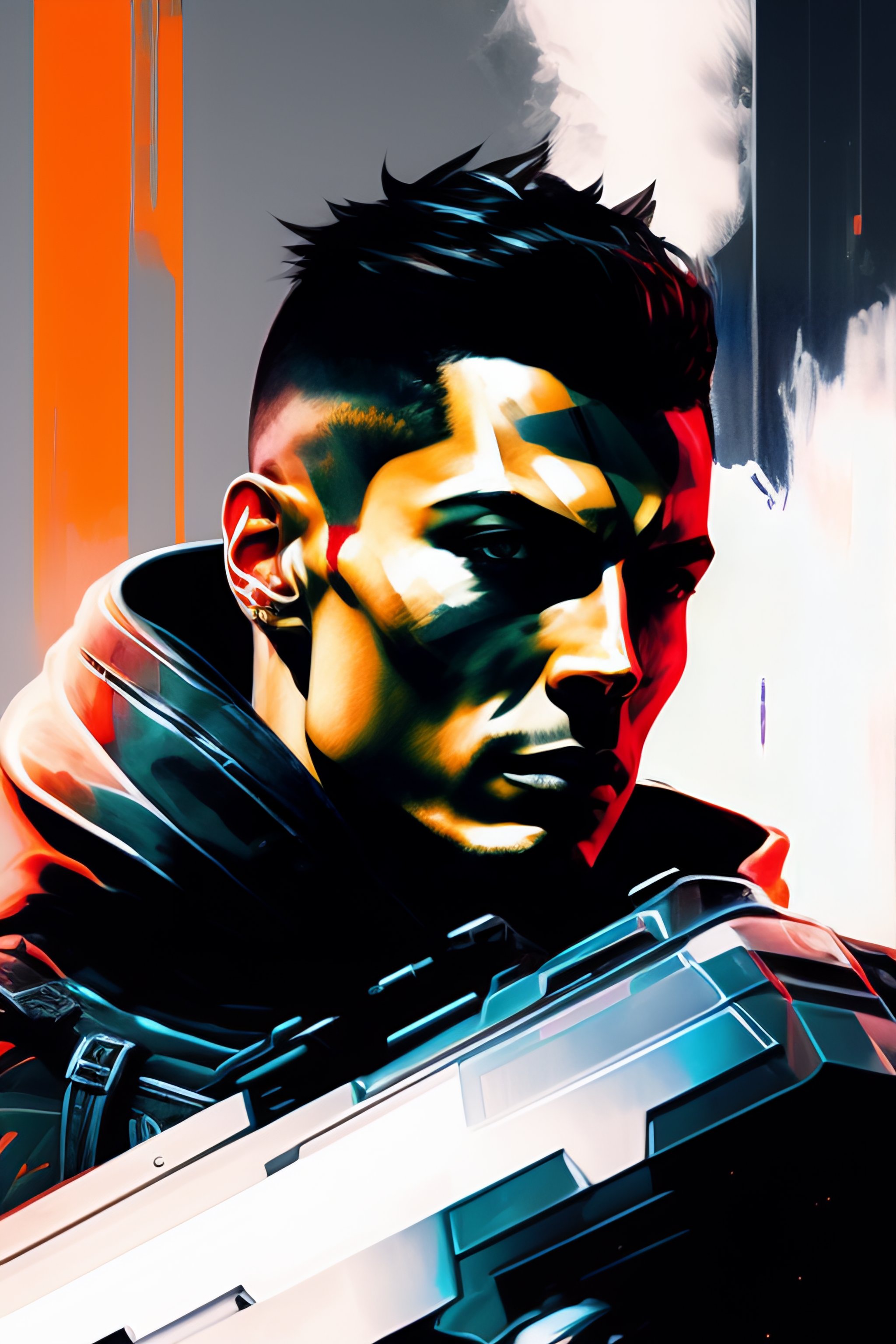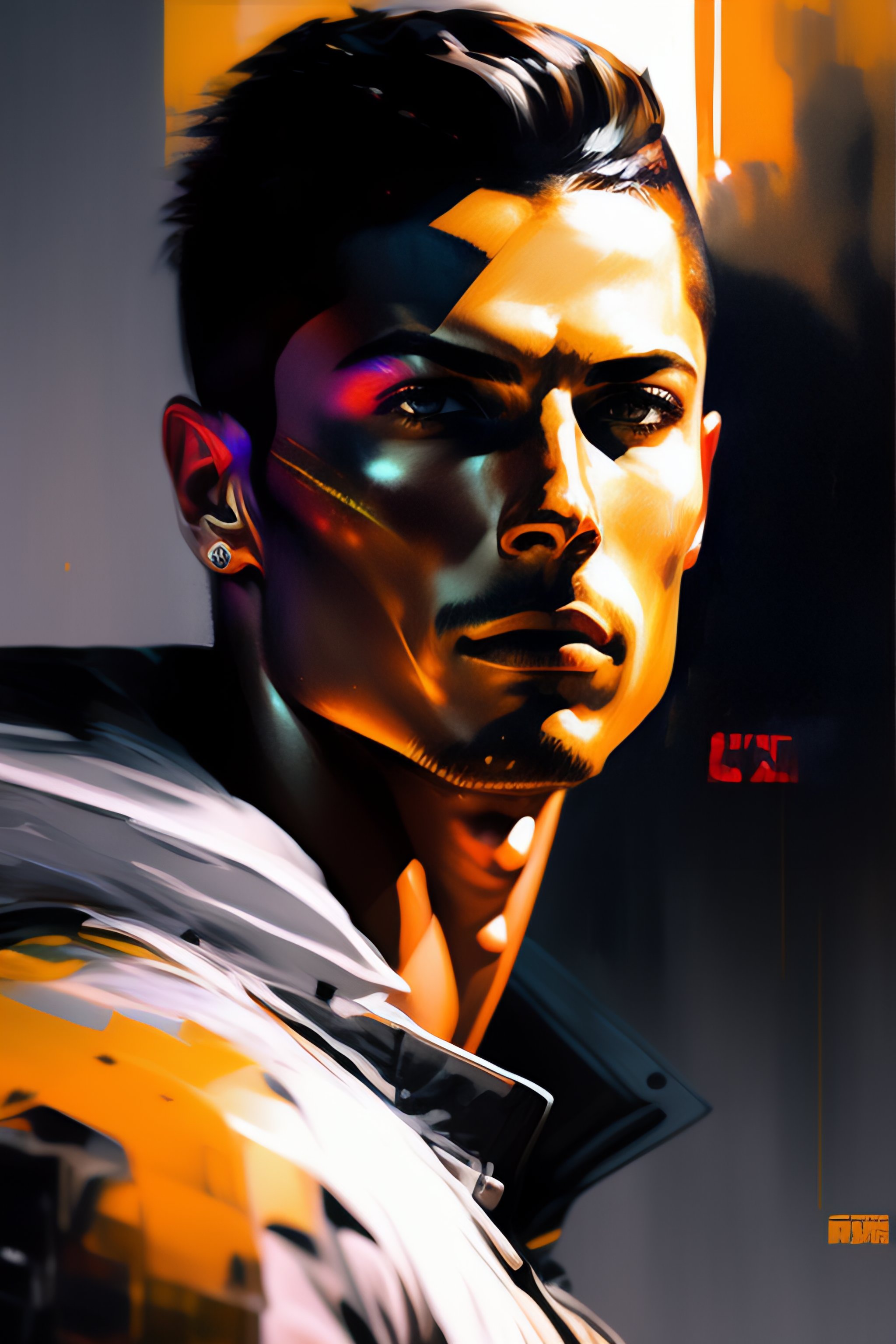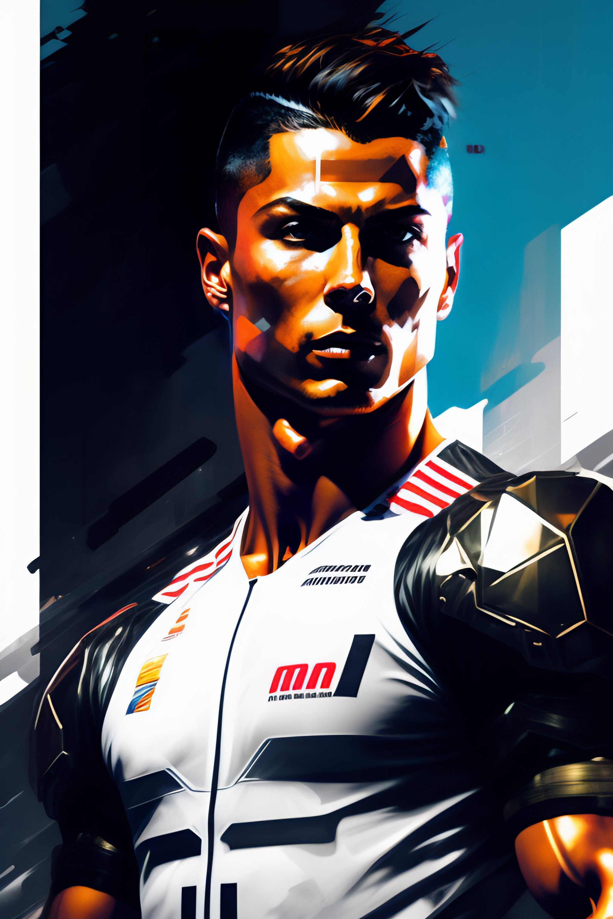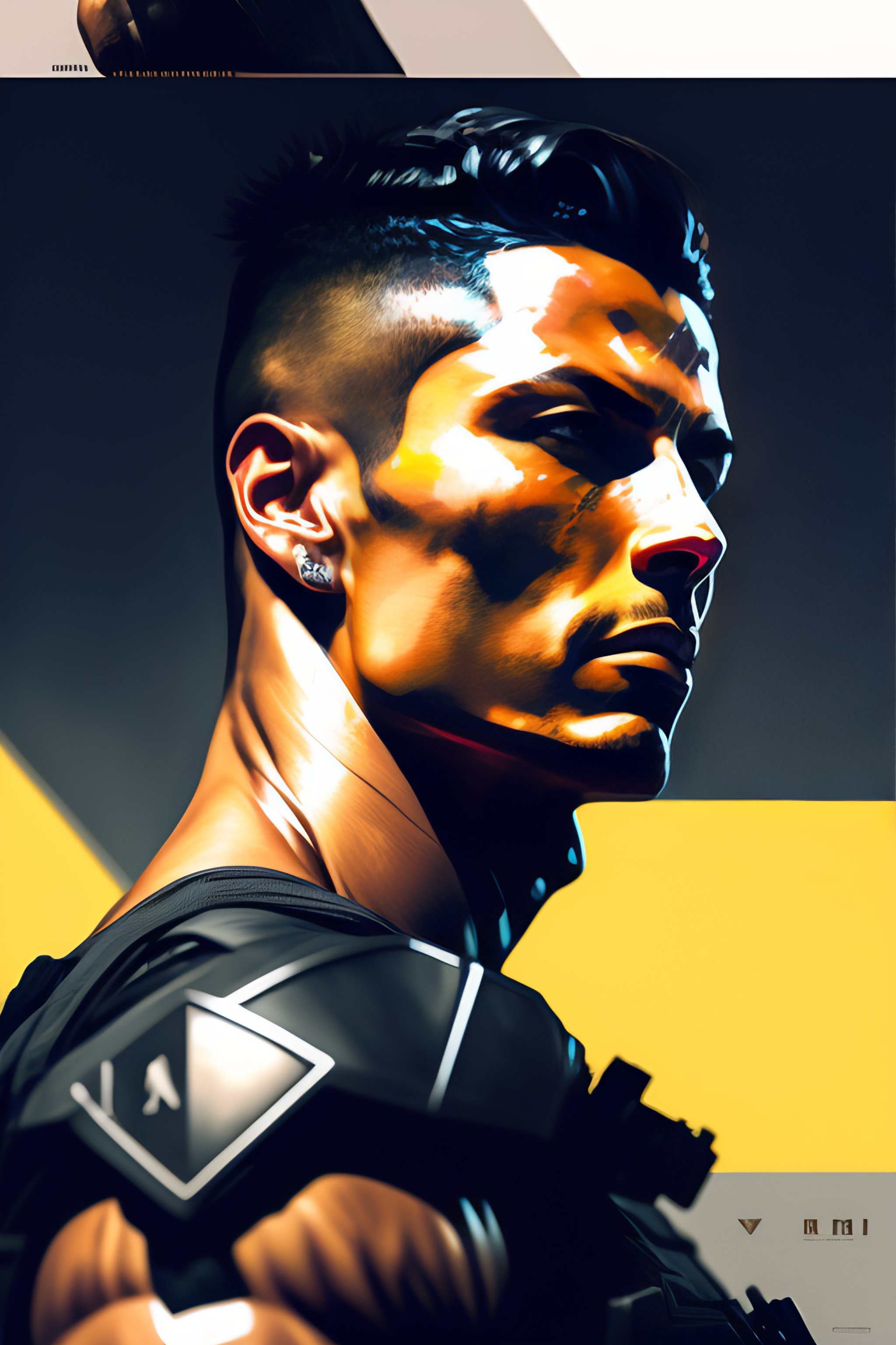 Cristiano ronaldo wearing metal gear armor holding gun dramatic lighting art by brandon anschultz by yoji shinkawa by richard schmid by greg rutkowski by sandra chevrier by jeremy lipking cinematic dramatic brush strokes background