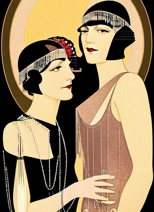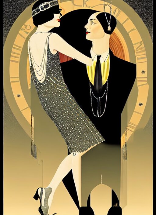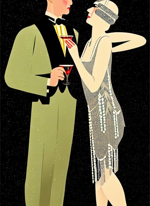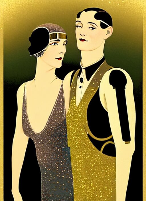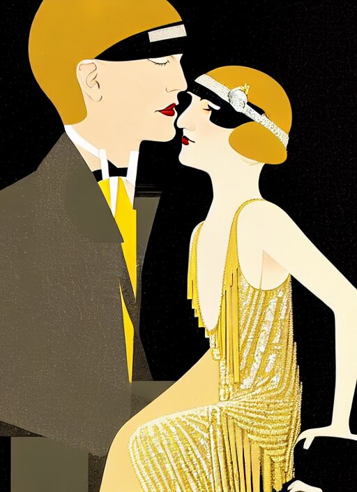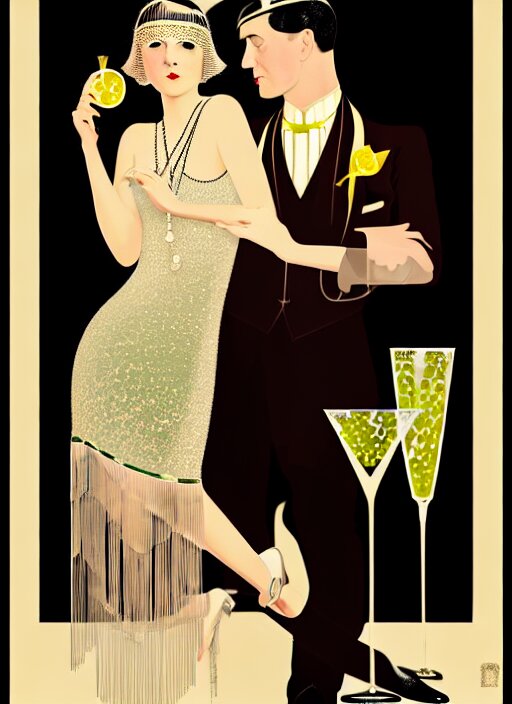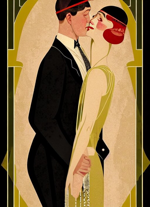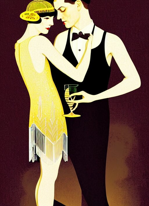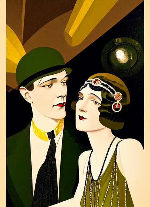 A beautiful classy flapper couple, dimly lit upscale 1920s speakeasy, relaxed pose, fantasy, art deco, detailed painterly digital art style by coles phillips and alfred charles parker, πΈπ, 8k octane beautifully detailed render, post-processing, extremely hyperdetailed, intricate, epic composition, grim yet sparkling atmosphere, cinematic lighting + masterpiece, trending on artstation, very detailed, vibrant colors