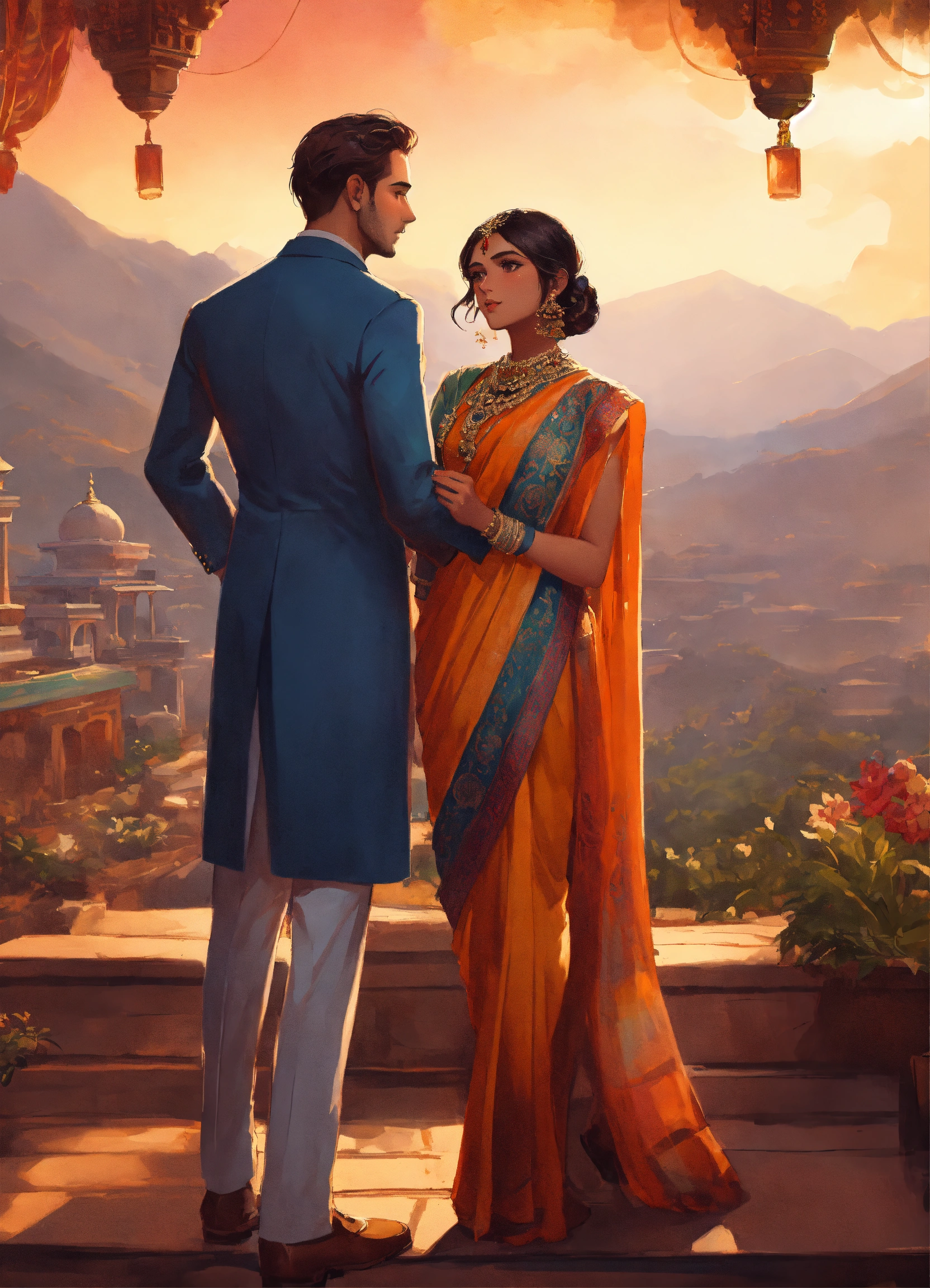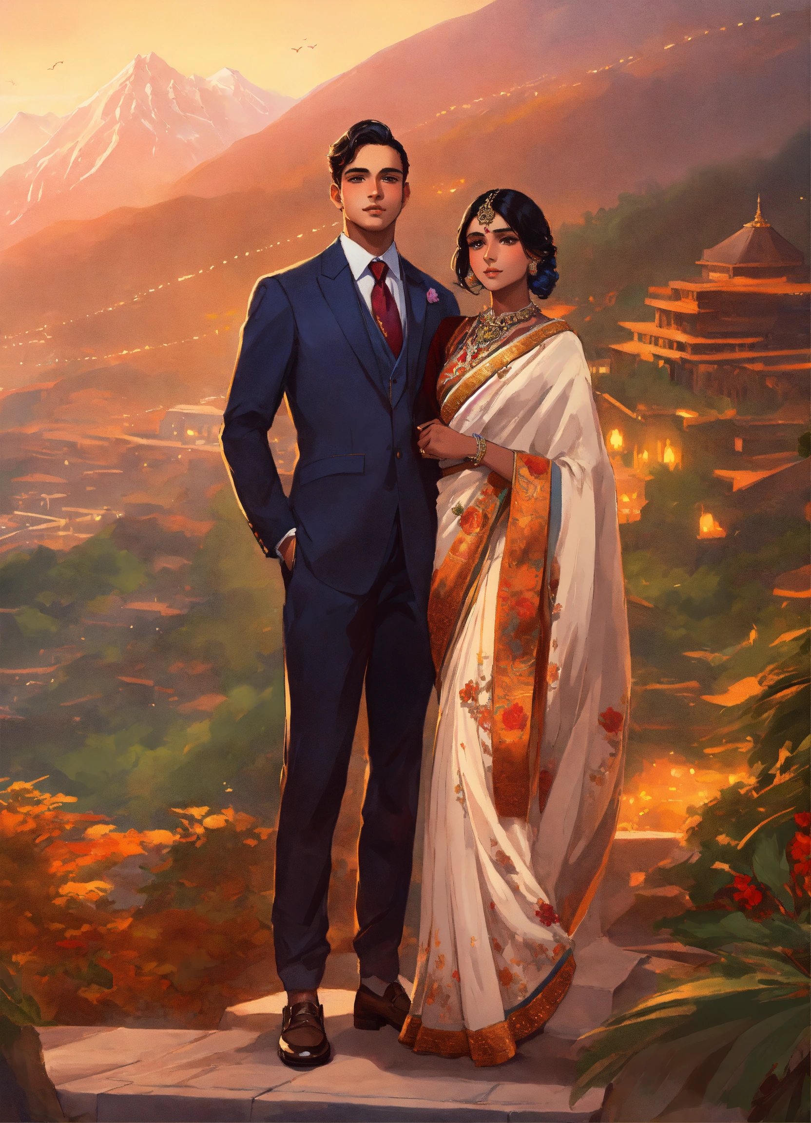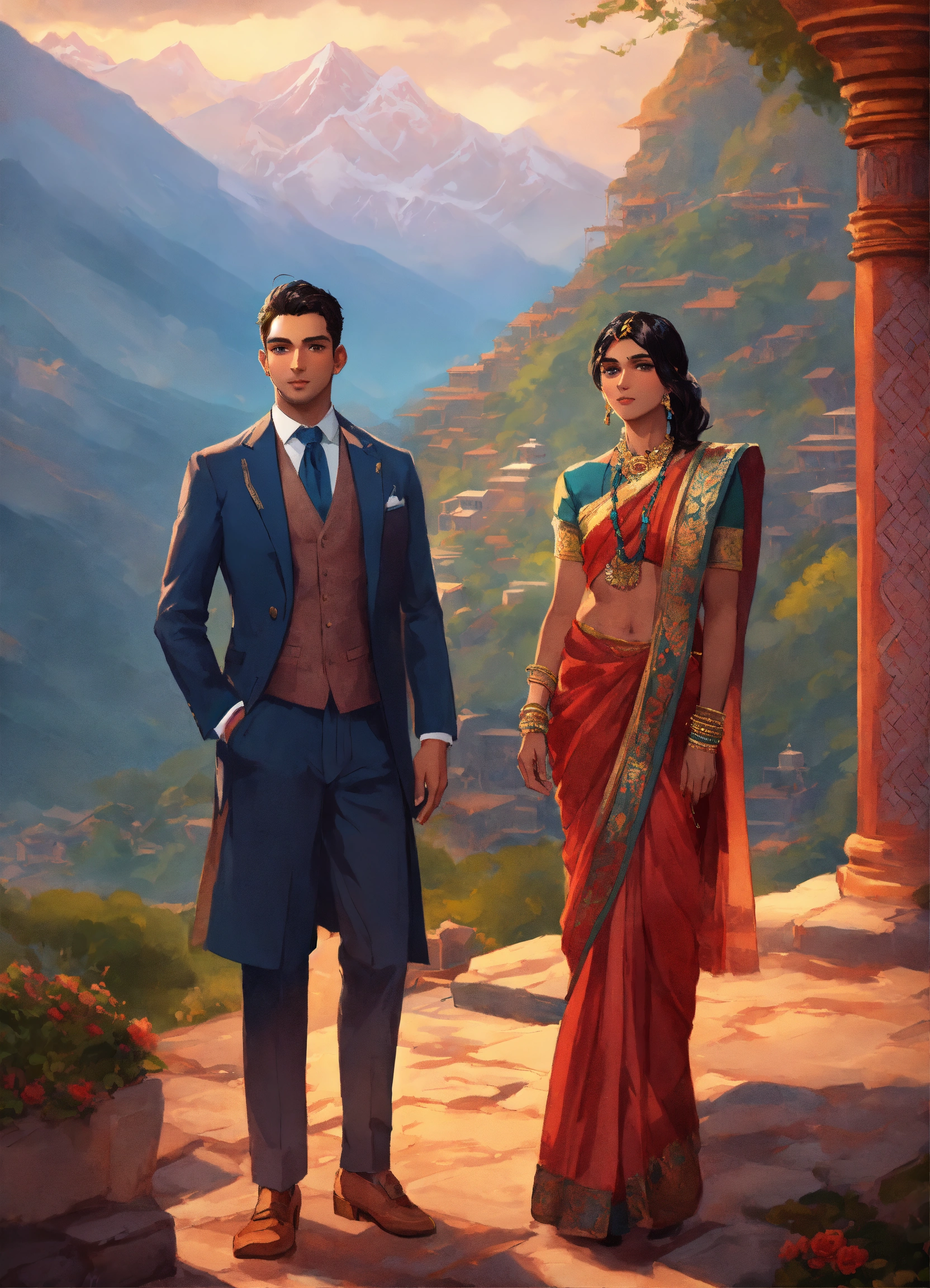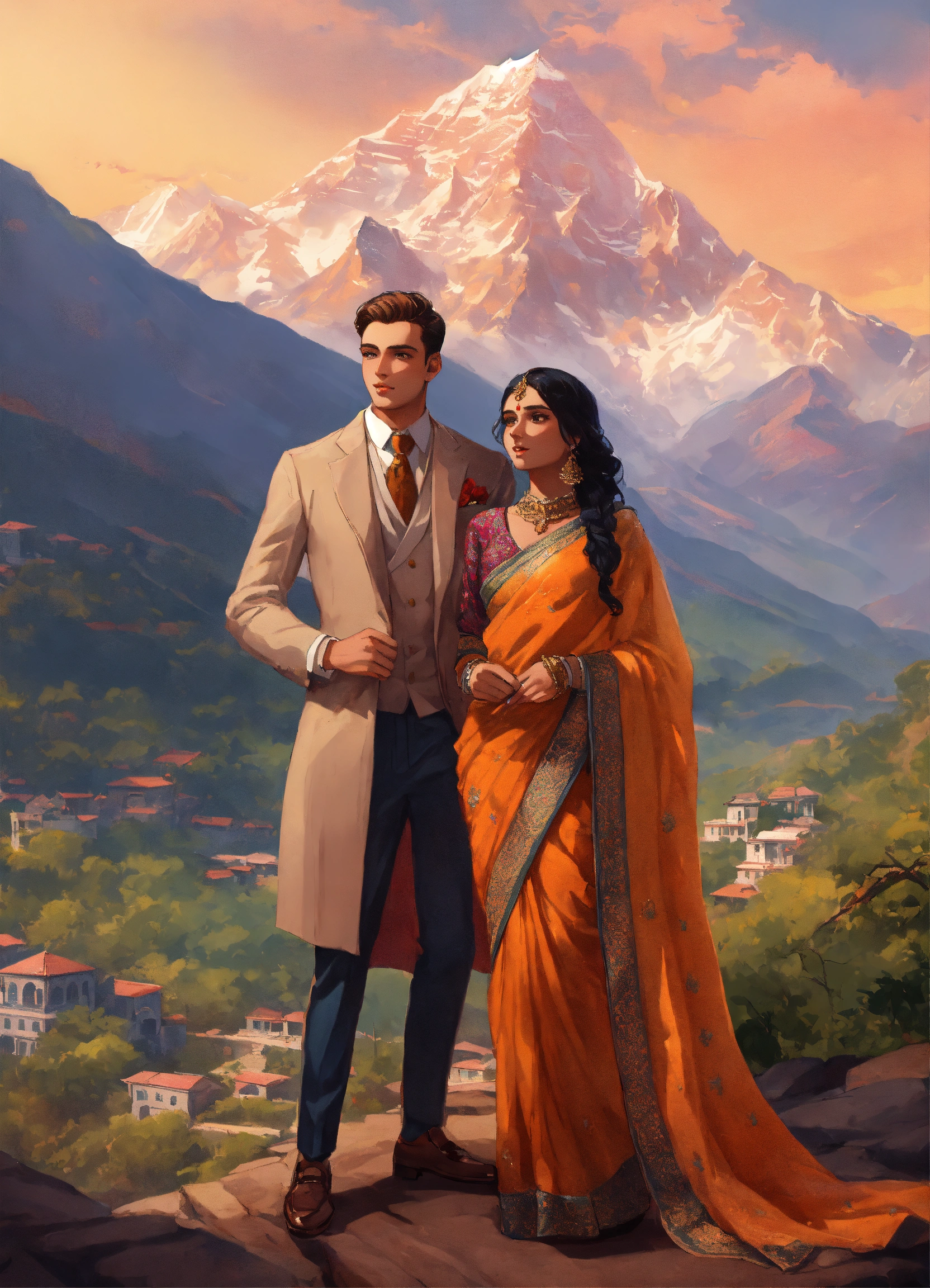 Illustration of a hill station, 1920, british india, a young british man in a suit and indian woman, the white man is british, the indian woman wears a intricate sari, maximalist, 8k photo, anime style, himalayas, by artgerm, trending on artstation