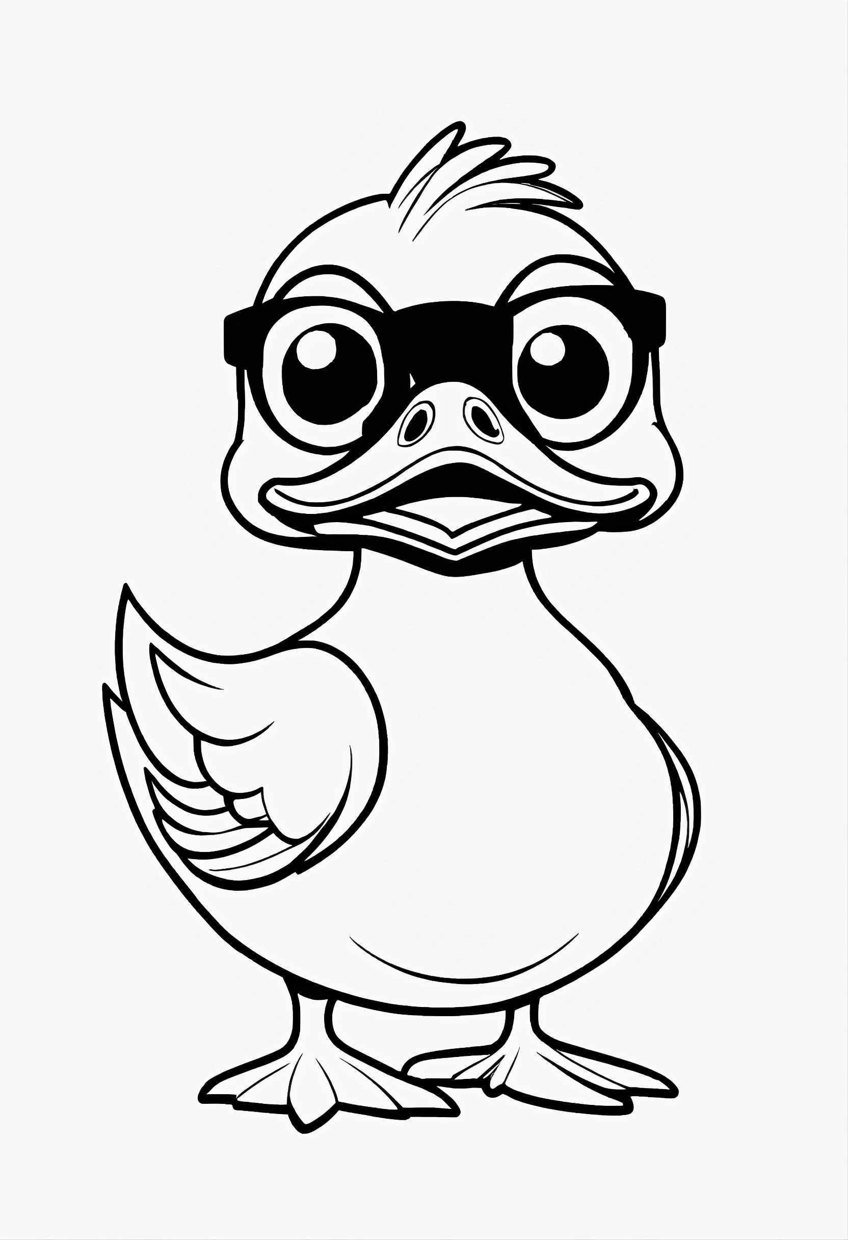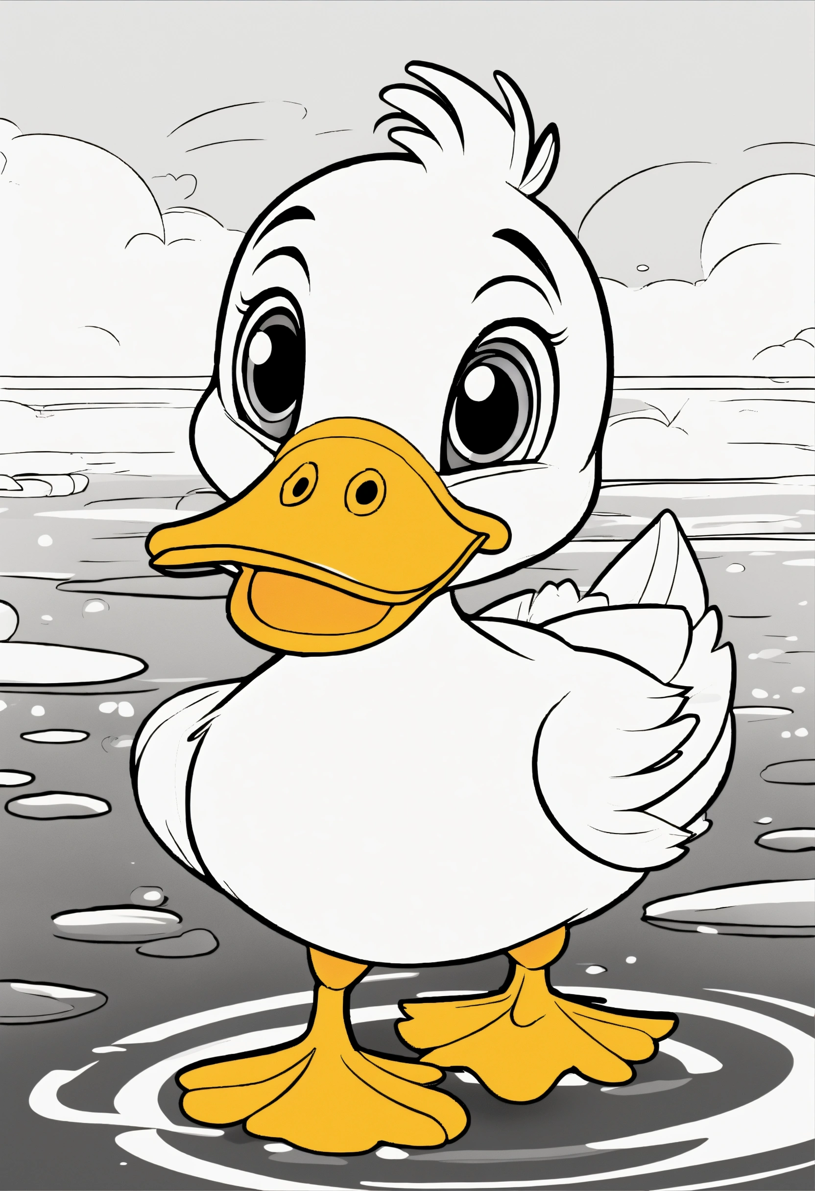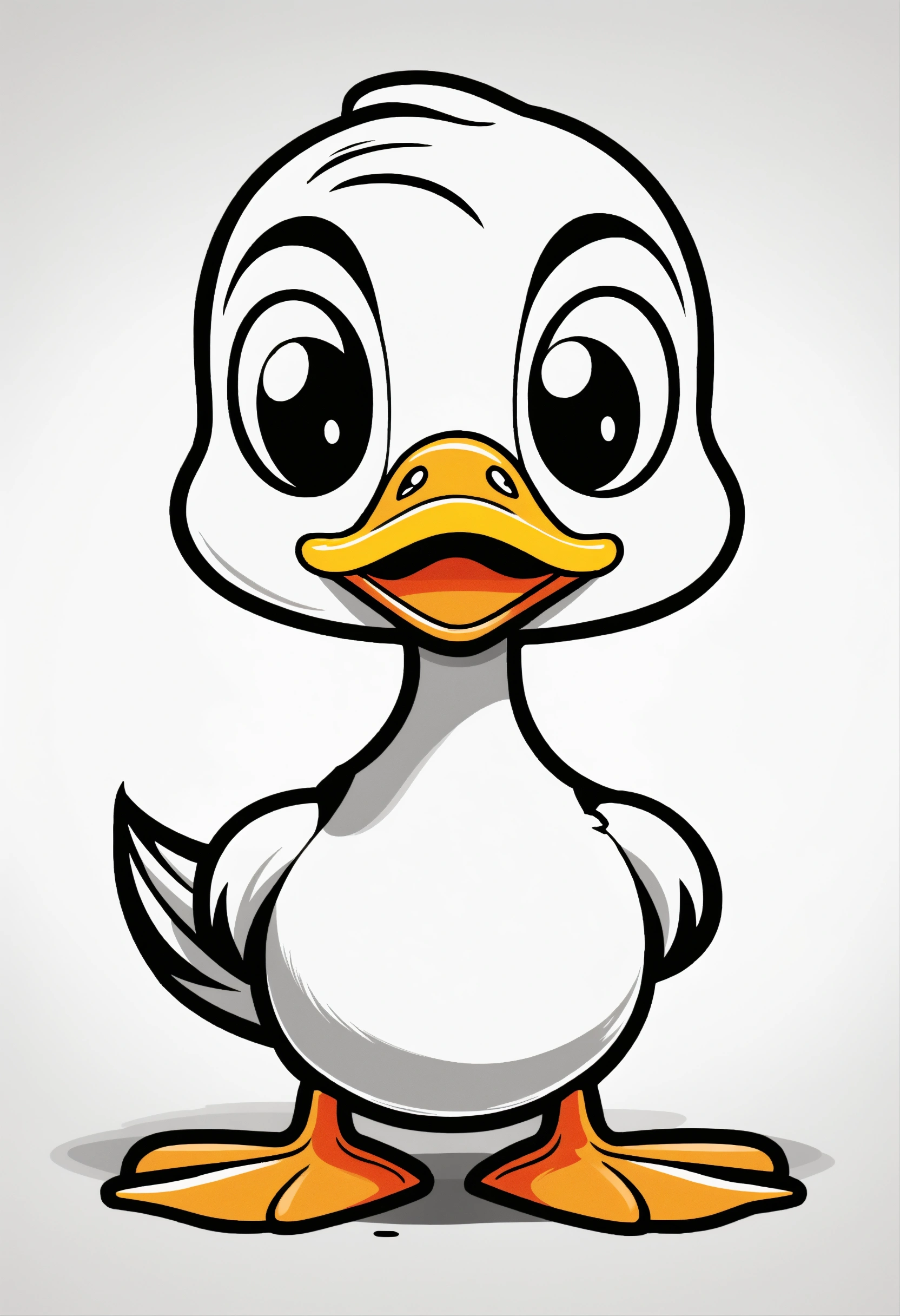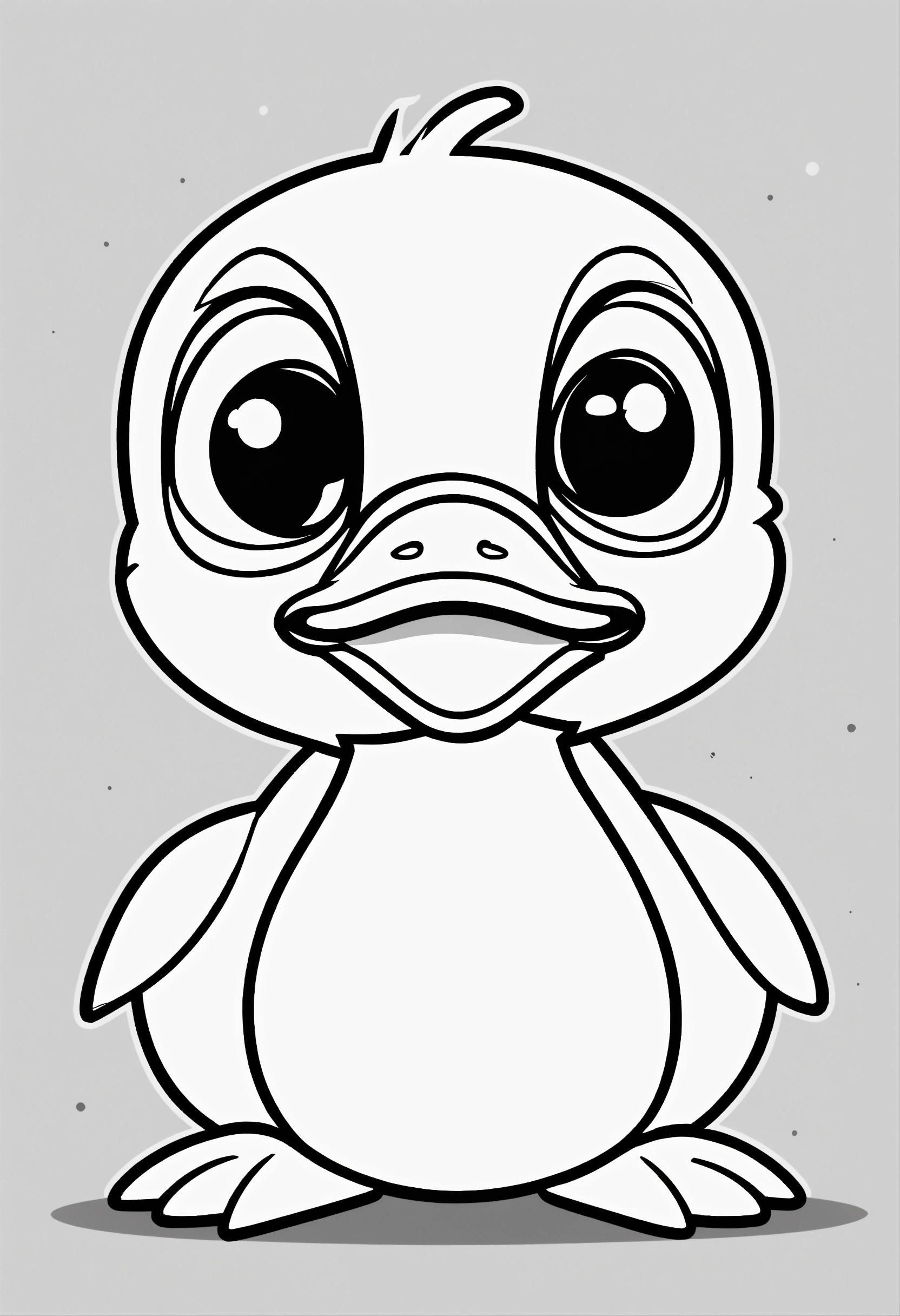 Cute duck, big cute eyes, pixar style, simple outline and shapes, coloring page black and white comic book flat vector, white background