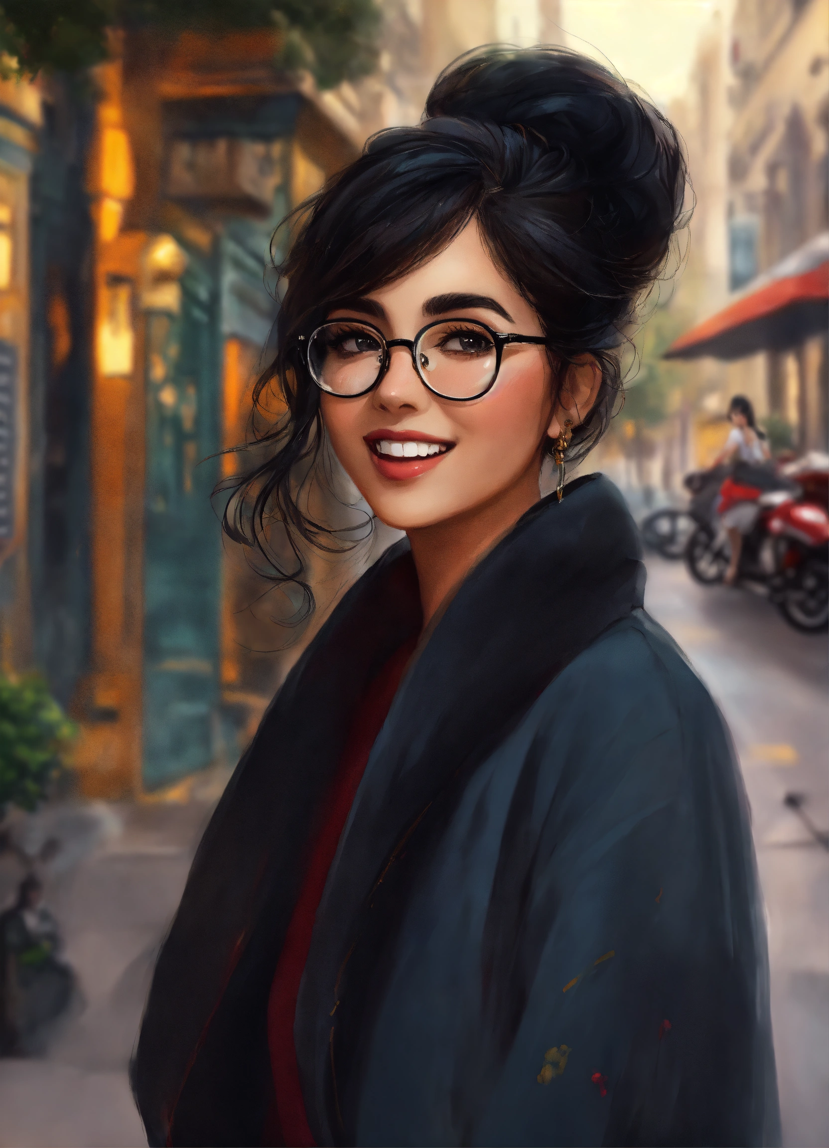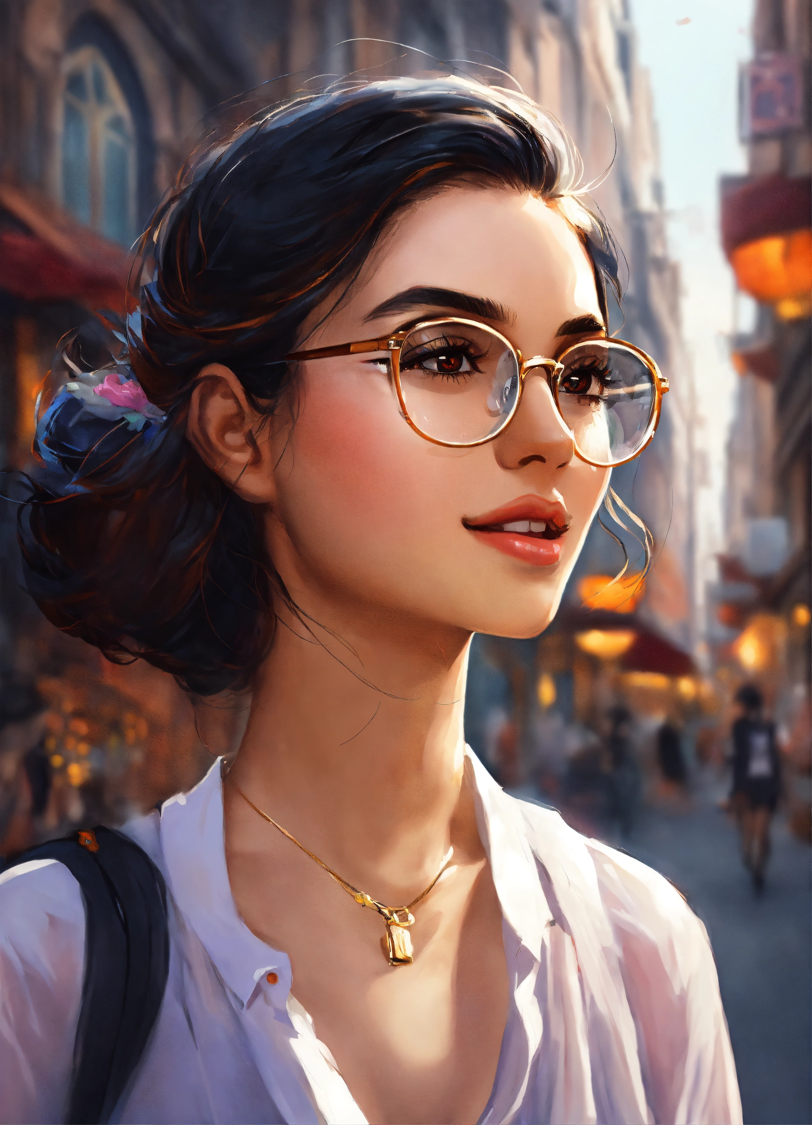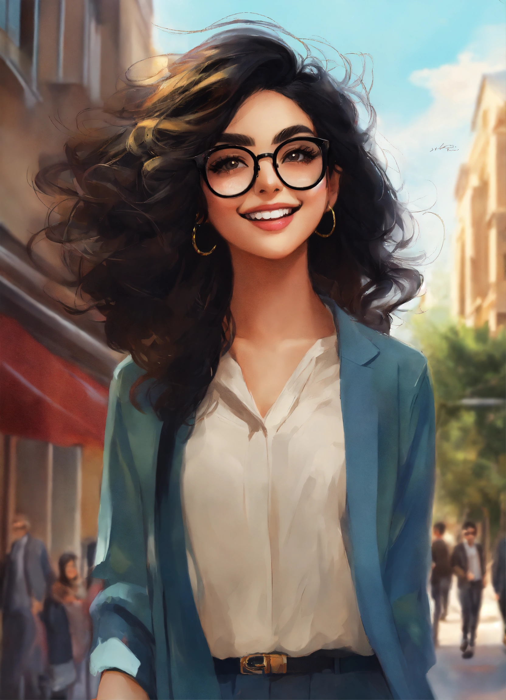 Elegant persian girl, cute face, big eyes big leep, digital painting, glasses, black hair, fashion magazine, she laughs and she is walking on the sidewalk.