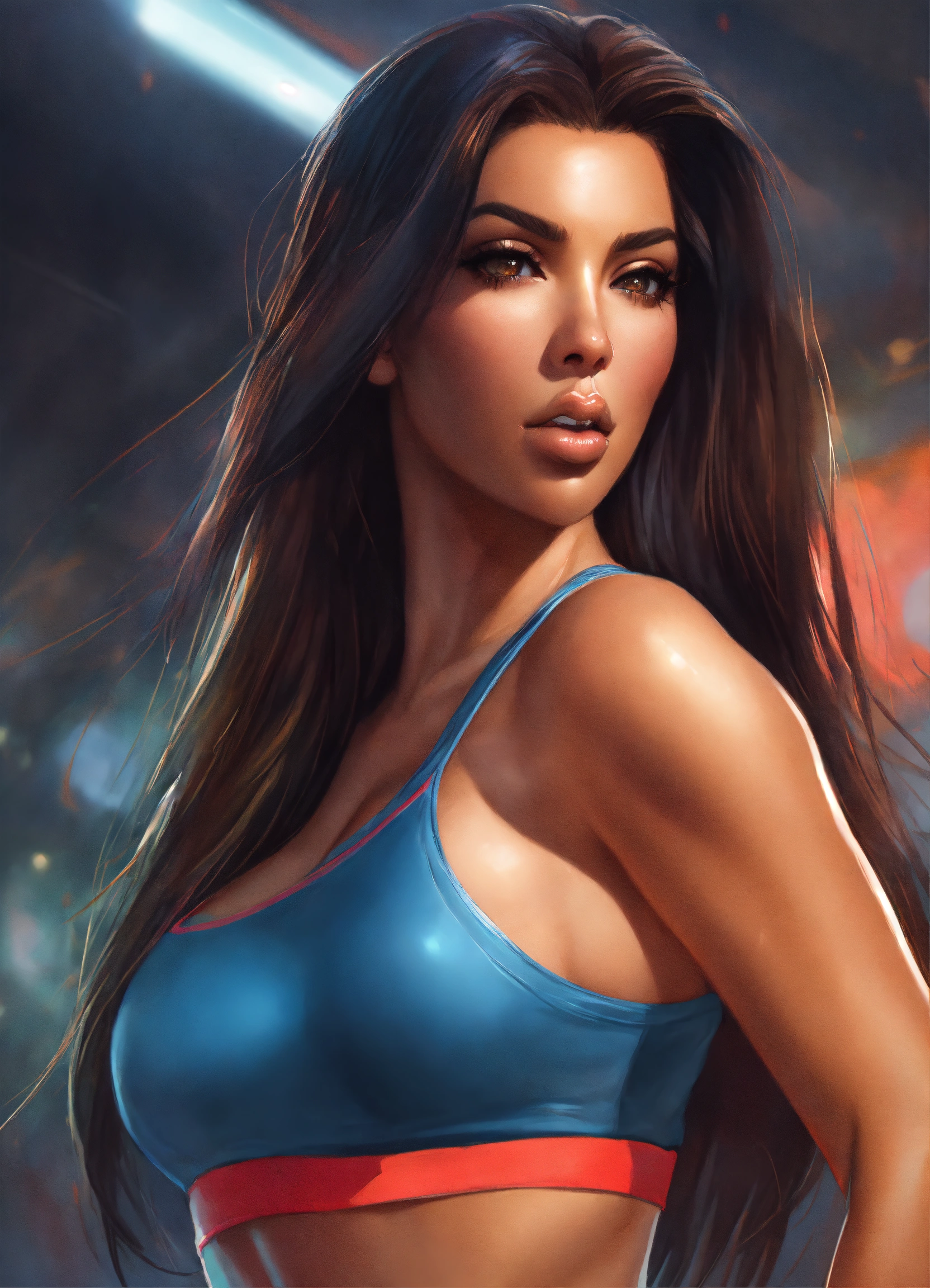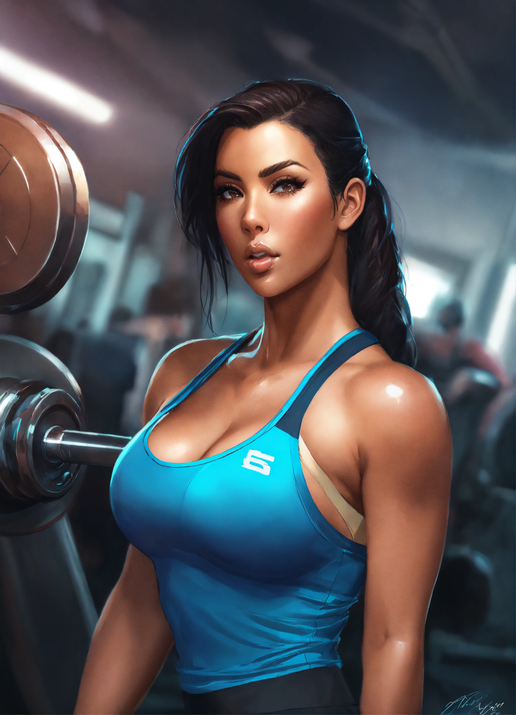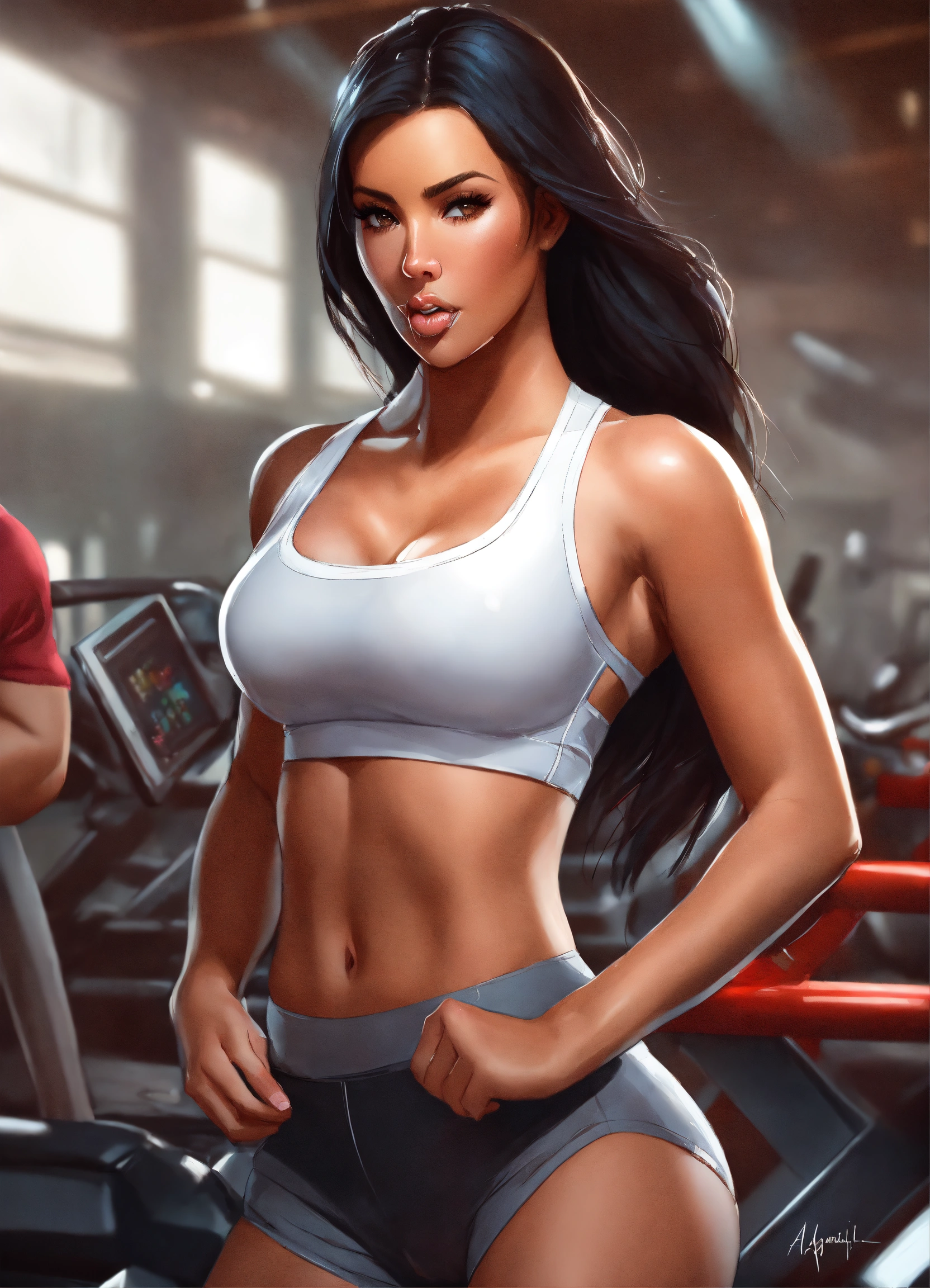 Kim kardashian, highly detailed, gym outfit, shiny, digital painting, concept art, sharp focus, illustration, art by artgerm and greg rutkowski and magali villeneuve, licking lip, wide hips