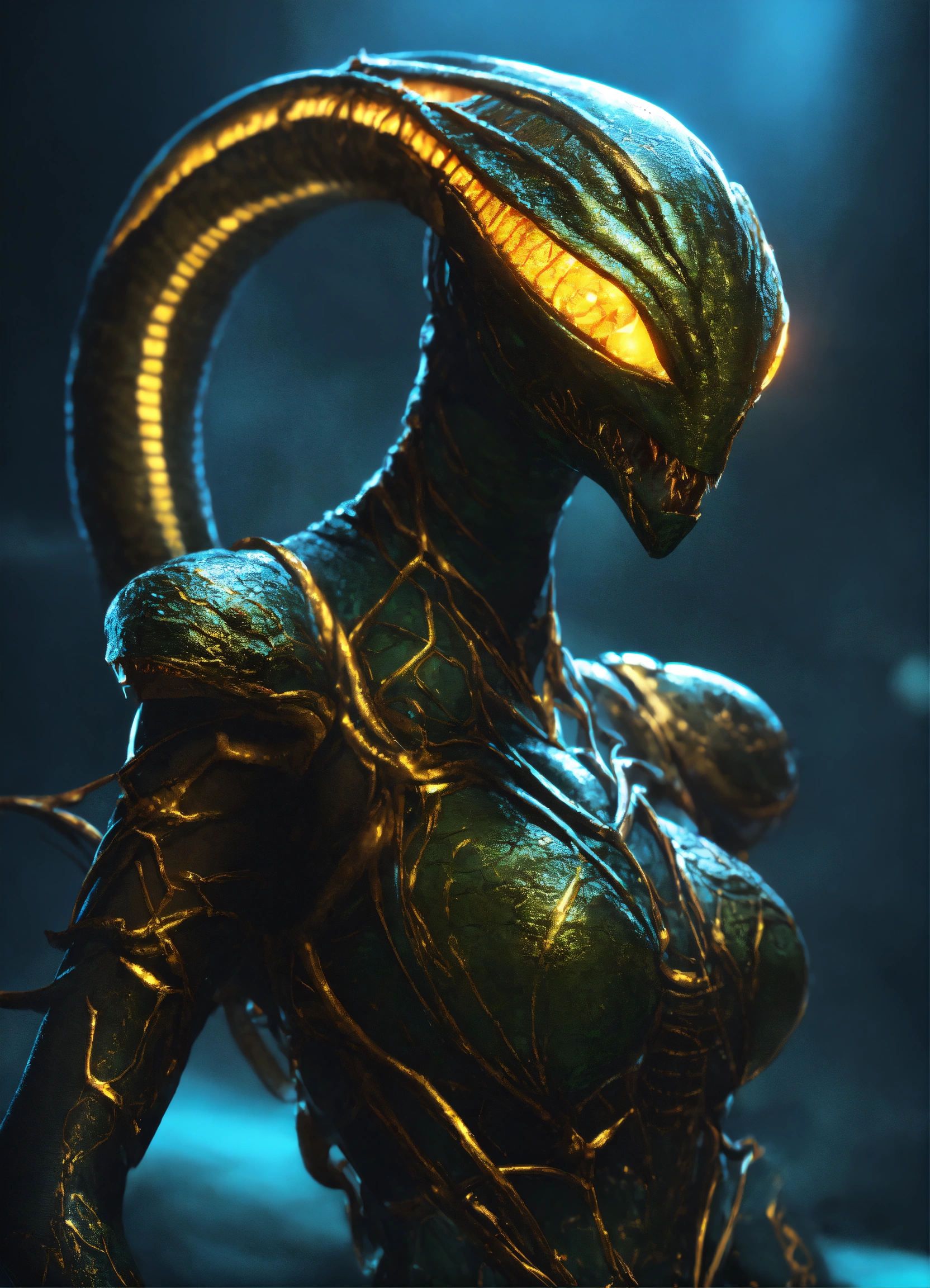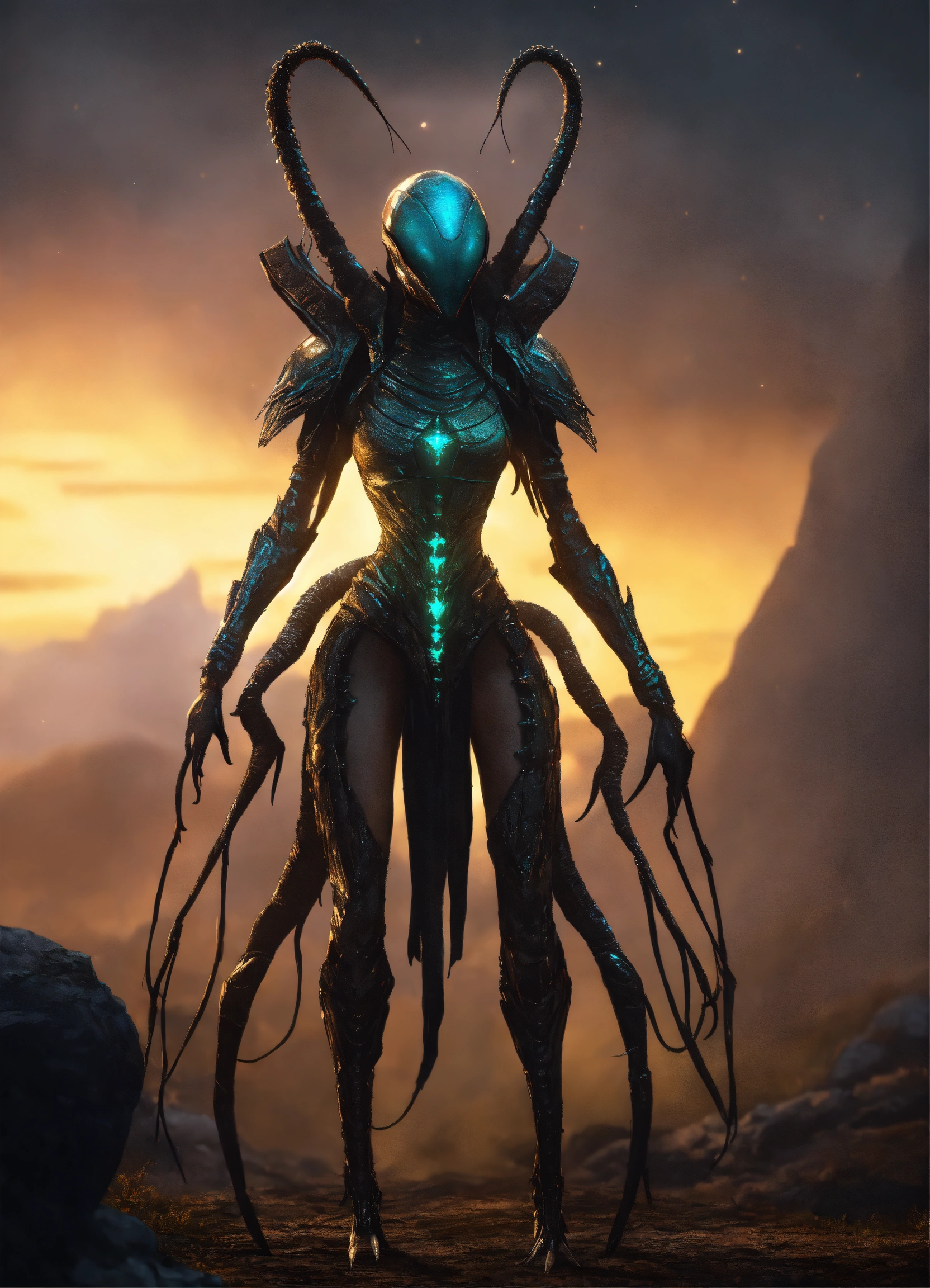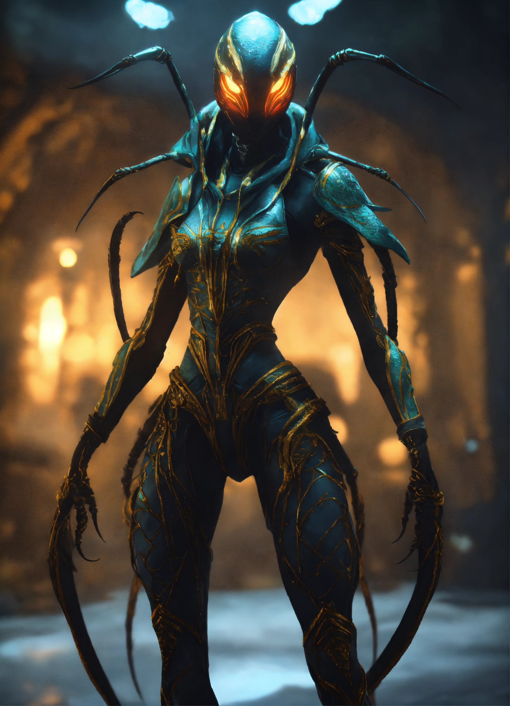 Alien female with six long spider legs, powerful jaws, beautiful and terrible, flexible body, long snake tail, luminous eyes, inspired by stellaris game and warframe, dark souls style