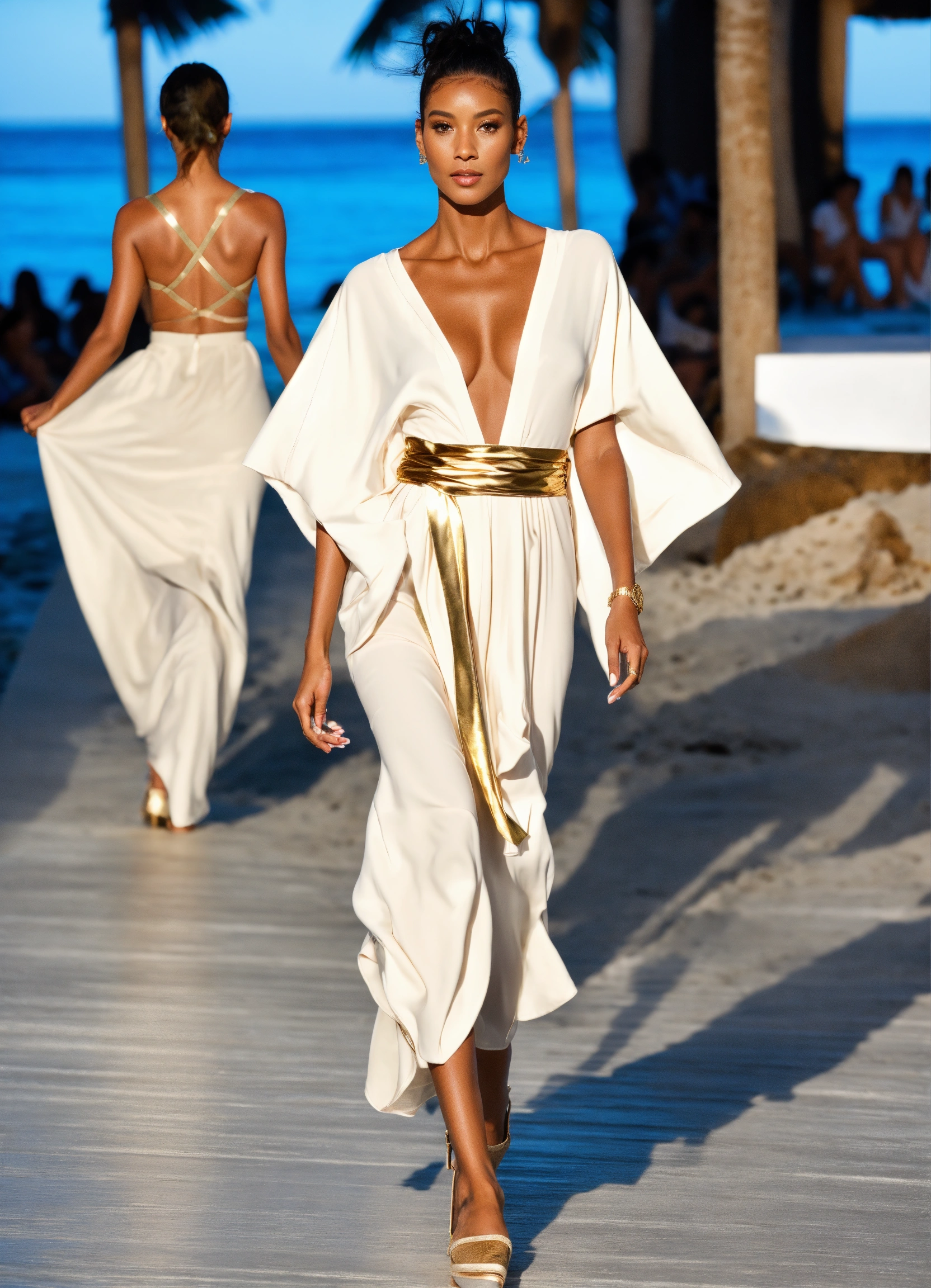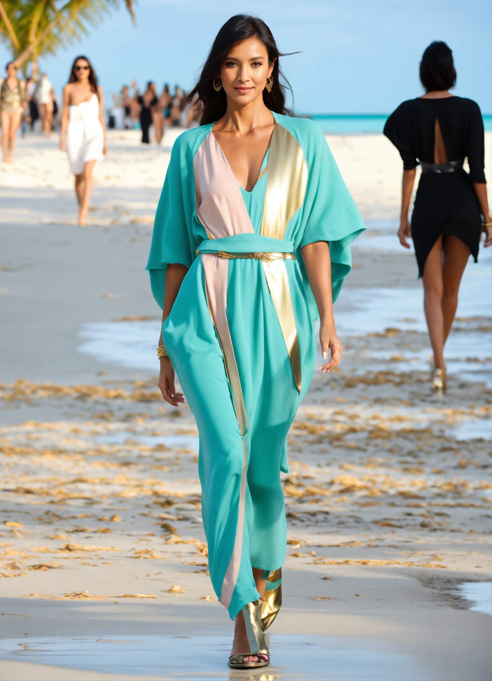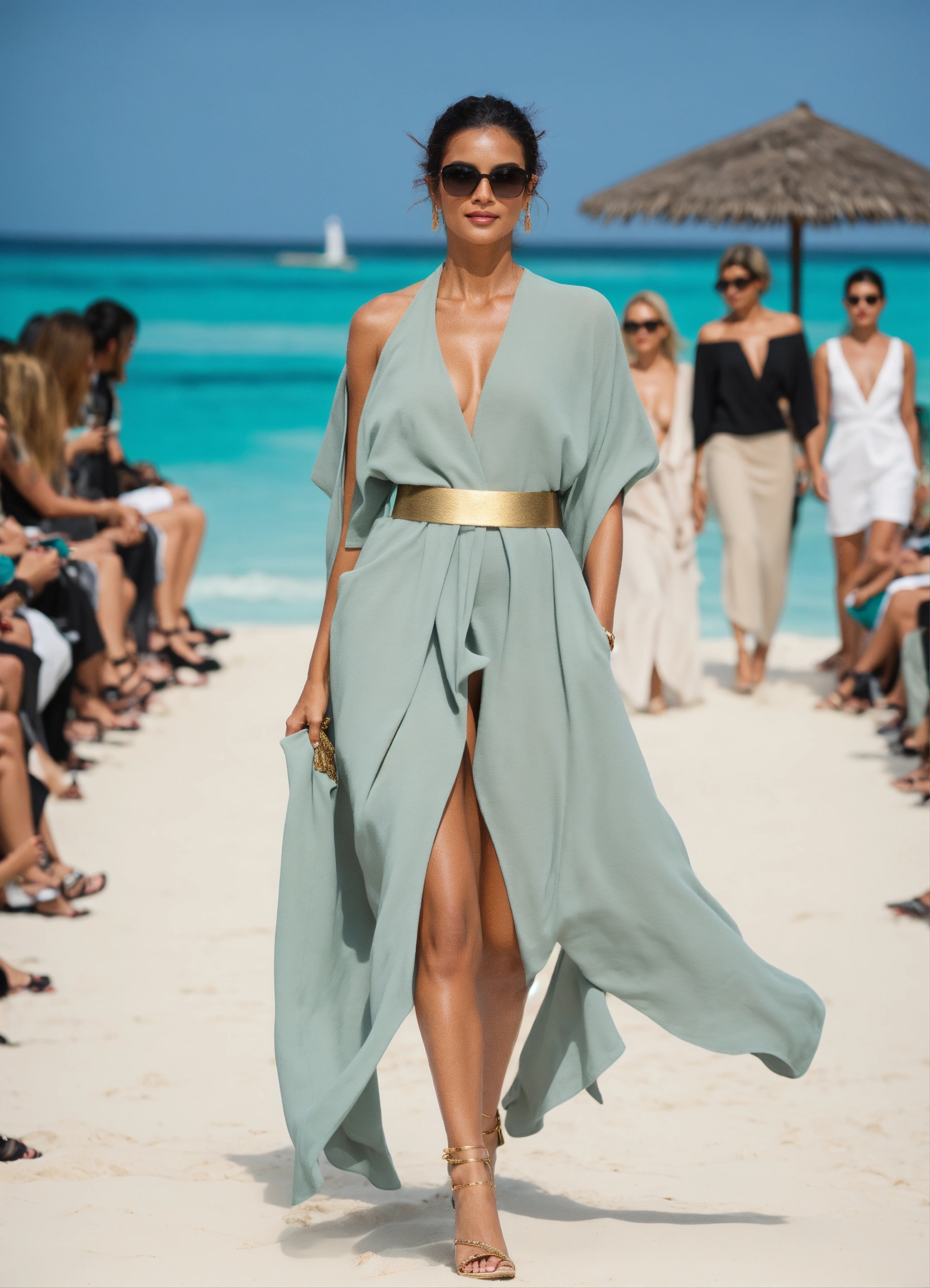 Celebrity on the go walking runway wearing dolman sleeve casual donna karan modern summer outfit in black, white, blush, grey, beige, seafoam, eep teal, stone, charcoal, gold, metallics, foil, details, cutouts on a maldives beach