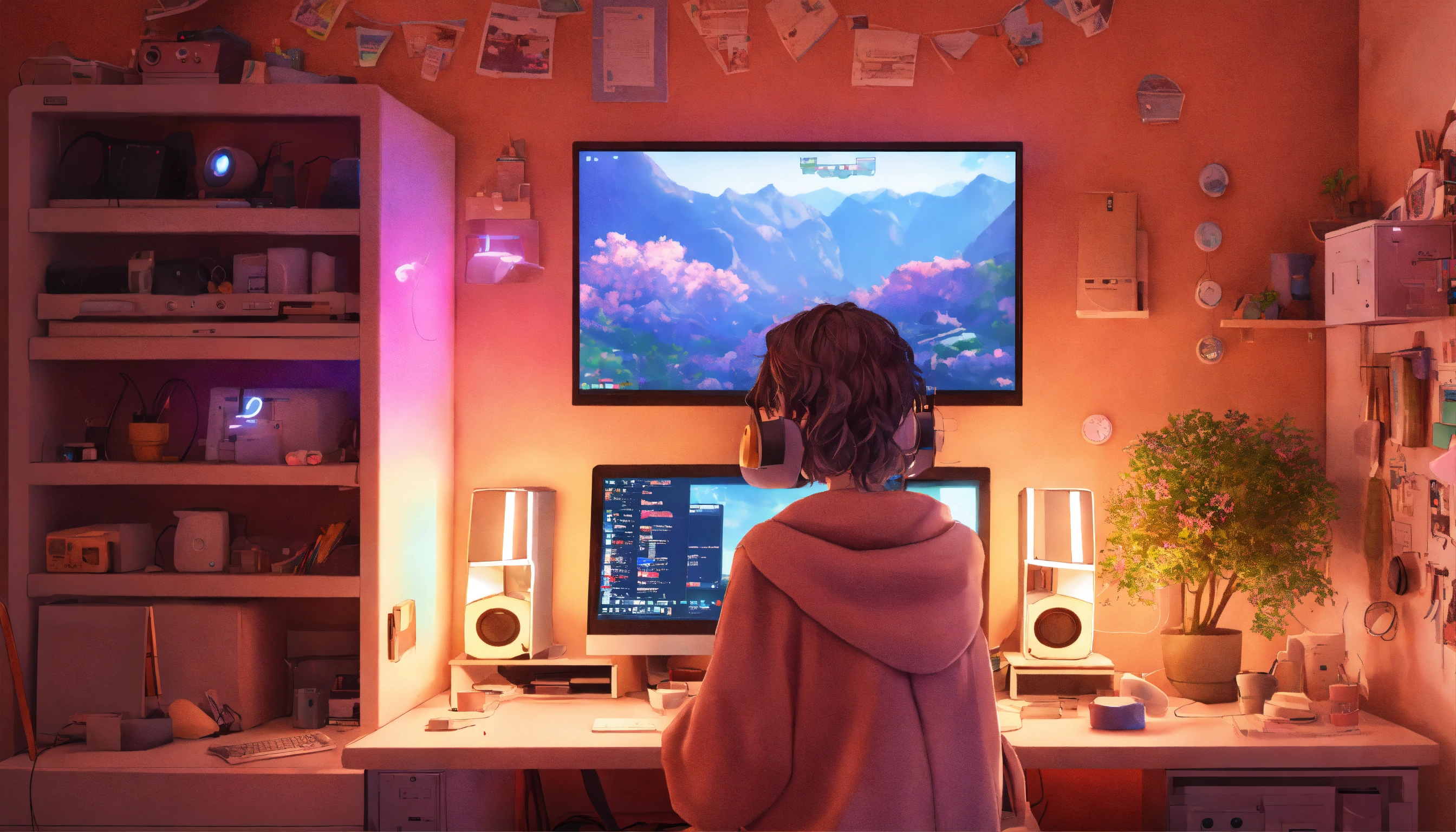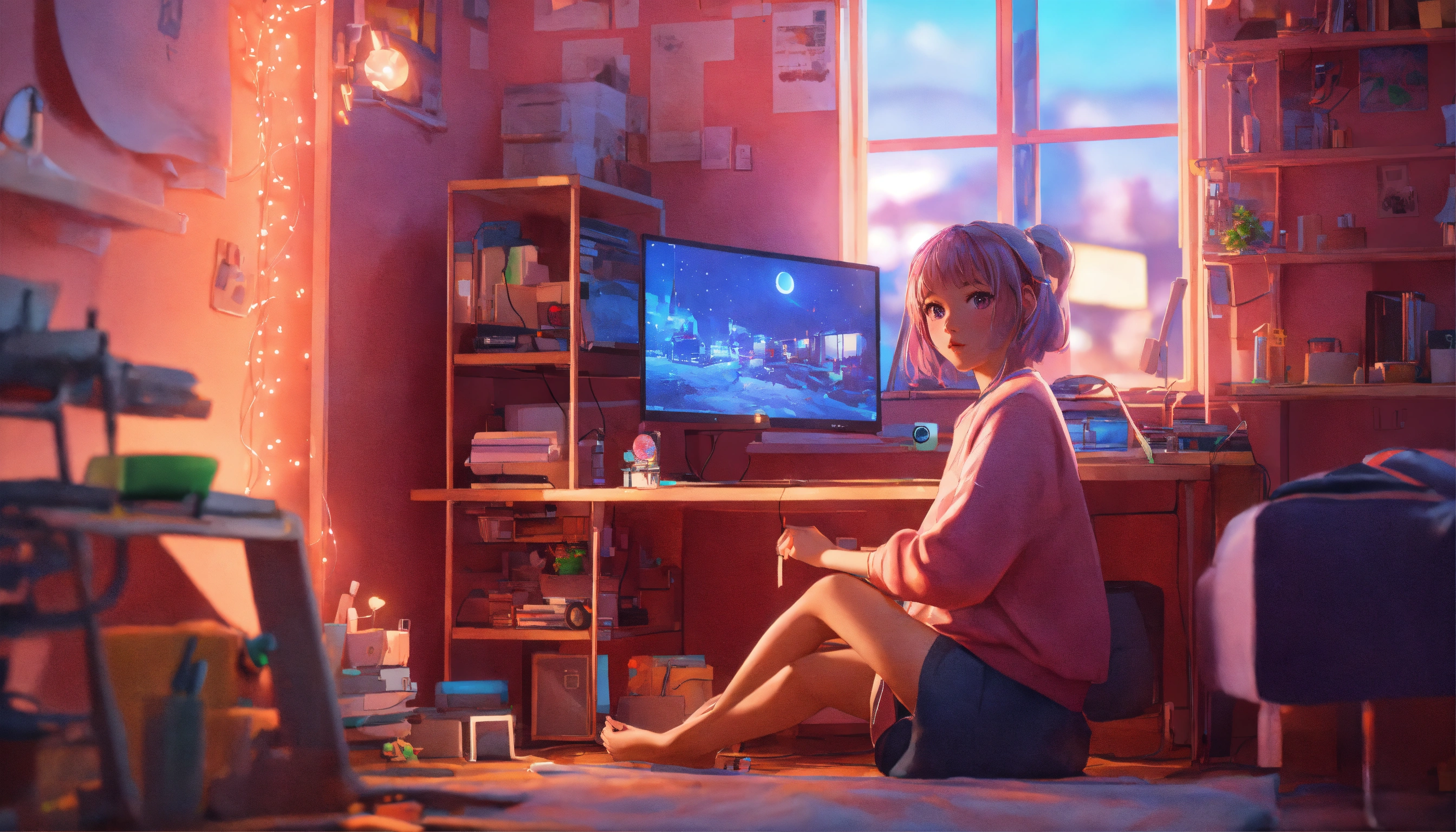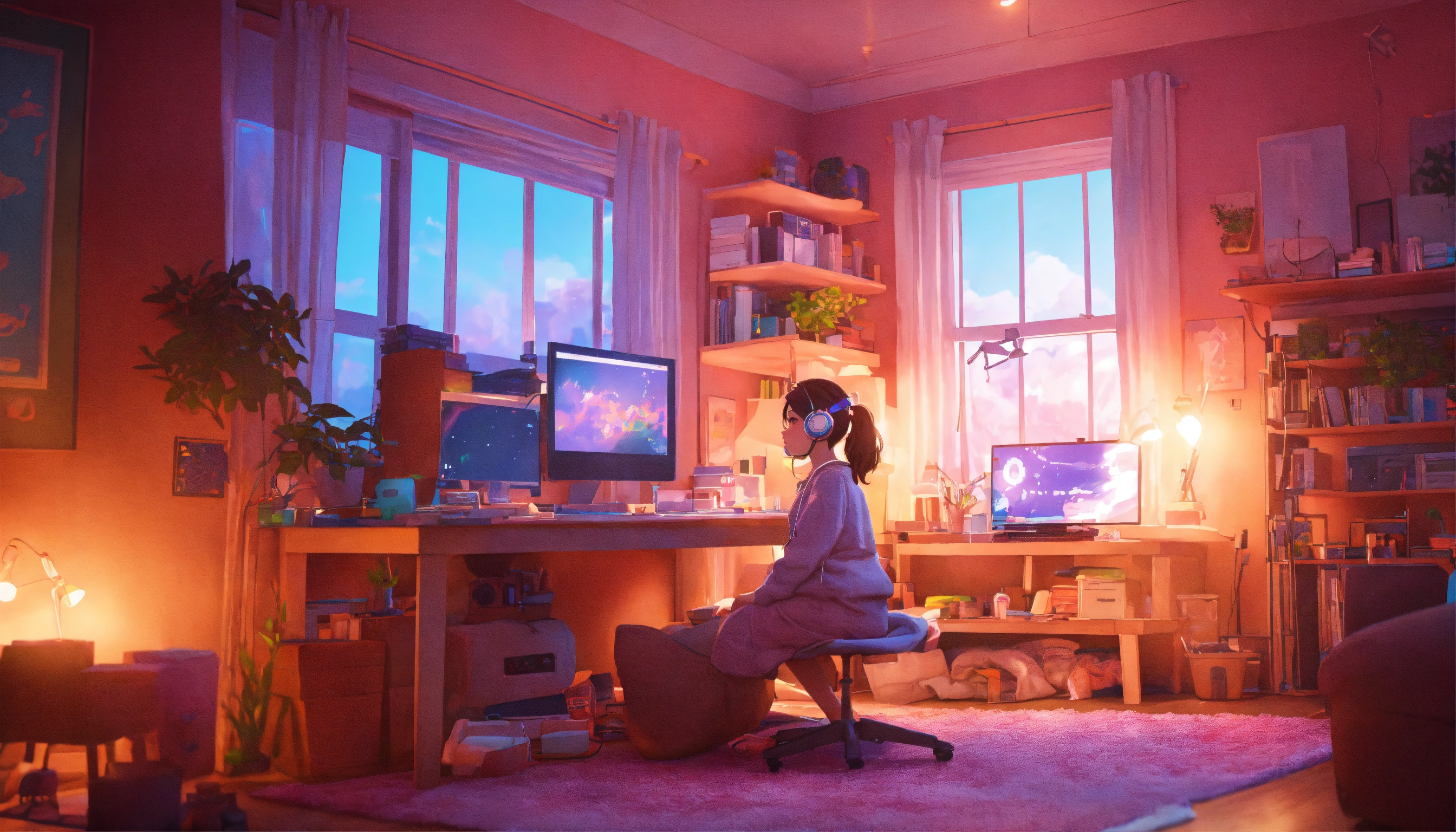 Cute lofi girl in front of his computer in her cozy and messy room, unreal engine 5 render, gorgeous lighting, cute pastel hues, 8k render, realistic scenic render.