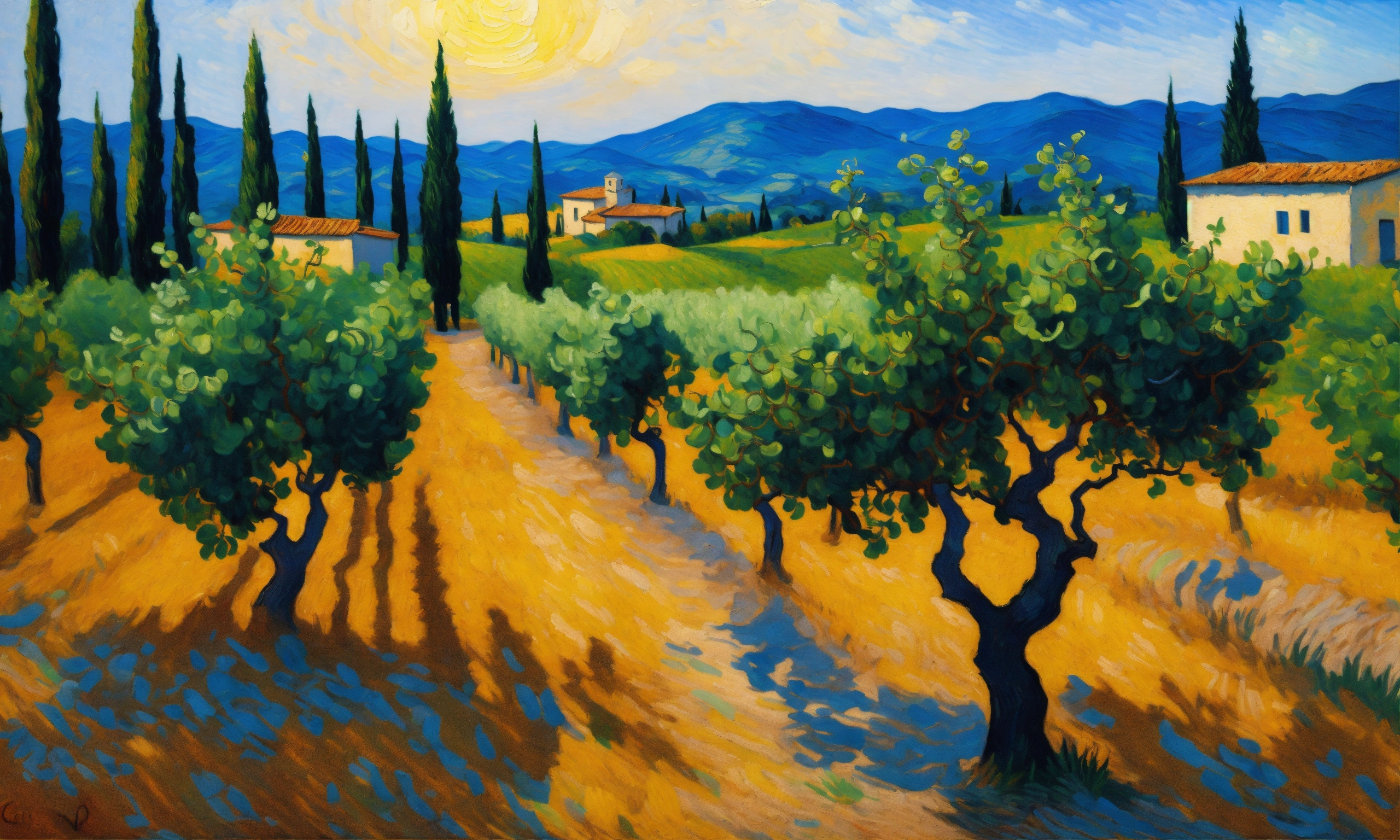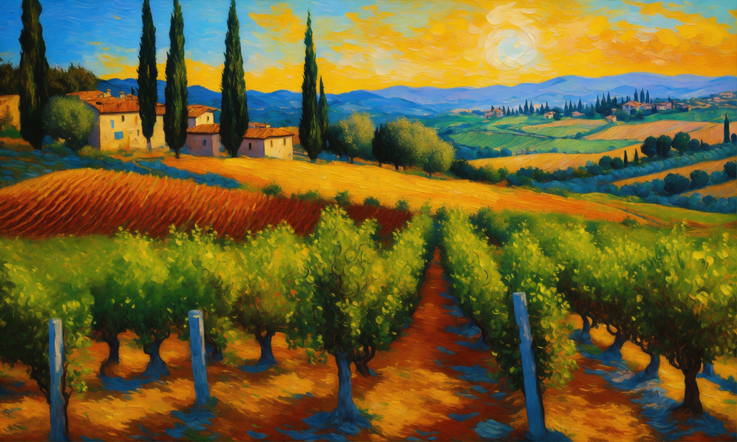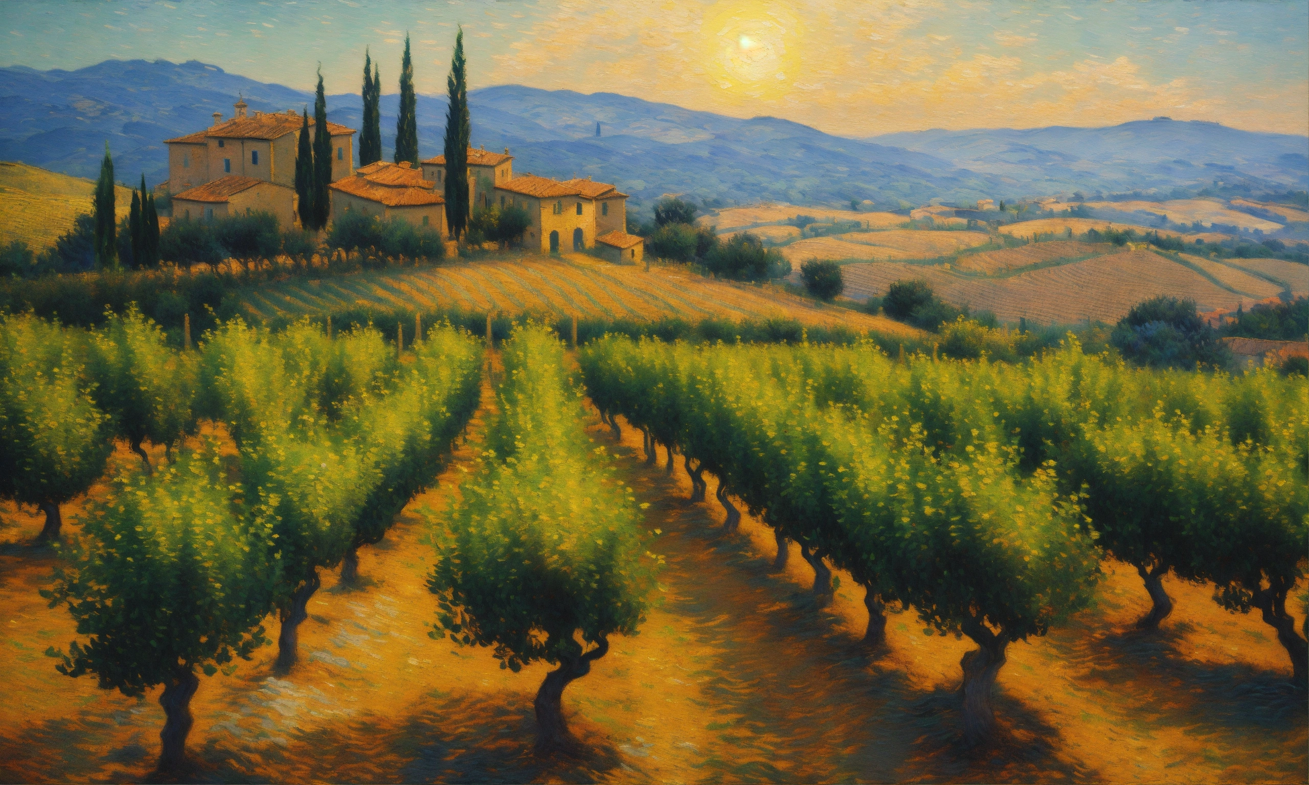 Oil painting, tuscany, vineyard, olive trees, vincent van gogh, leonardo da vinci, claude monet, leonardo da vinci, intricate, 8k
