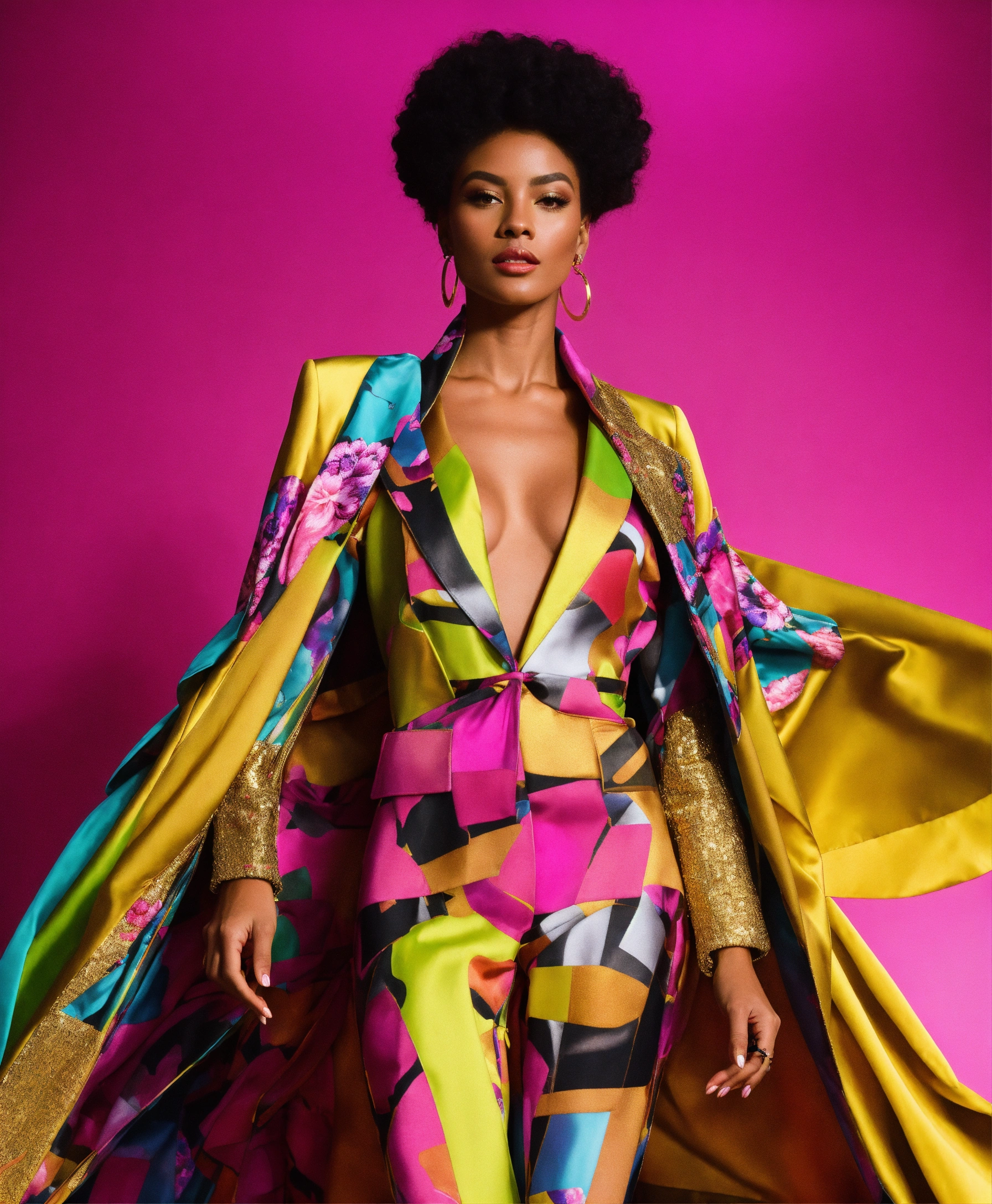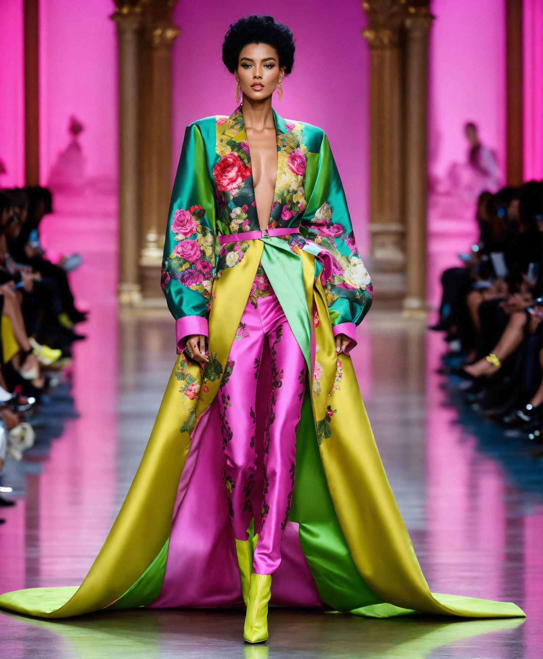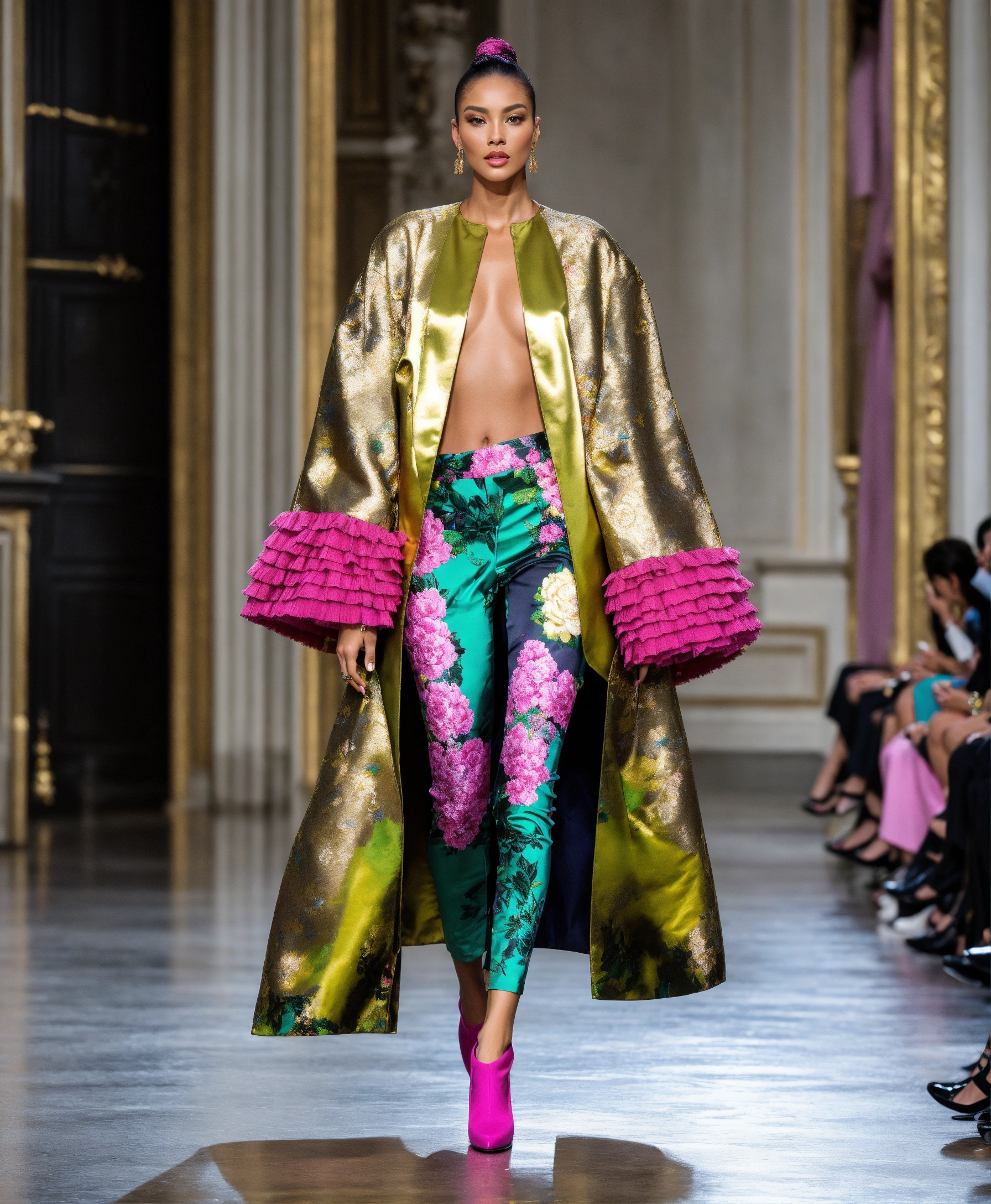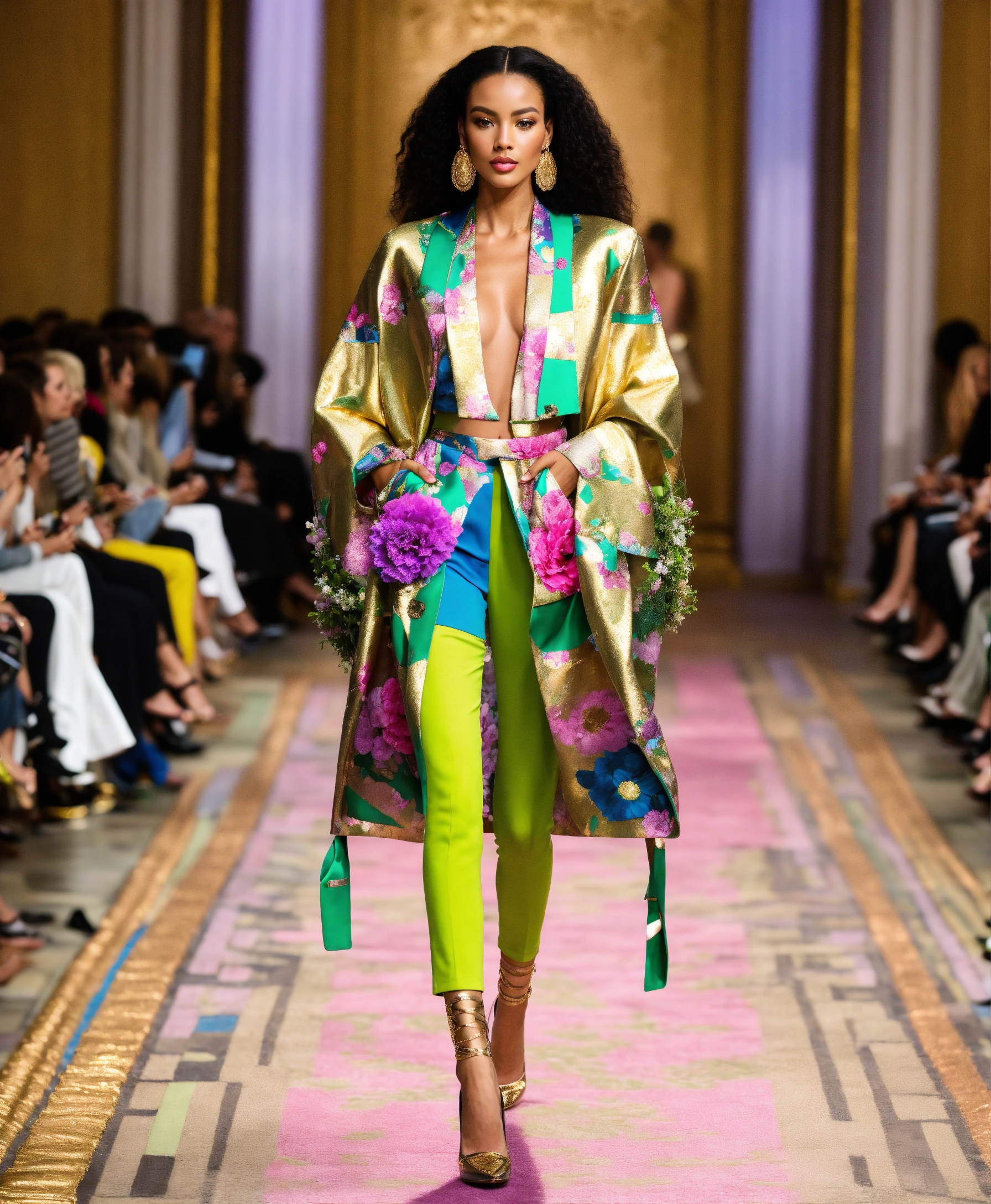 Ultra realistic full body photo of a trendy american model walking the runway modeling summer designer novelty interesting complex unusual street sporty classy modern dolman sleeve outfit brave, paris versailles details cutouts and and gold geometric pattern floral structured tailored jacket pink gold green lilac peridot silver magenta lime fuchsia yellow blue black gray copper mauve bronze haute couture ultimate elegance beautiful luxurious awesome wealthy resplendent magnificent sublime 12k