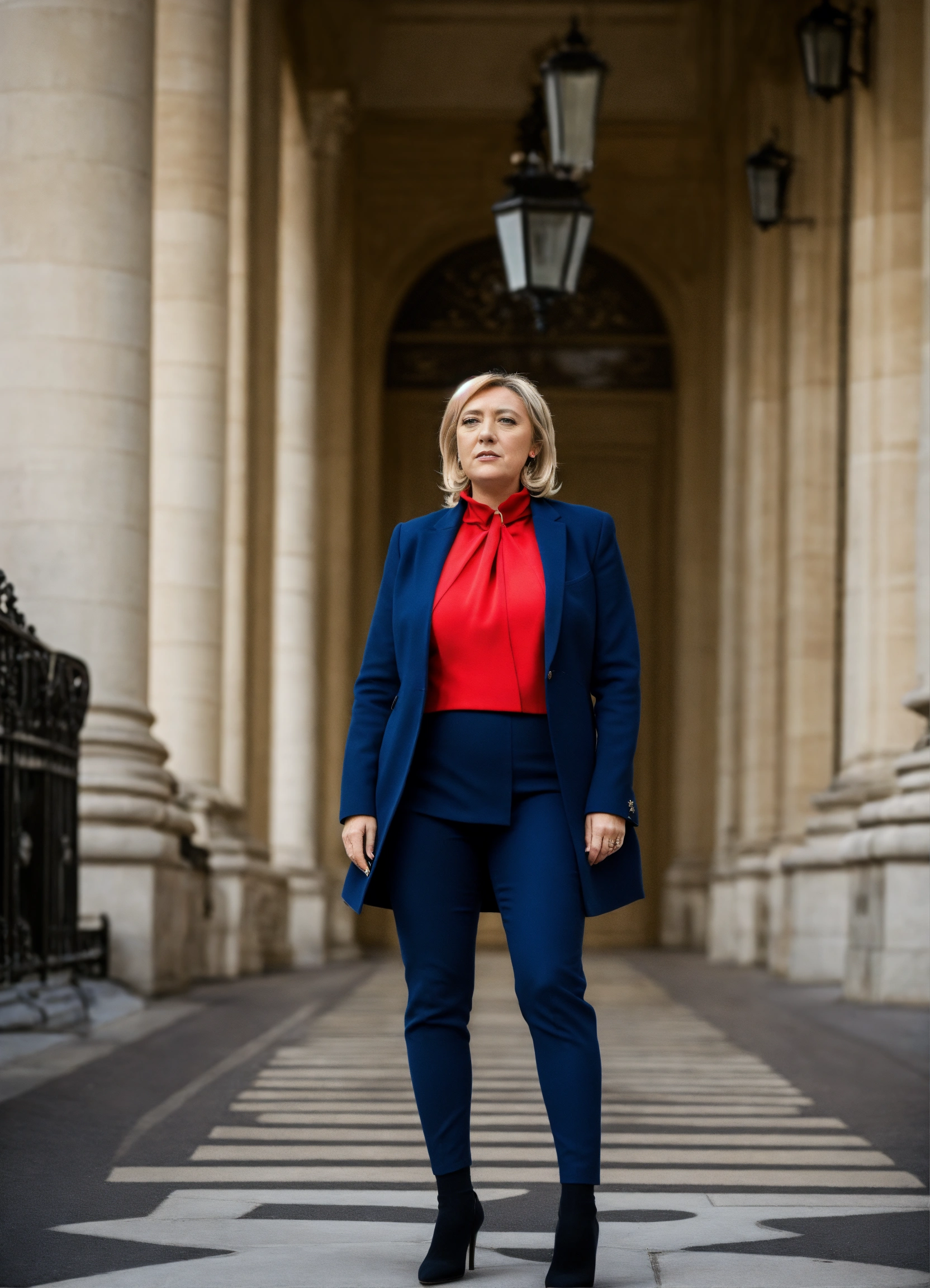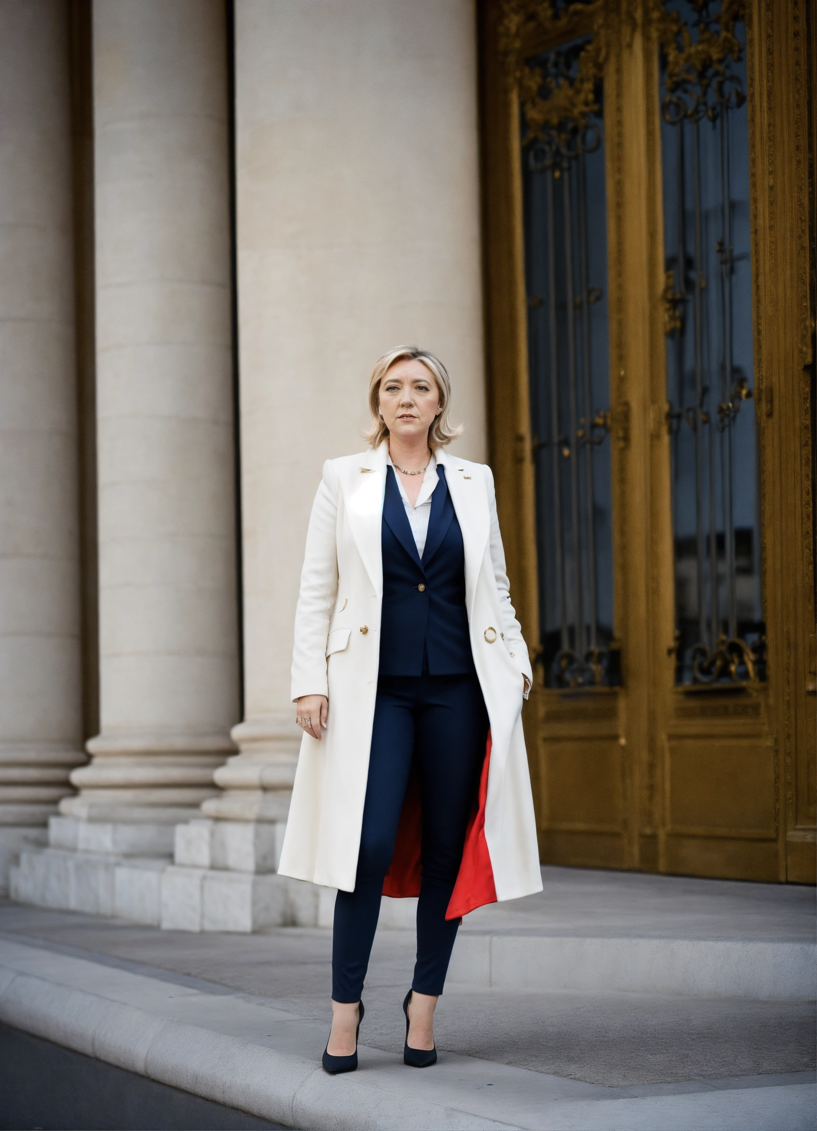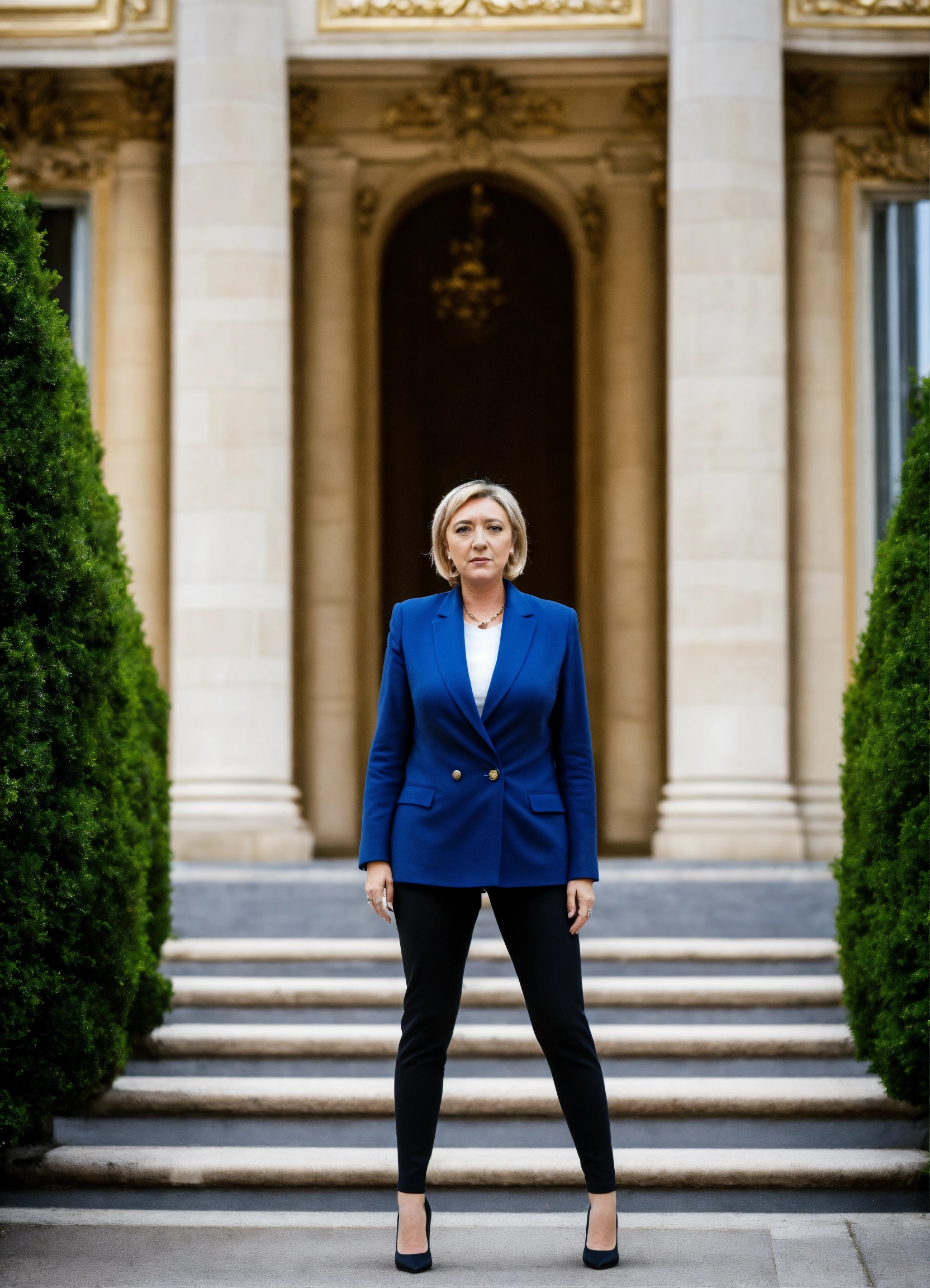 Full body photography of marine le pen in the front of the palais de l'elysée dressed in the style of emma stone incarnating cruella denfer, legging, low angle shot