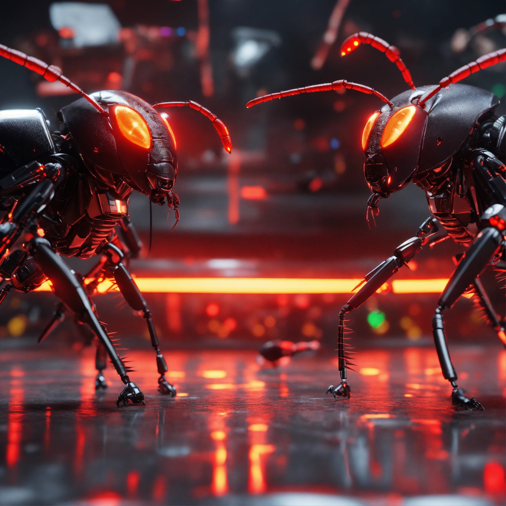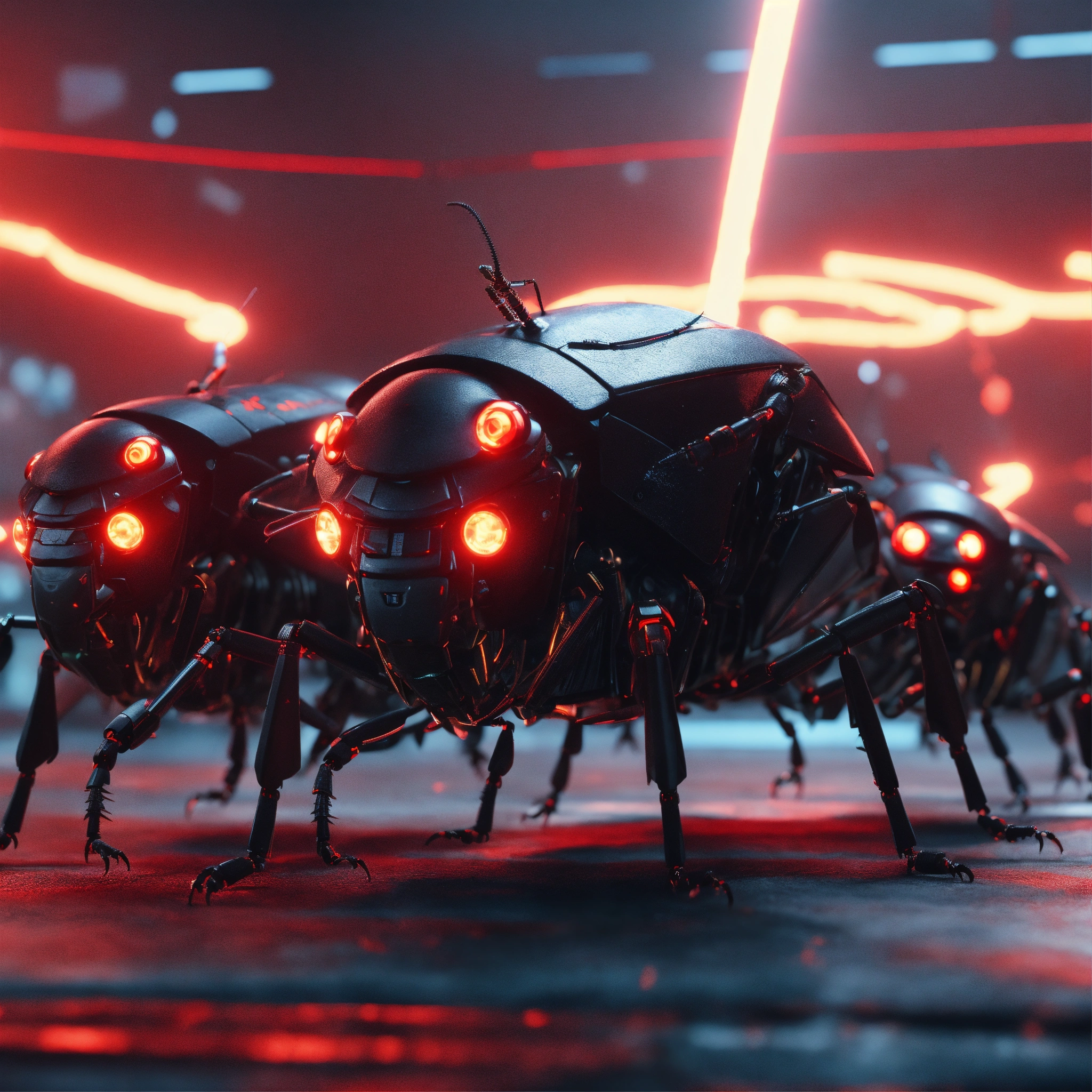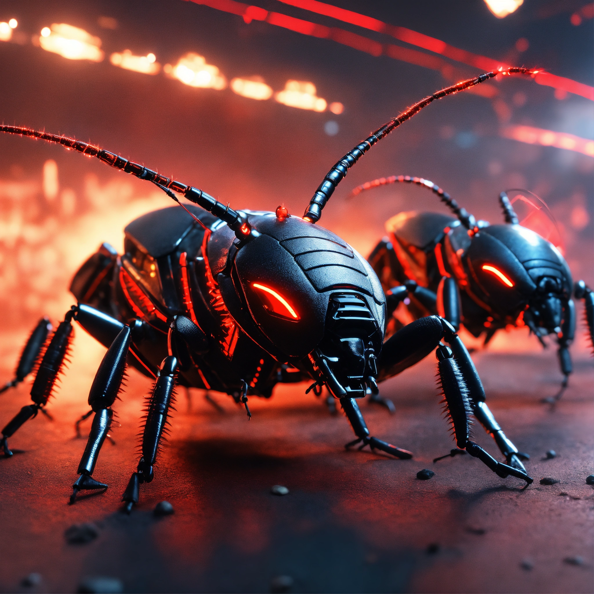 Zoom out shot of group of 3 cockroach faced black robotic humanoids with red glowing eyes, detailed circuit markings, standing up laughing and ready to attack, lightning bolts shoot from its antenna, realistic, 8k, unreal engine