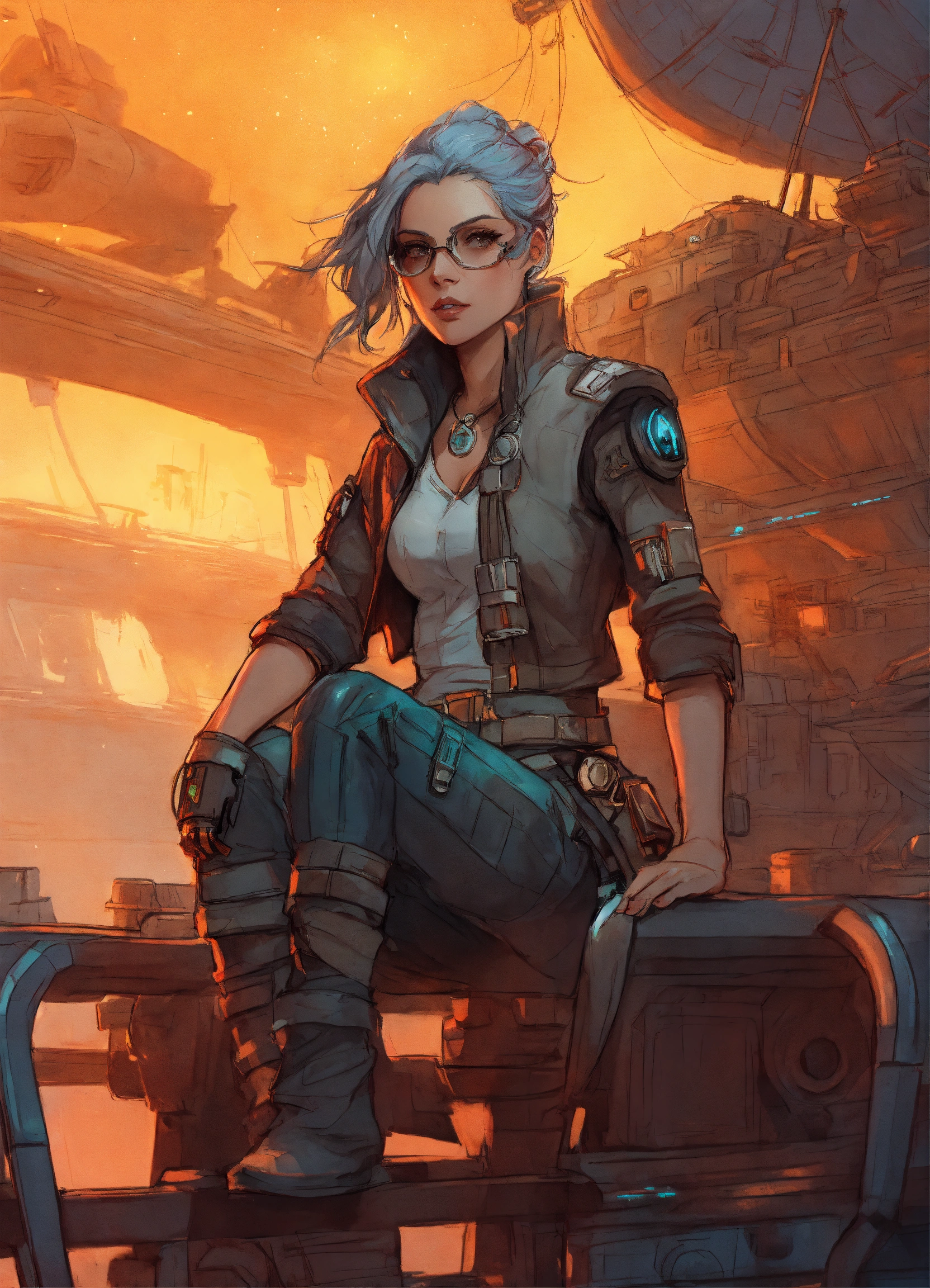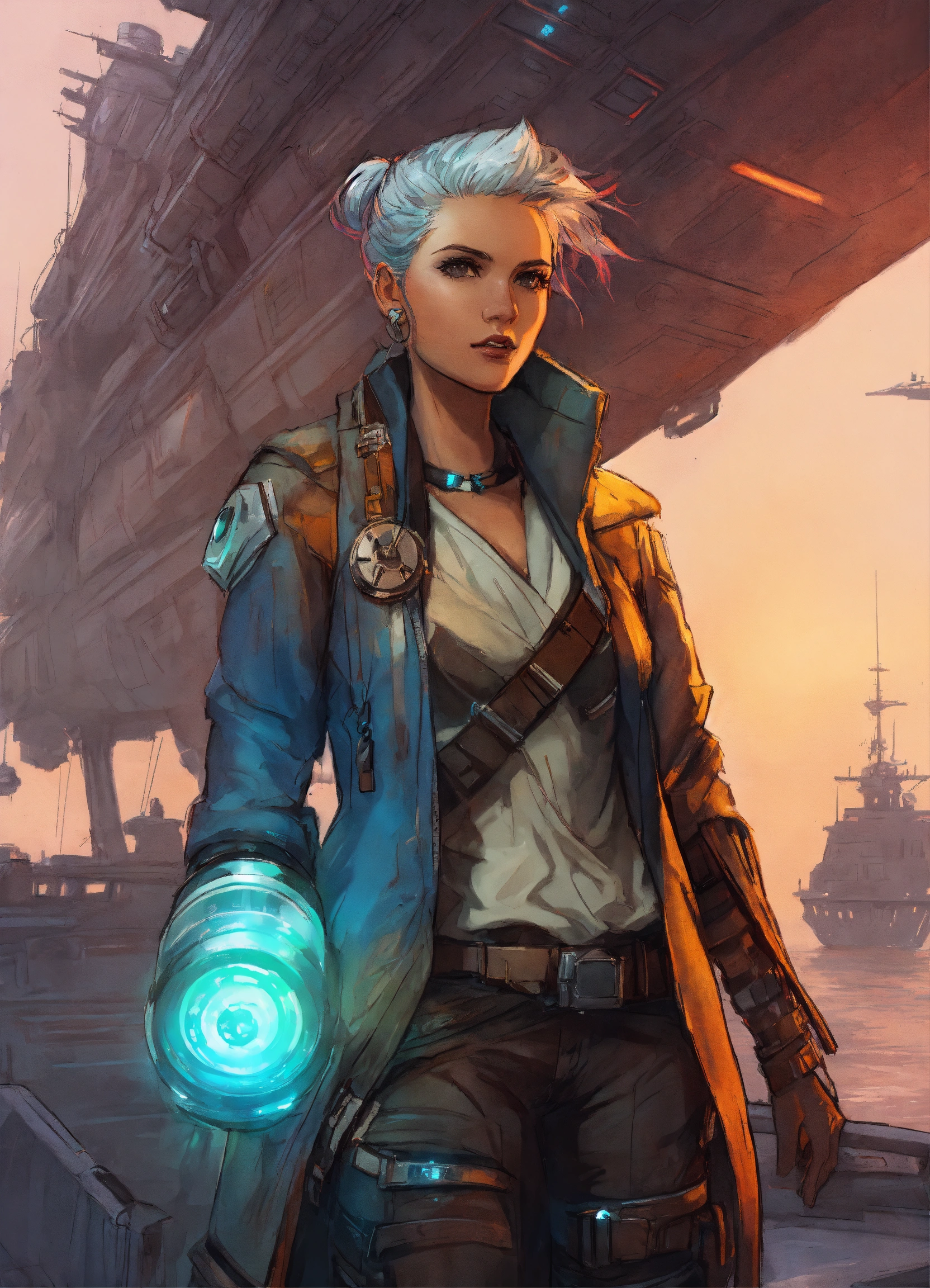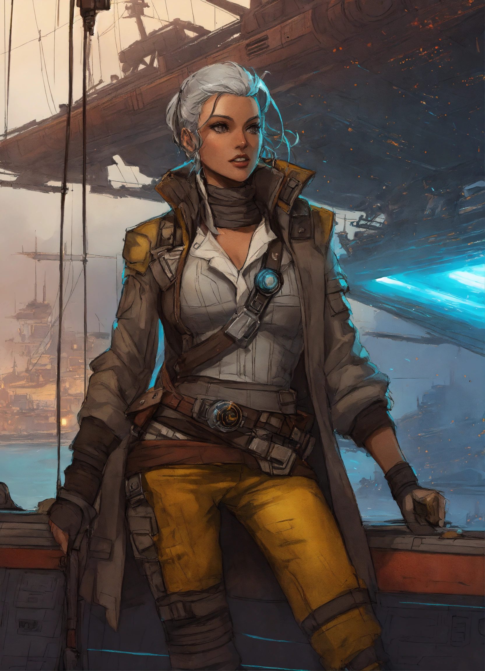 Sketched character art of a cyberpunk graying female pirate on a star wars ship