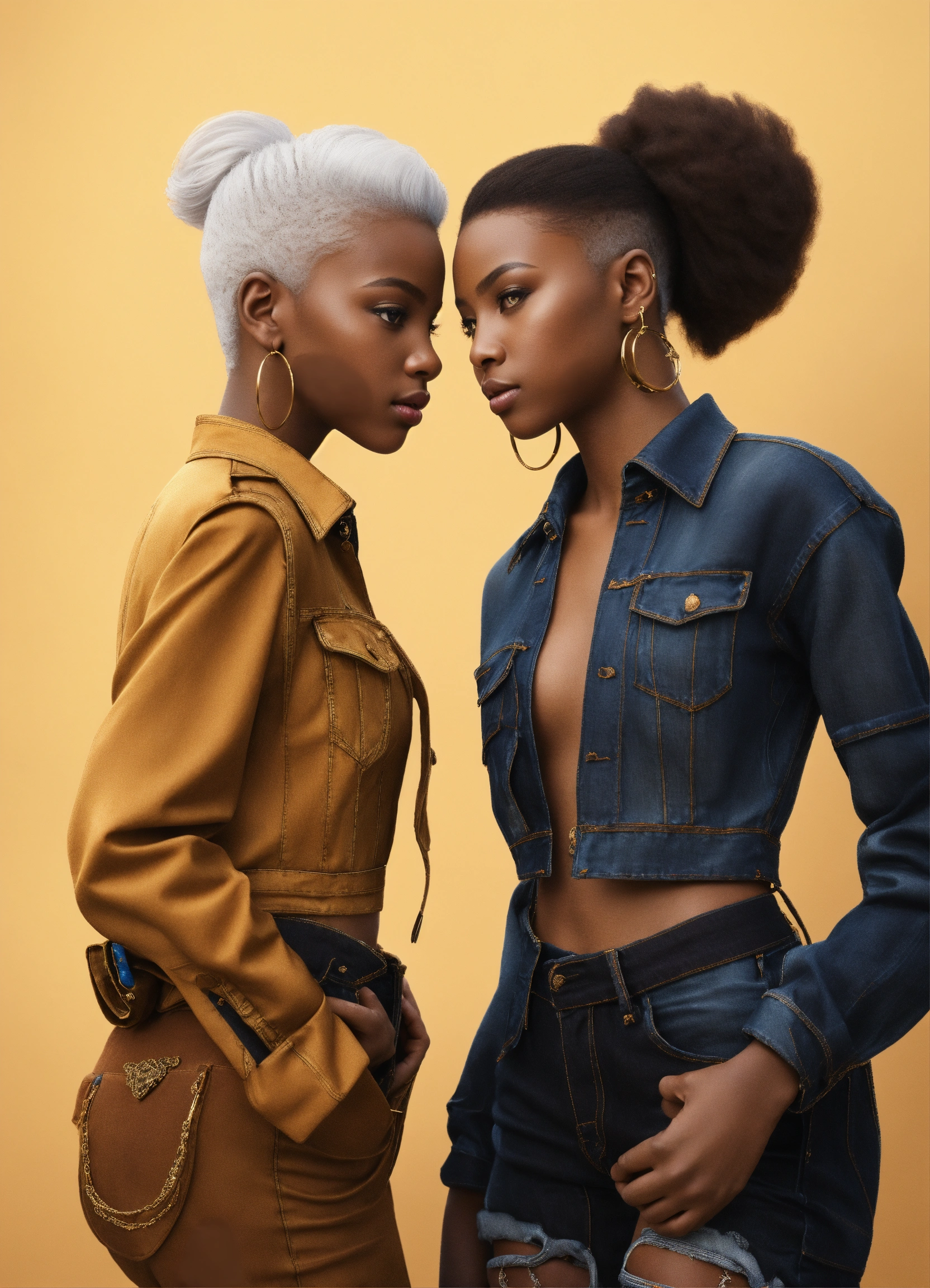 Pretty fraternal twins, twin 13-year-old, one twin white hair. african features, one twin brown-skin, black hair, in haute couture blouse, jeans, and boots. white background, persona. early morning, cinematic style, high detail, realistic physics, photorealistic, unreal engine, hdr, 8k