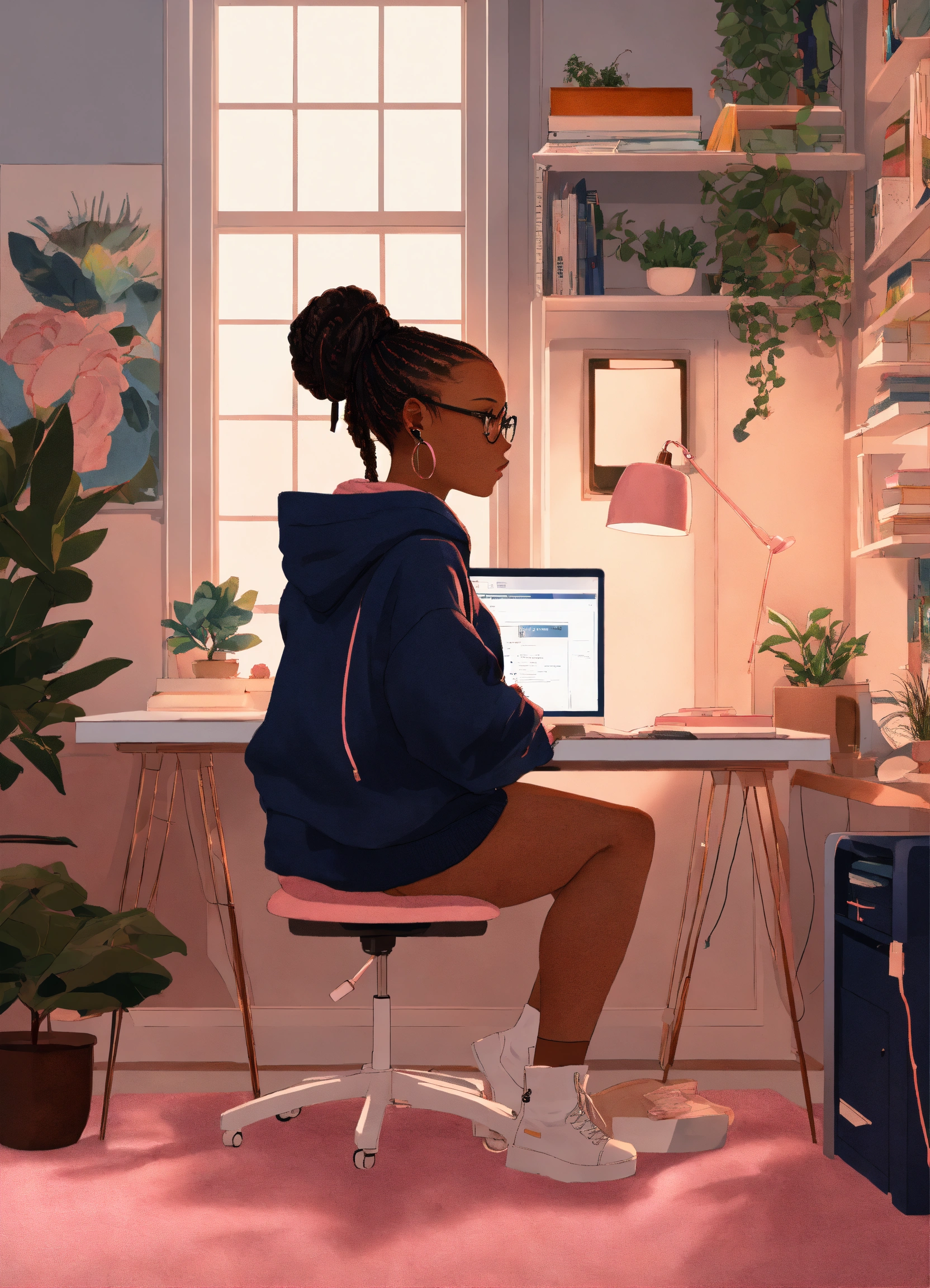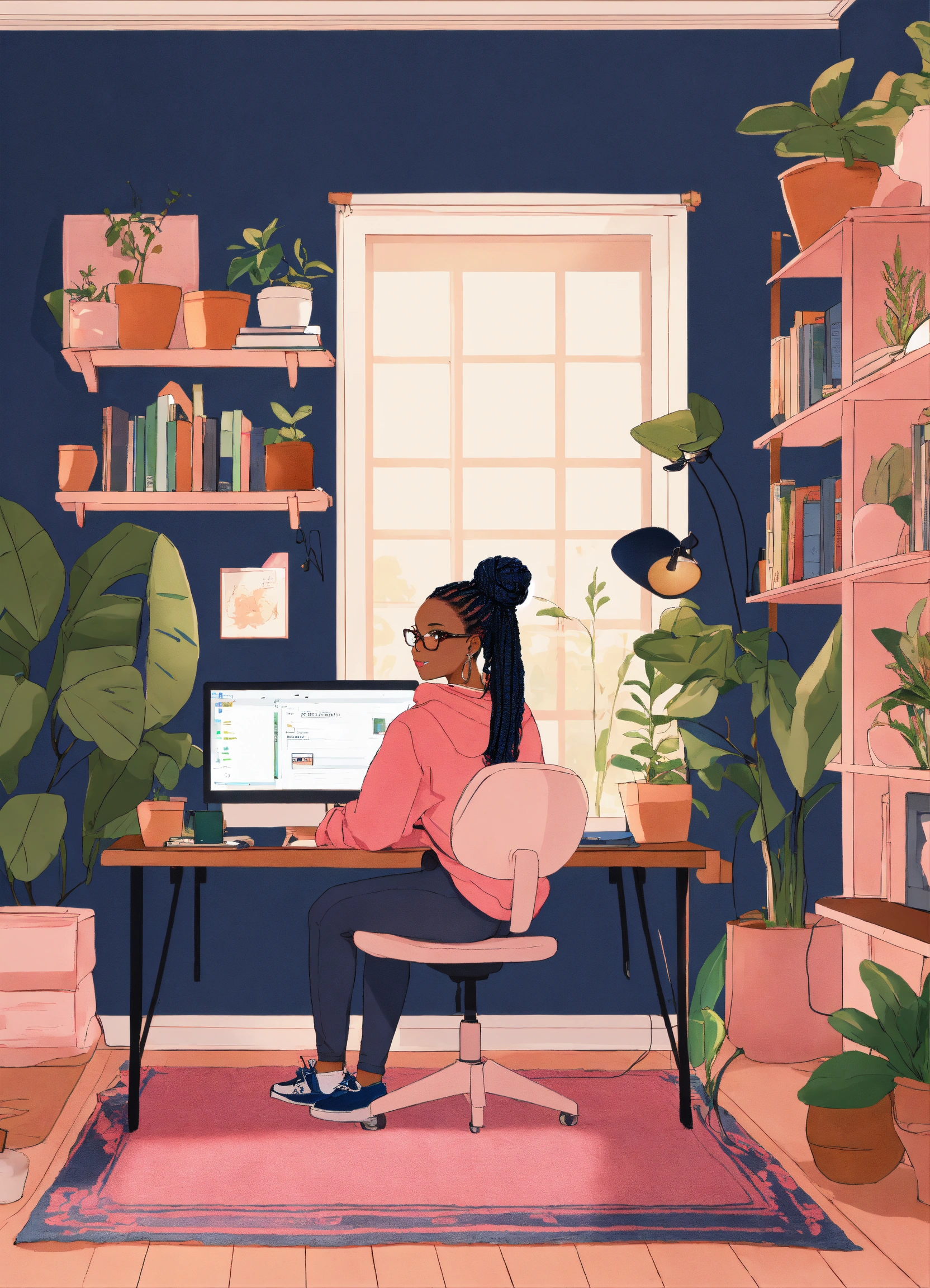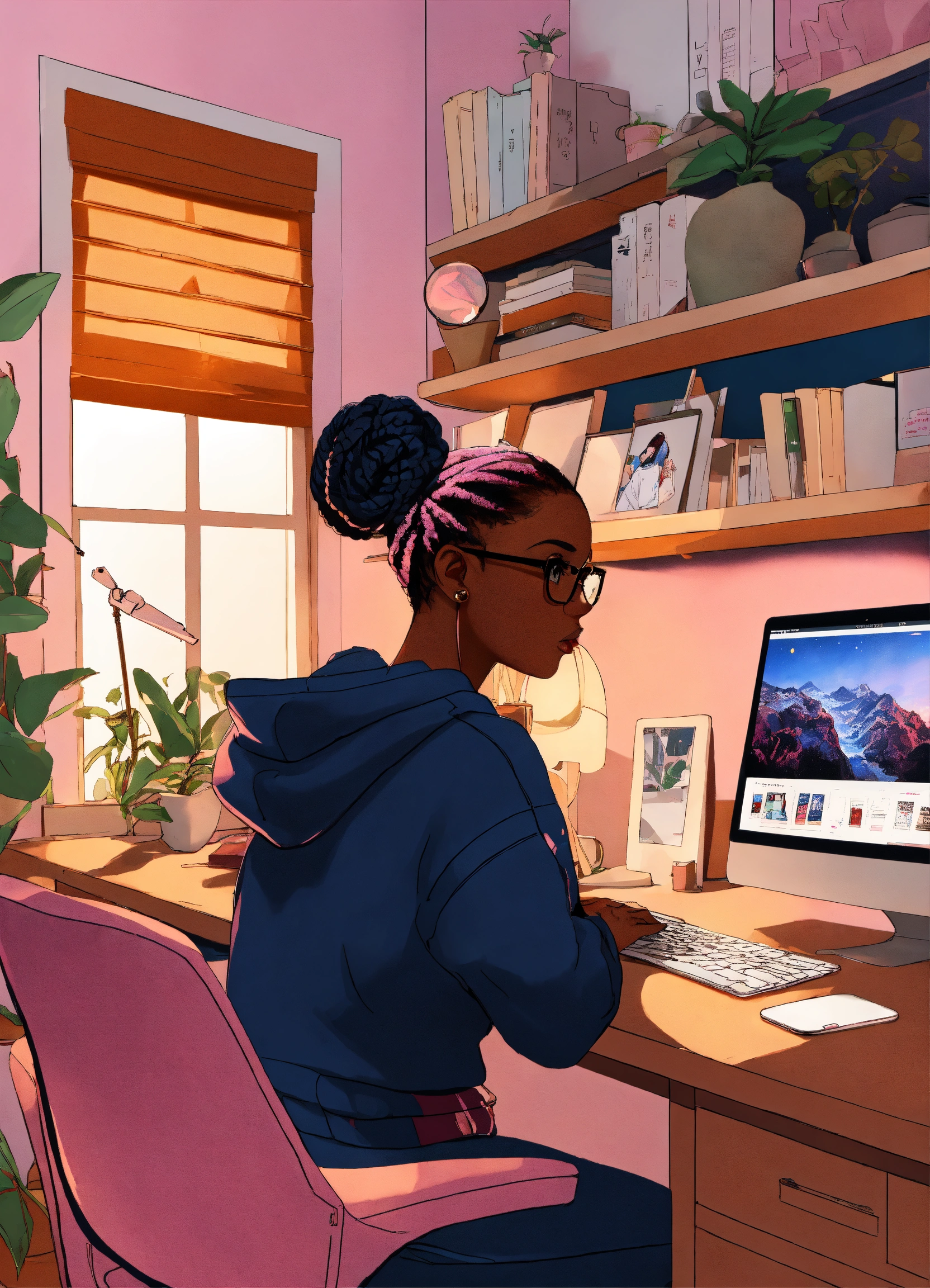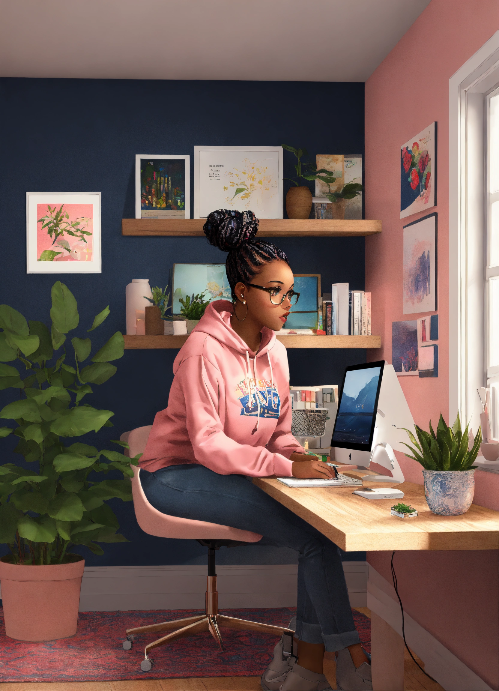 Create digital art of a black woman with box braids in a bun, and eyeglasses on. she is wearing a navy blue hoodie with the name “fsp design co”. on the back of her. she's sitting facing a white computer desk designing graphics. on the desk is a computer with double monitors and a pink ipad. a pink rug is on the floor underneath the desk and there is a white bookshelf against the wall behind the desk. on the bookshelf are a variety of books, plants, and a navy blue vase. the overall mood of the space is cozy and inviting. the overall mood of the space is cozy and inviting.