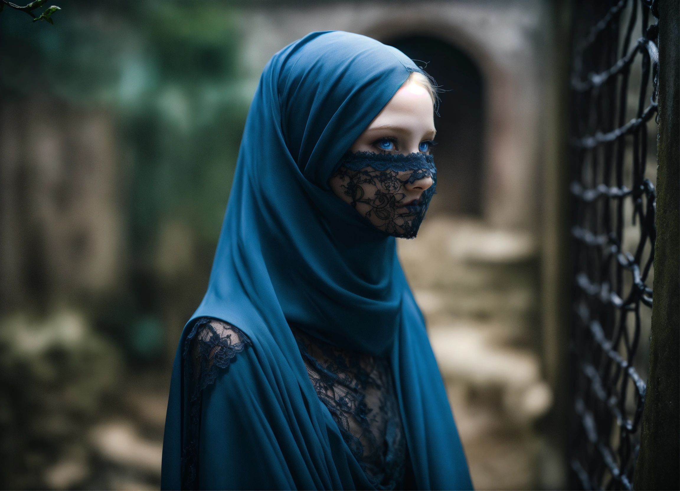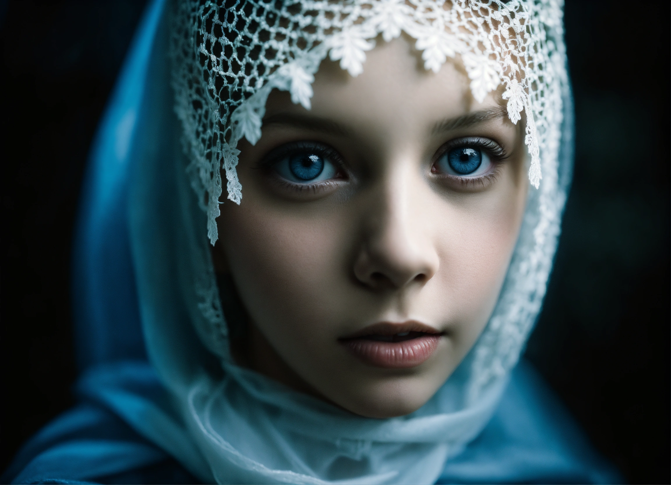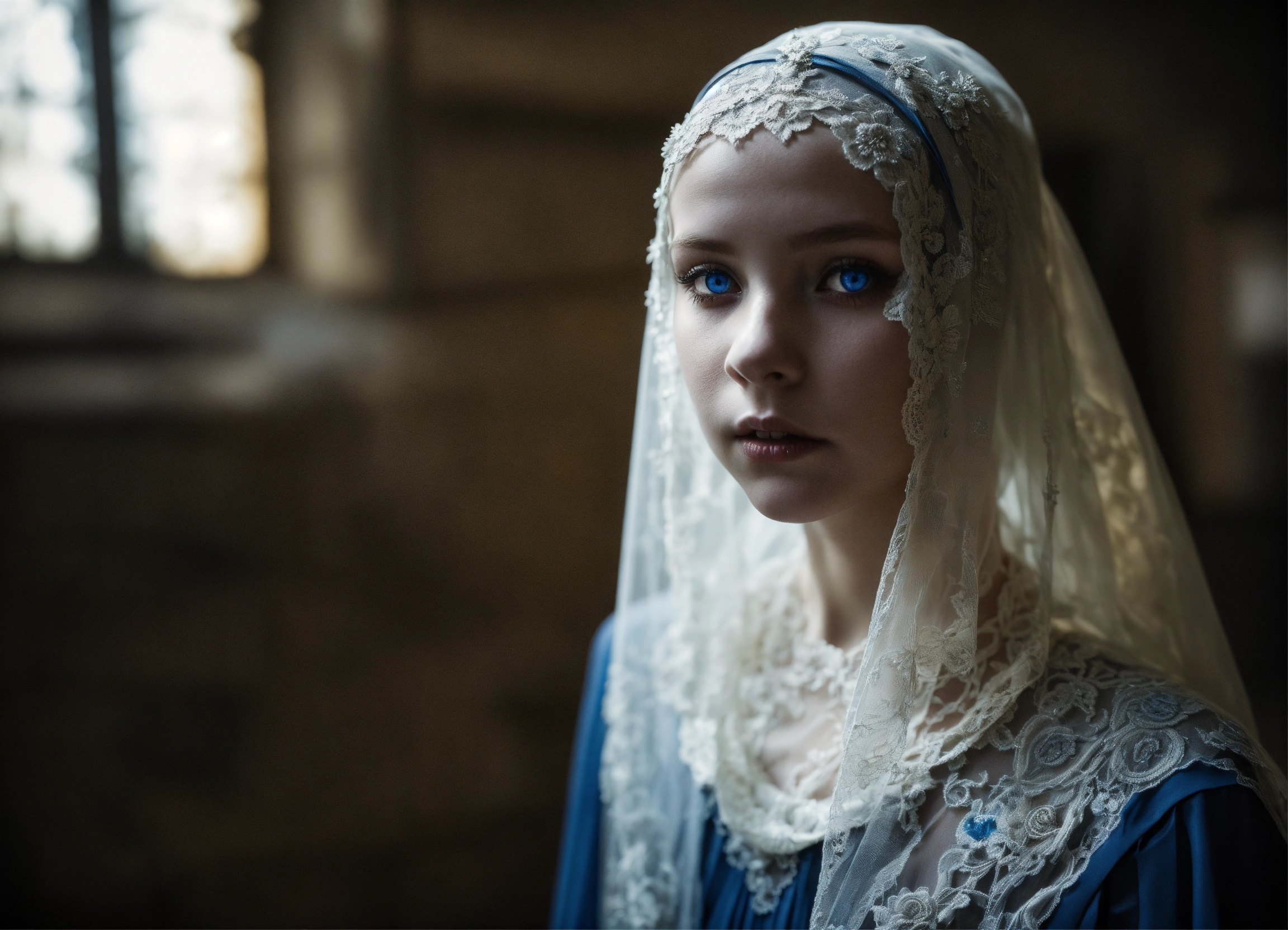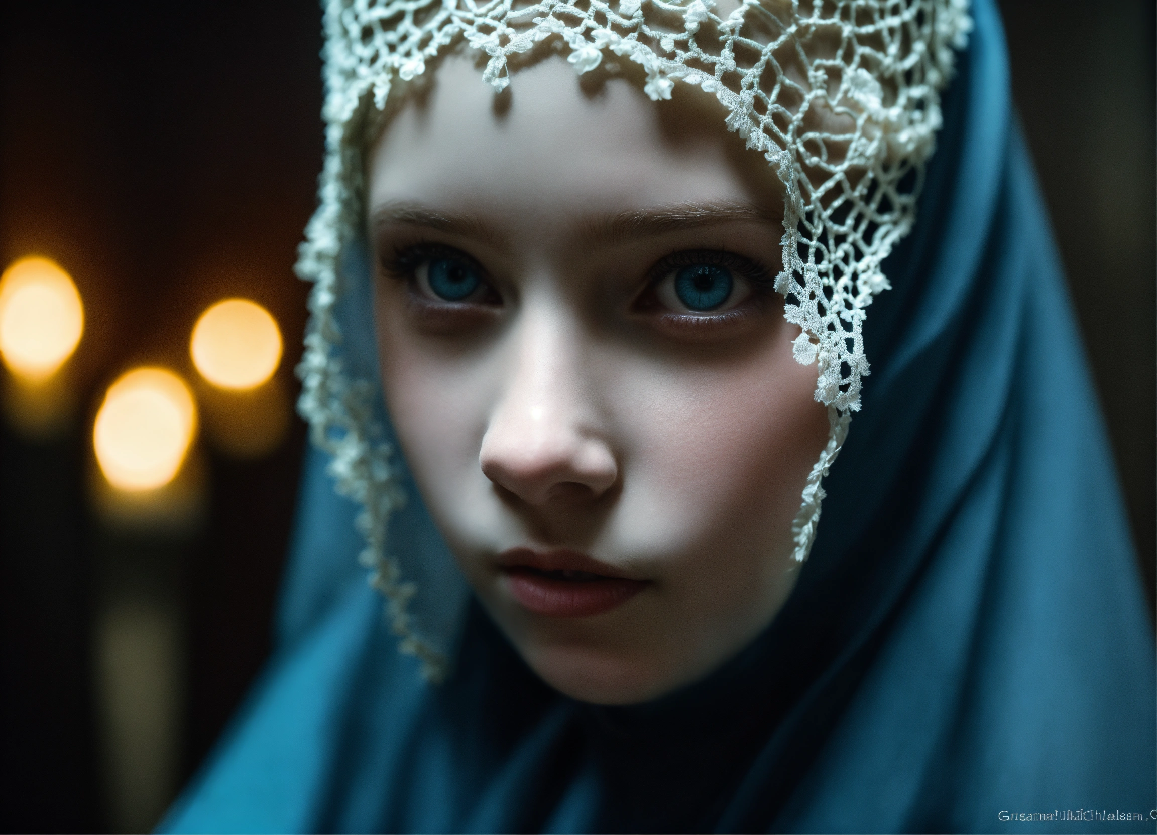 Body portrait of a very childish deadly pale ultra slim twelve year old female child with a lace niqab and a face veil, she is a goth necromancer with waist long silverwhite hair, face veil, tight-fitting clothing, blue eyes are glowing, very flat belly, ultra skinny, very slim body, emaciated body, completely emaciated, ultra narrow face, alabaster skin, pale as a corpse, ultra slim face, innocent looking, in a gloomy crypt, lasziv, kindlich, unschuldig, childlike, graceful, wispy, glowing blue eyes, ghostly, dead, evil, demonic, undead, darkness, grotesque, mysterious, dark, cold ambient lighting, extremely detailed, fantasy, medieval setting