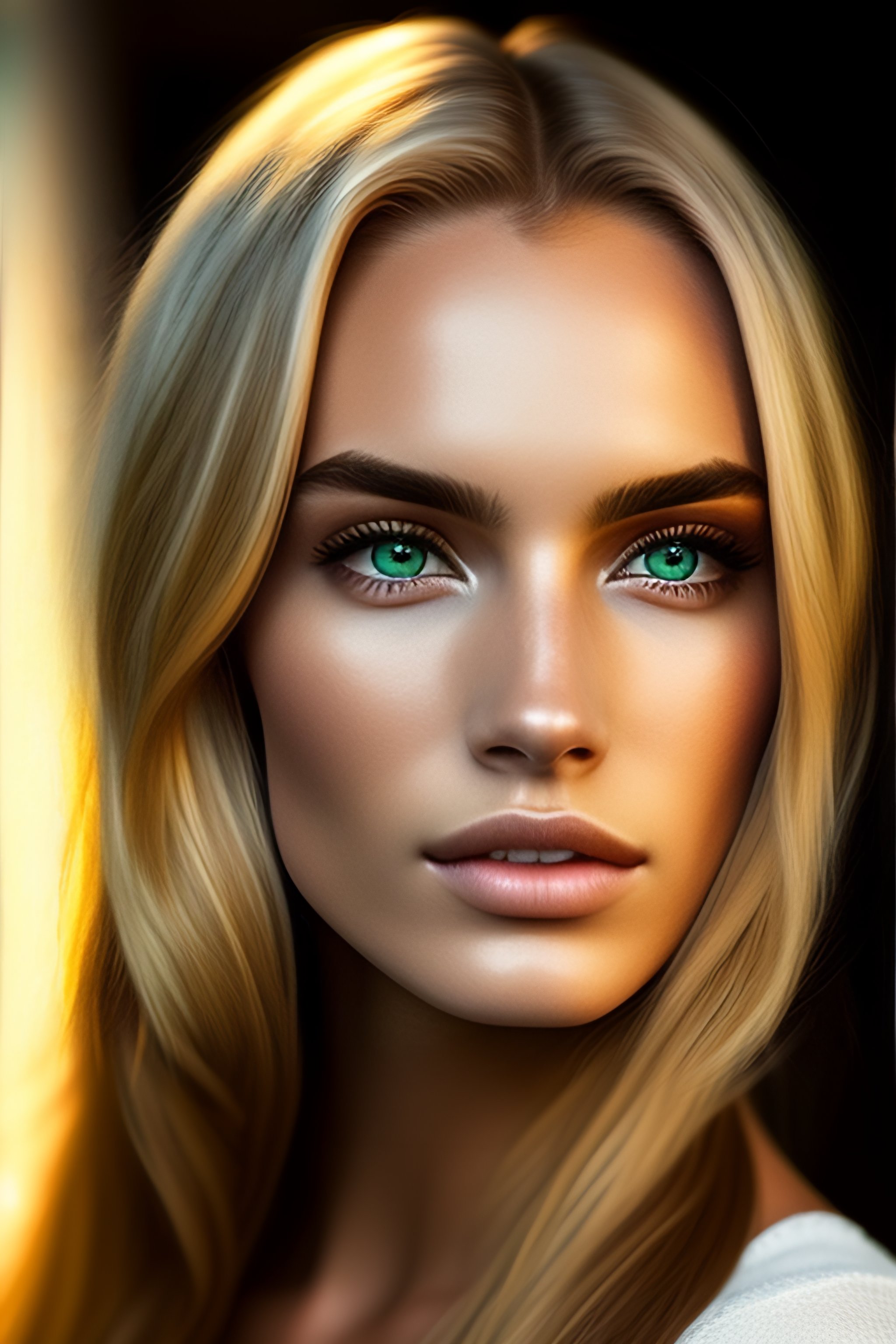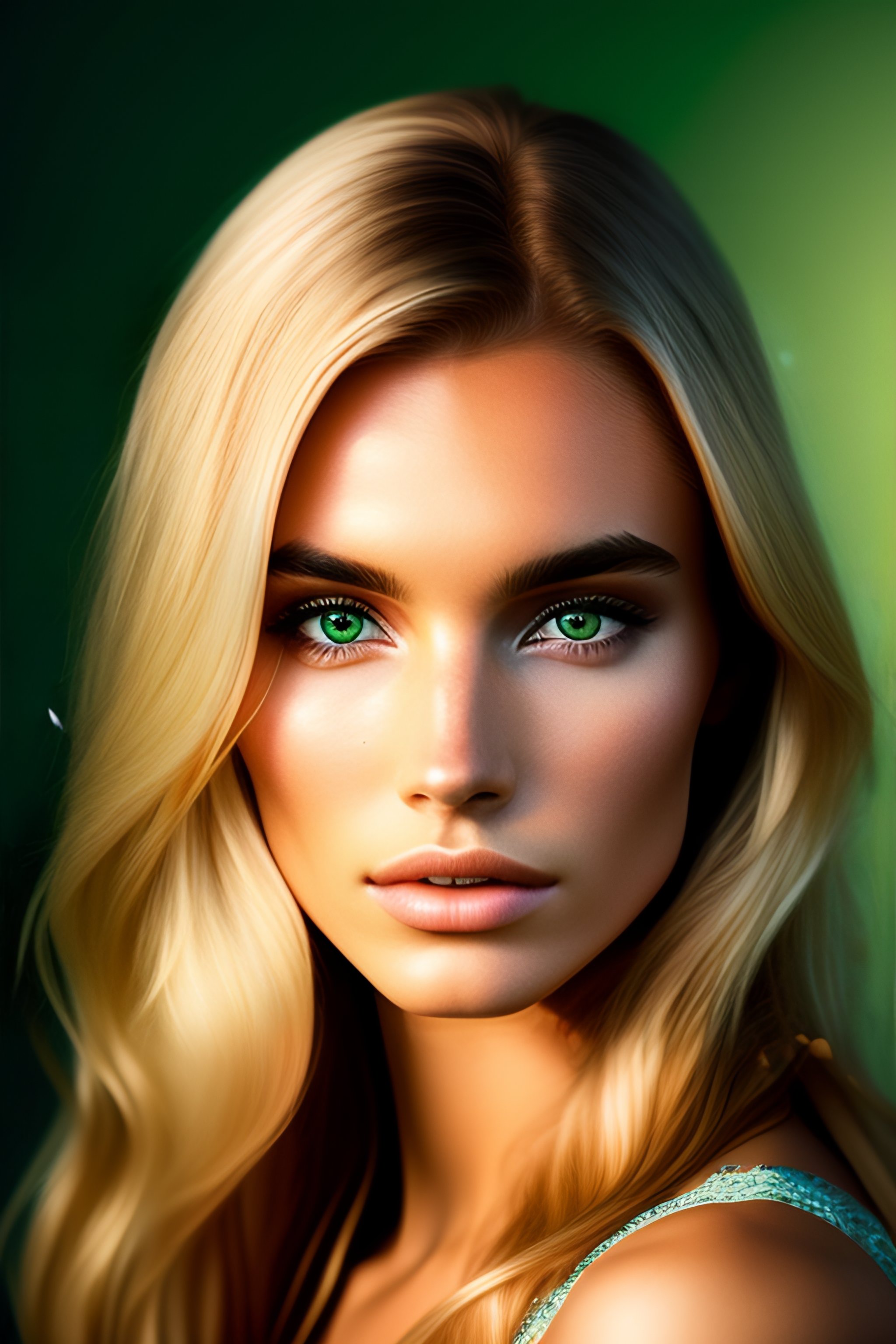 Brunette with long dyed blonde hair, 21 years old, 165 cm tall, round shaped face, big forehead, lop eared, thin eyebrows, emerald eyes, darker skin, real life photograph