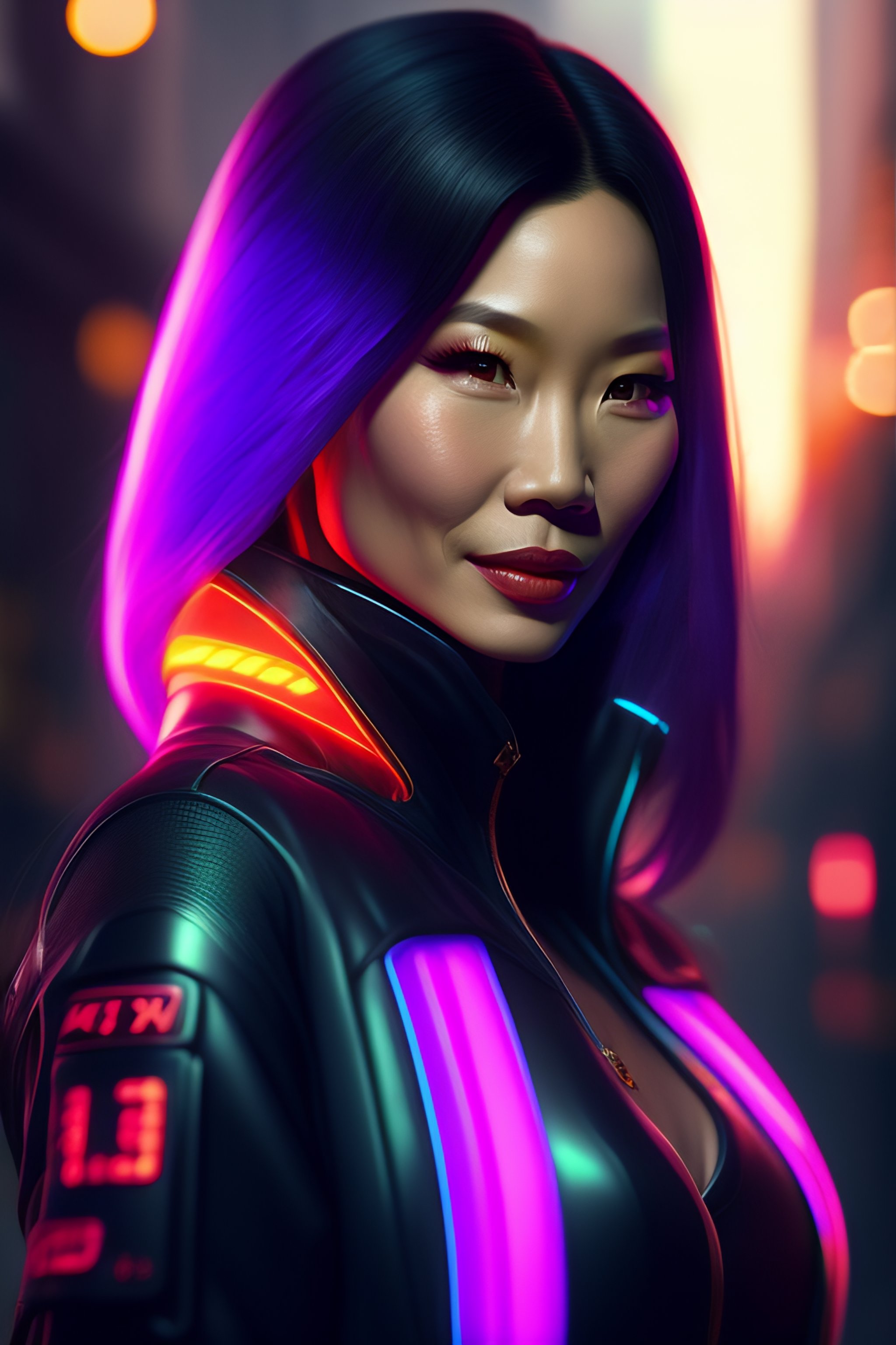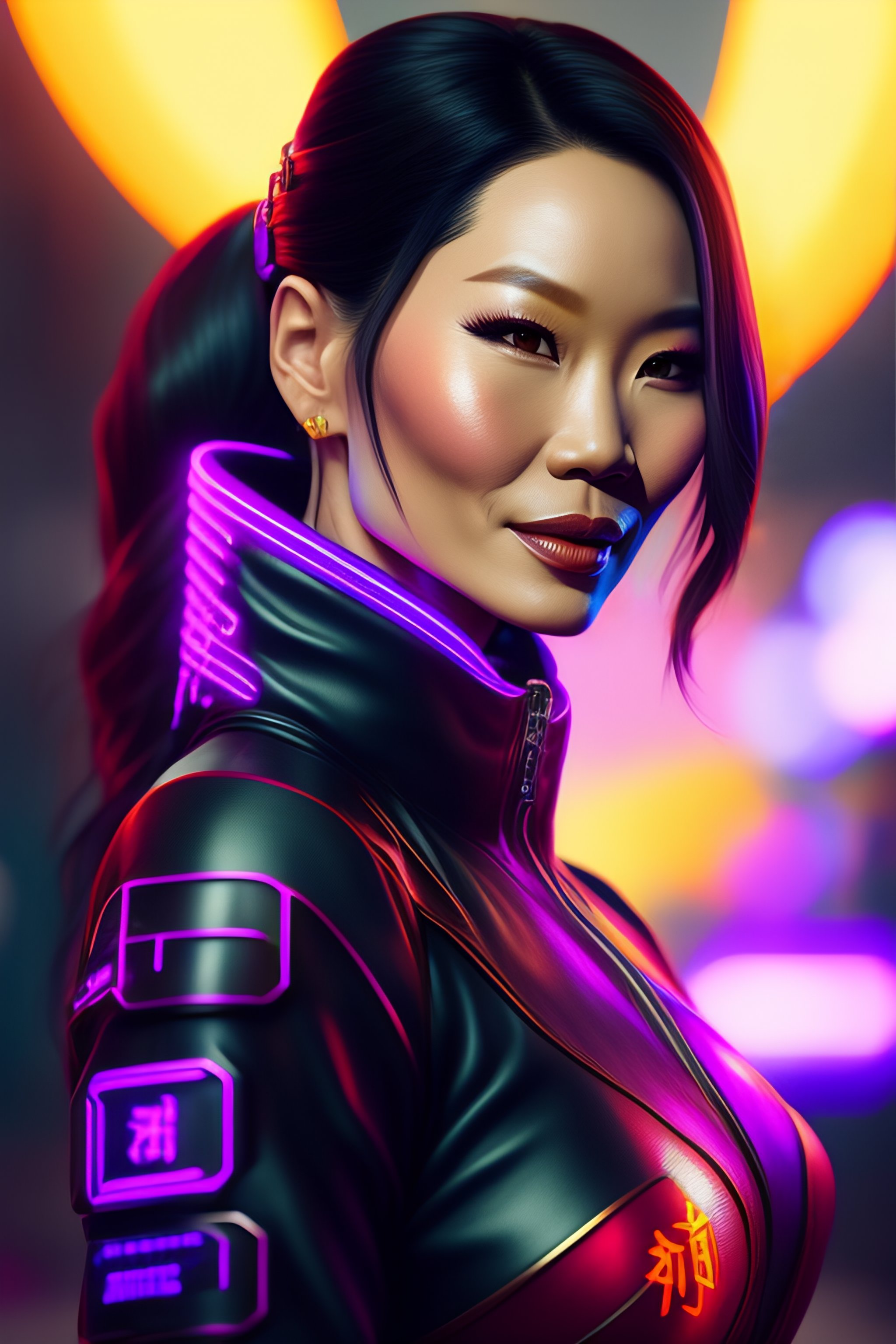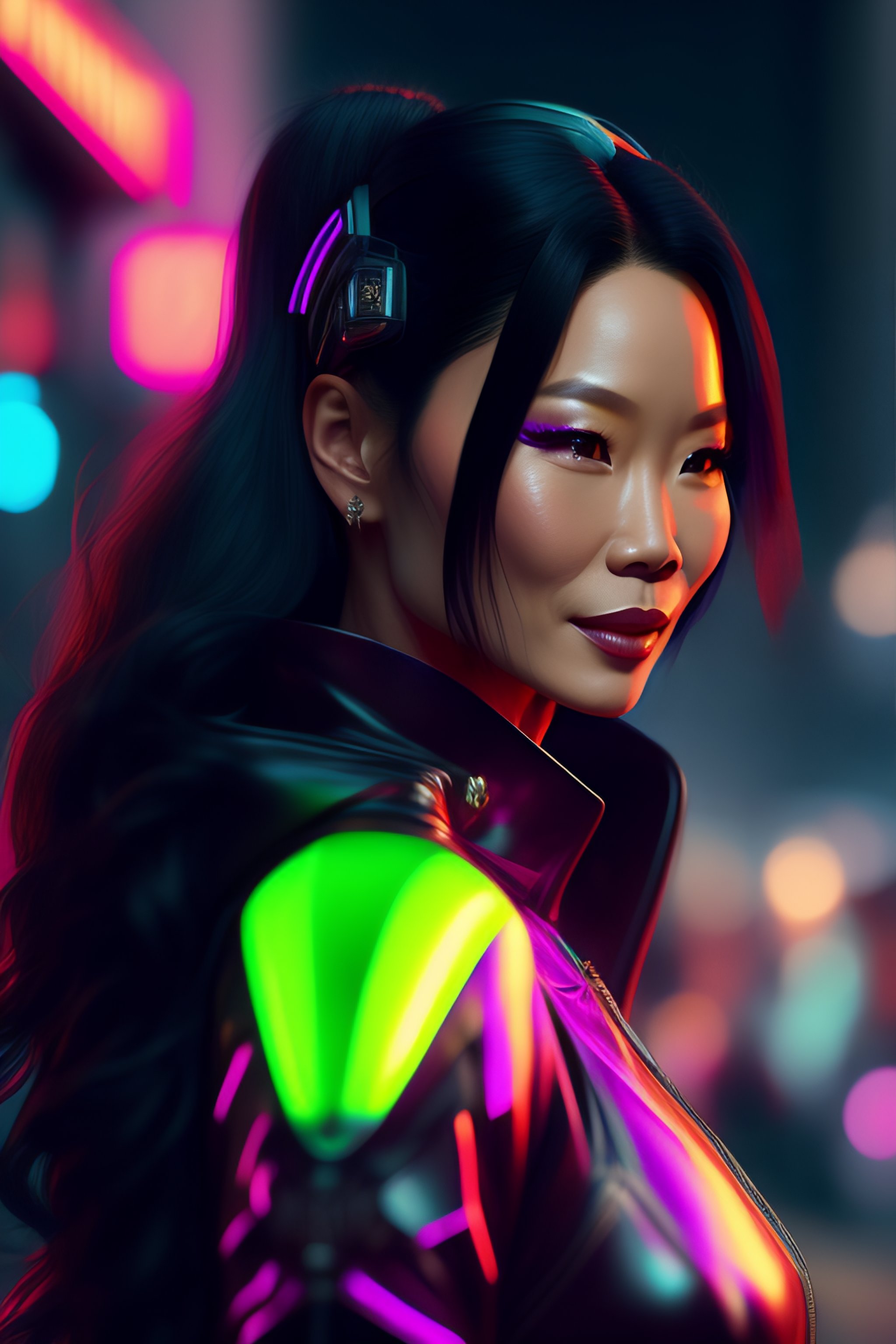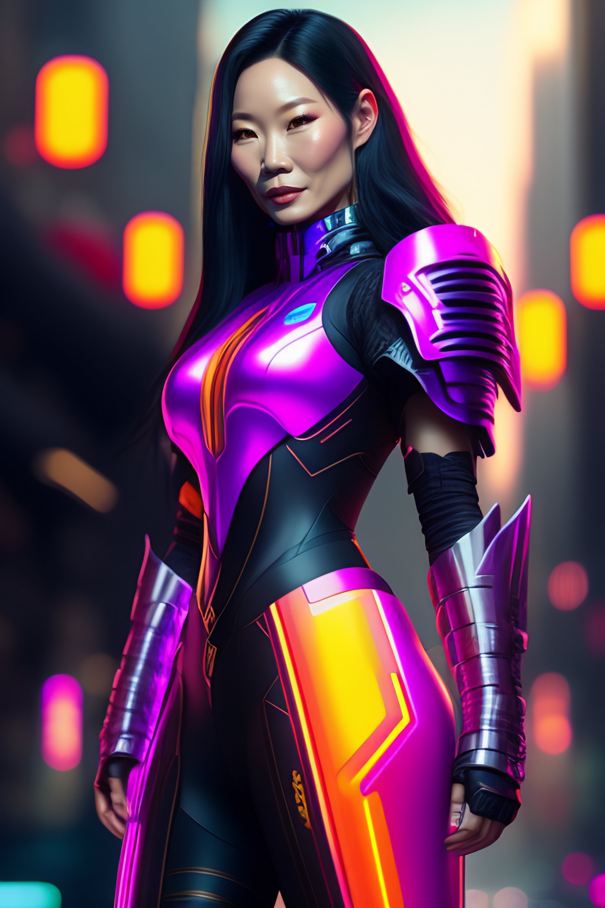 Lucy liu as an cyberpunk wearing a neon armor running away from a flock of black leaves, made by artgerm stanley lau, wlop, rossdraws, artstation, cgsociety, concept art, cgsociety, octane render, trending on artstation, artstationhd, artstationhq, unreal engine, 4k, 8k