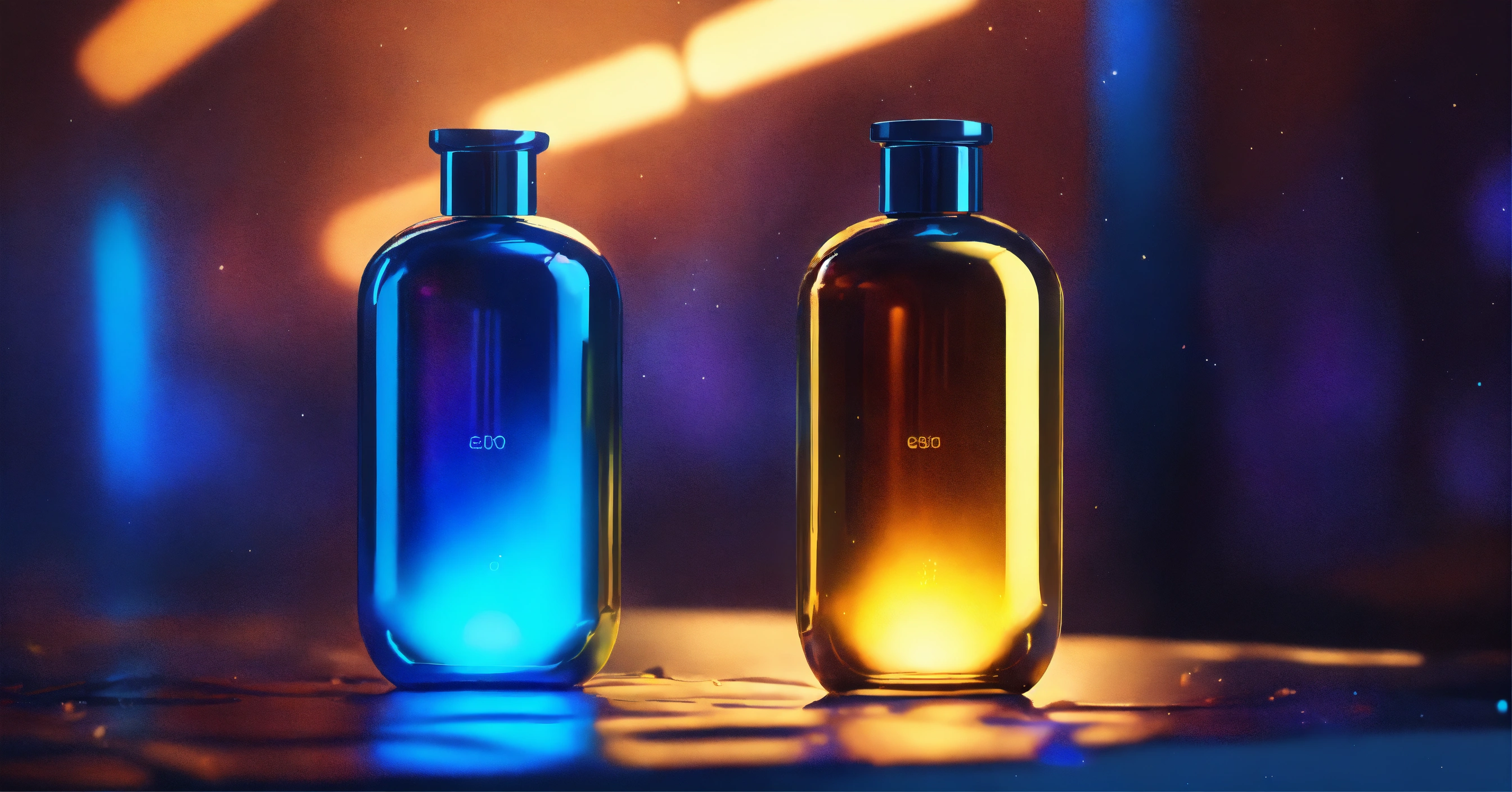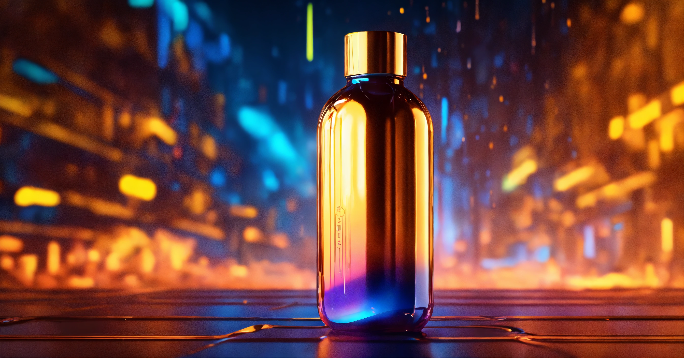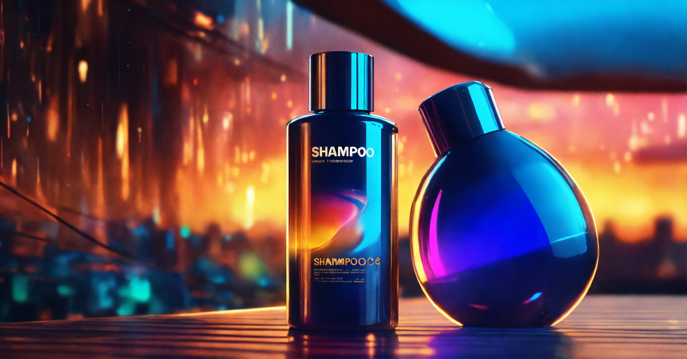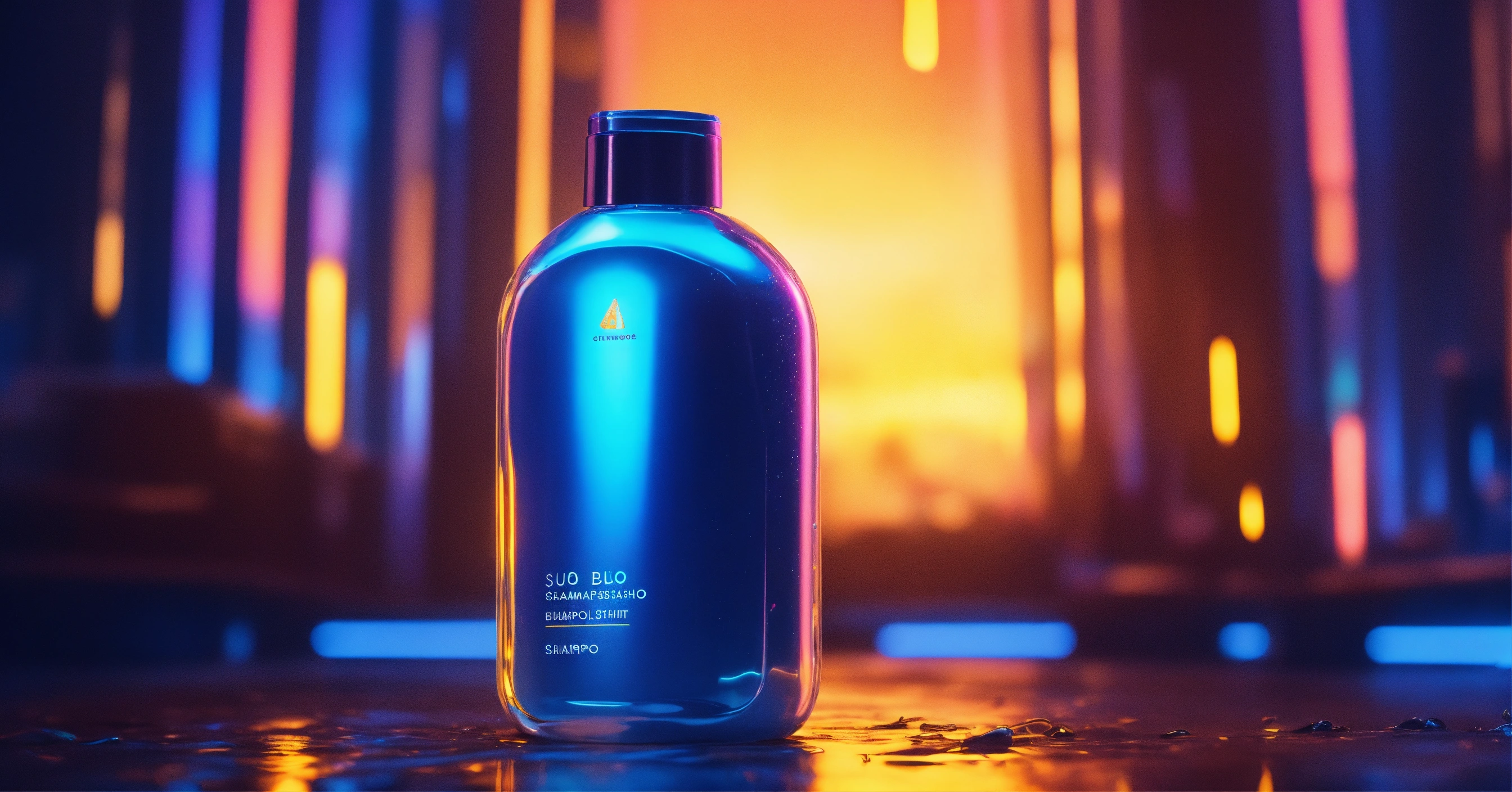 Shampoo bottle with glowing light effect and metallic splash. abstract futuristic colorfull beauty ptoduct. amber cartoon modern minimalistic, sunset colors, blue color, cyberpunk vertical bottle yellow simple low details