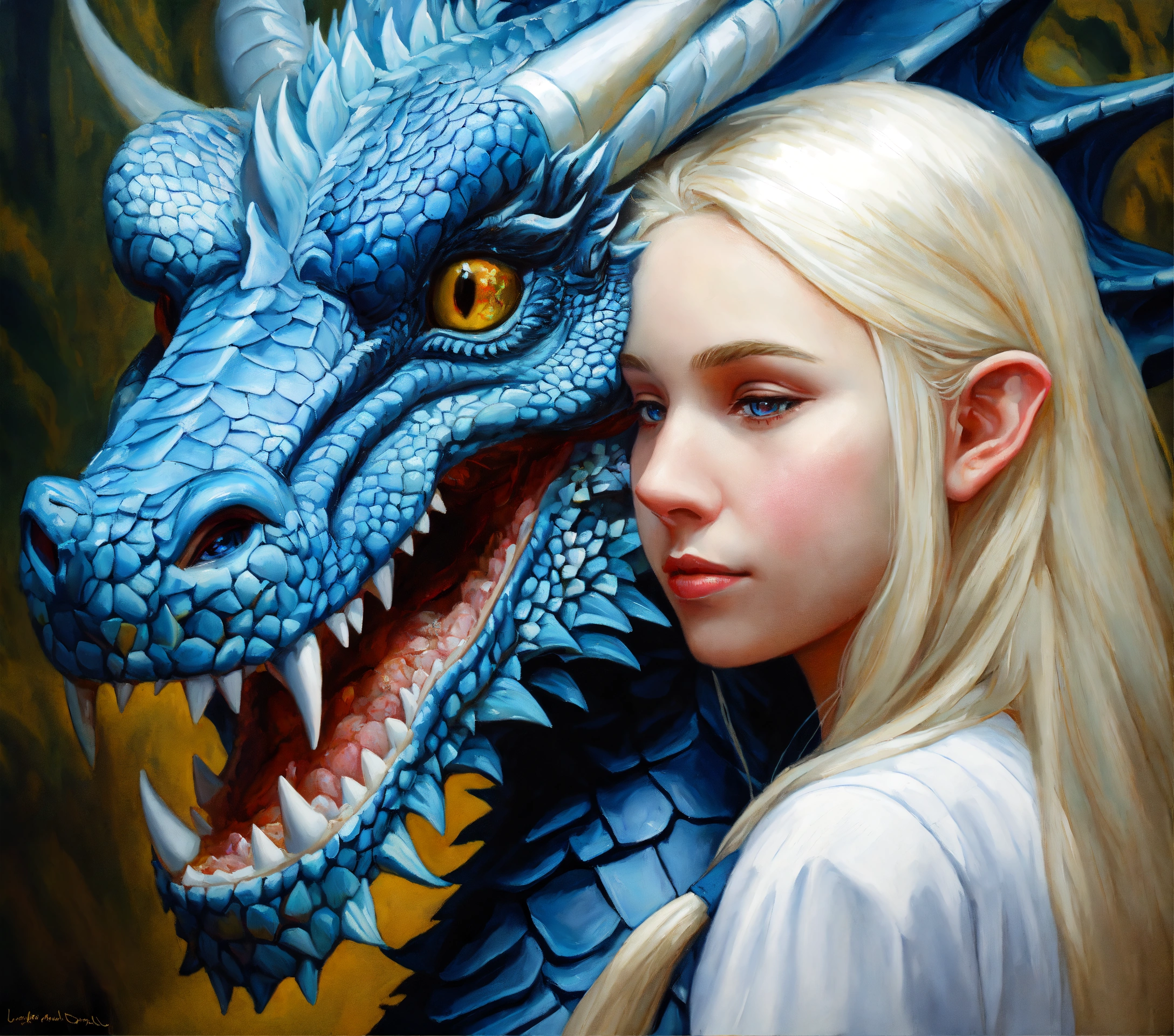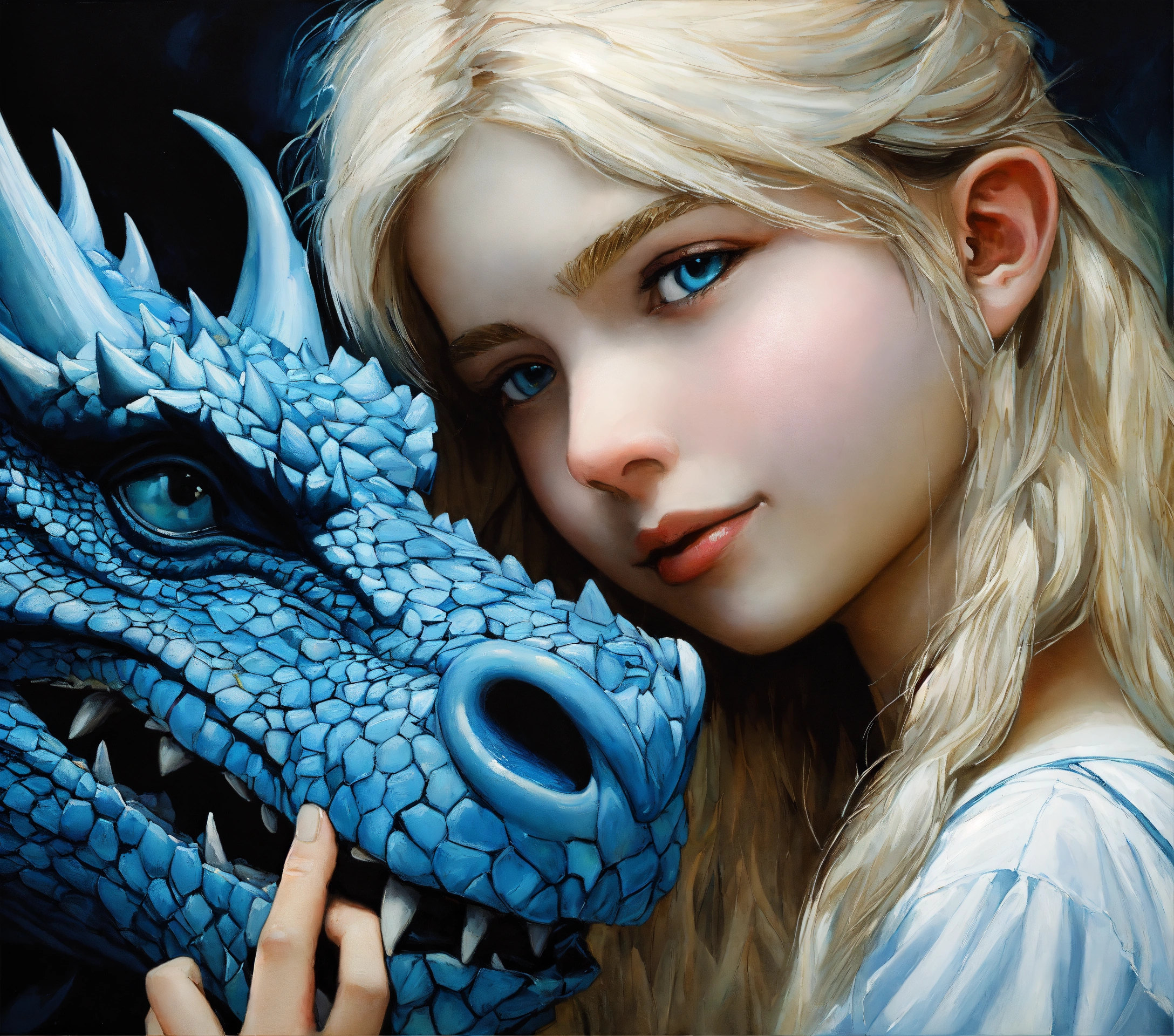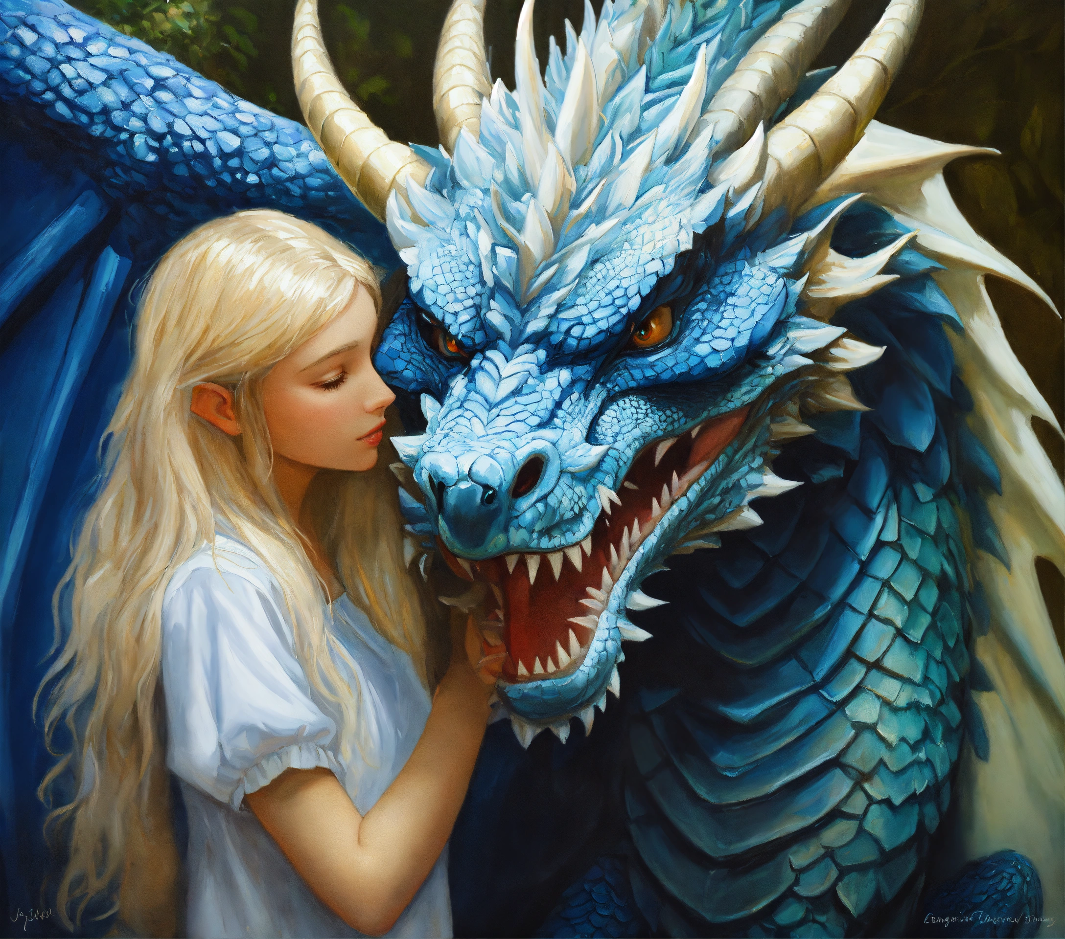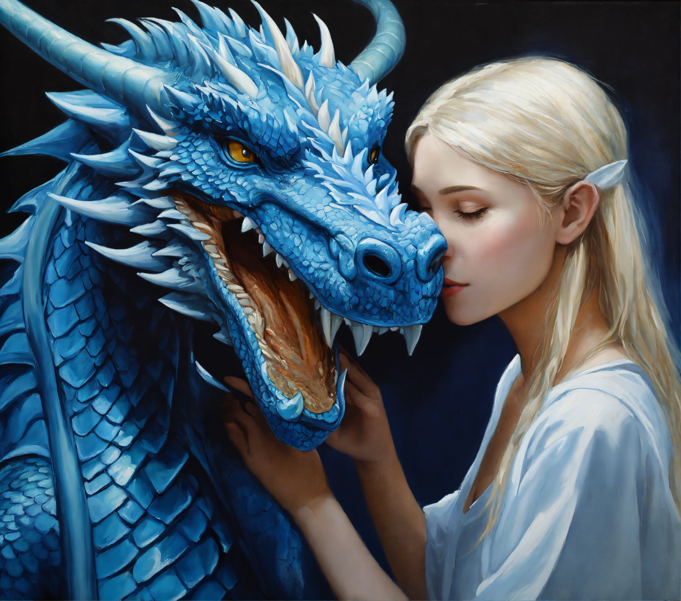 Oil painting of a huge, magnificent blue dragon head with a 15 year old white blonde elf girl lovingly hugging the dragon head, the dragon's head is as big as the entire girl, ultra detailled, ultra realistic