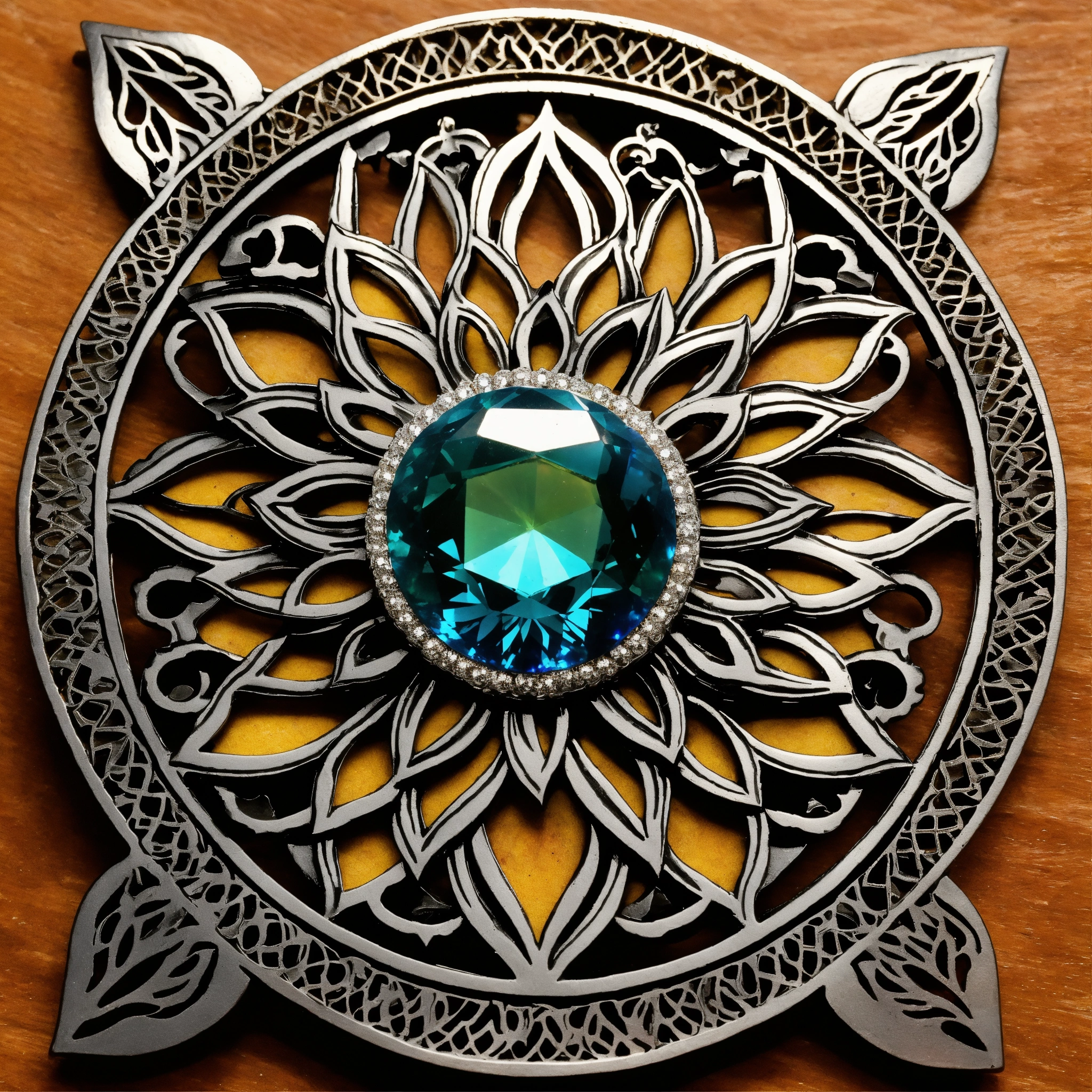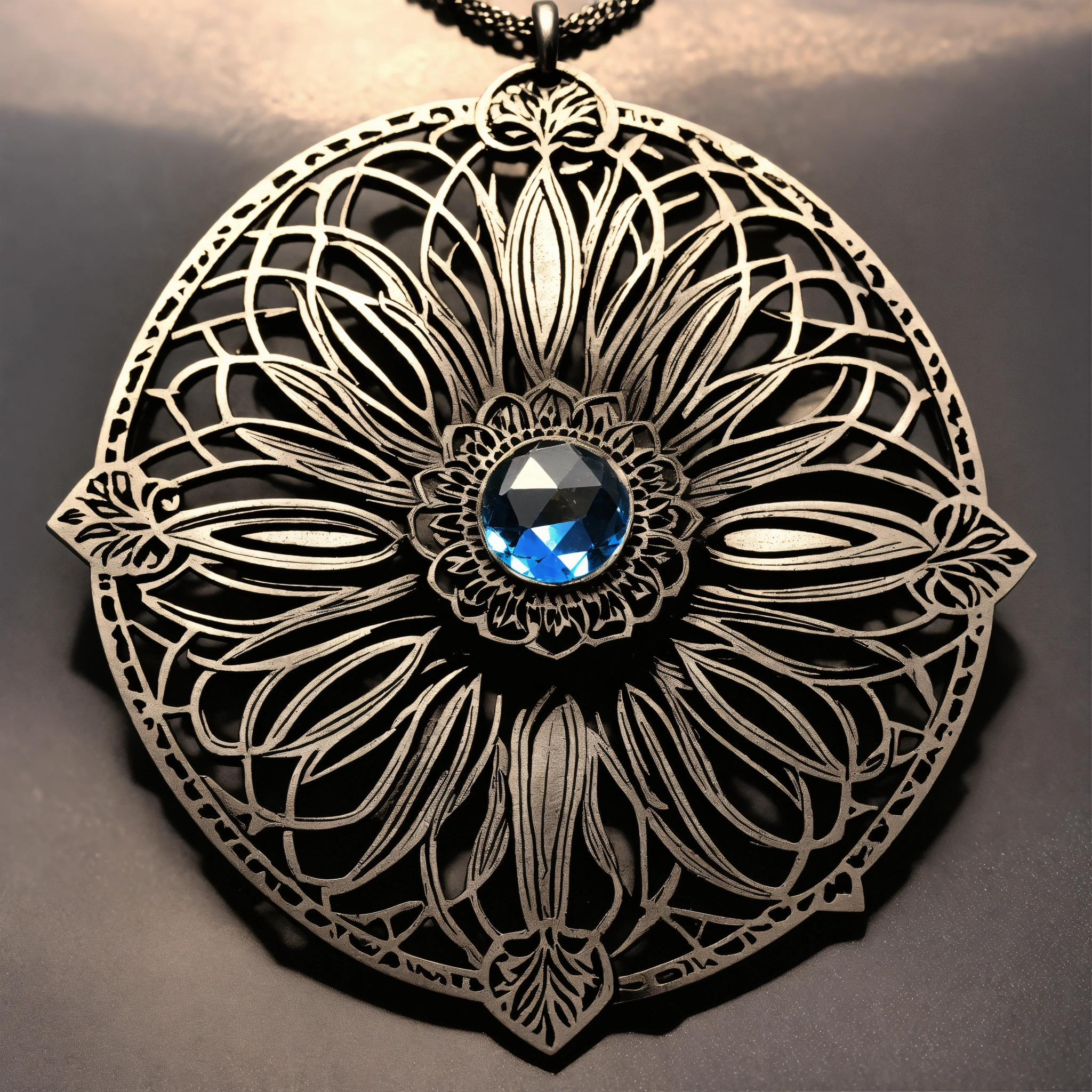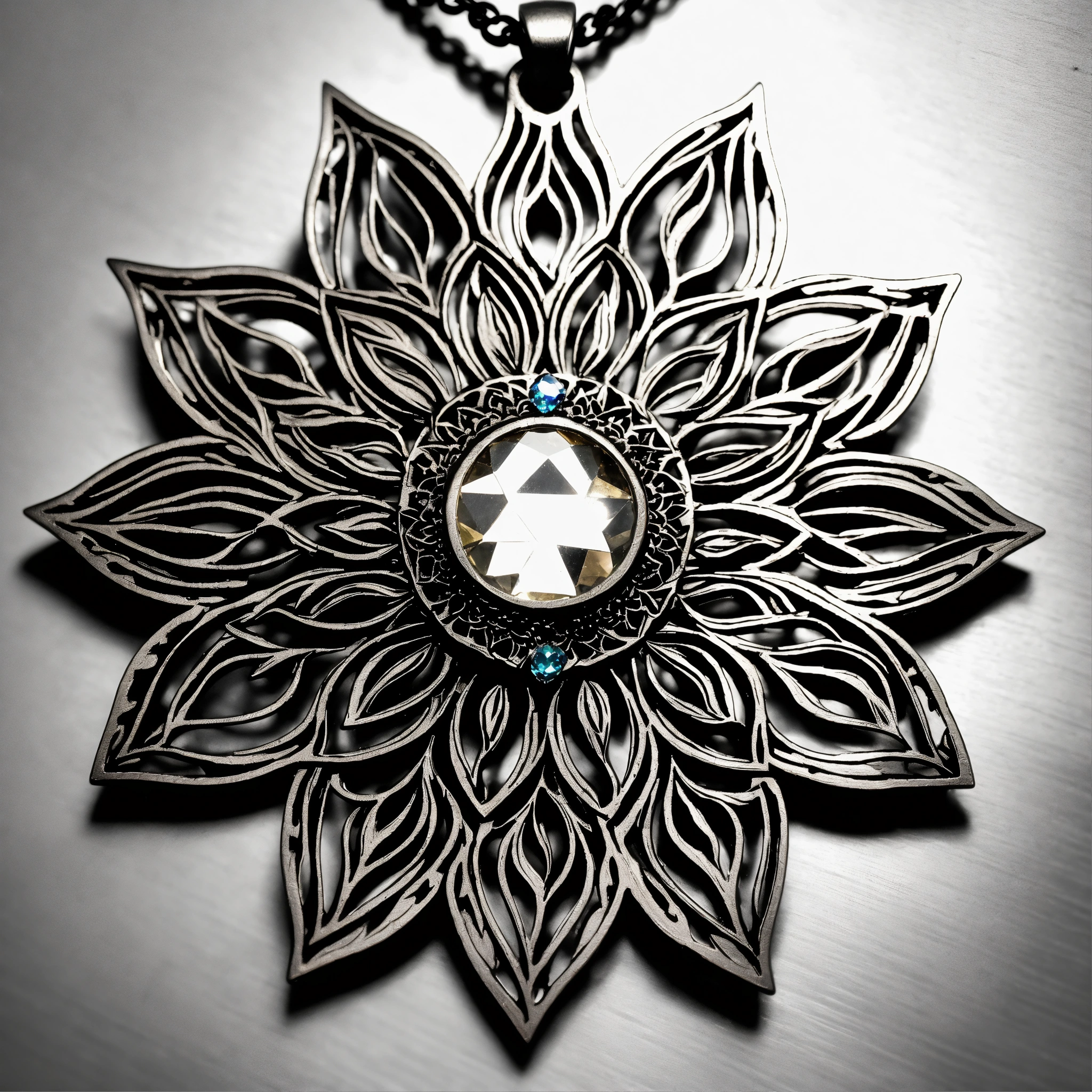 Lineart of steel carved laser cut flat 2d sunflower pendant made of steel, with a gem as a flower's nucleus, some steel leaves surrounding it, double crown of petals, steel color of the petals and leaves, all made of flat piece of steel, geometrical design