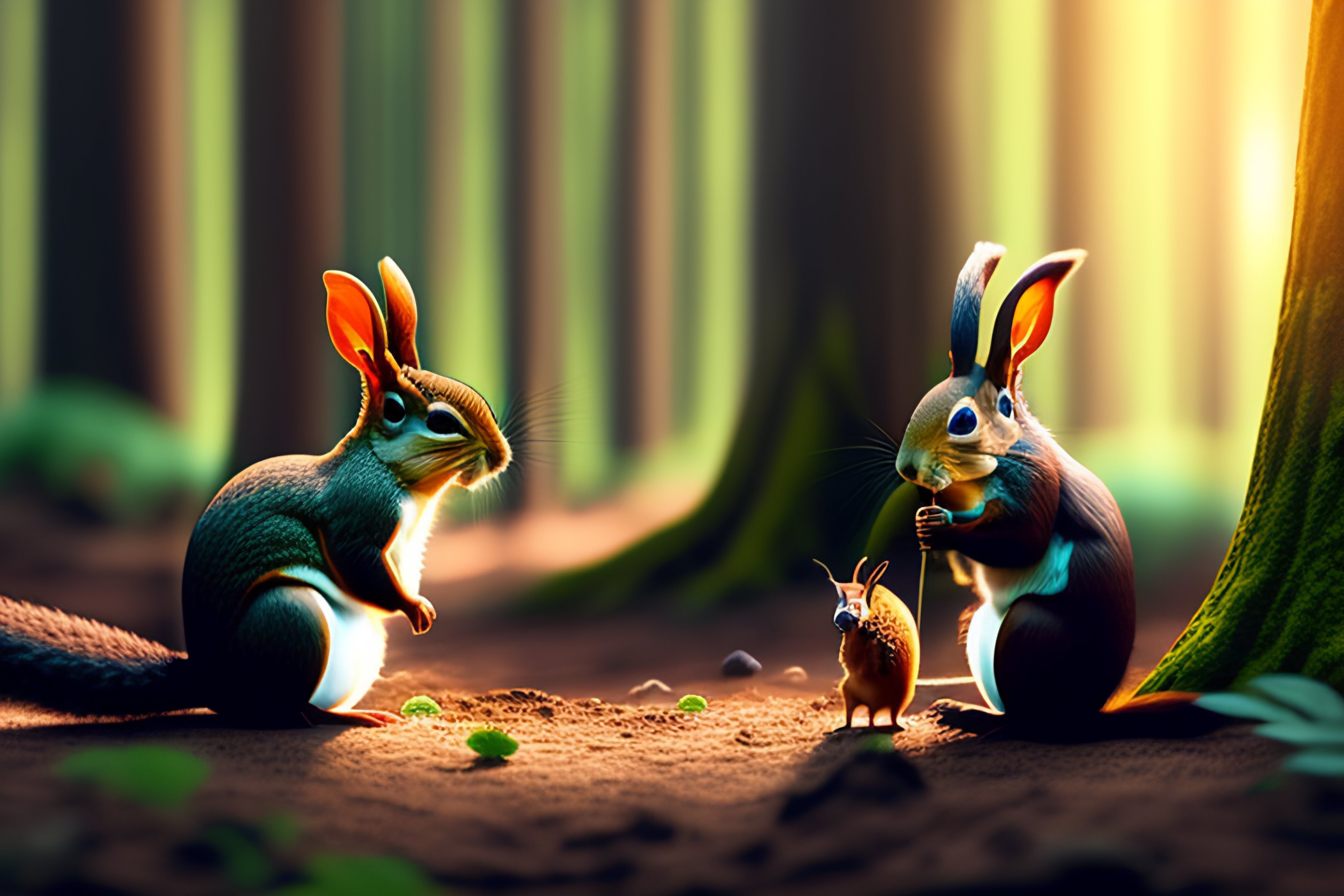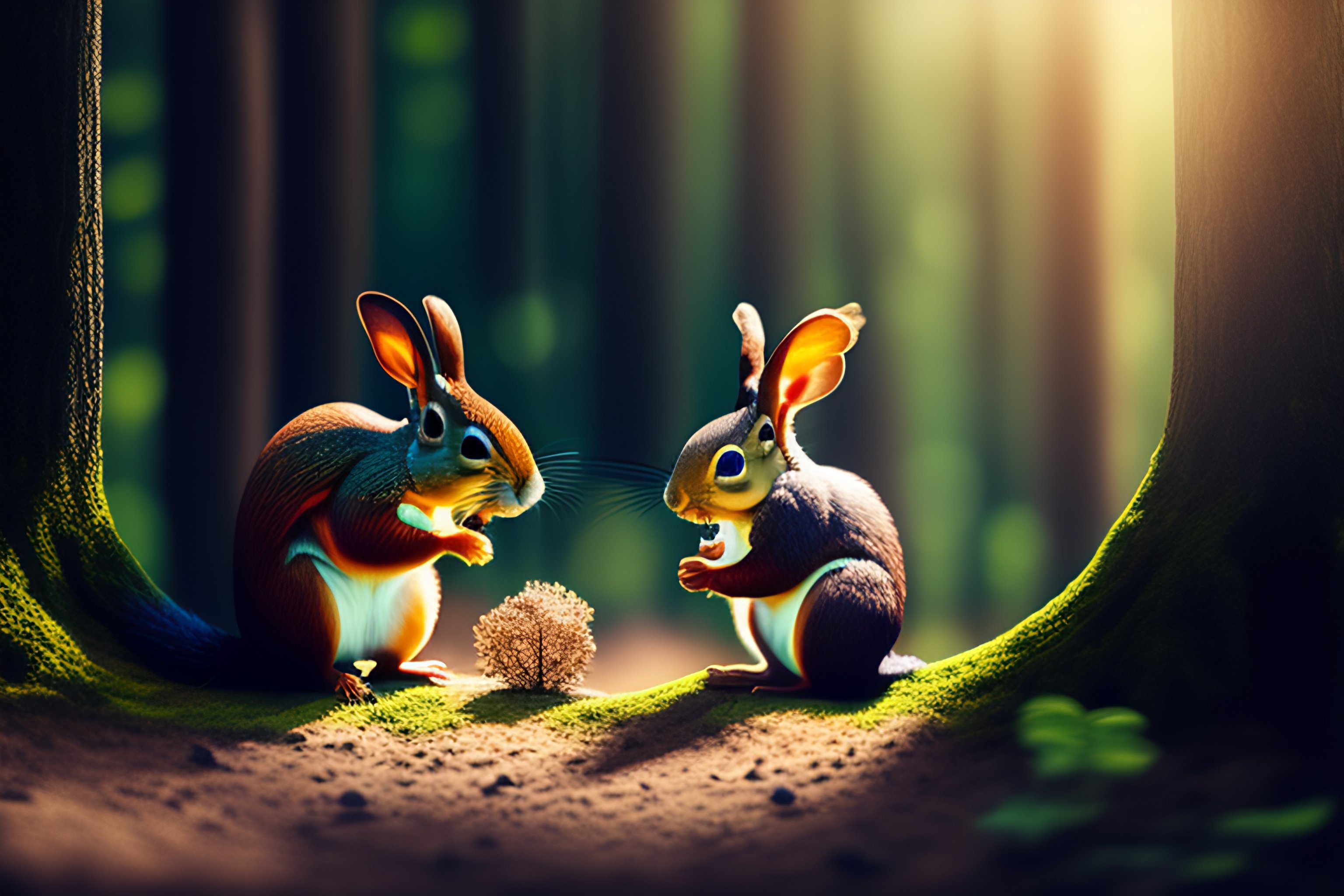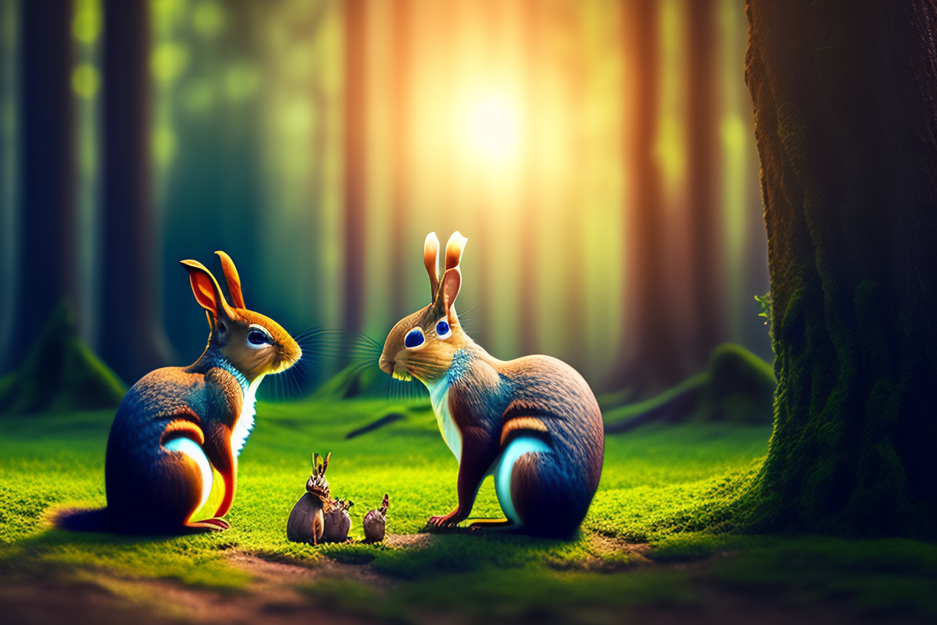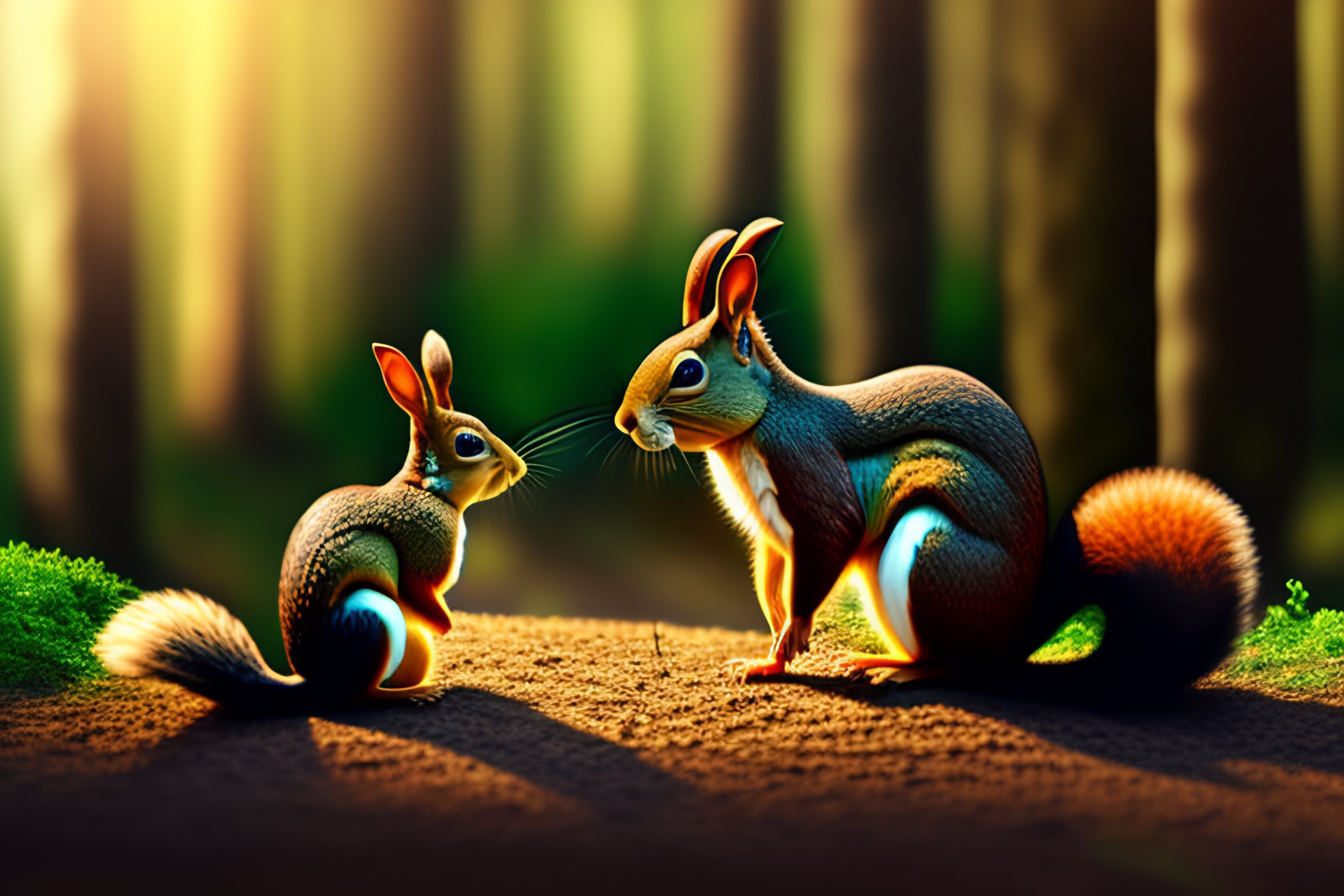 A squirrel and rabbit conversing with each other, photograph, beautiful, epic, cinematic, postprocessing, highly detailed, hyper realistic, landscape, with forest background with tall lush green trees, rich soil, birds in the sky, moonlight.