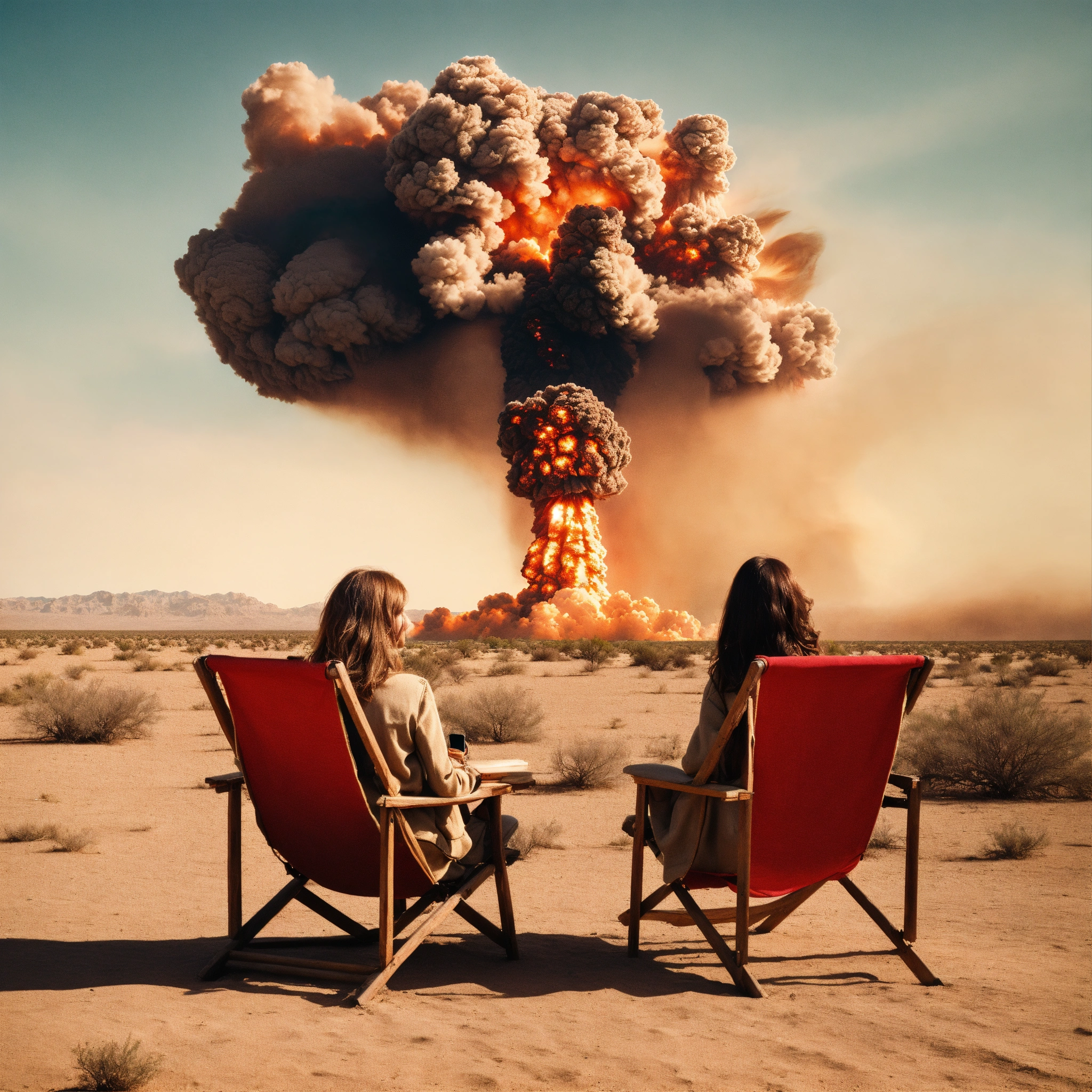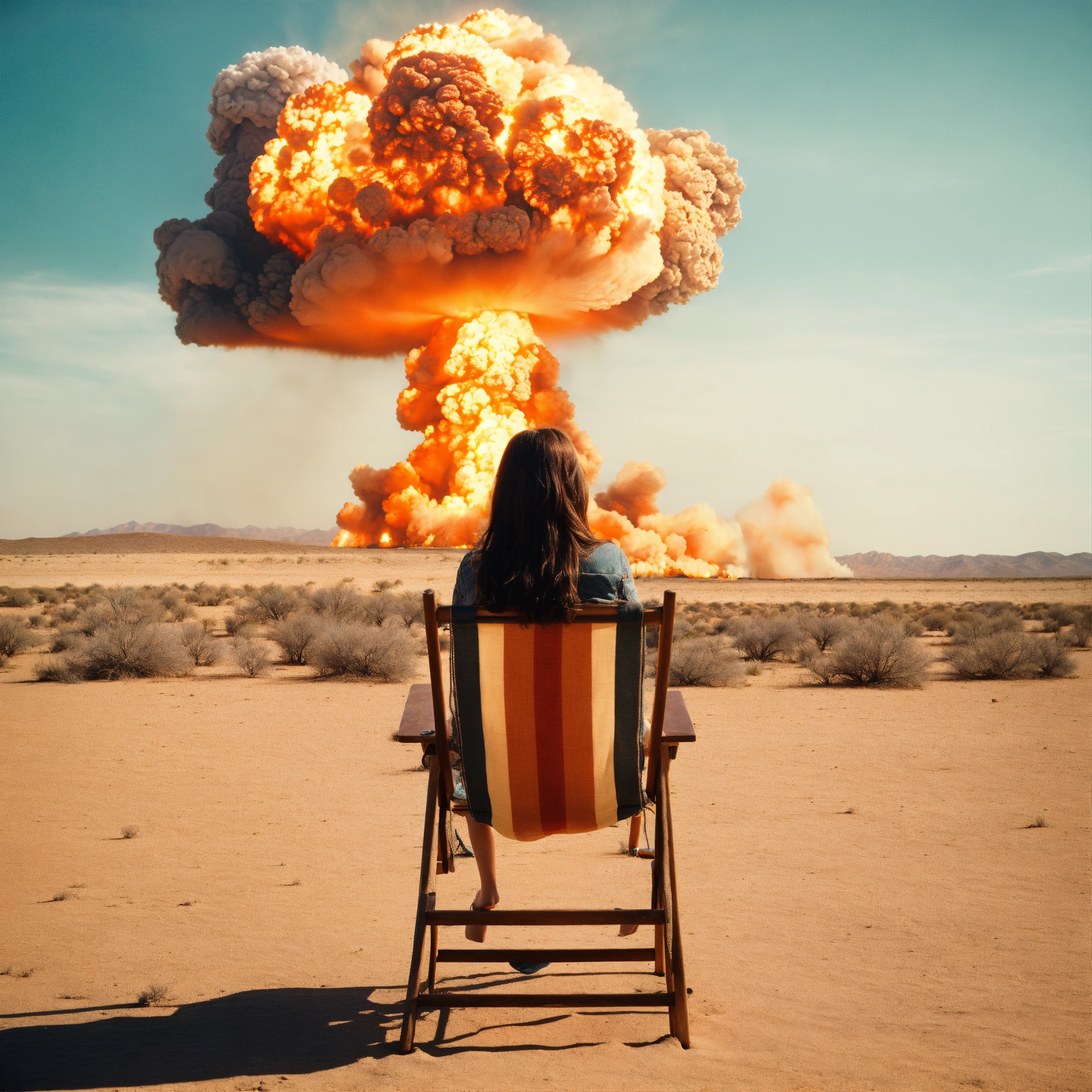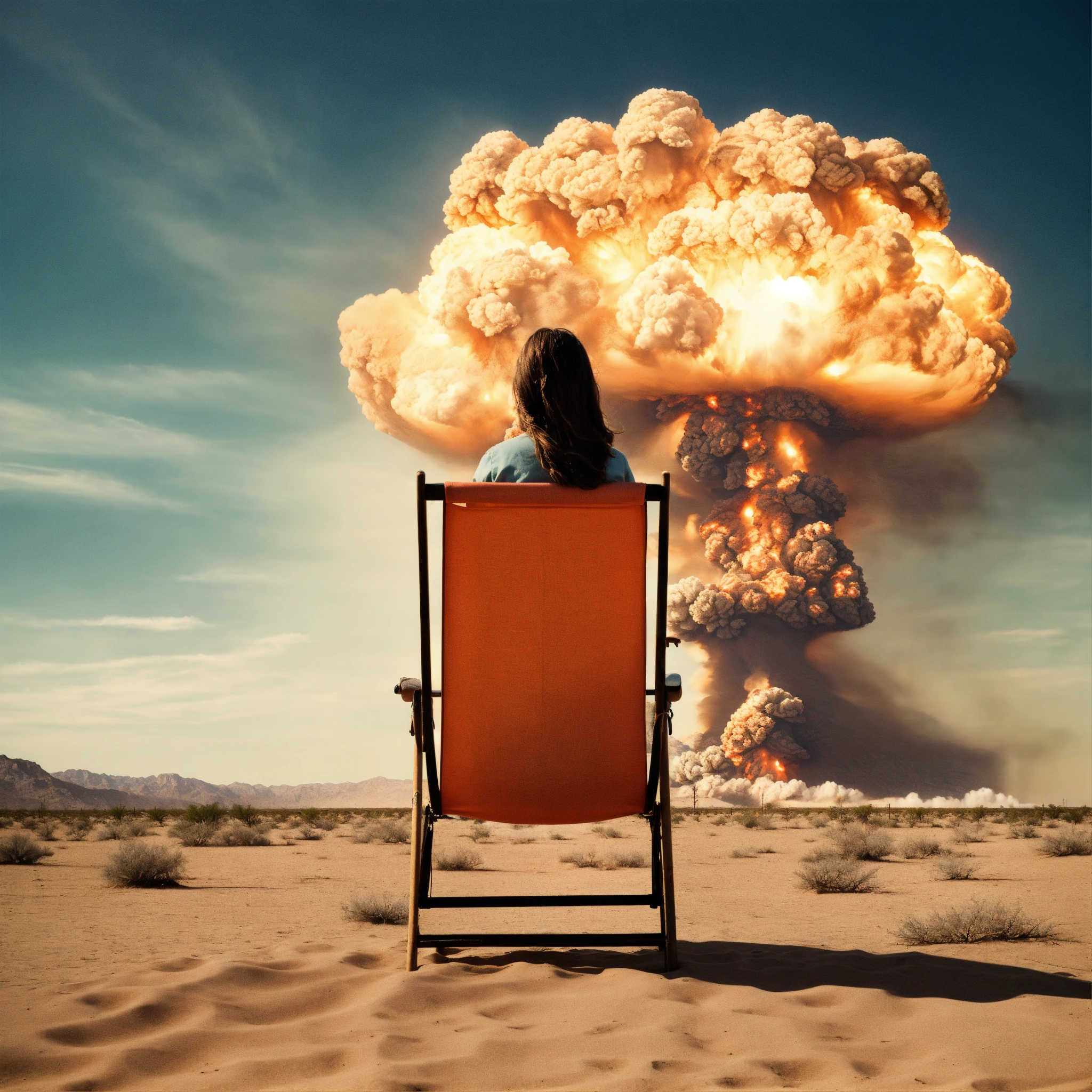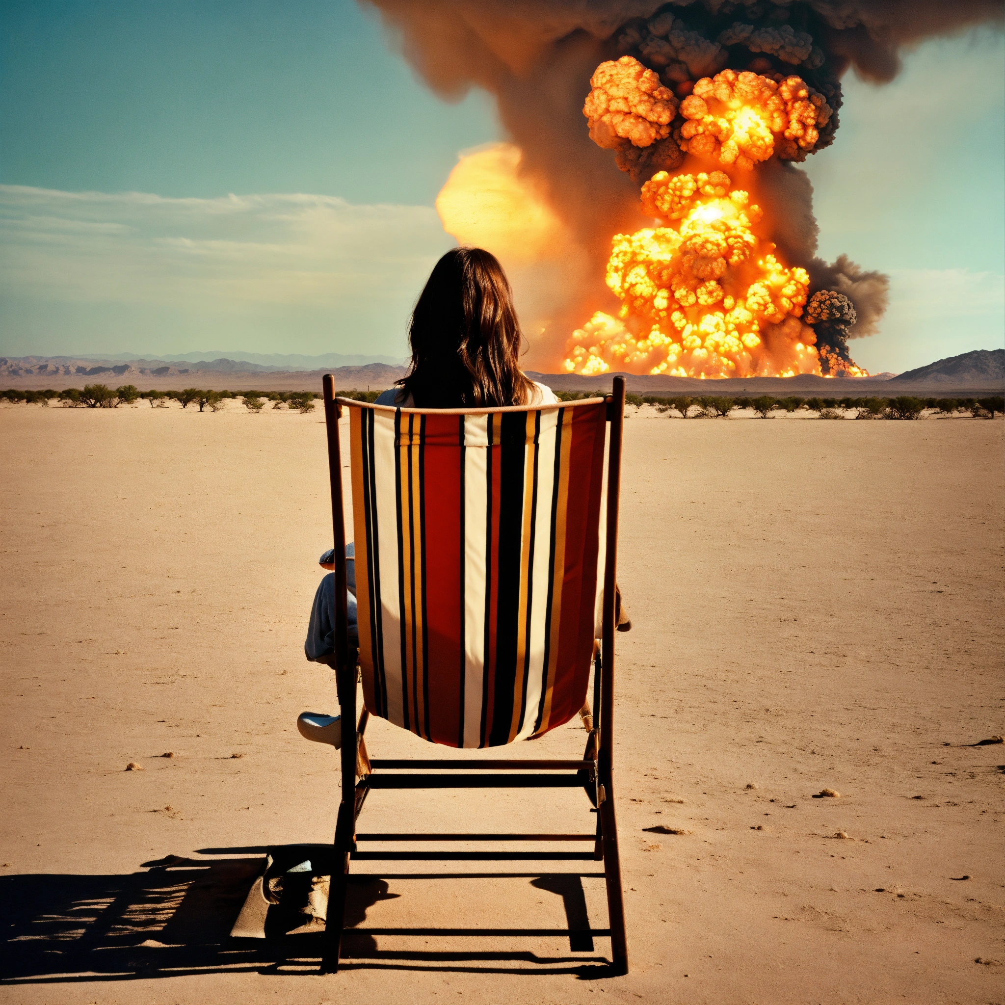 A photograph of a woman with long brown hair sitting in a vintage deck chair watching a nuclear explosion in the desert, back view, wes anderson colour style, wide format