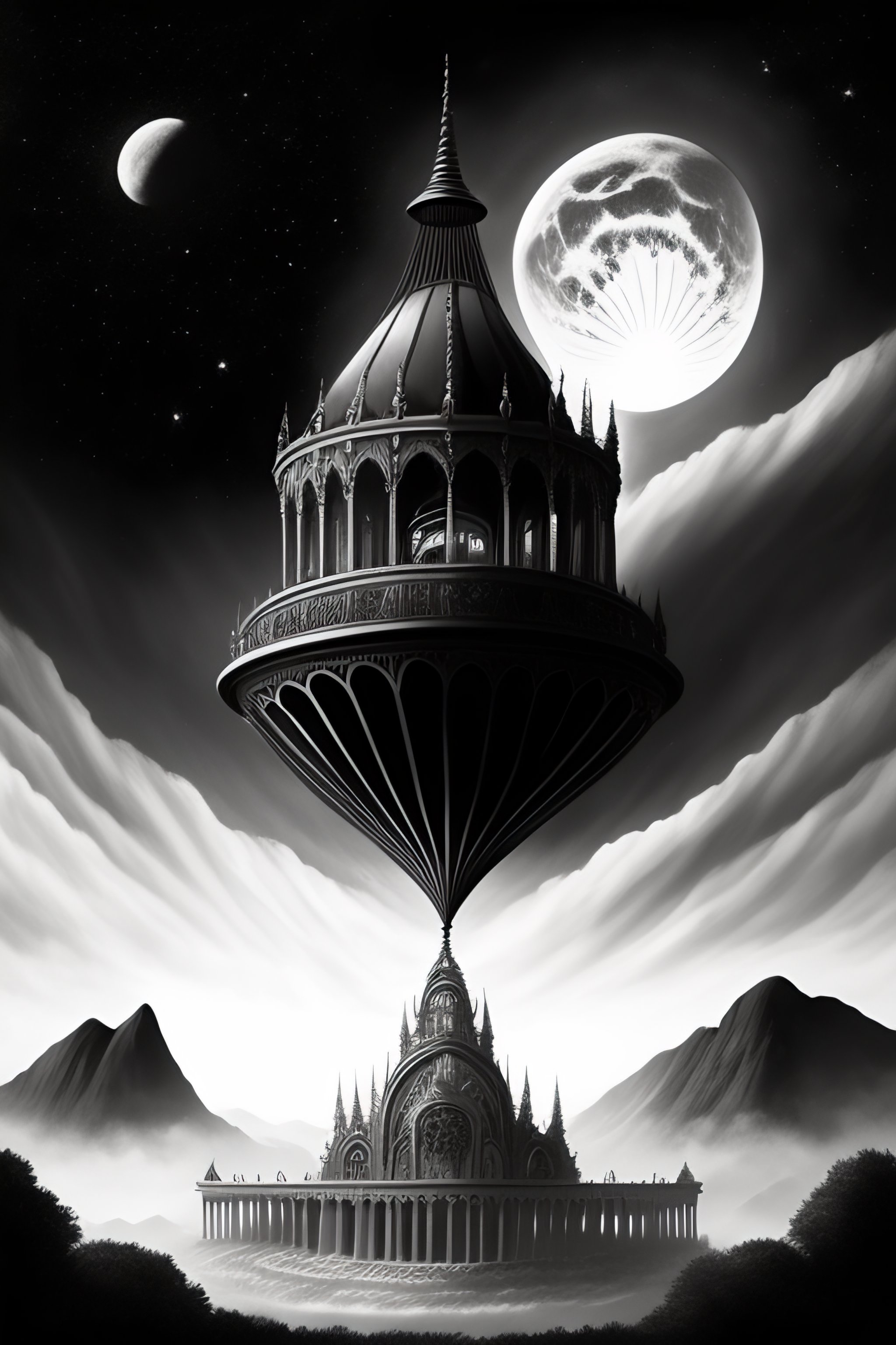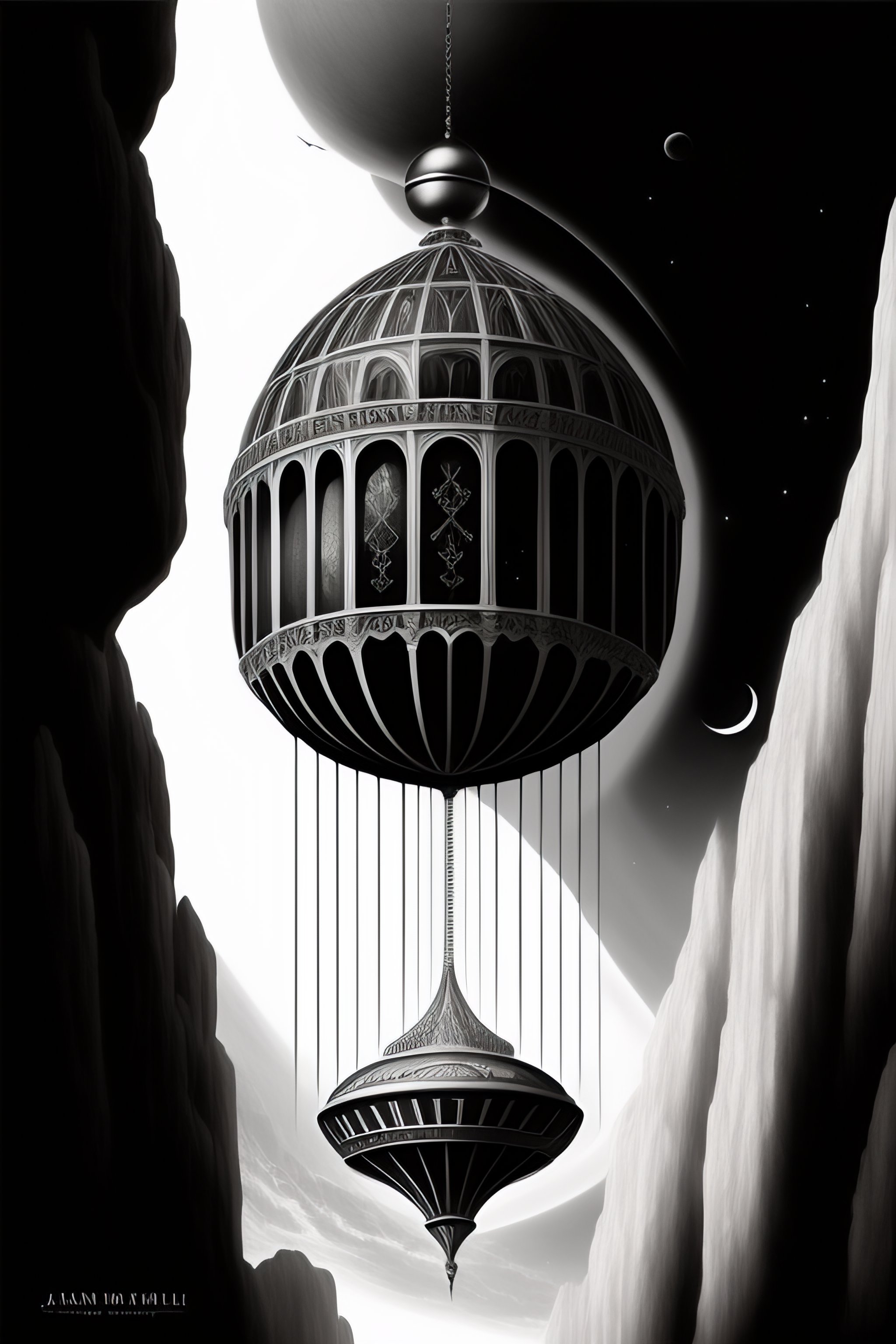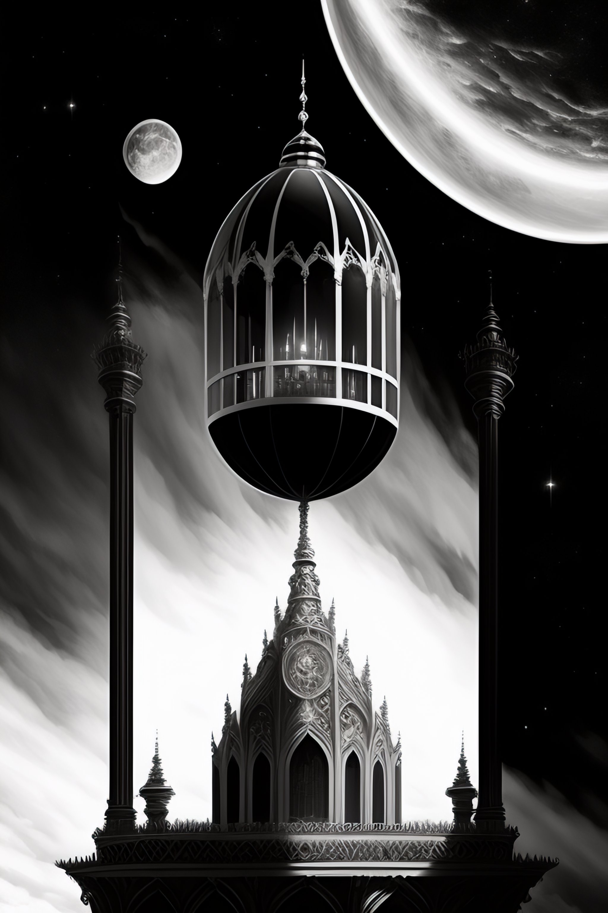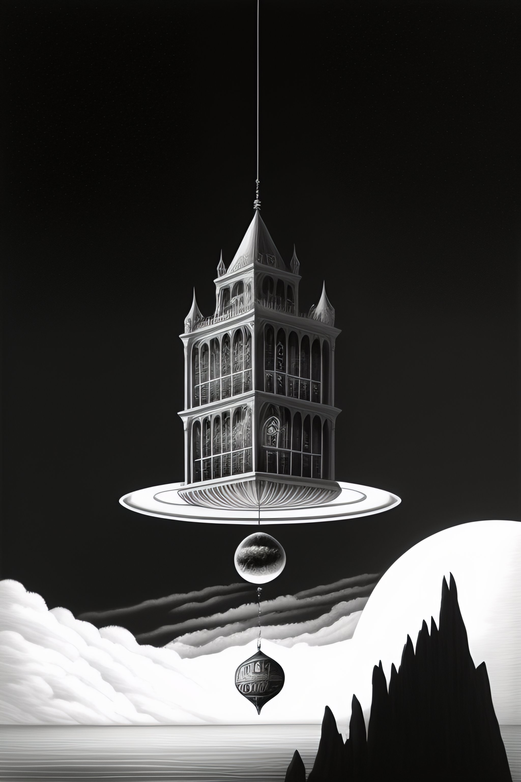 A floating gothic building high above the ground actually above earth floating in the air, a large pendulum sweeping underneath pen and ink, detailed, black and white, realism, fantasy, polished