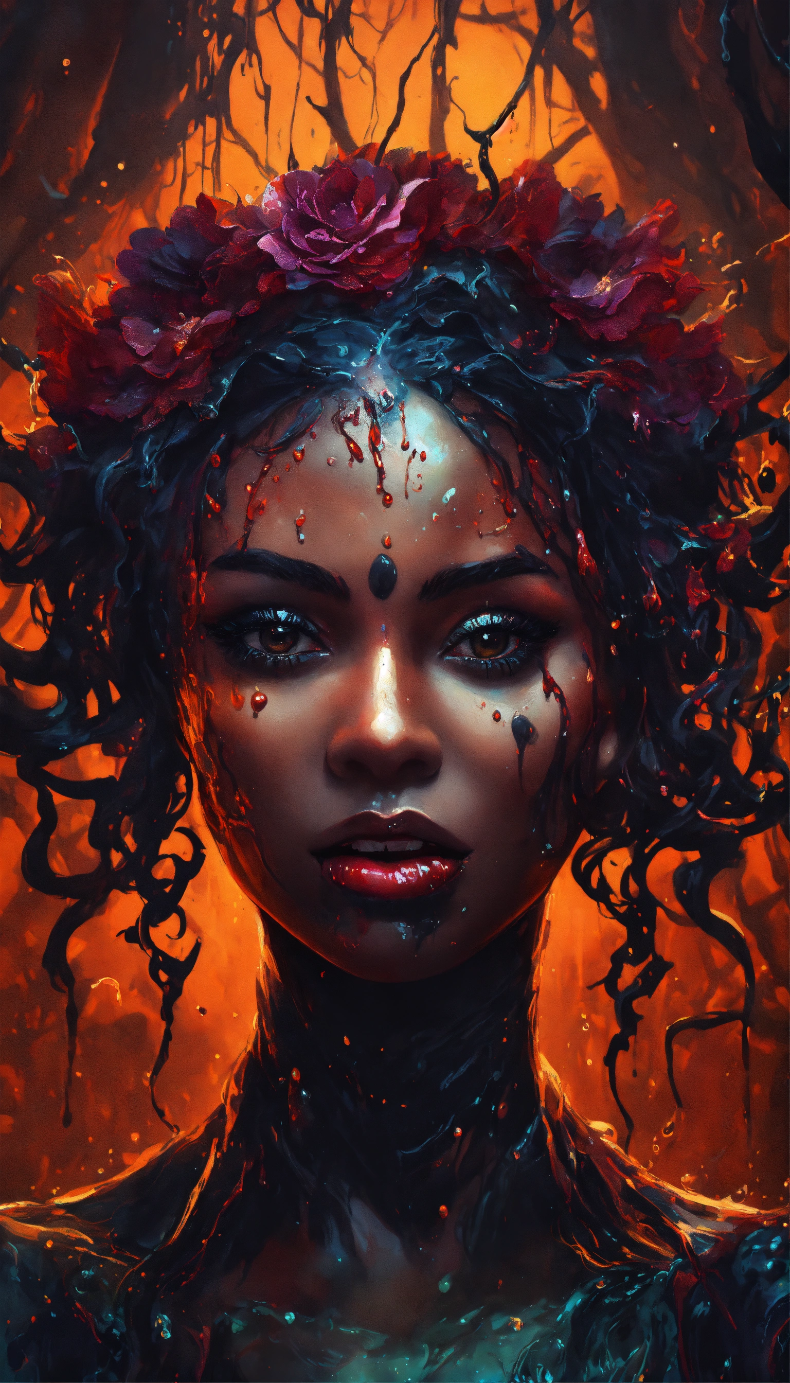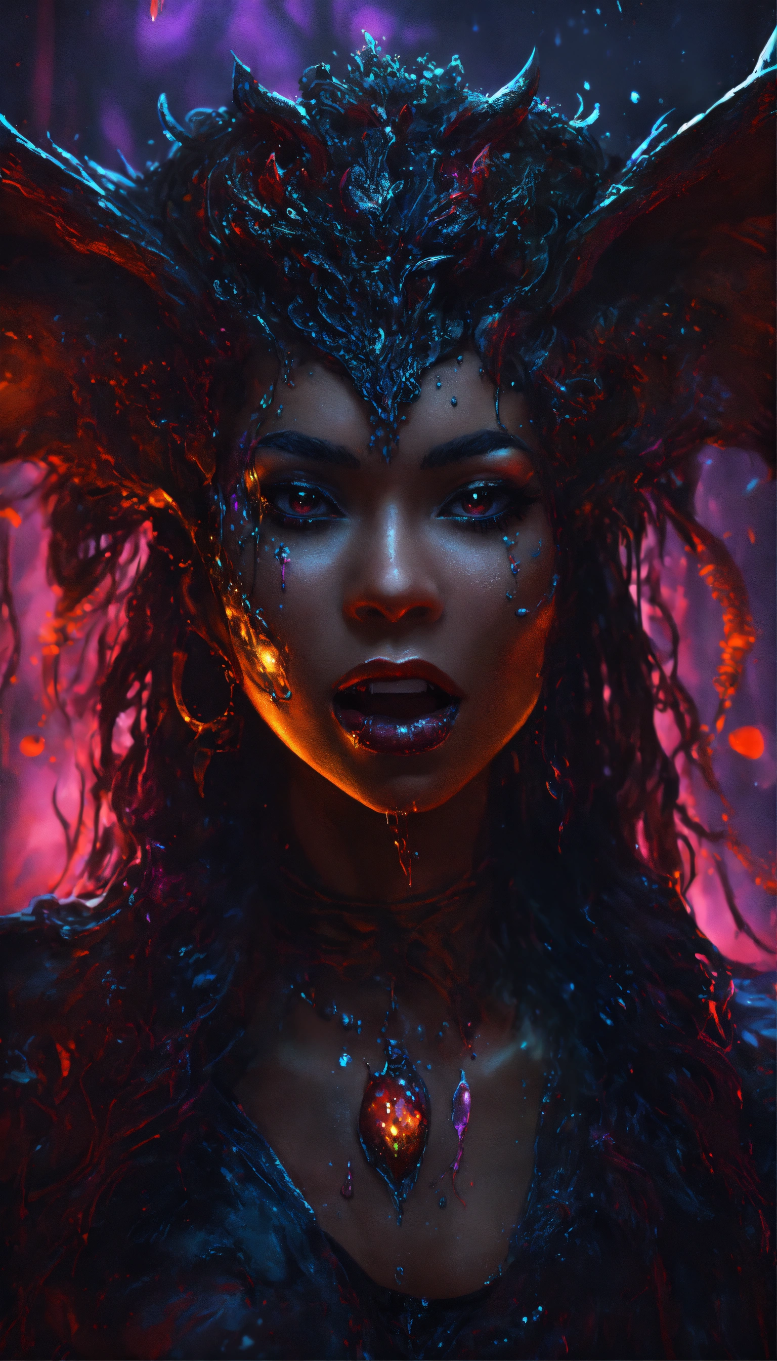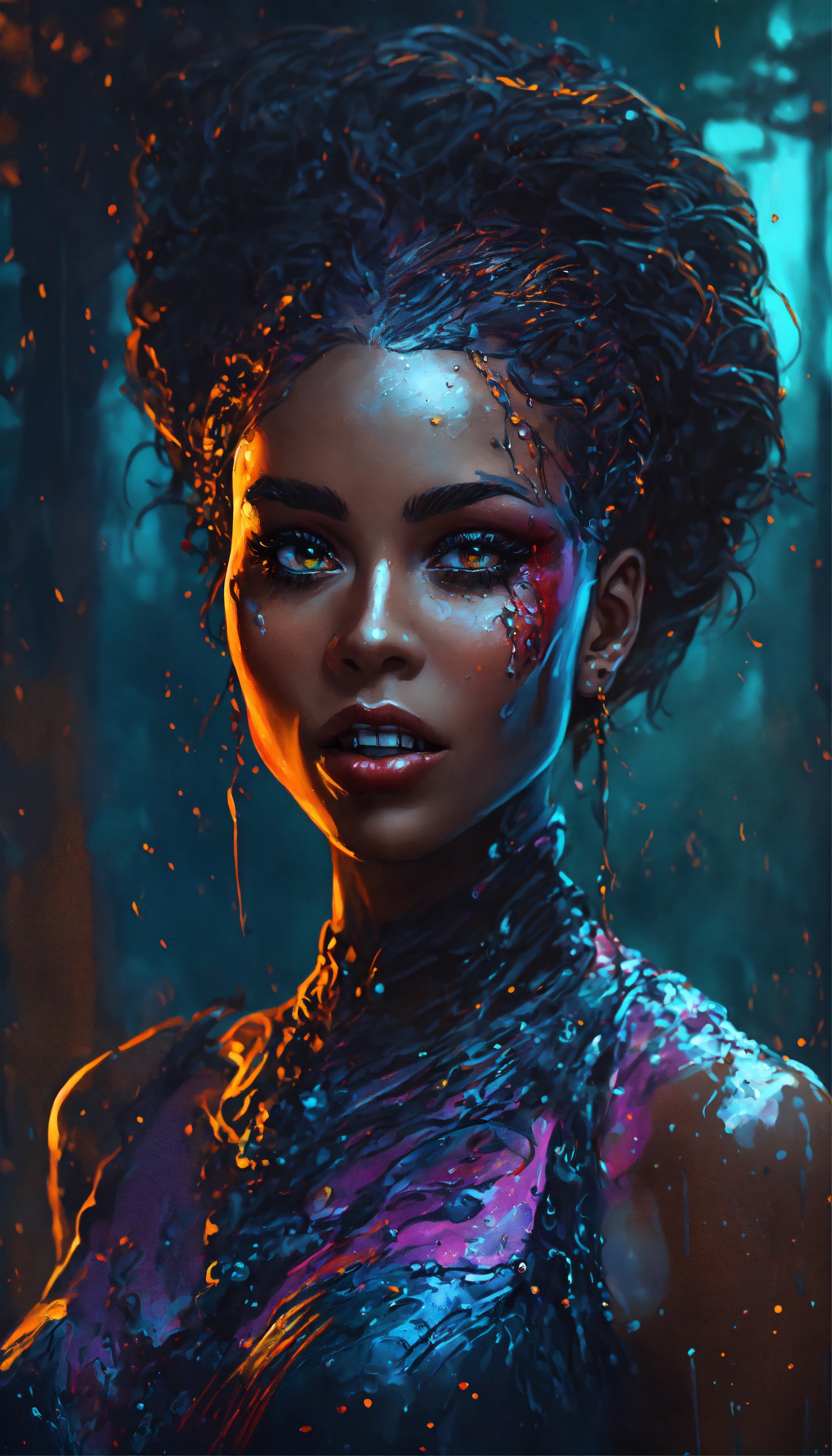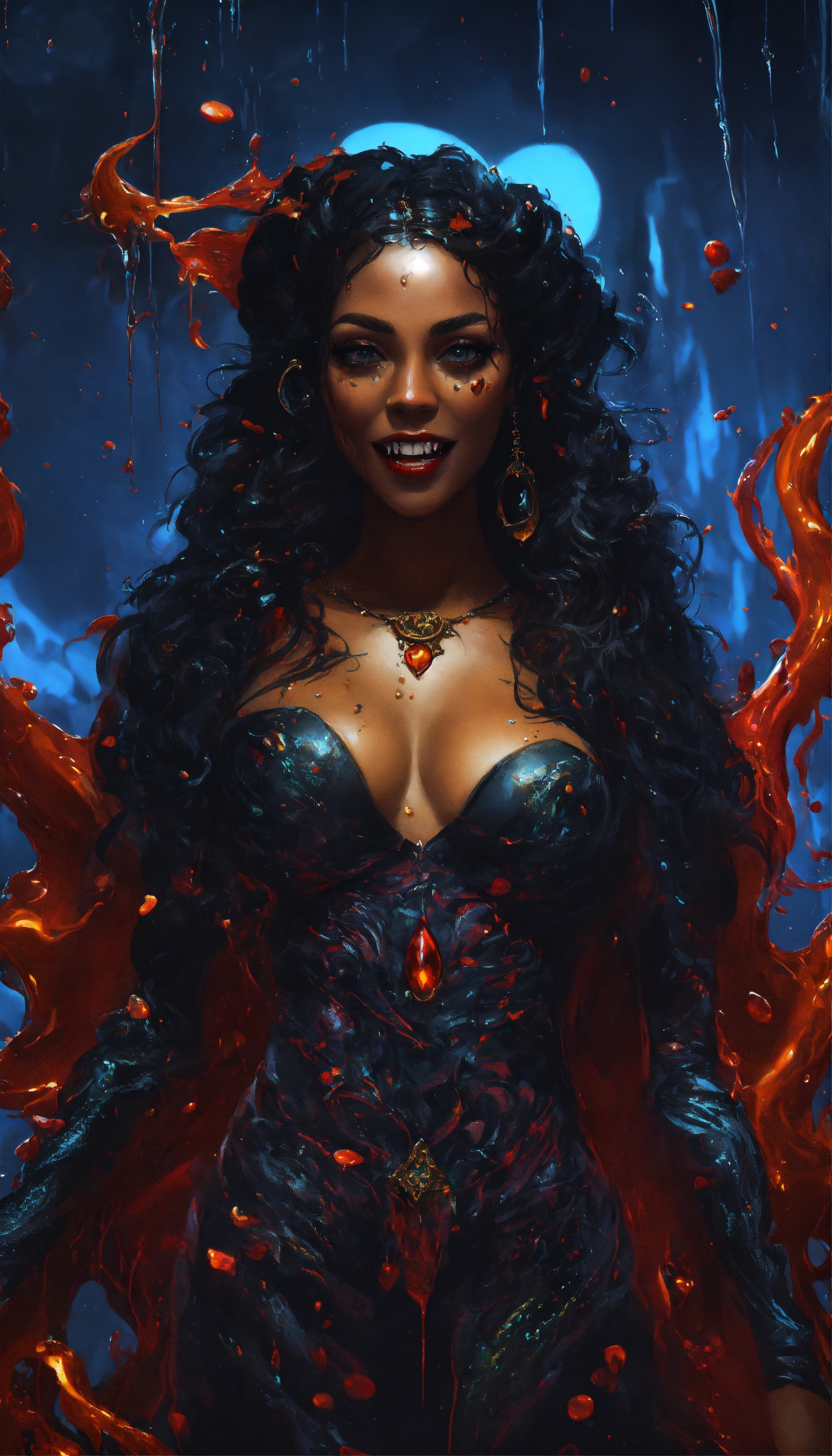 Splash art, a quirky liquid portrait of a hauntingly beautiful dark black vampire woman with fangs, splash style of paint, pixar style, halloween colors, hyper detailed intricately detailed, fantastical, intricate detail, splash screen, liquid, gooey, slime, splashy, fantasy, concept art, 8k resolution, masterpiece, melting, complex background, intricate detailed, dark colors, fantasy, concept art, digital art, intricate, oil on canvas, masterpiece, expert, insanely detailed, 4k resolution.