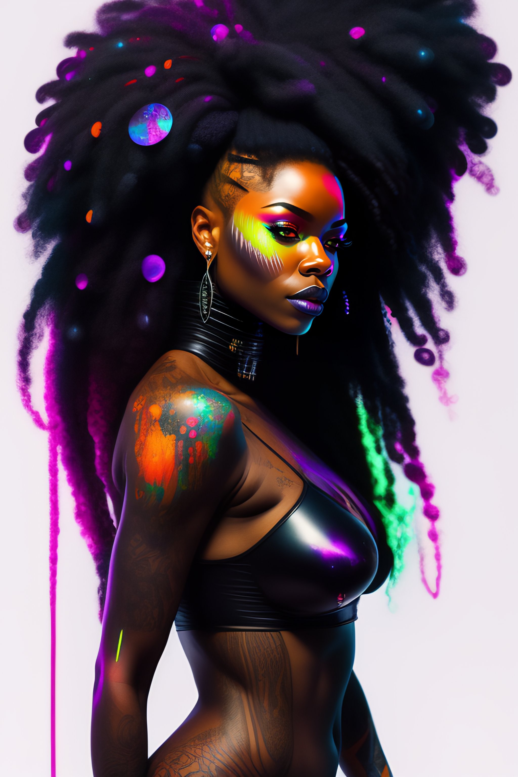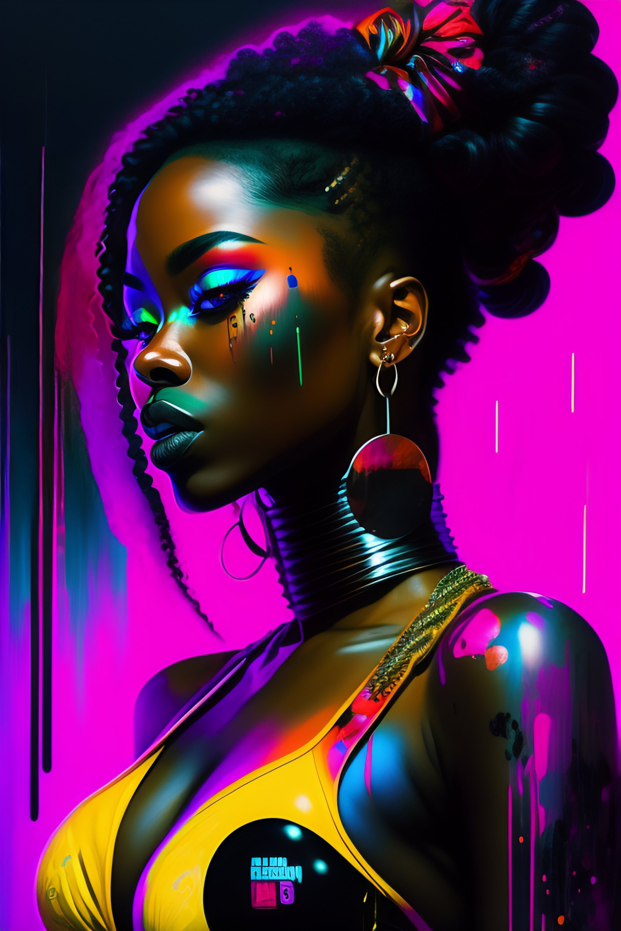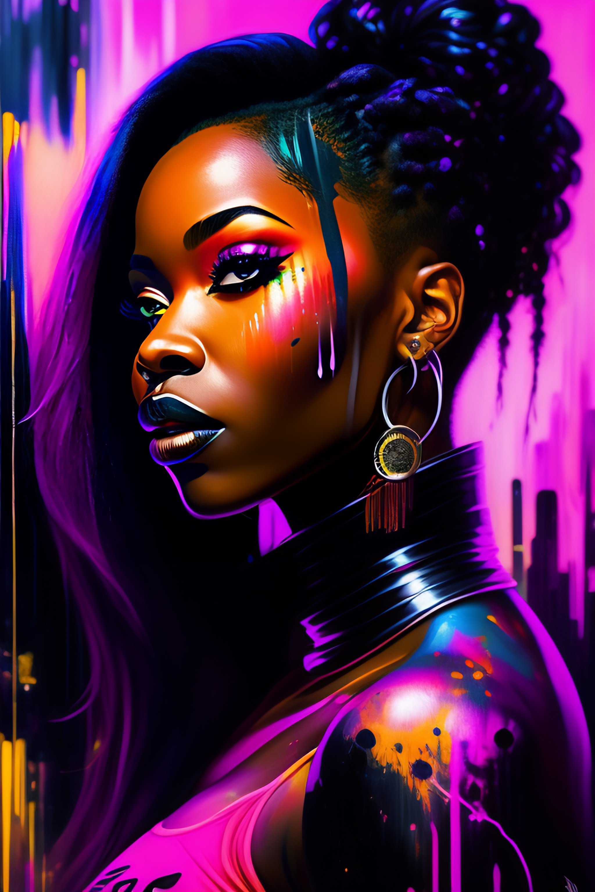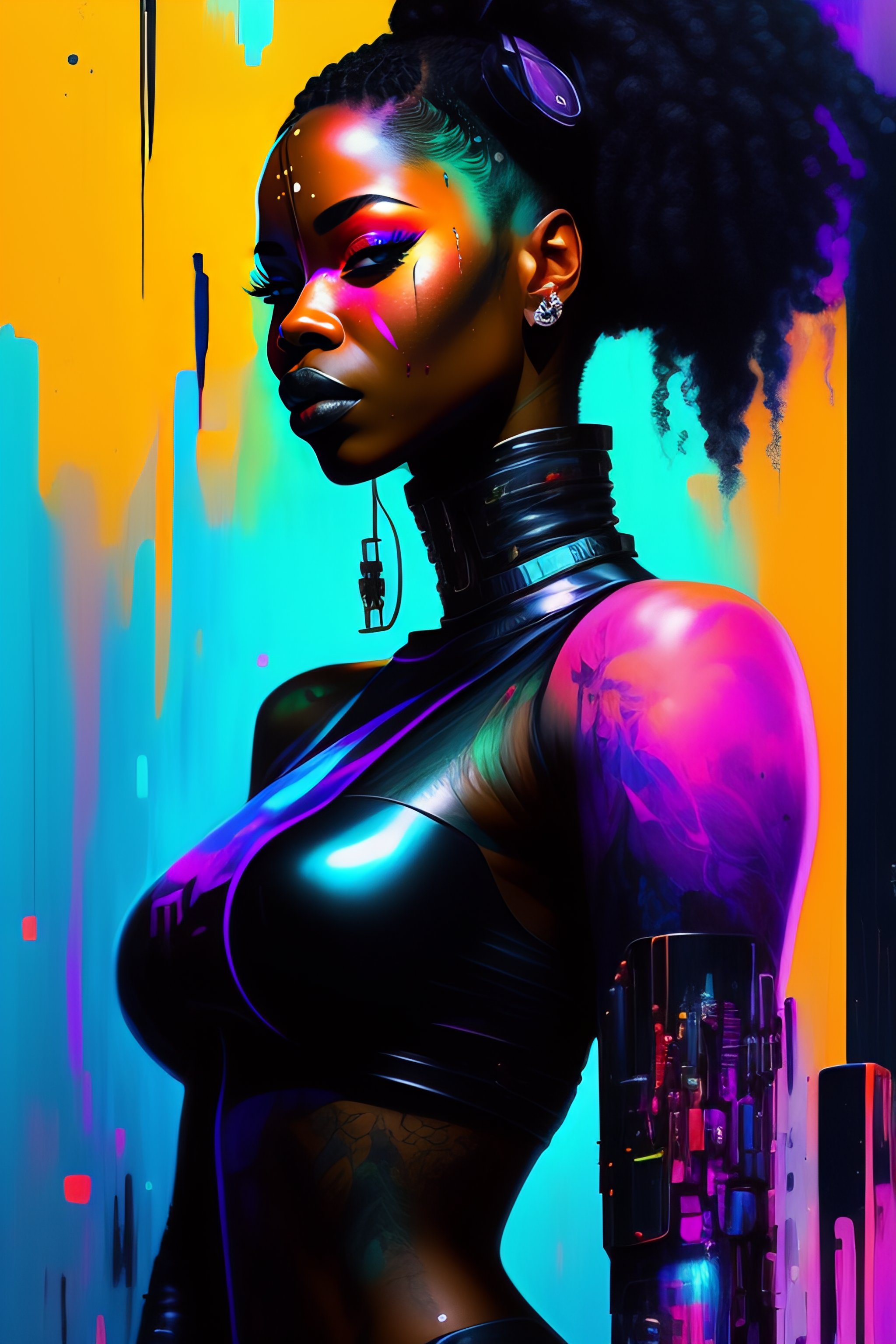 A black woman cyborg, grafitti, part machine, part human, splatter, tattoed, neon, neon ink, neon light, night cityscape in the style of adrian ghenie, esao andrews, jenny saville, edward hopper, surrealism, dark art by james jean, takato yamamoto, inkpunk minimalism