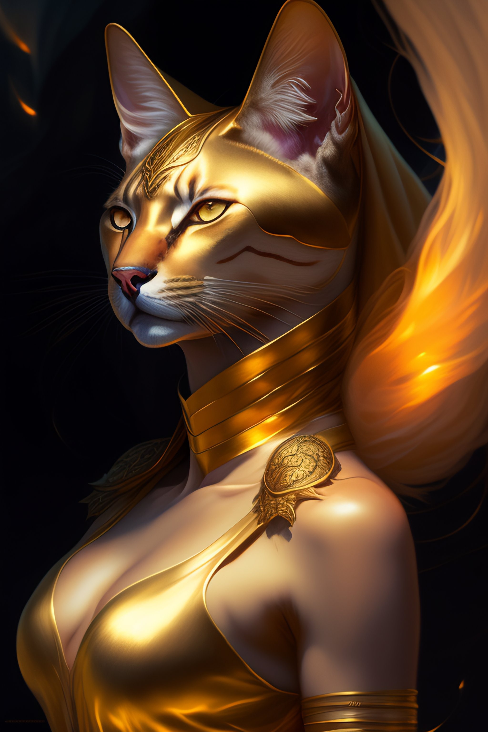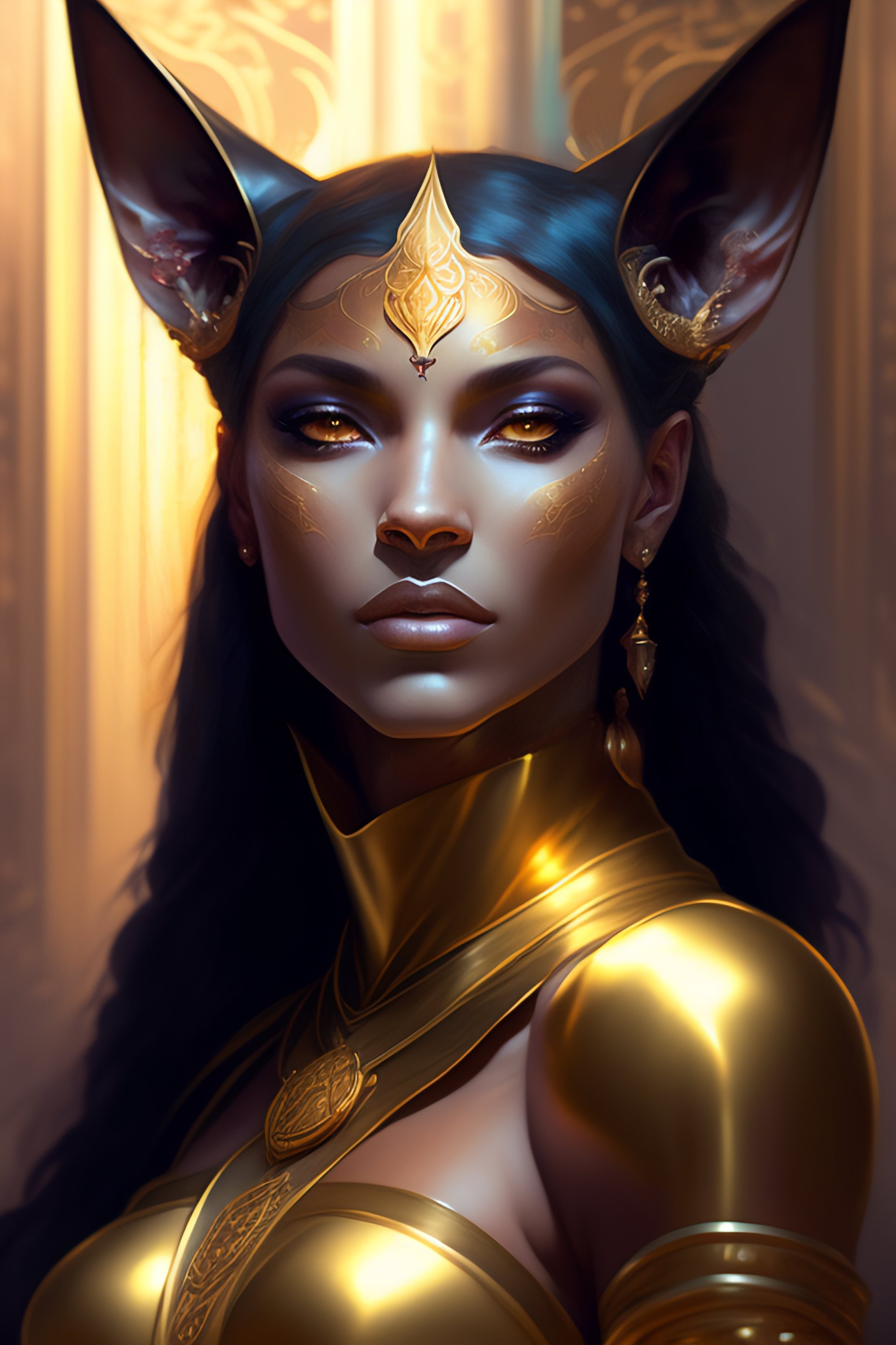 Portrait of a half cat half human, anubis, face of a cat, feline head, golden dress, glow golden tatto, galatic shamen with quantum energy fantasy, fantasy magic, undercut hairstyle, dark light night, intricate, elegant, sharp focus, illustration, highly detailed, digital painting, concept art, matte, art by wlop and artgerm and greg rutkowski and alphonse mucha, masterpiece