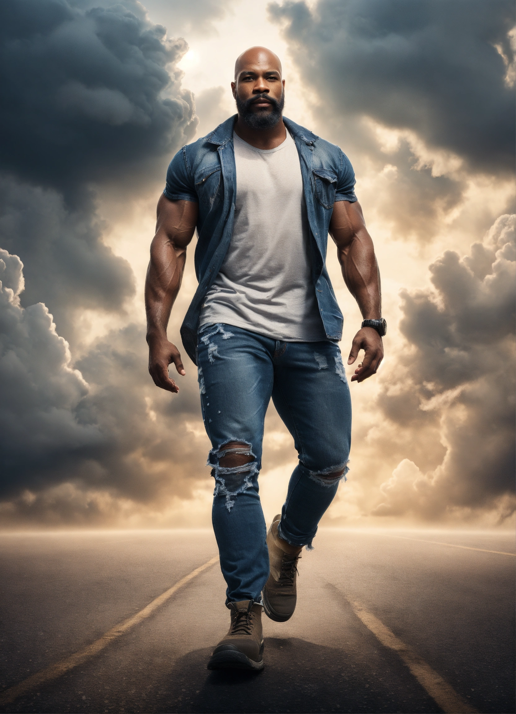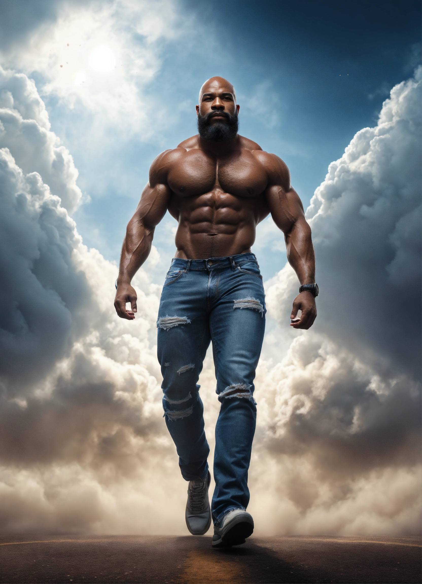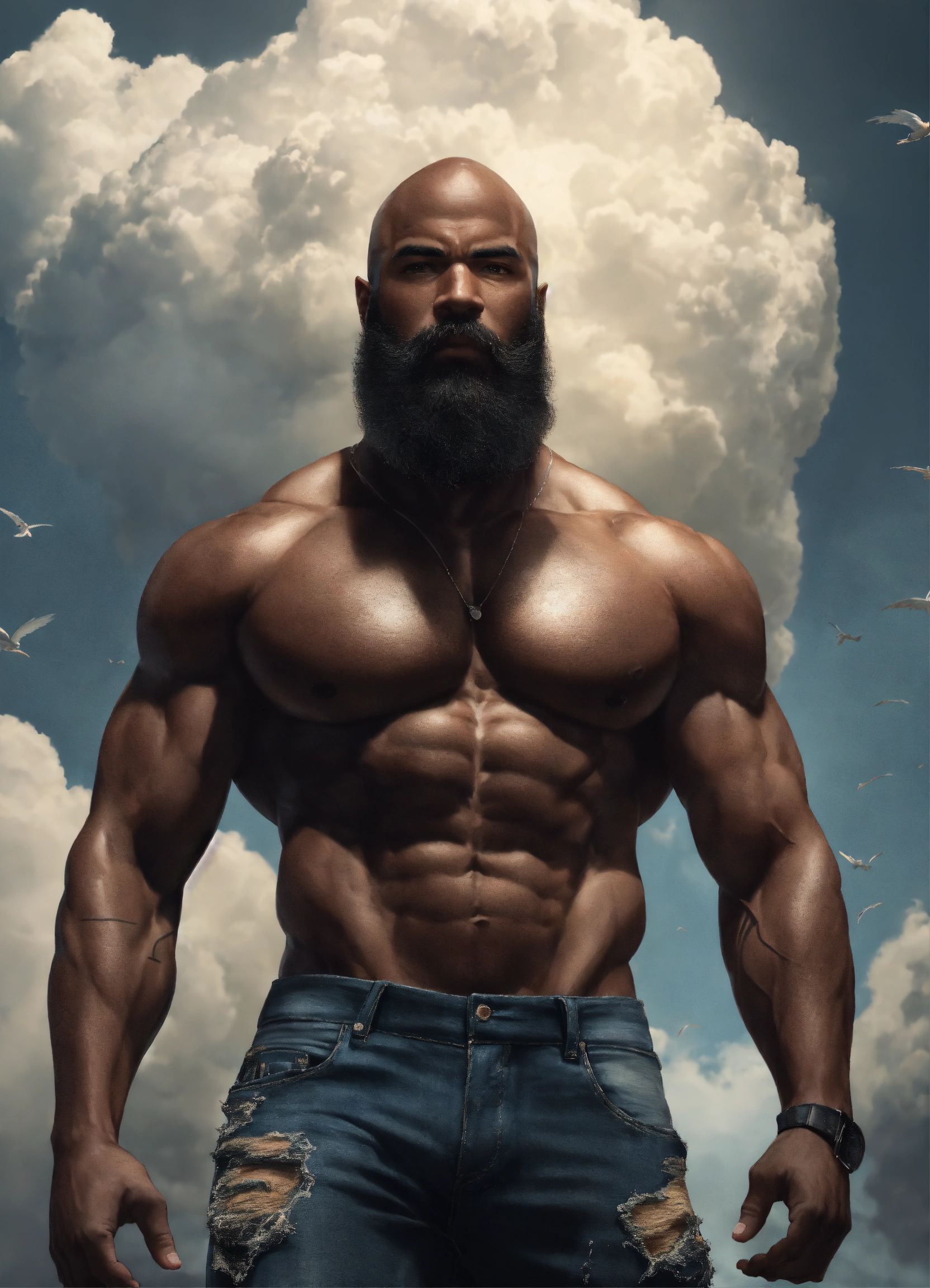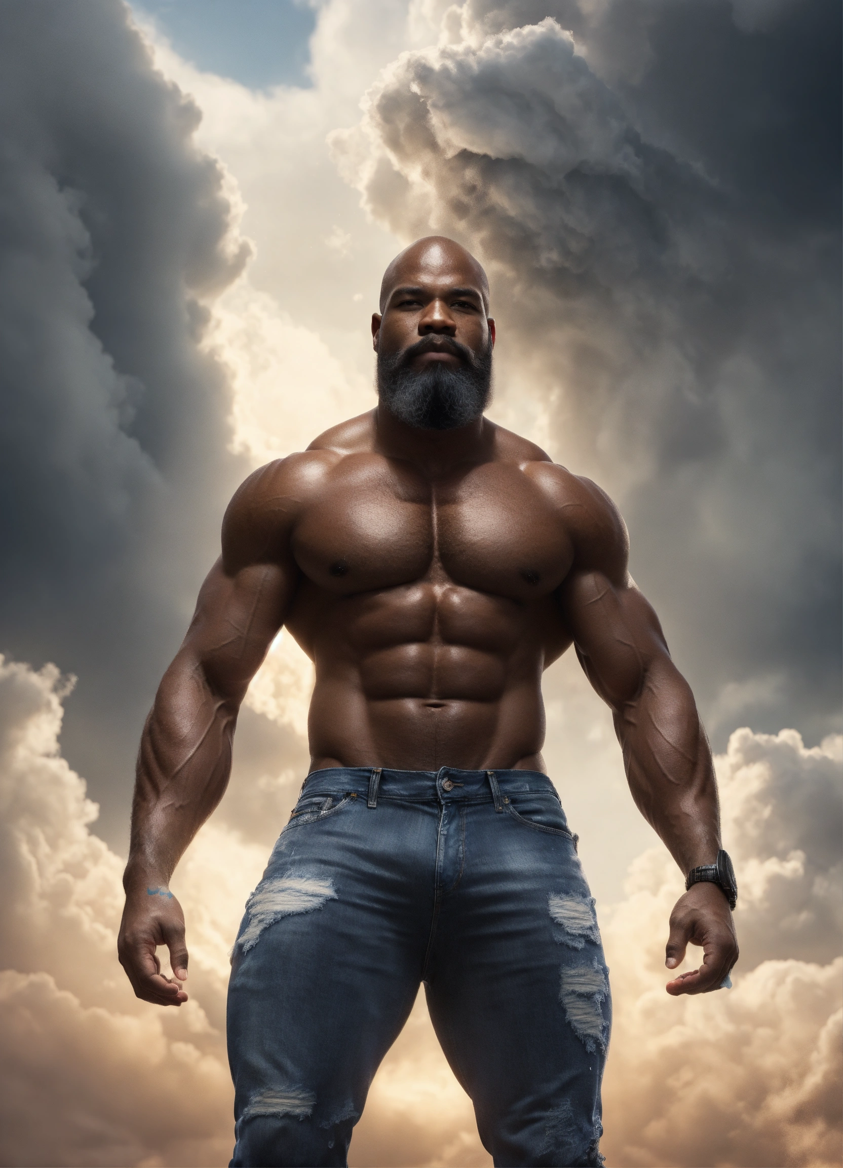 Bald bearded man, a strong muscular handsome black male storm god, a huge handsome god with a bald head and salt and pepper beard, huge muscular physique wearing a torn t-shirt and jeans, walking in the clouds resolution 8k, insanely detailed