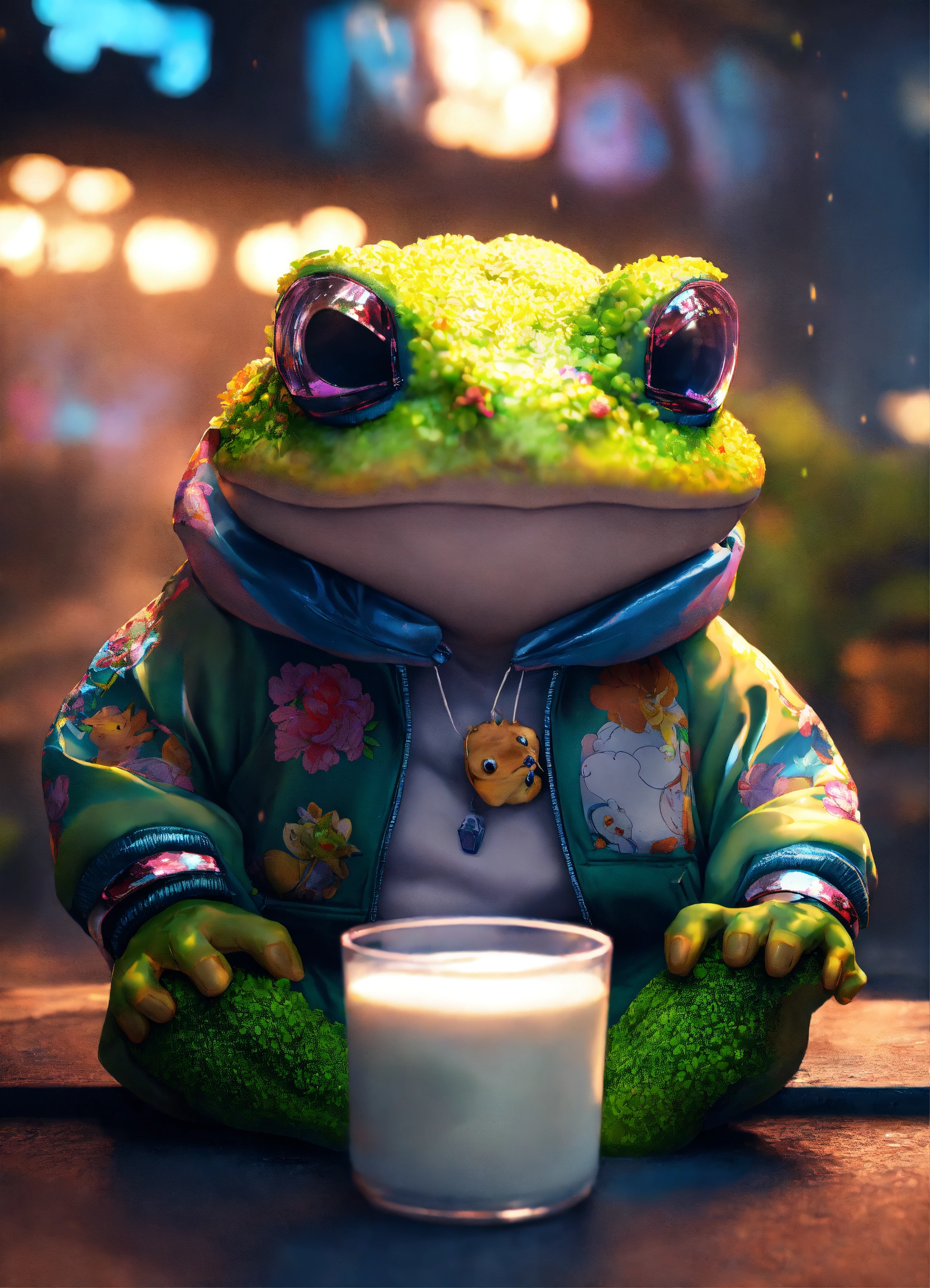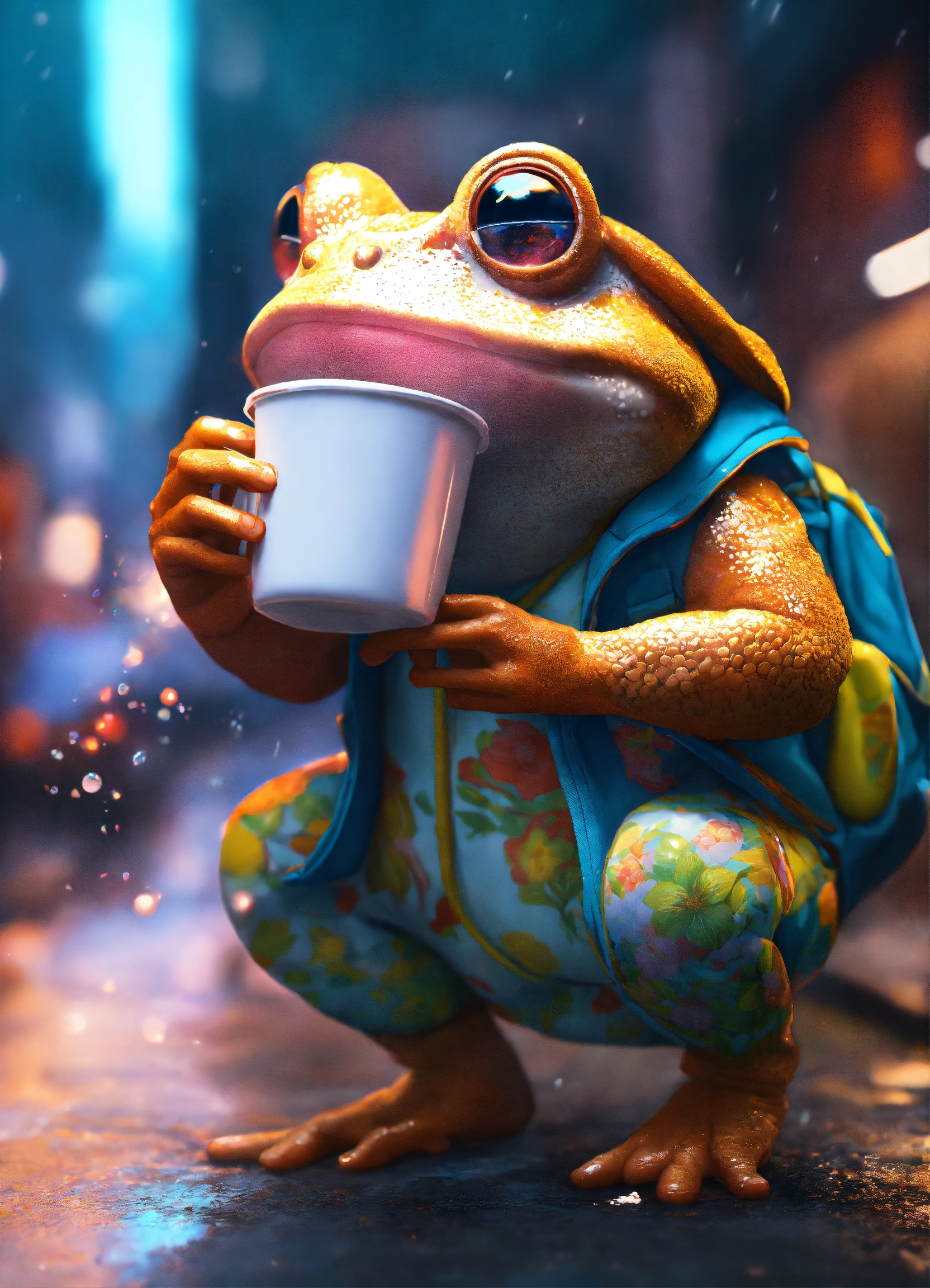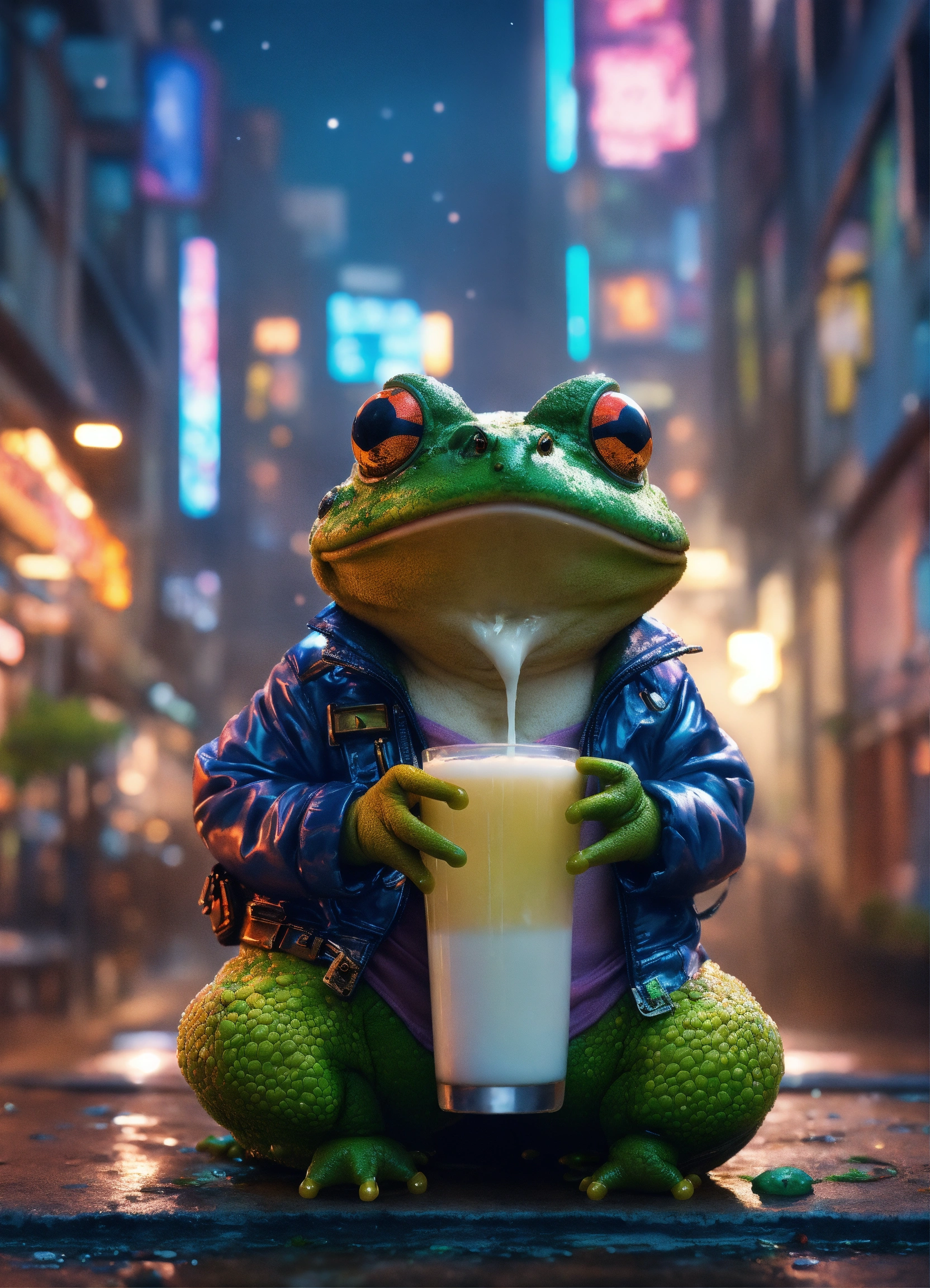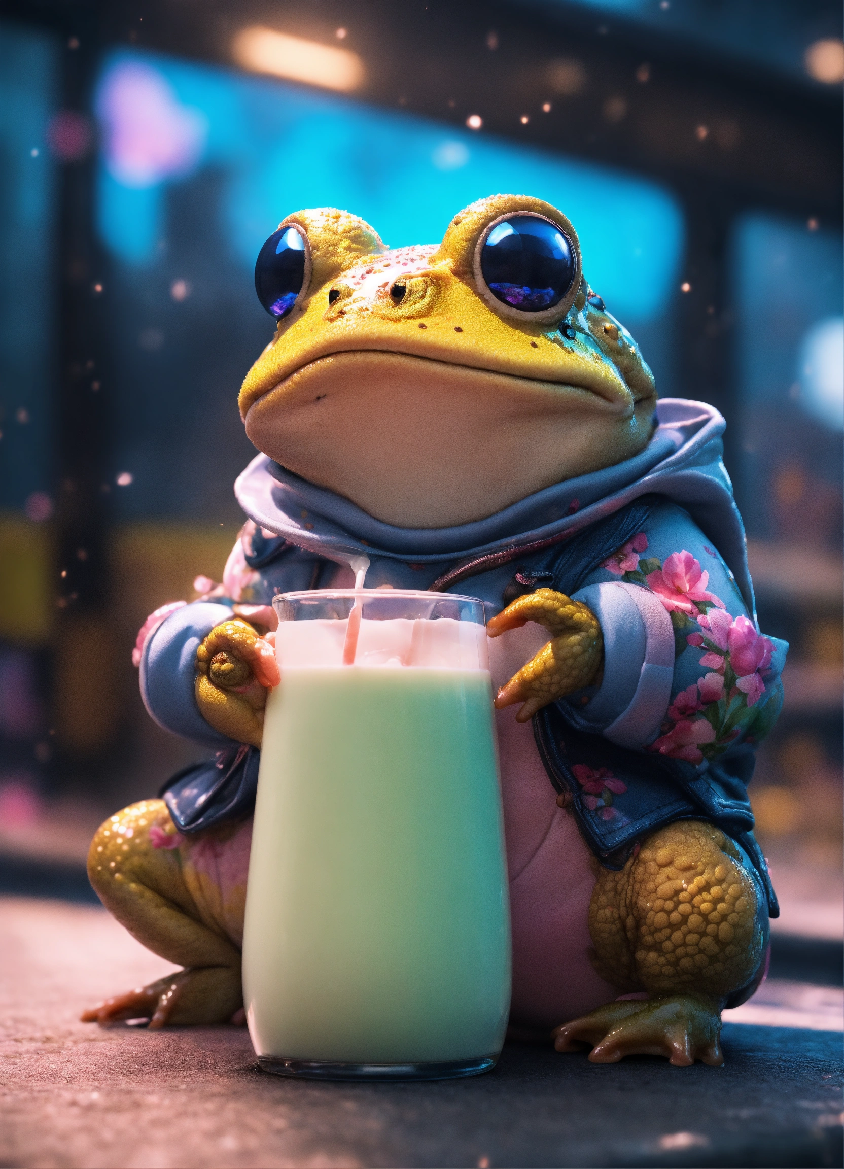 A toad drinking milk 90s anime, cyberpunk style, of a person in urban floral wear, with a cloud as a head, photorealistic, volumetric lighting, 8k, highly detailed